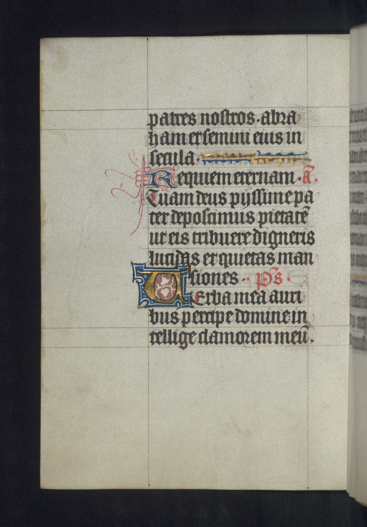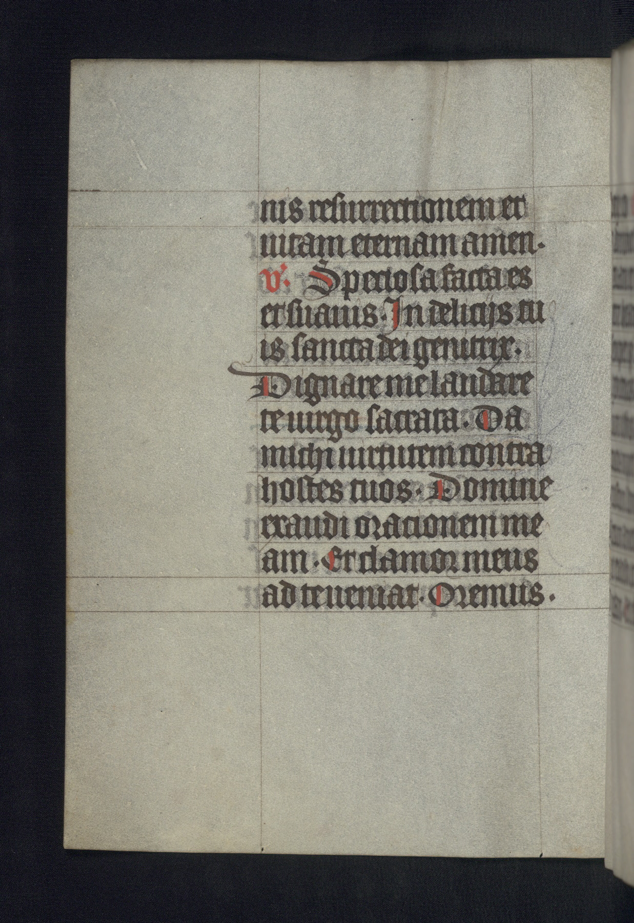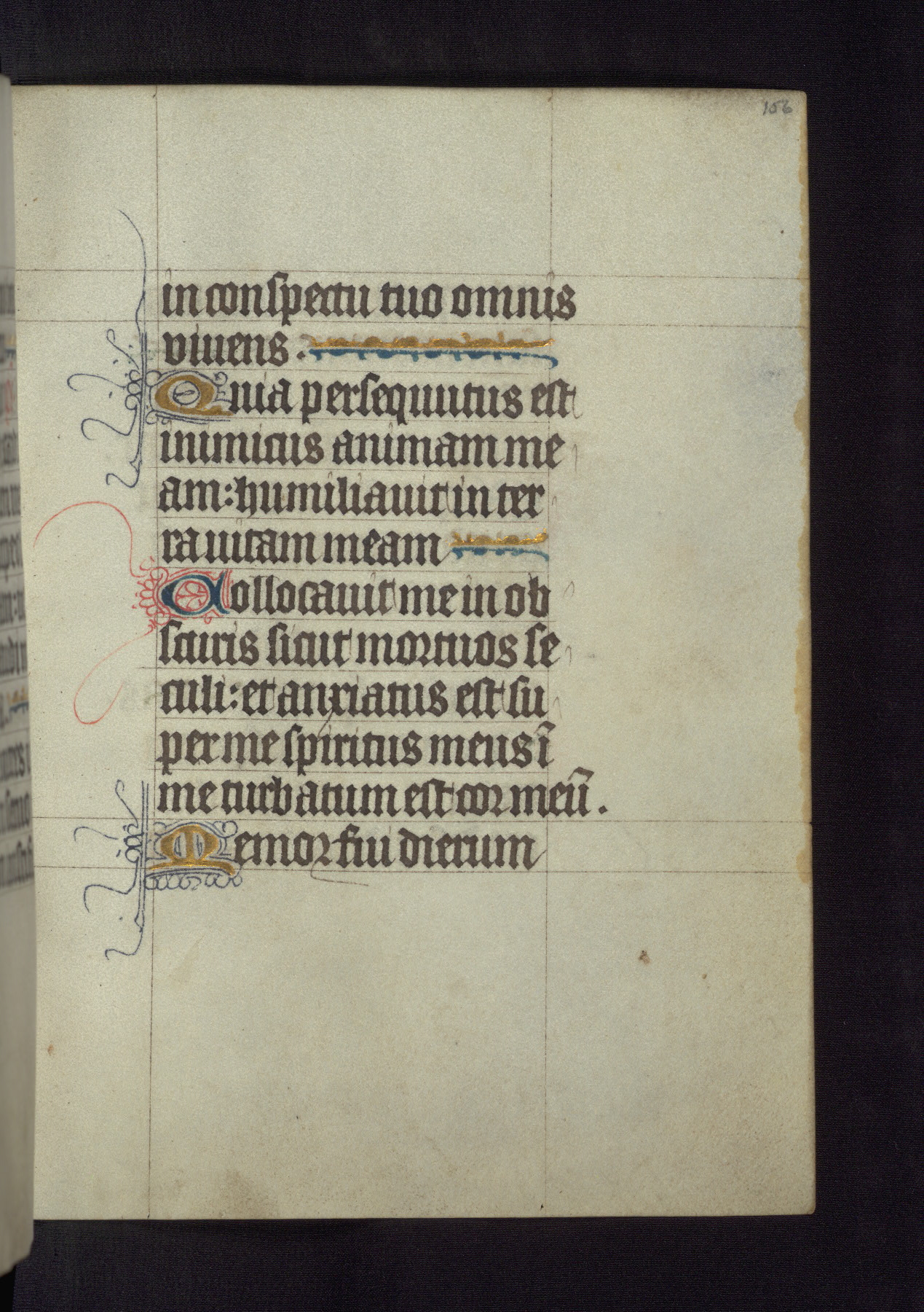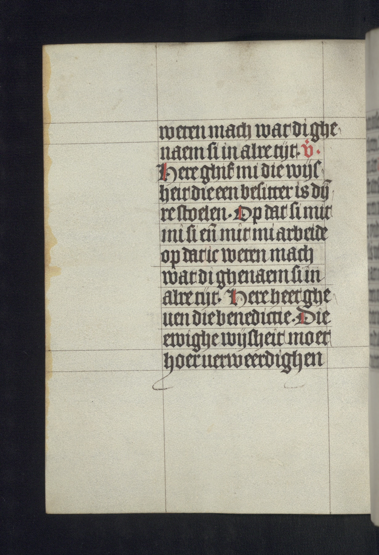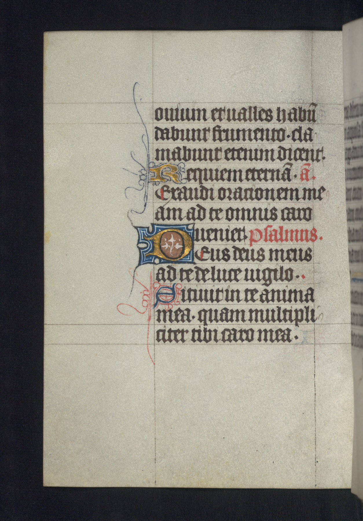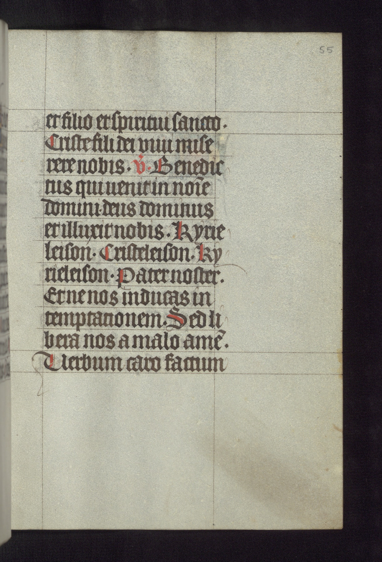 This Book of Hours was named the Doffinnes Hours after Franchoise de Doffinnes, who owned the book in the late sixteenth century and whose family’s subsequent history remains chronicled on the book’s final folios. However, the manuscript was originally made in the first quarter of the fifteenth century, probably for a married couple, who were originally represented kneeling with scrolls and their coats of arms in the margins, flanking a full-page miniature of the Crucifixion (fol. 72v), but whose figures and arms were later erased and overpainted with white. The manuscript contains both Latin and Dutch texts, supplemented by twelve full-page miniatures, the work of the Master of Walters 185. The manuscript also contains twelve pen-and-ink decorated initials in the calendar, some with grotesque faces, and letter "G" descenders throughout the book that can be attributed to the scribe Johannes de Malborch. The book’s original Dutch provenance is indicated by its calendar (for the Use of Utrecht) and its Hours of the Virgin, which follows predominantly the Use of the Windesheim Congregation. Prayers in Dutch were added to the end of the volume in the late fifteenth or early sixteenth century, and the book was subsequently rebound with its current cream-colored parchment binding of the seventeenth or eighteenth century.
