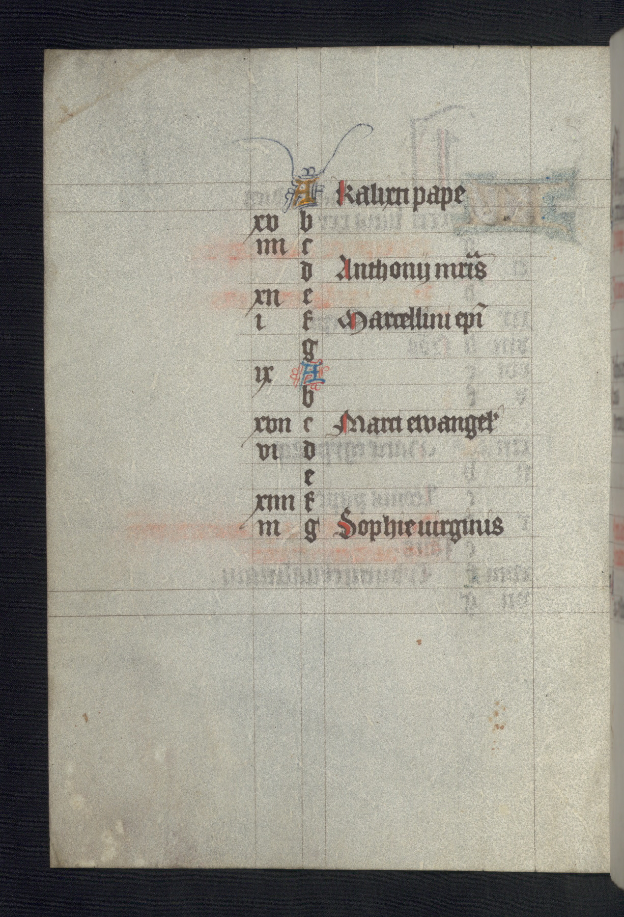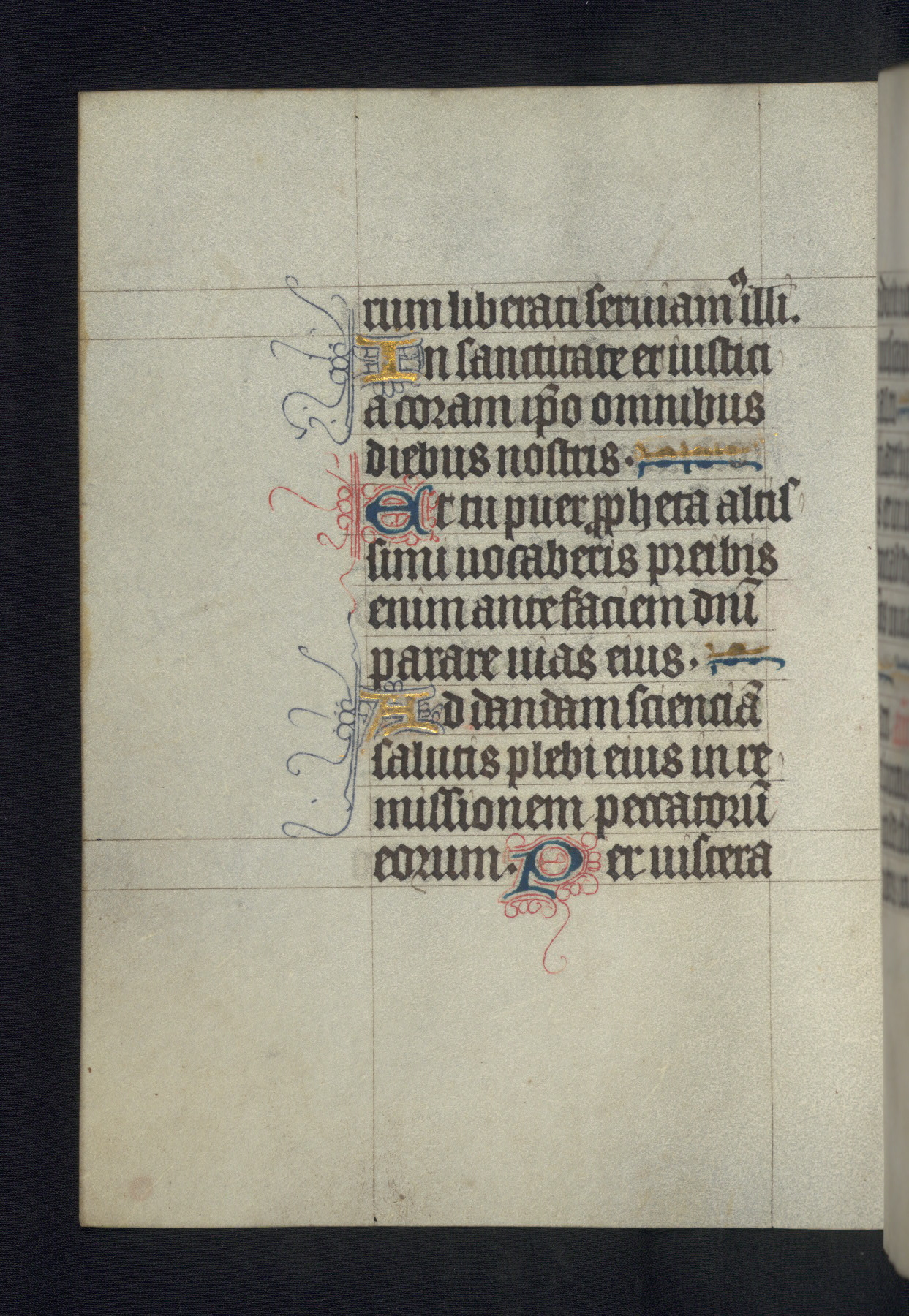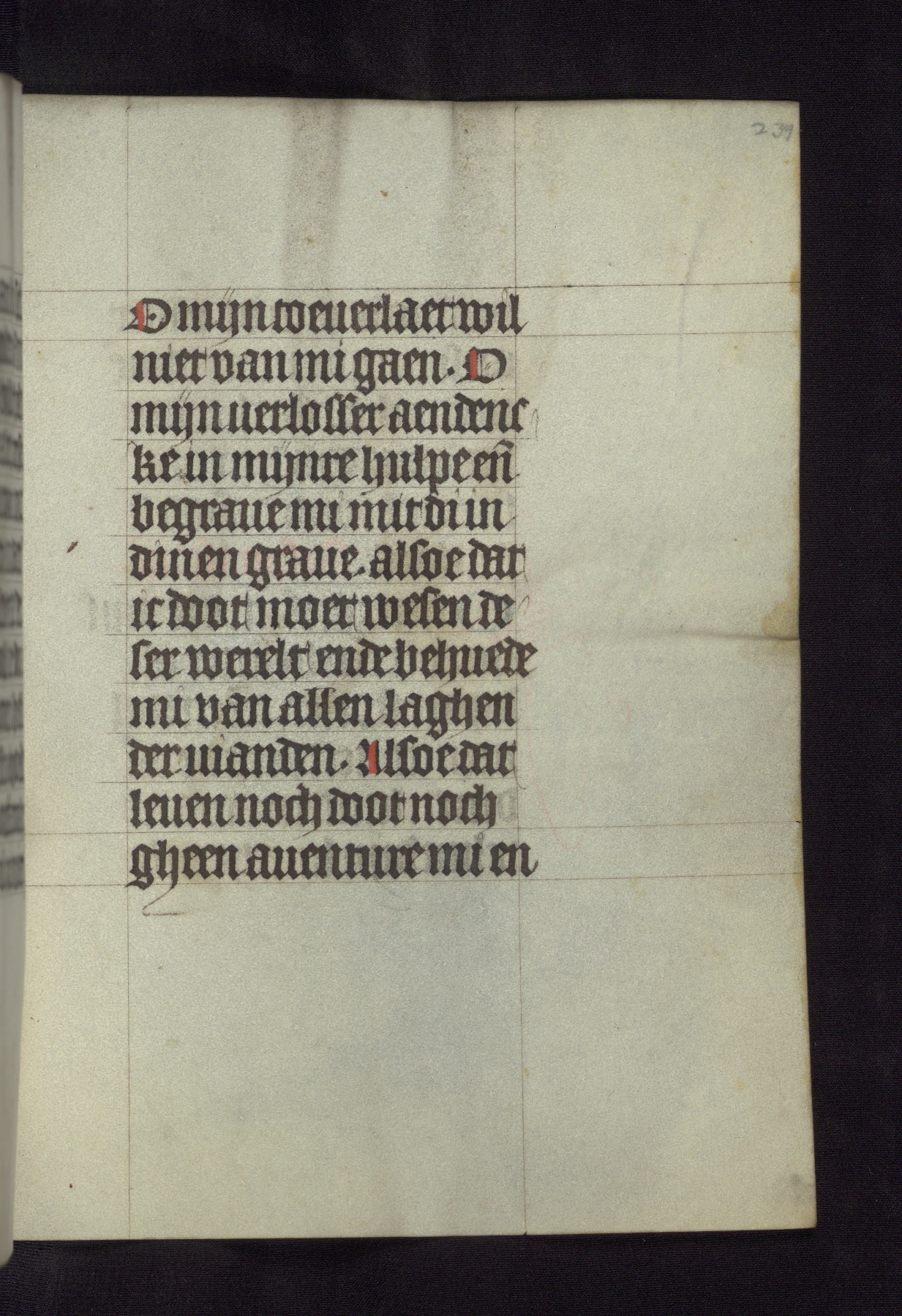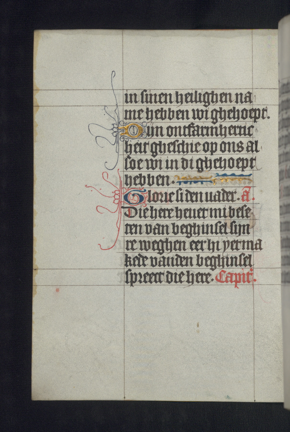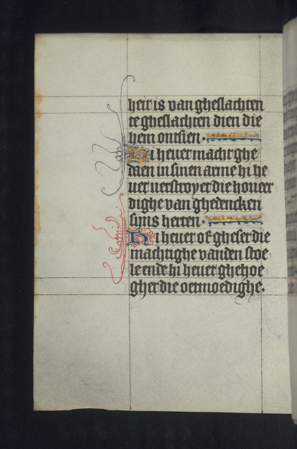 This Book of Hours was named the Doffinnes Hours after Franchoise de Doffinnes, who owned the book in the late sixteenth century and whose family’s subsequent history remains chronicled on the book’s final folios. However, the manuscript was originally made in the first quarter of the fifteenth century, probably for a married couple, who were originally represented kneeling with scrolls and their coats of arms in the margins, flanking a full-page miniature of the Crucifixion (fol. 72v), but whose figures and arms were later erased and overpainted with white. The manuscript contains both Latin and Dutch texts, supplemented by twelve full-page miniatures, the work of the Master of Walters 185. The manuscript also contains twelve pen-and-ink decorated initials in the calendar, some with grotesque faces, and letter "G" descenders throughout the book that can be attributed to the scribe Johannes de Malborch. The book’s original Dutch provenance is indicated by its calendar (for the Use of Utrecht) and its Hours of the Virgin, which follows predominantly the Use of the Windesheim Congregation. Prayers in Dutch were added to the end of the volume in the late fifteenth or early sixteenth century, and the book was subsequently rebound with its current cream-colored parchment binding of the seventeenth or eighteenth century.