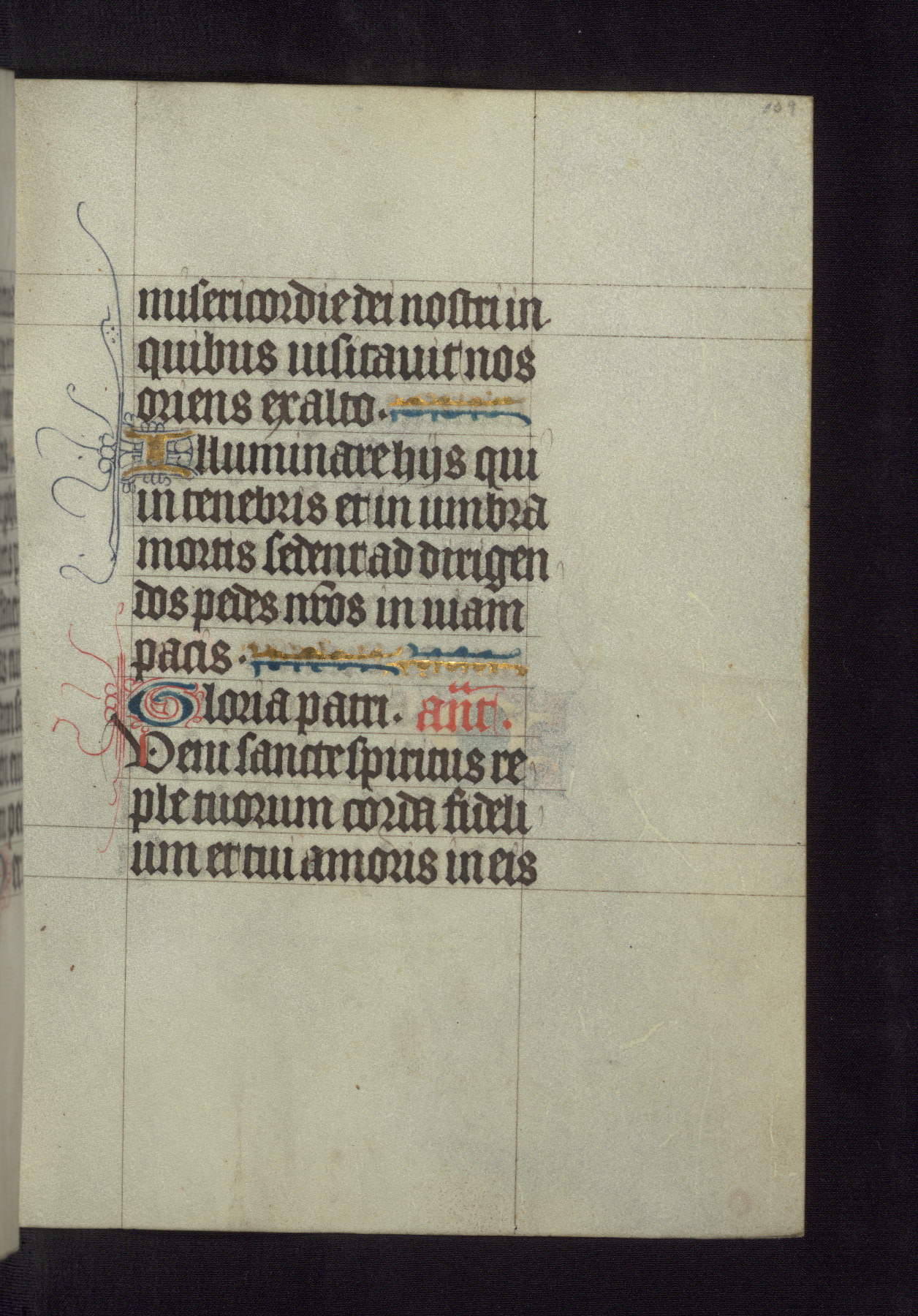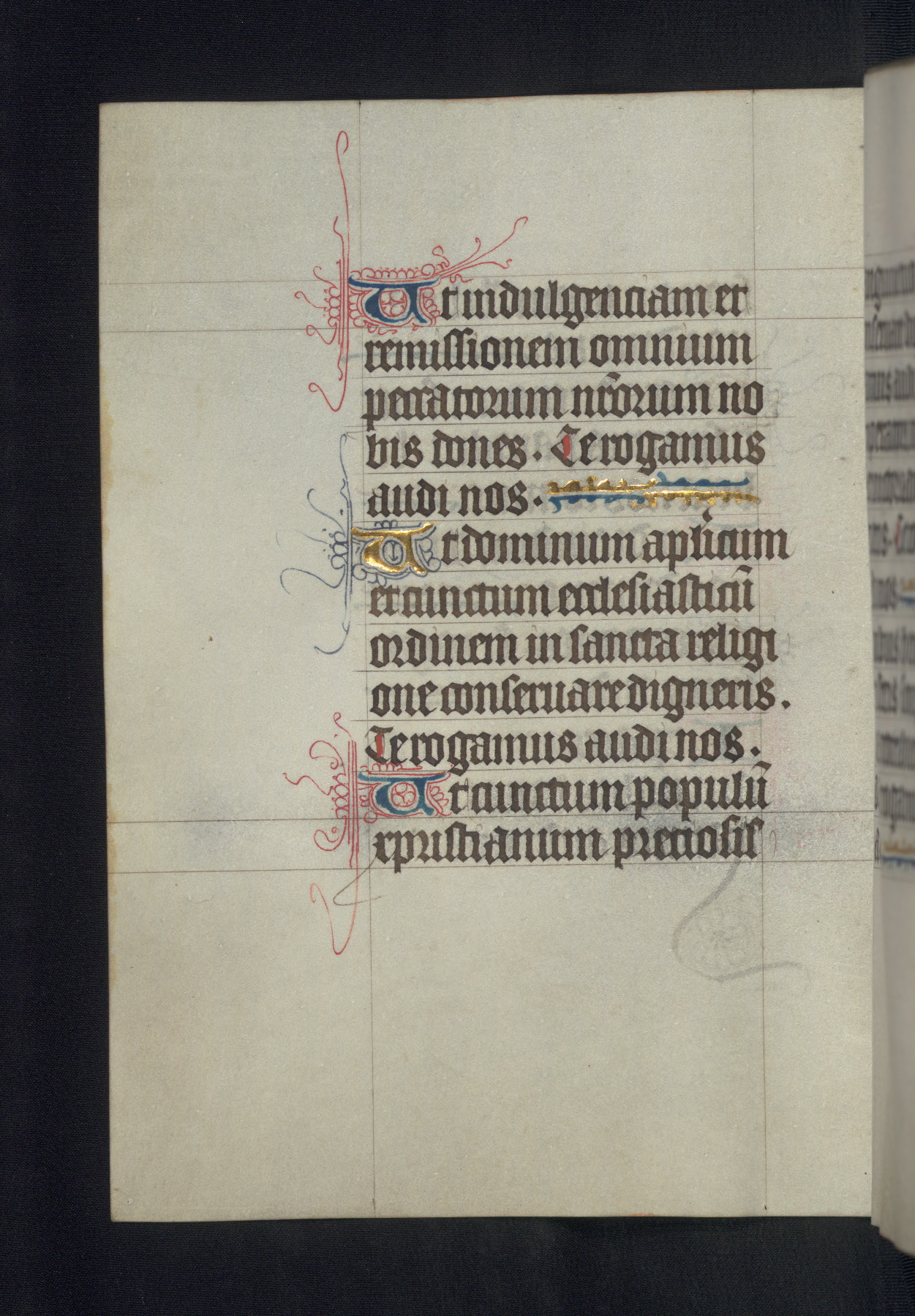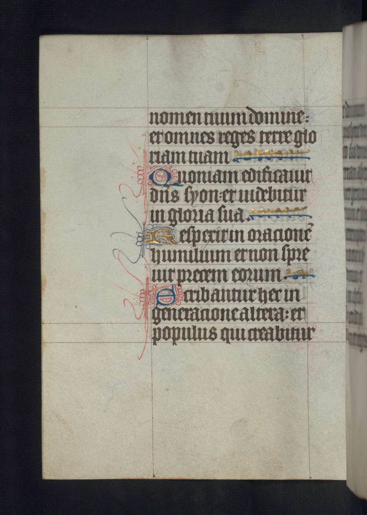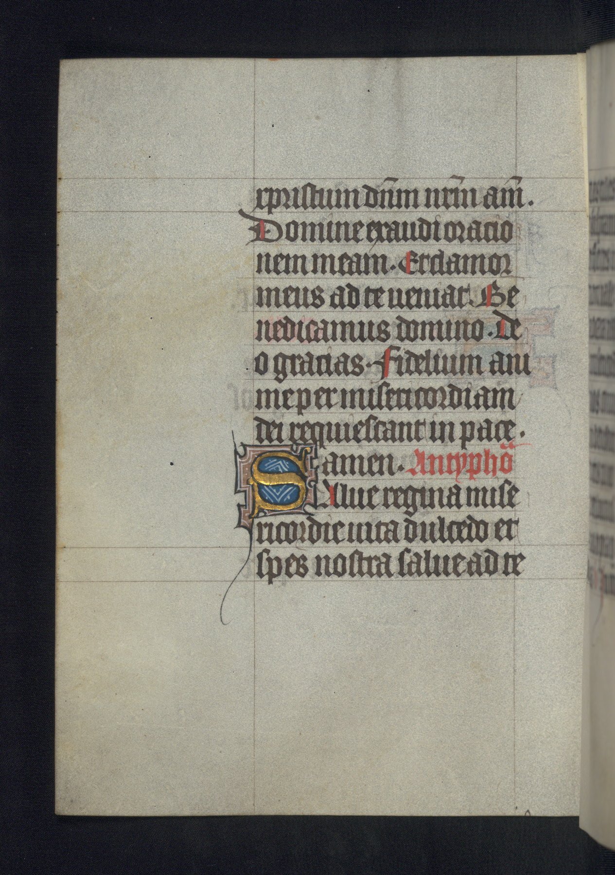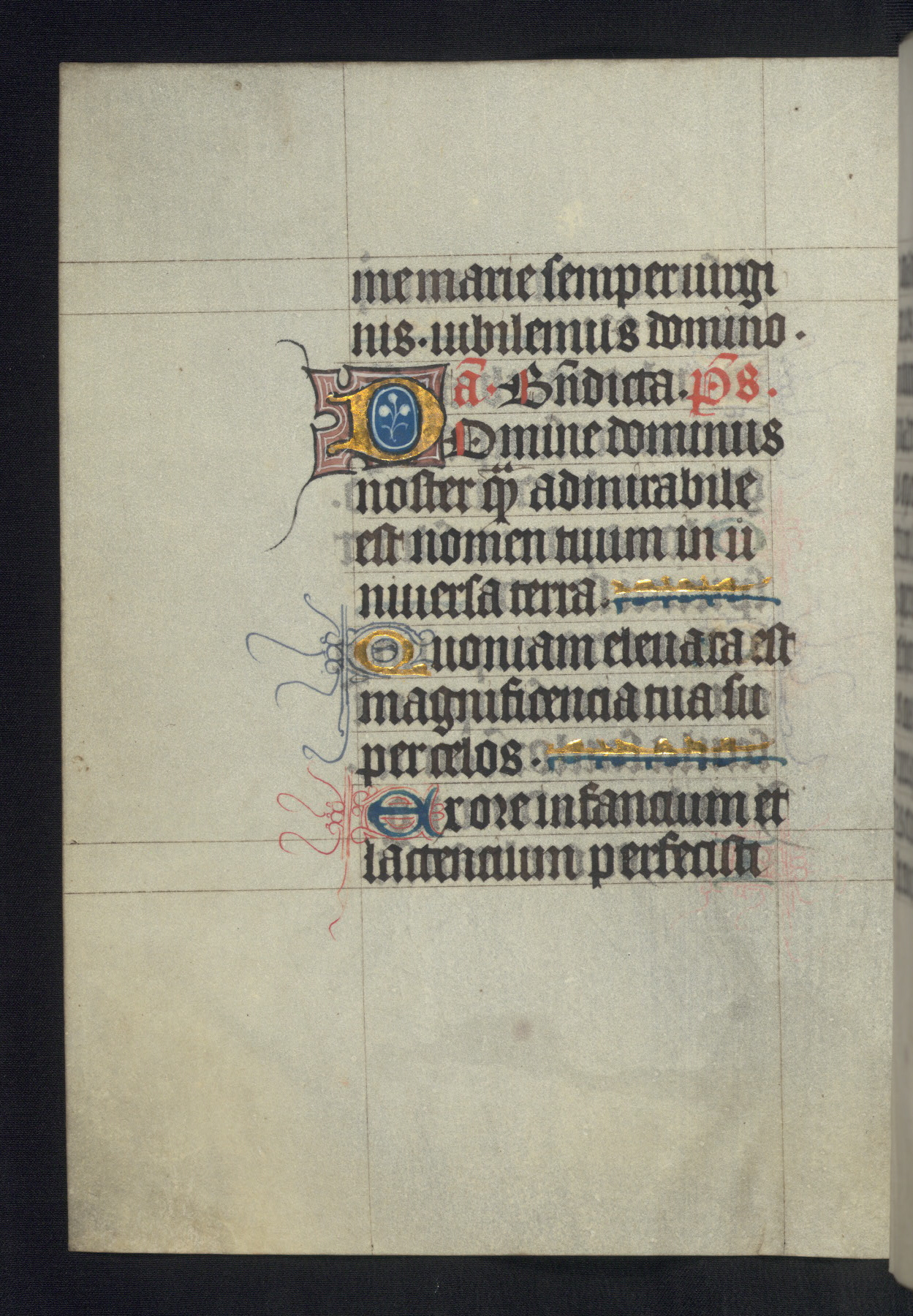 This Book of Hours was named the Doffinnes Hours after Franchoise de Doffinnes, who owned the book in the late sixteenth century and whose family’s subsequent history remains chronicled on the book’s final folios. However, the manuscript was originally made in the first quarter of the fifteenth century, probably for a married couple, who were originally represented kneeling with scrolls and their coats of arms in the margins, flanking a full-page miniature of the Crucifixion (fol. 72v), but whose figures and arms were later erased and overpainted with white. The manuscript contains both Latin and Dutch texts, supplemented by twelve full-page miniatures, the work of the Master of Walters 185. The manuscript also contains twelve pen-and-ink decorated initials in the calendar, some with grotesque faces, and letter "G" descenders throughout the book that can be attributed to the scribe Johannes de Malborch. The book’s original Dutch provenance is indicated by its calendar (for the Use of Utrecht) and its Hours of the Virgin, which follows predominantly the Use of the Windesheim Congregation. Prayers in Dutch were added to the end of the volume in the late fifteenth or early sixteenth century, and the book was subsequently rebound with its current cream-colored parchment binding of the seventeenth or eighteenth century.