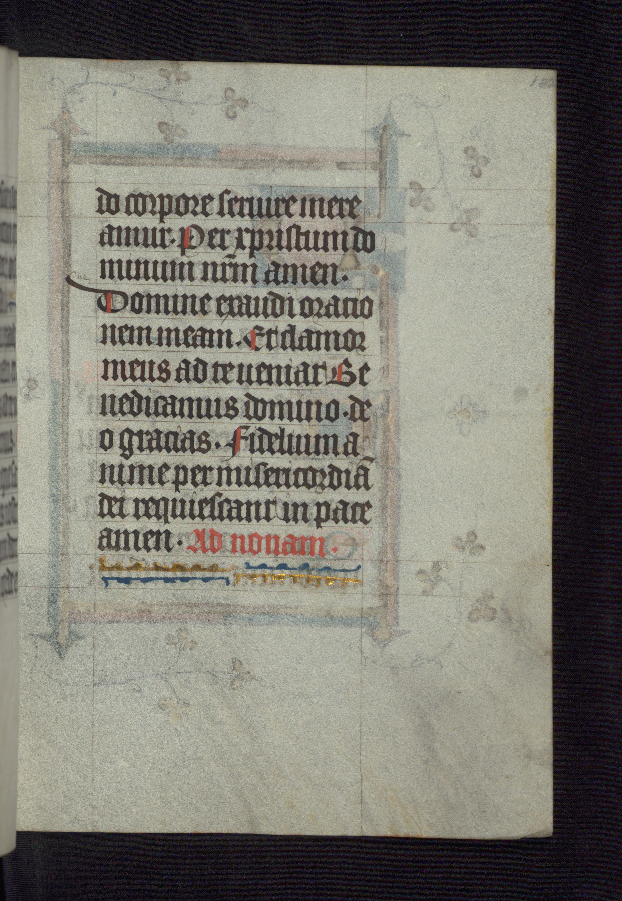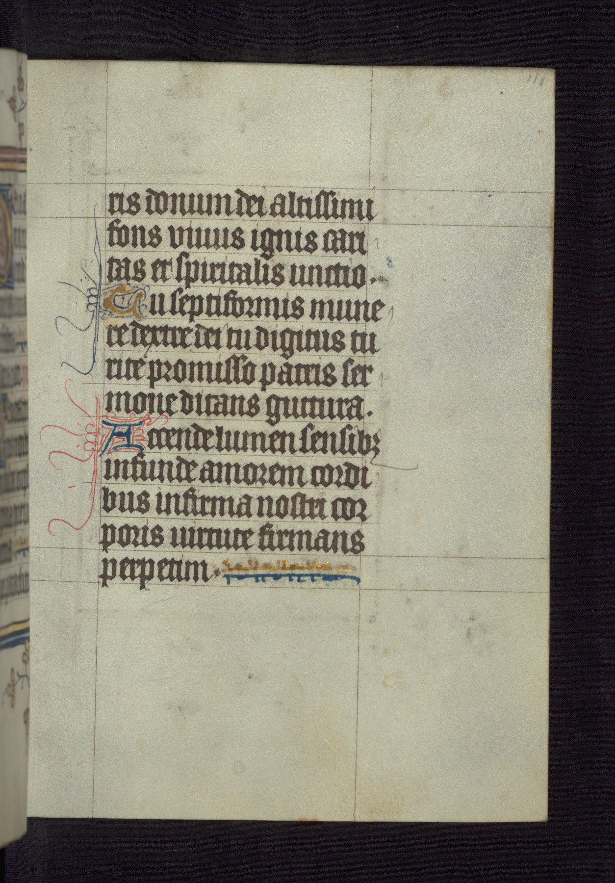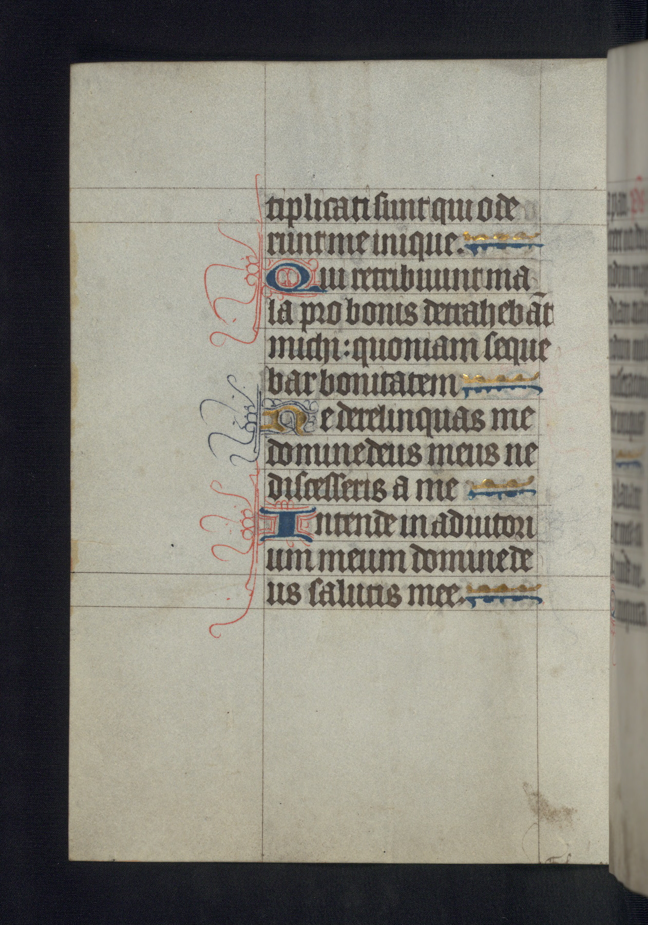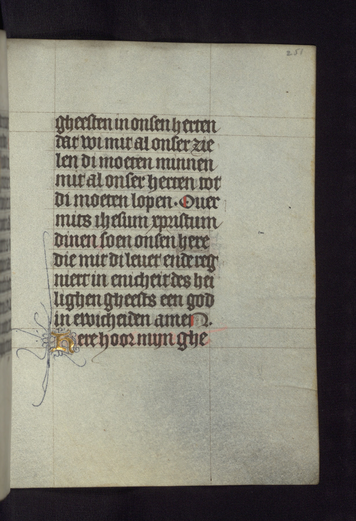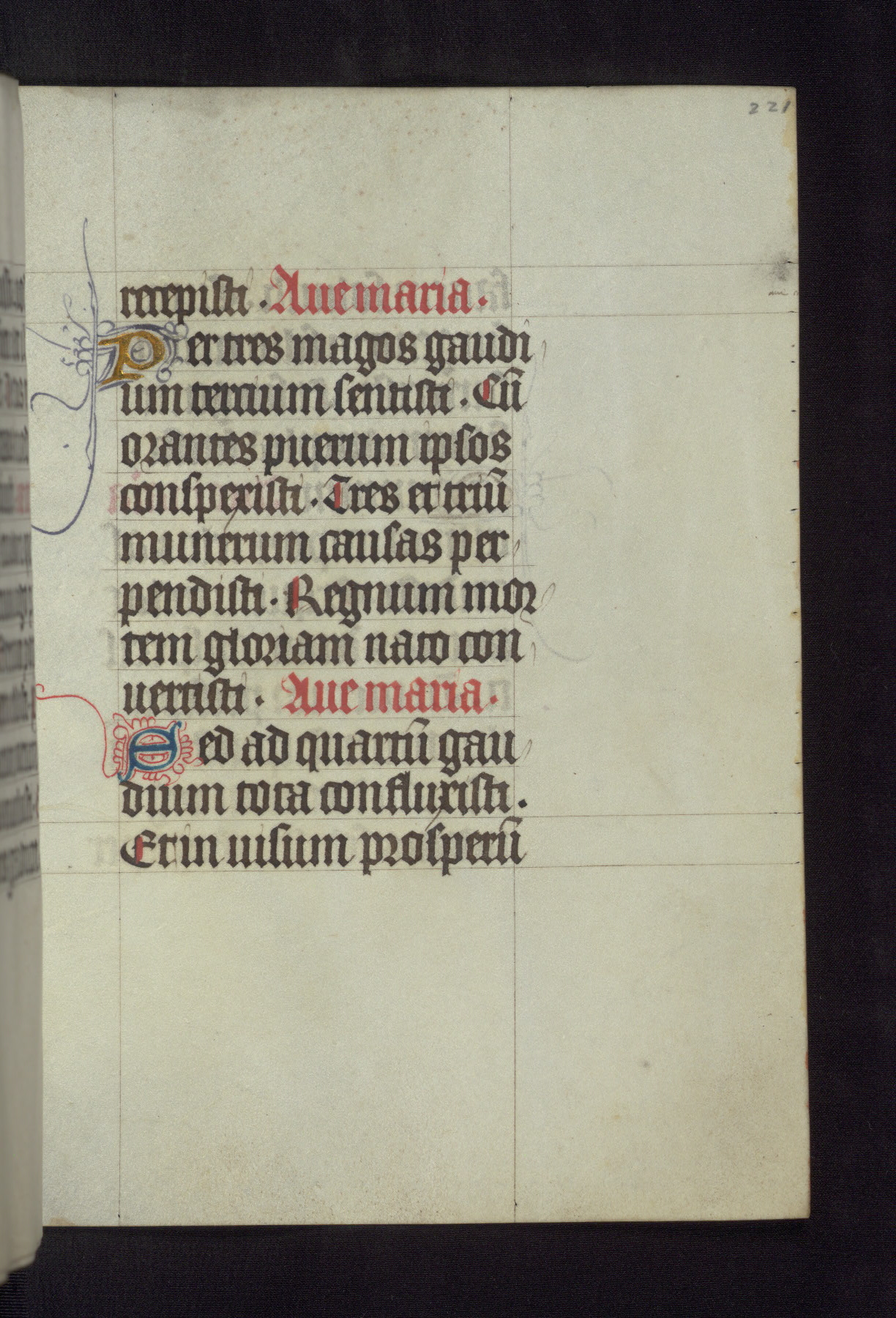 This Book of Hours was named the Doffinnes Hours after Franchoise de Doffinnes, who owned the book in the late sixteenth century and whose family’s subsequent history remains chronicled on the book’s final folios. However, the manuscript was originally made in the first quarter of the fifteenth century, probably for a married couple, who were originally represented kneeling with scrolls and their coats of arms in the margins, flanking a full-page miniature of the Crucifixion (fol. 72v), but whose figures and arms were later erased and overpainted with white. The manuscript contains both Latin and Dutch texts, supplemented by twelve full-page miniatures, the work of the Master of Walters 185. The manuscript also contains twelve pen-and-ink decorated initials in the calendar, some with grotesque faces, and letter "G" descenders throughout the book that can be attributed to the scribe Johannes de Malborch. The book’s original Dutch provenance is indicated by its calendar (for the Use of Utrecht) and its Hours of the Virgin, which follows predominantly the Use of the Windesheim Congregation. Prayers in Dutch were added to the end of the volume in the late fifteenth or early sixteenth century, and the book was subsequently rebound with its current cream-colored parchment binding of the seventeenth or eighteenth century.