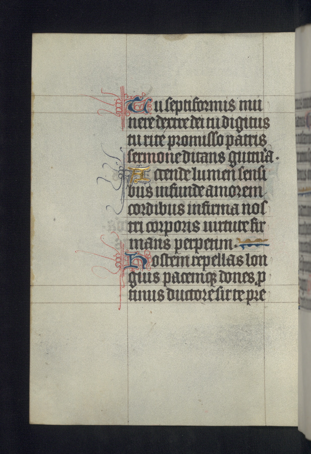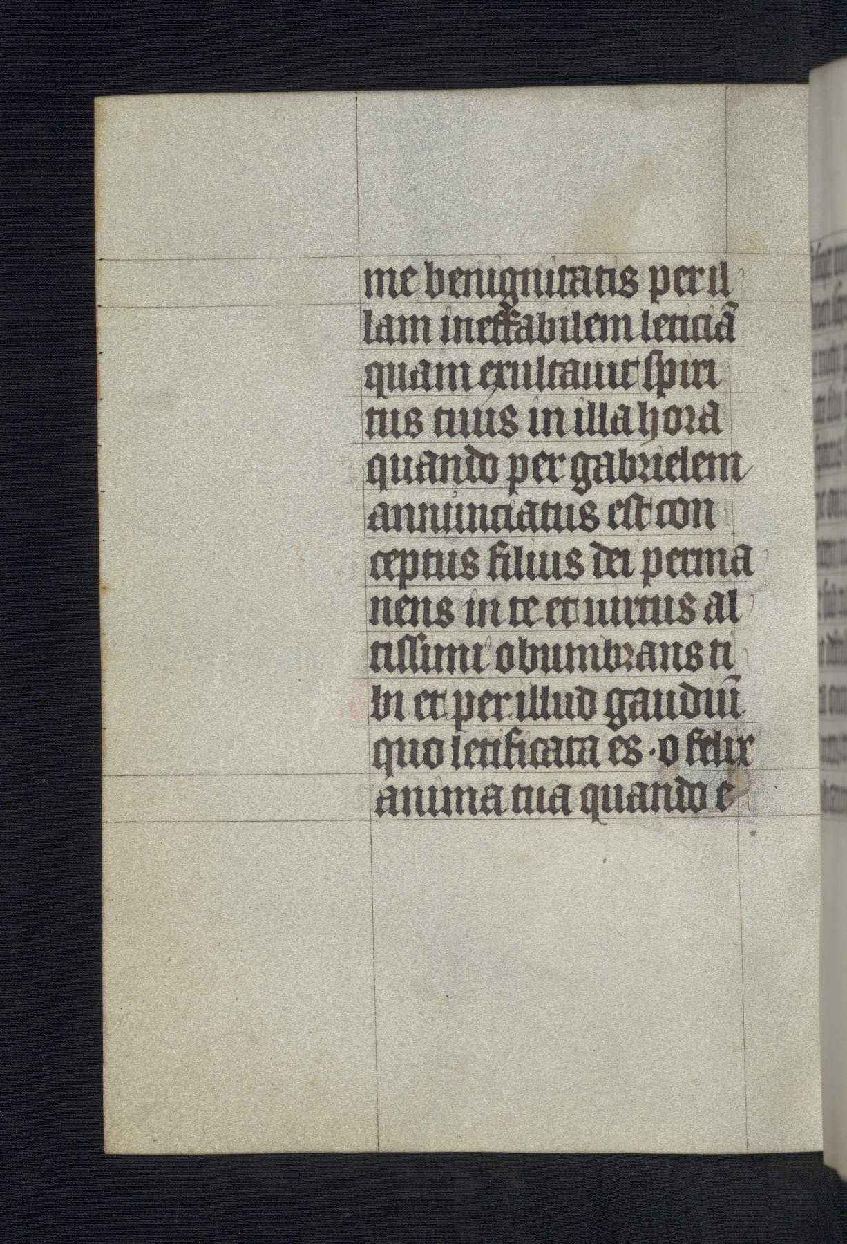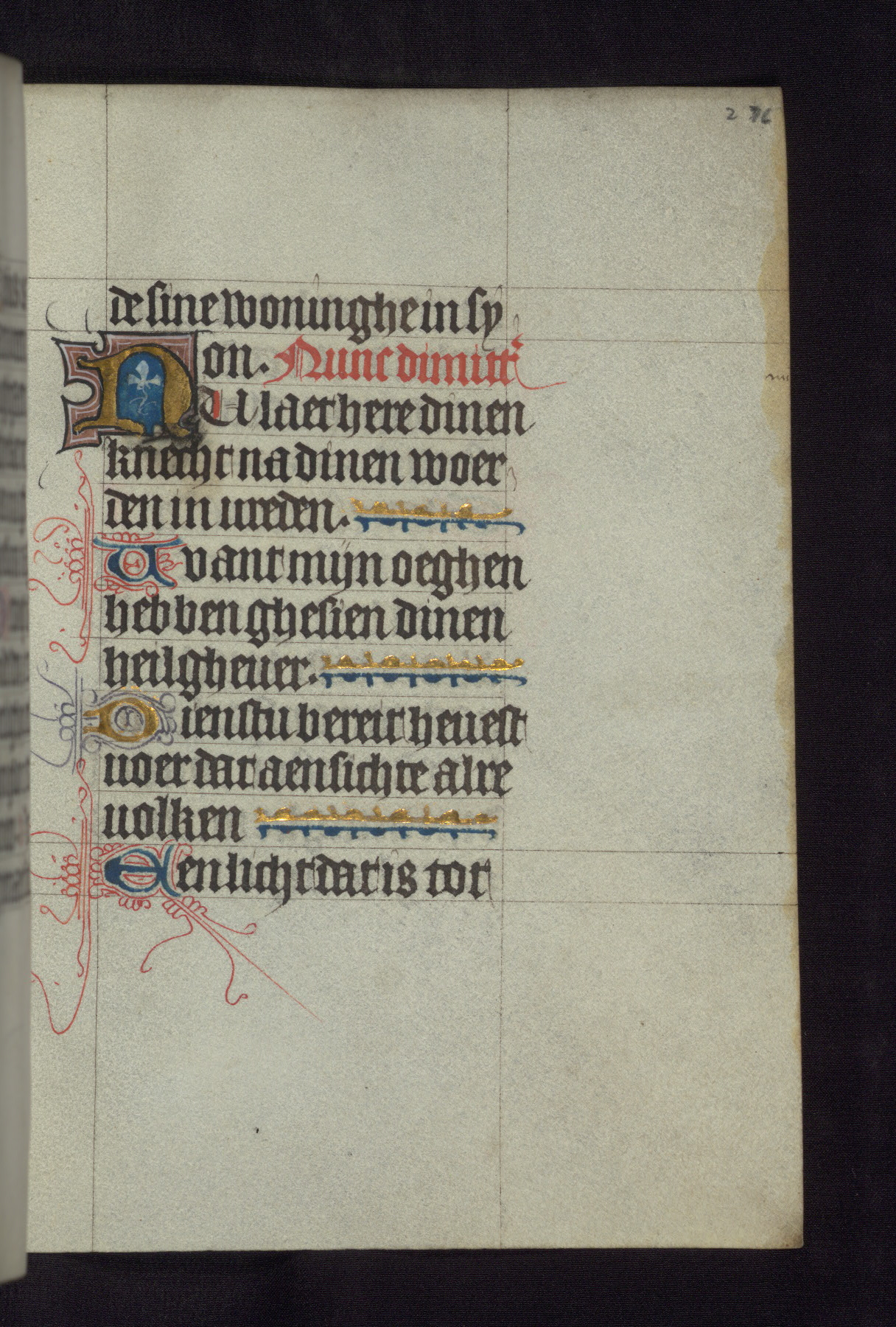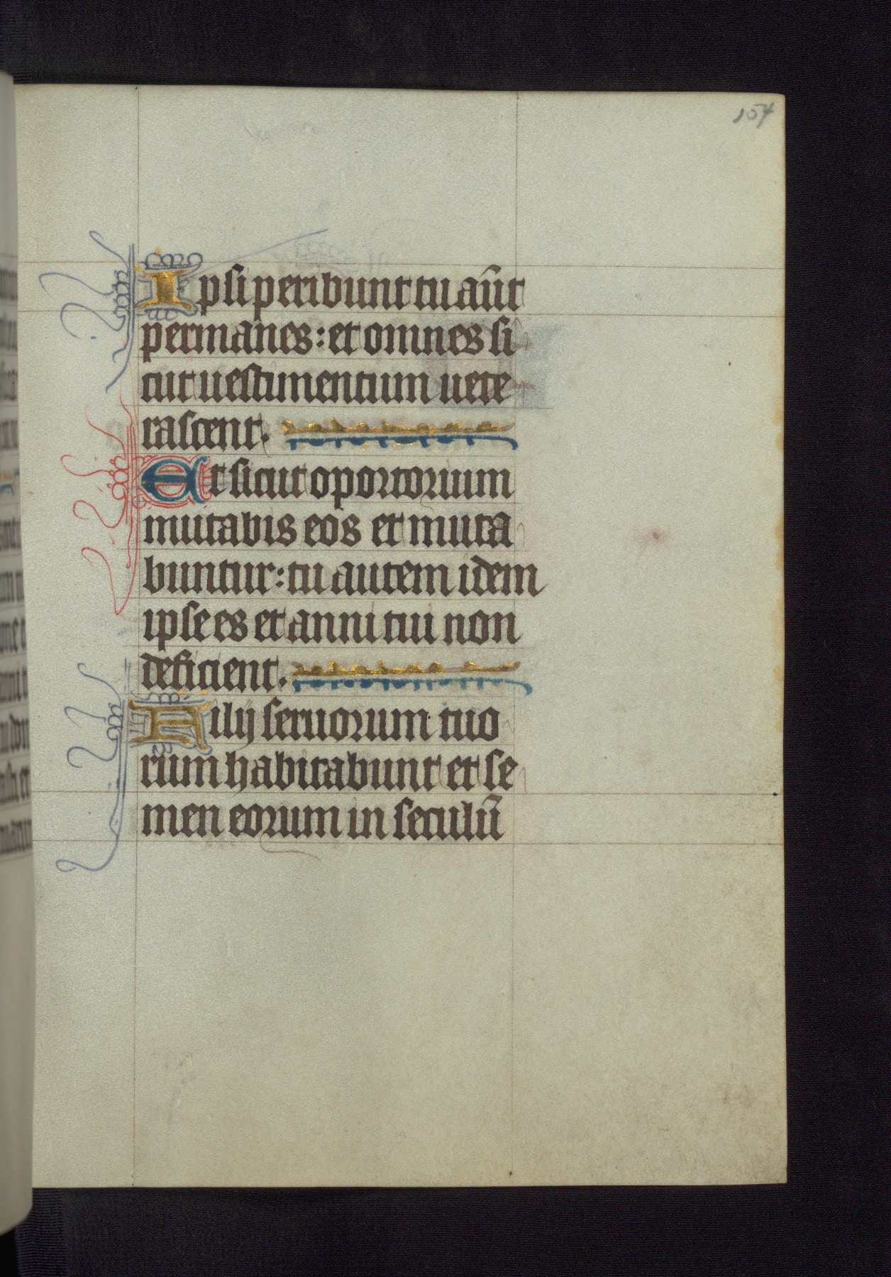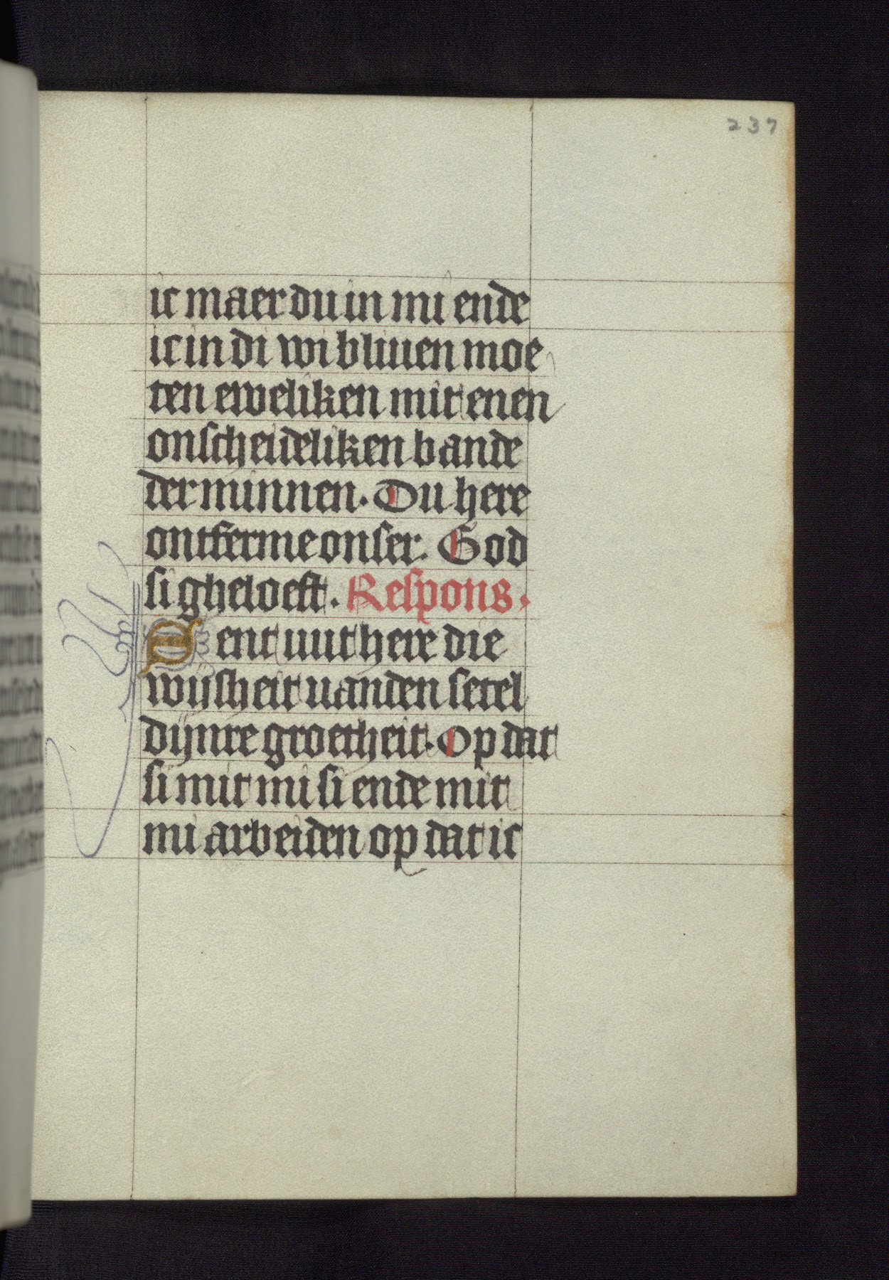 This Book of Hours was named the Doffinnes Hours after Franchoise de Doffinnes, who owned the book in the late sixteenth century and whose family’s subsequent history remains chronicled on the book’s final folios. However, the manuscript was originally made in the first quarter of the fifteenth century, probably for a married couple, who were originally represented kneeling with scrolls and their coats of arms in the margins, flanking a full-page miniature of the Crucifixion (fol. 72v), but whose figures and arms were later erased and overpainted with white. The manuscript contains both Latin and Dutch texts, supplemented by twelve full-page miniatures, the work of the Master of Walters 185. The manuscript also contains twelve pen-and-ink decorated initials in the calendar, some with grotesque faces, and letter "G" descenders throughout the book that can be attributed to the scribe Johannes de Malborch. The book’s original Dutch provenance is indicated by its calendar (for the Use of Utrecht) and its Hours of the Virgin, which follows predominantly the Use of the Windesheim Congregation. Prayers in Dutch were added to the end of the volume in the late fifteenth or early sixteenth century, and the book was subsequently rebound with its current cream-colored parchment binding of the seventeenth or eighteenth century.