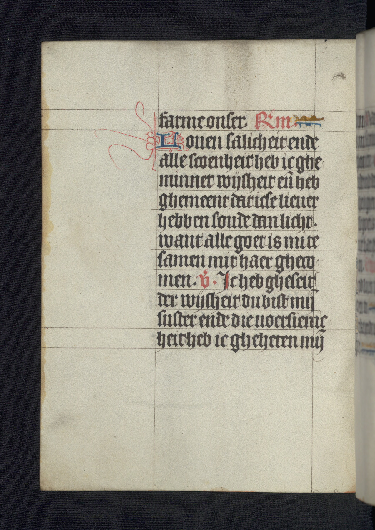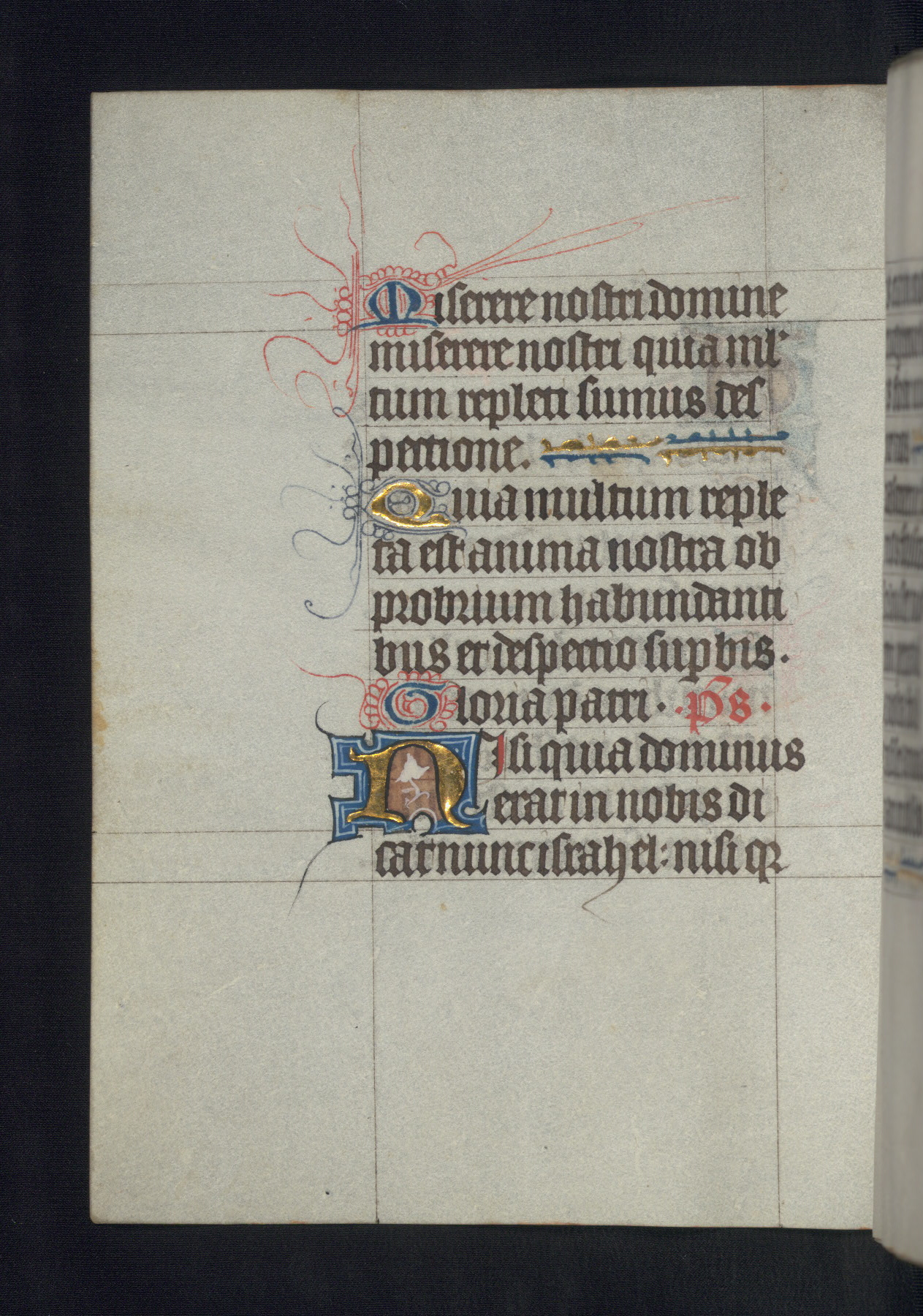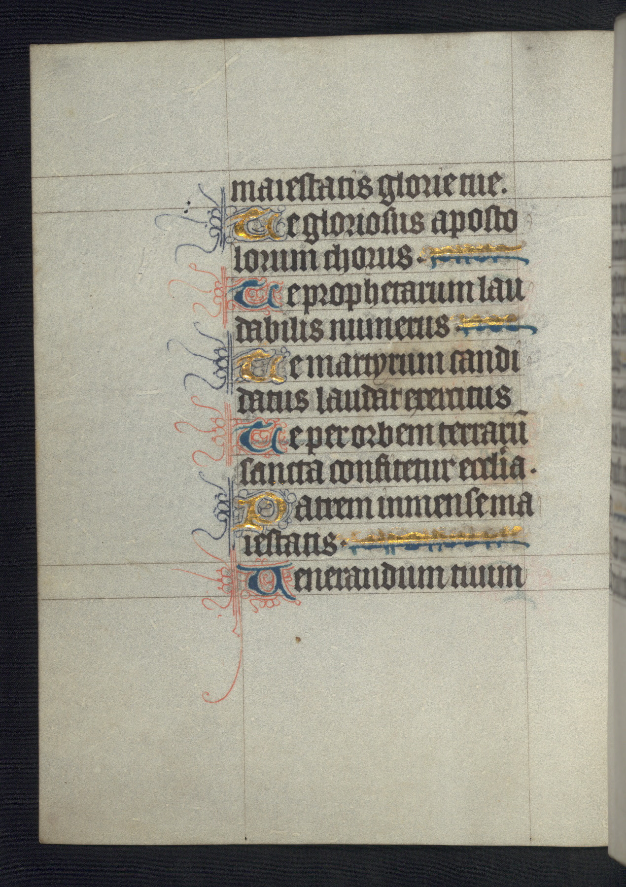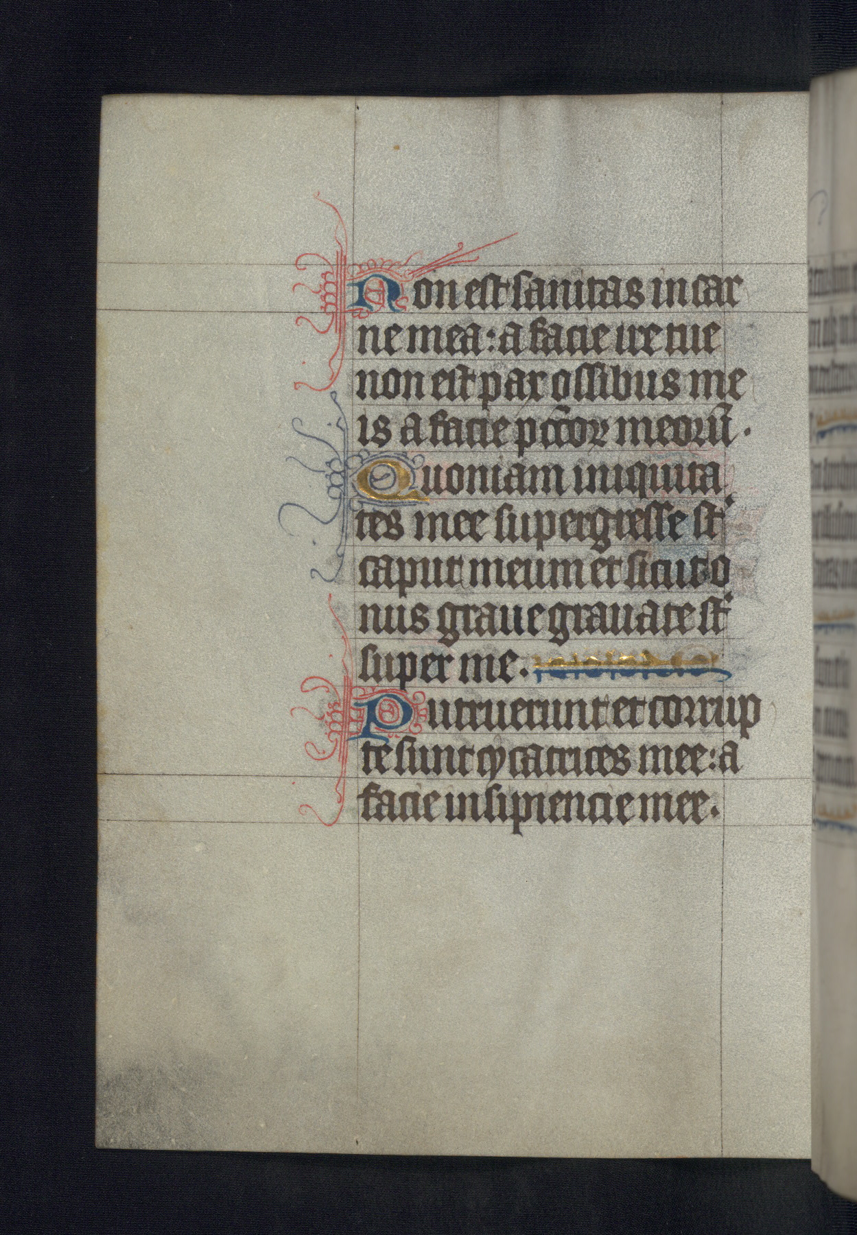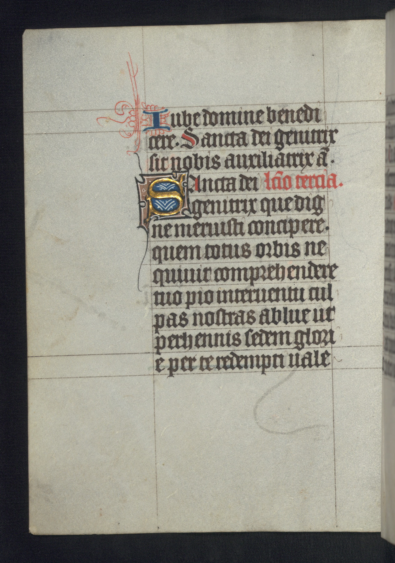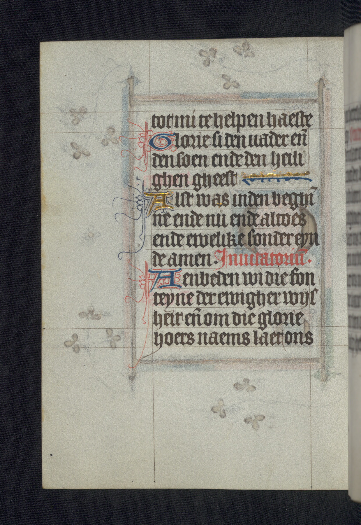 This Book of Hours was named the Doffinnes Hours after Franchoise de Doffinnes, who owned the book in the late sixteenth century and whose family’s subsequent history remains chronicled on the book’s final folios. However, the manuscript was originally made in the first quarter of the fifteenth century, probably for a married couple, who were originally represented kneeling with scrolls and their coats of arms in the margins, flanking a full-page miniature of the Crucifixion (fol. 72v), but whose figures and arms were later erased and overpainted with white. The manuscript contains both Latin and Dutch texts, supplemented by twelve full-page miniatures, the work of the Master of Walters 185. The manuscript also contains twelve pen-and-ink decorated initials in the calendar, some with grotesque faces, and letter "G" descenders throughout the book that can be attributed to the scribe Johannes de Malborch. The book’s original Dutch provenance is indicated by its calendar (for the Use of Utrecht) and its Hours of the Virgin, which follows predominantly the Use of the Windesheim Congregation. Prayers in Dutch were added to the end of the volume in the late fifteenth or early sixteenth century, and the book was subsequently rebound with its current cream-colored parchment binding of the seventeenth or eighteenth century.