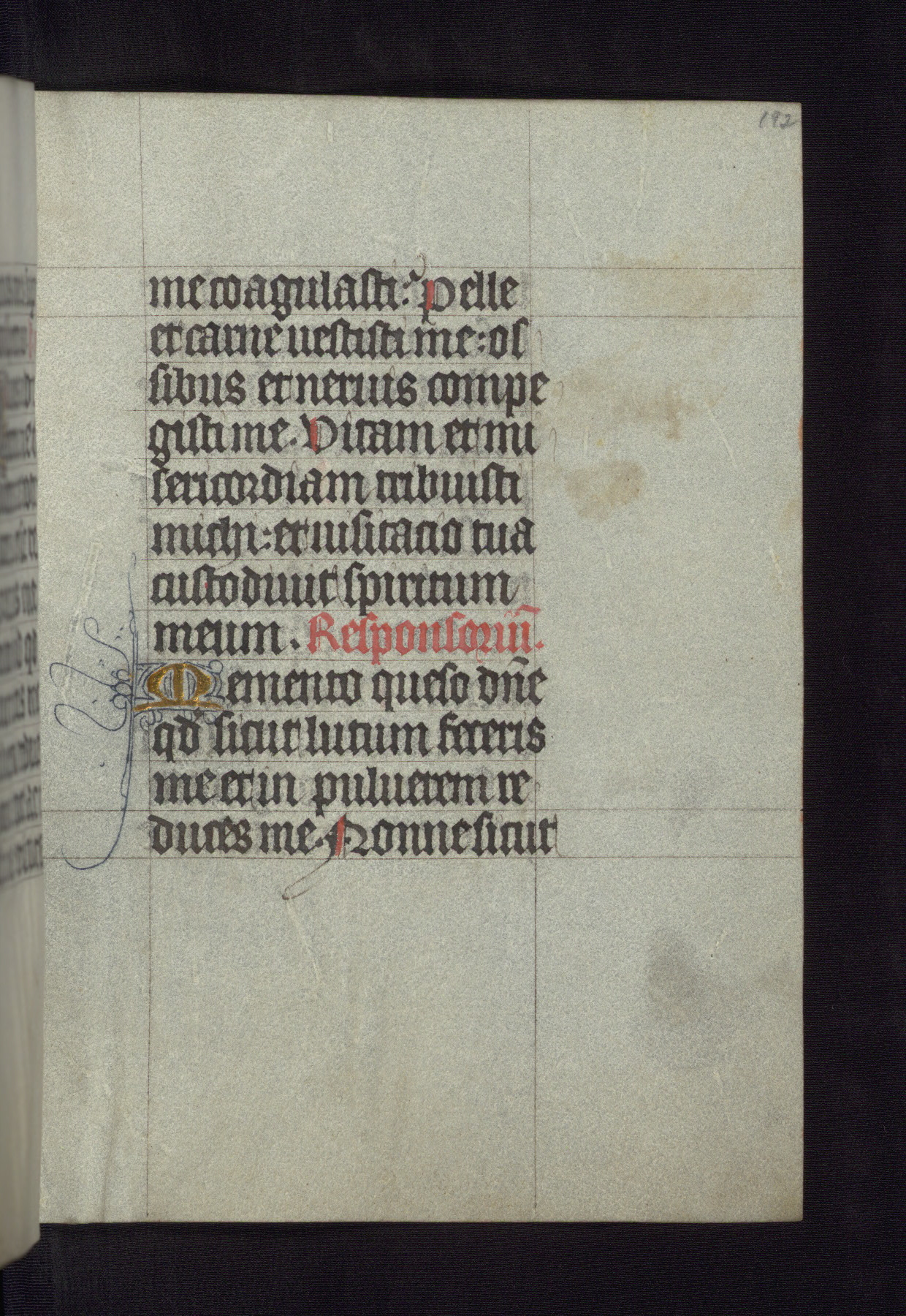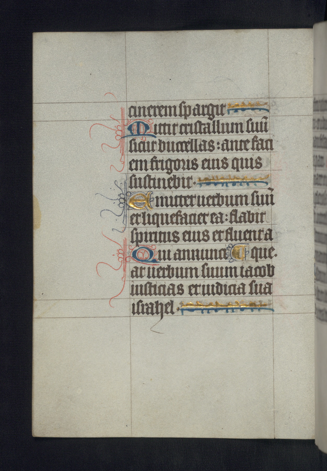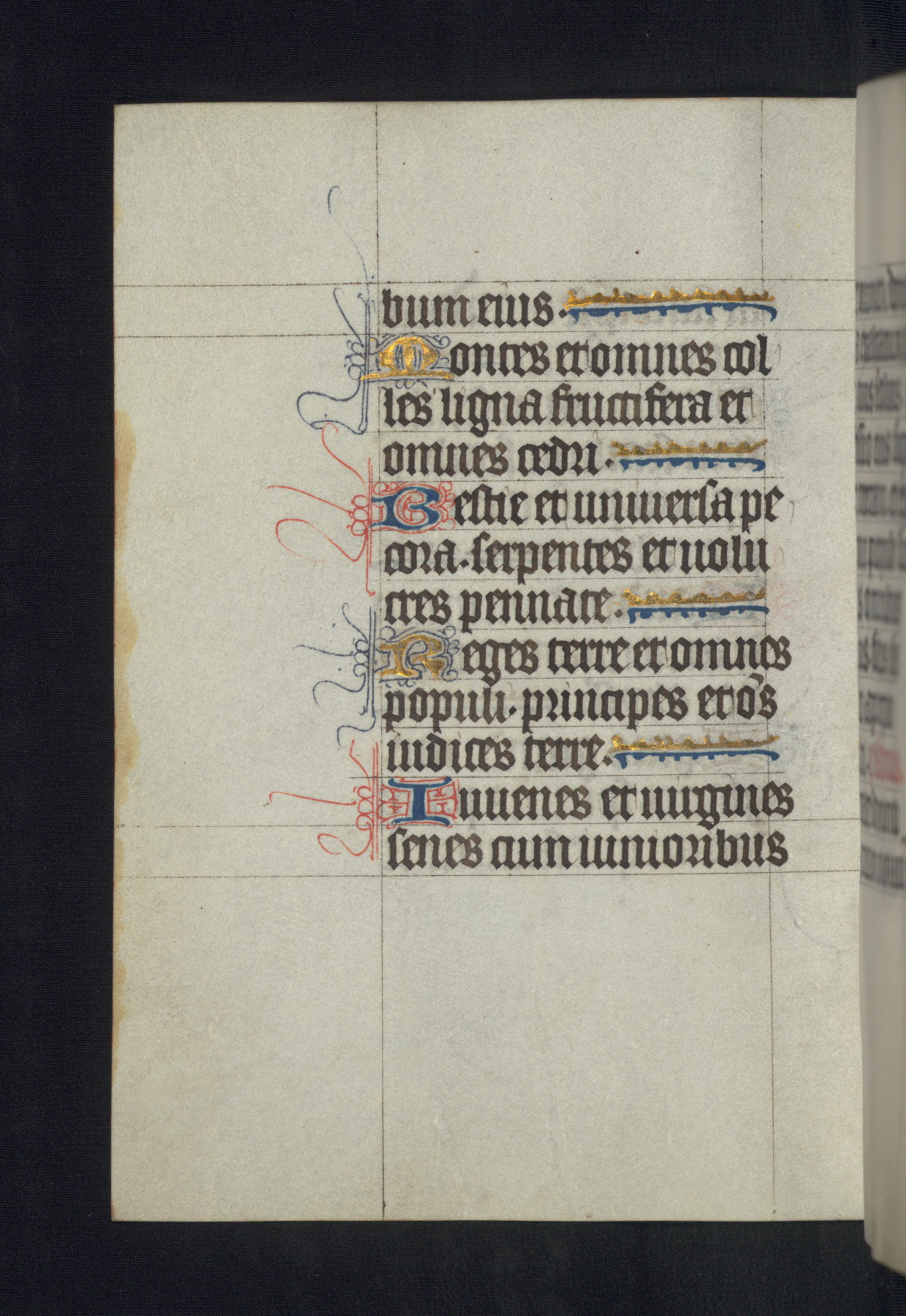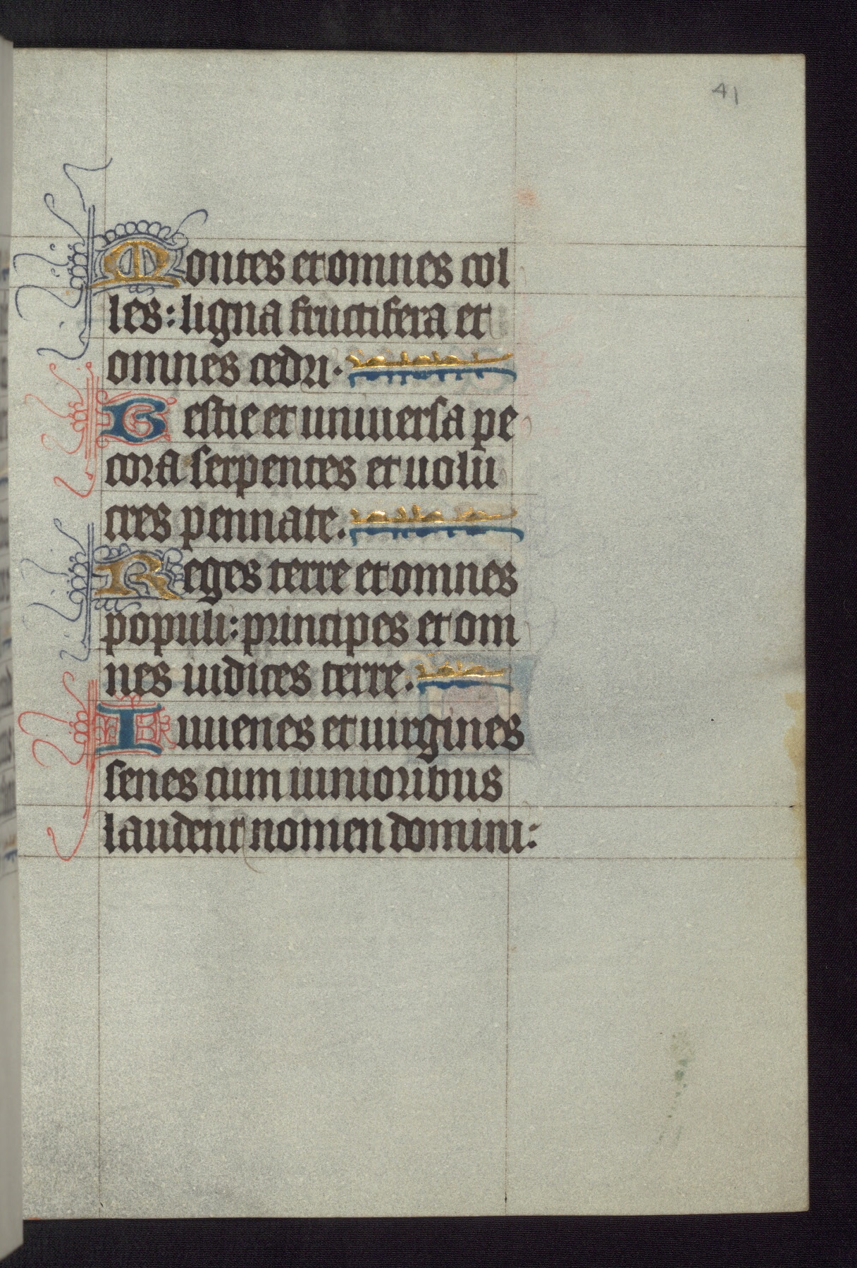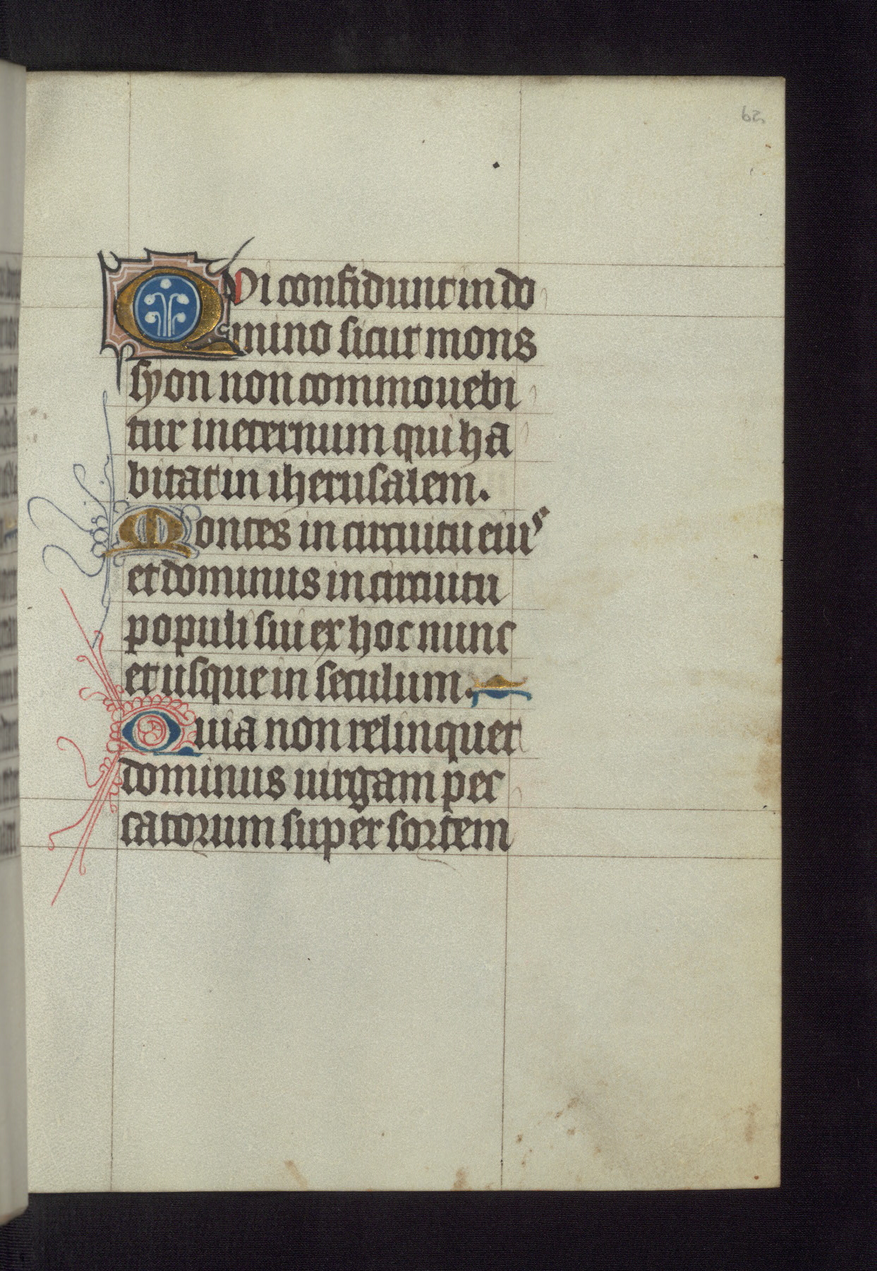 This Book of Hours was named the Doffinnes Hours after Franchoise de Doffinnes, who owned the book in the late sixteenth century and whose family’s subsequent history remains chronicled on the book’s final folios. However, the manuscript was originally made in the first quarter of the fifteenth century, probably for a married couple, who were originally represented kneeling with scrolls and their coats of arms in the margins, flanking a full-page miniature of the Crucifixion (fol. 72v), but whose figures and arms were later erased and overpainted with white. The manuscript contains both Latin and Dutch texts, supplemented by twelve full-page miniatures, the work of the Master of Walters 185. The manuscript also contains twelve pen-and-ink decorated initials in the calendar, some with grotesque faces, and letter "G" descenders throughout the book that can be attributed to the scribe Johannes de Malborch. The book’s original Dutch provenance is indicated by its calendar (for the Use of Utrecht) and its Hours of the Virgin, which follows predominantly the Use of the Windesheim Congregation. Prayers in Dutch were added to the end of the volume in the late fifteenth or early sixteenth century, and the book was subsequently rebound with its current cream-colored parchment binding of the seventeenth or eighteenth century.