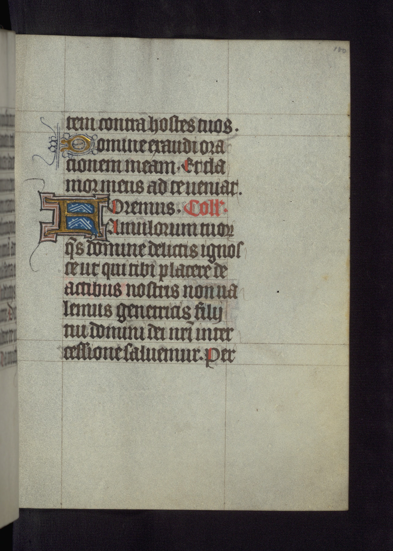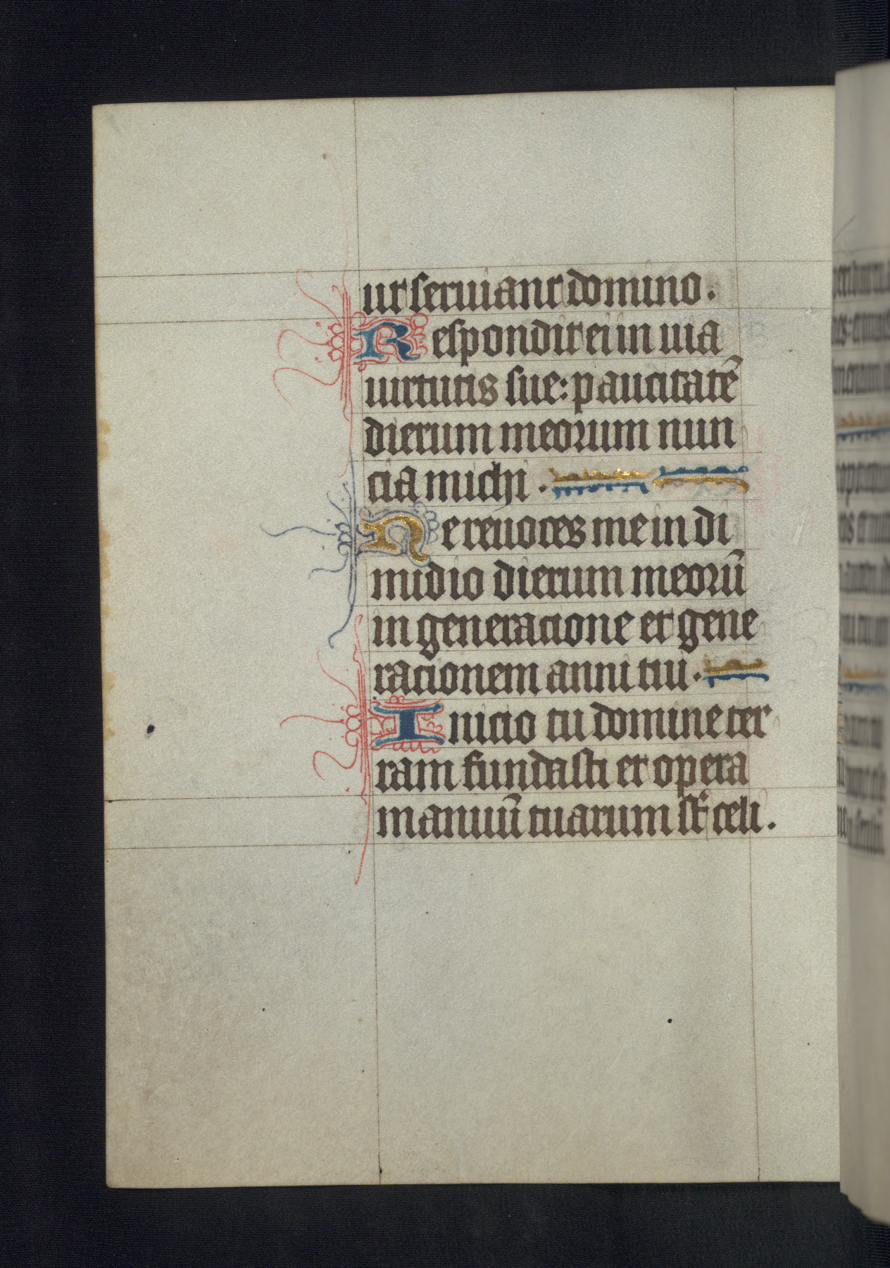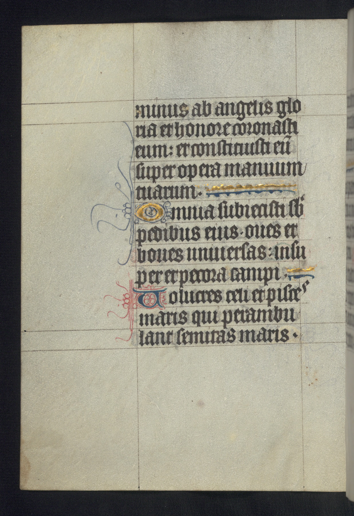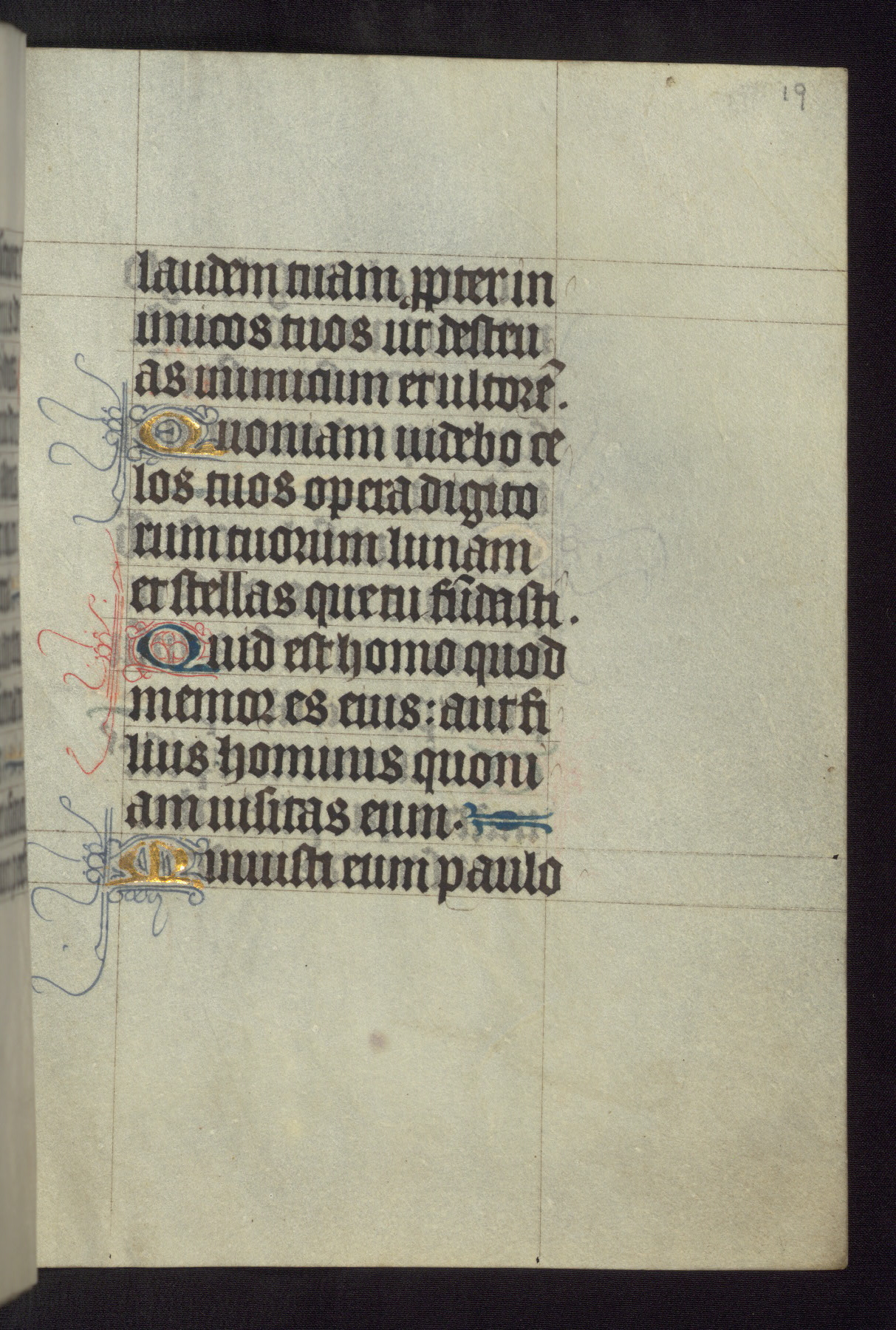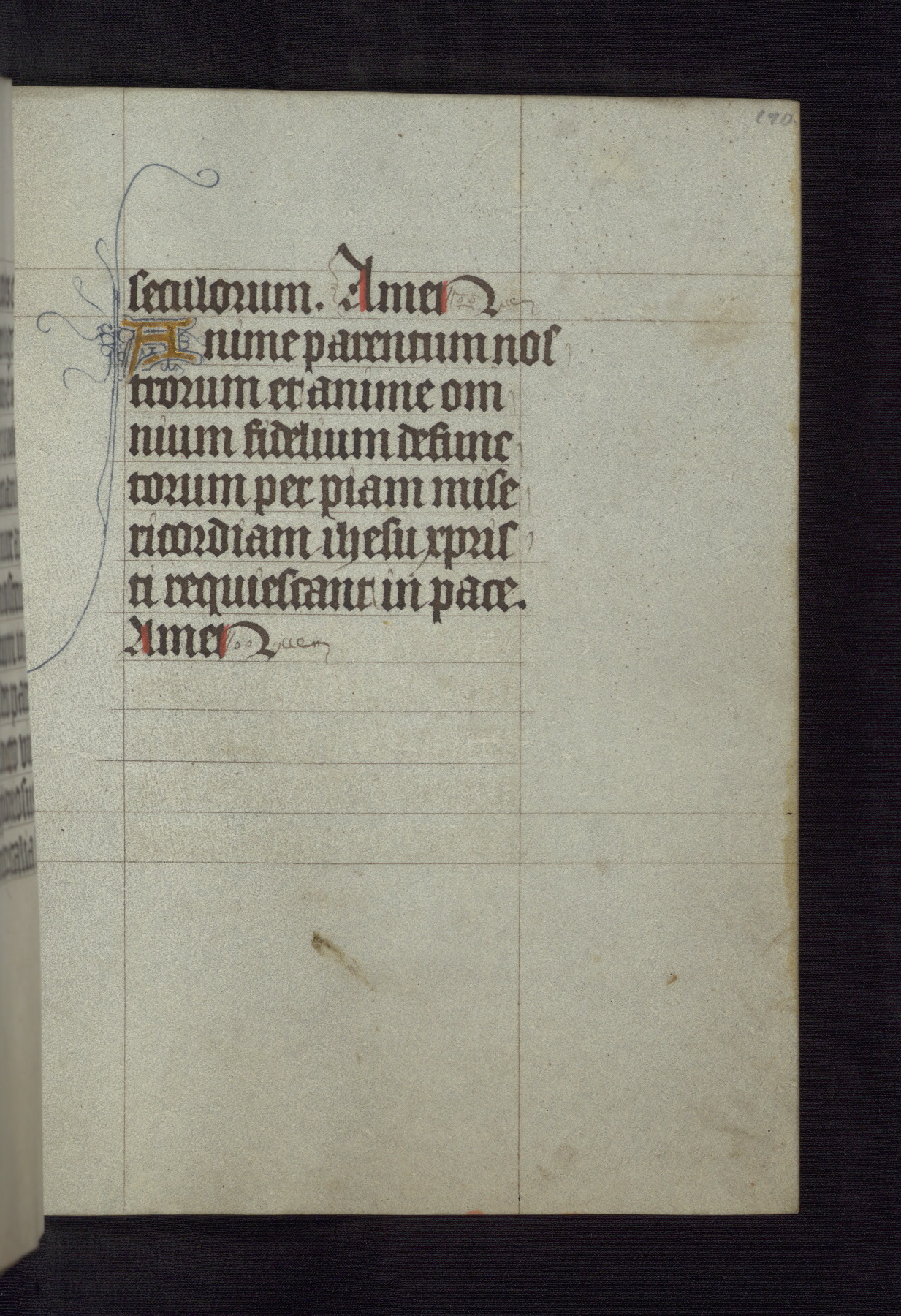 This Book of Hours was named the Doffinnes Hours after Franchoise de Doffinnes, who owned the book in the late sixteenth century and whose family’s subsequent history remains chronicled on the book’s final folios. However, the manuscript was originally made in the first quarter of the fifteenth century, probably for a married couple, who were originally represented kneeling with scrolls and their coats of arms in the margins, flanking a full-page miniature of the Crucifixion (fol. 72v), but whose figures and arms were later erased and overpainted with white. The manuscript contains both Latin and Dutch texts, supplemented by twelve full-page miniatures, the work of the Master of Walters 185. The manuscript also contains twelve pen-and-ink decorated initials in the calendar, some with grotesque faces, and letter "G" descenders throughout the book that can be attributed to the scribe Johannes de Malborch. The book’s original Dutch provenance is indicated by its calendar (for the Use of Utrecht) and its Hours of the Virgin, which follows predominantly the Use of the Windesheim Congregation. Prayers in Dutch were added to the end of the volume in the late fifteenth or early sixteenth century, and the book was subsequently rebound with its current cream-colored parchment binding of the seventeenth or eighteenth century.