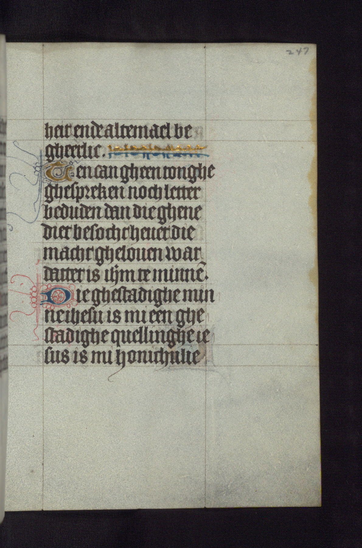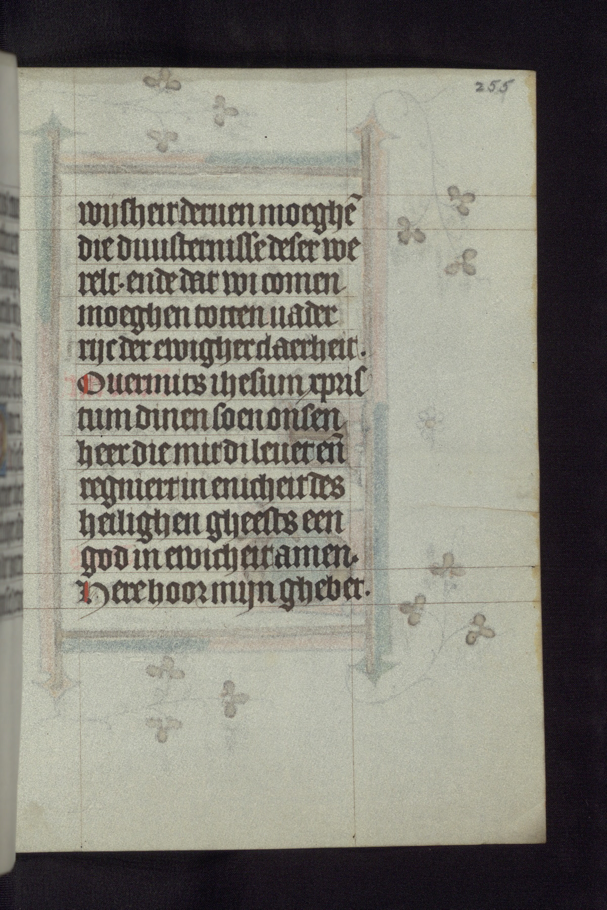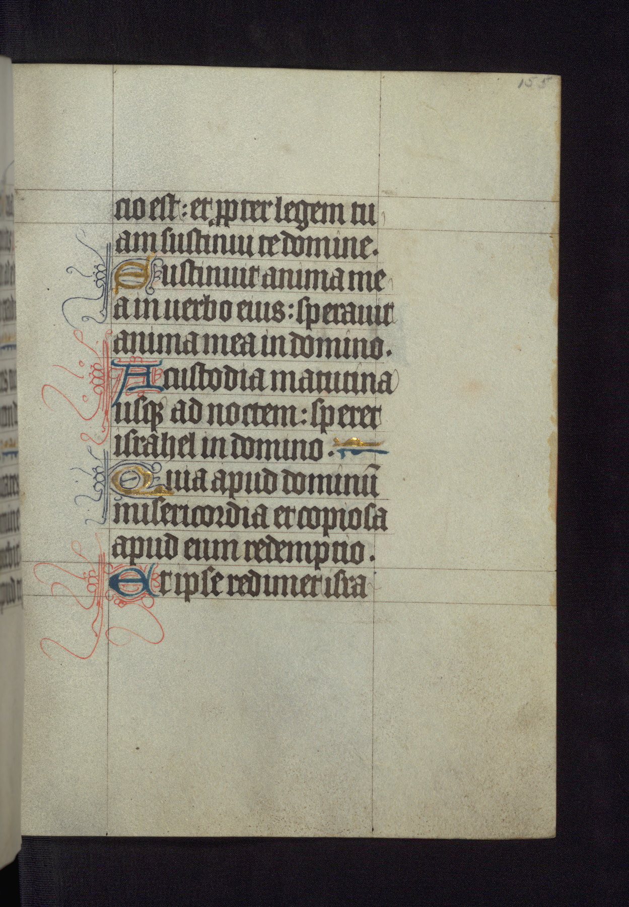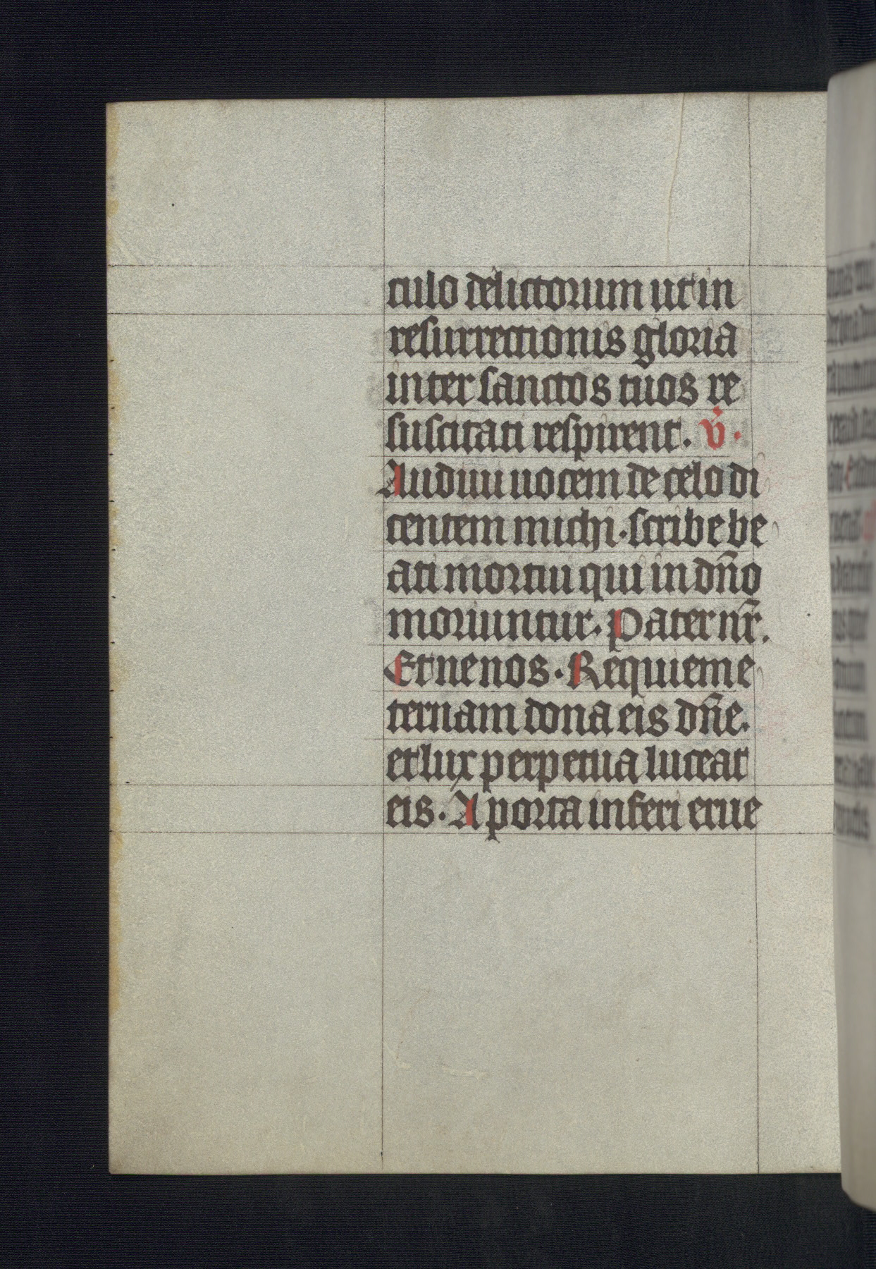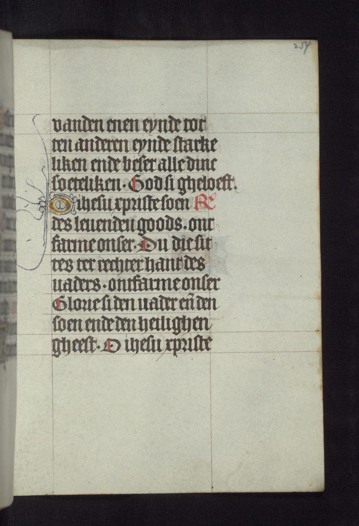 This Book of Hours was named the Doffinnes Hours after Franchoise de Doffinnes, who owned the book in the late sixteenth century and whose family’s subsequent history remains chronicled on the book’s final folios. However, the manuscript was originally made in the first quarter of the fifteenth century, probably for a married couple, who were originally represented kneeling with scrolls and their coats of arms in the margins, flanking a full-page miniature of the Crucifixion (fol. 72v), but whose figures and arms were later erased and overpainted with white. The manuscript contains both Latin and Dutch texts, supplemented by twelve full-page miniatures, the work of the Master of Walters 185. The manuscript also contains twelve pen-and-ink decorated initials in the calendar, some with grotesque faces, and letter "G" descenders throughout the book that can be attributed to the scribe Johannes de Malborch. The book’s original Dutch provenance is indicated by its calendar (for the Use of Utrecht) and its Hours of the Virgin, which follows predominantly the Use of the Windesheim Congregation. Prayers in Dutch were added to the end of the volume in the late fifteenth or early sixteenth century, and the book was subsequently rebound with its current cream-colored parchment binding of the seventeenth or eighteenth century.