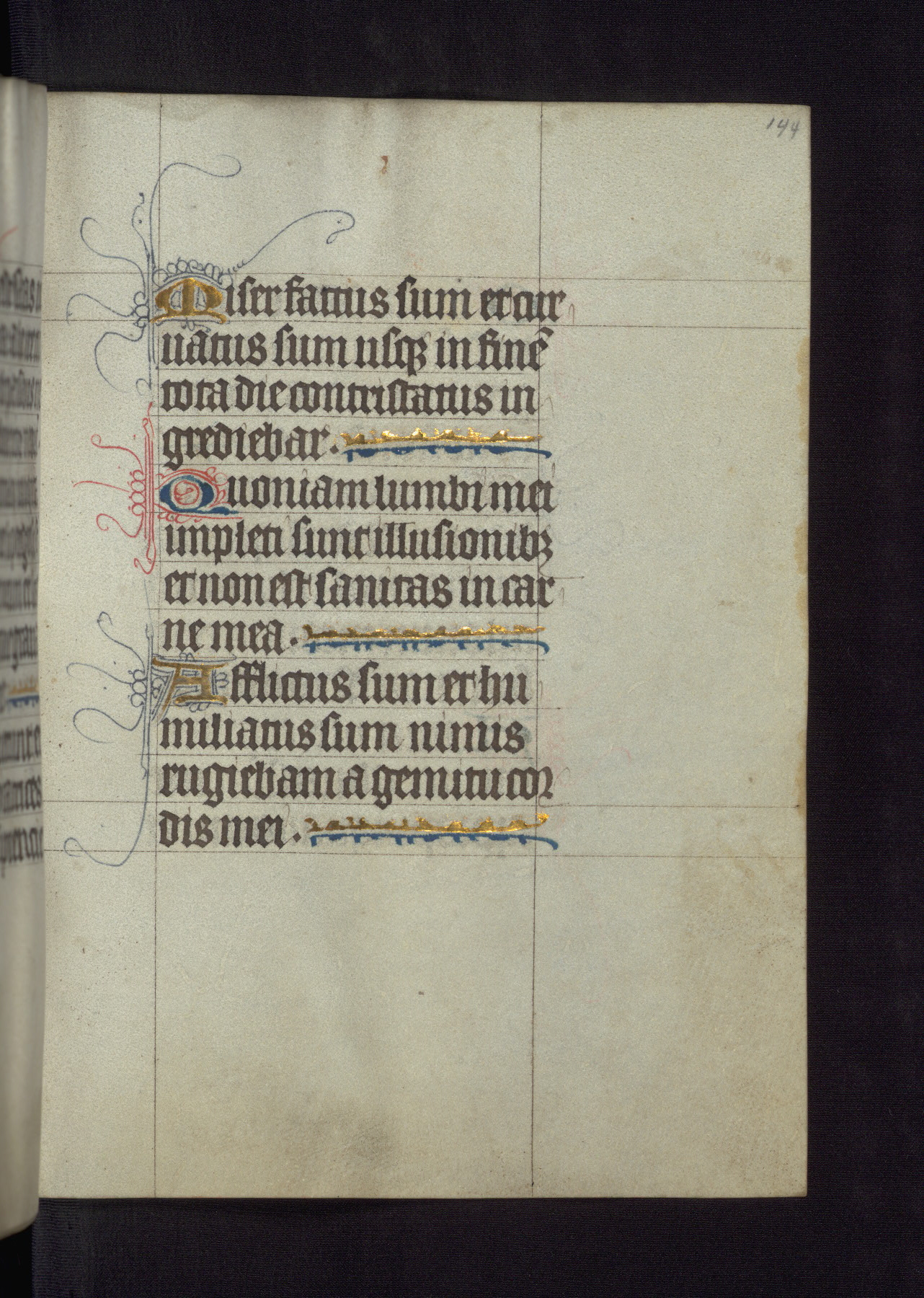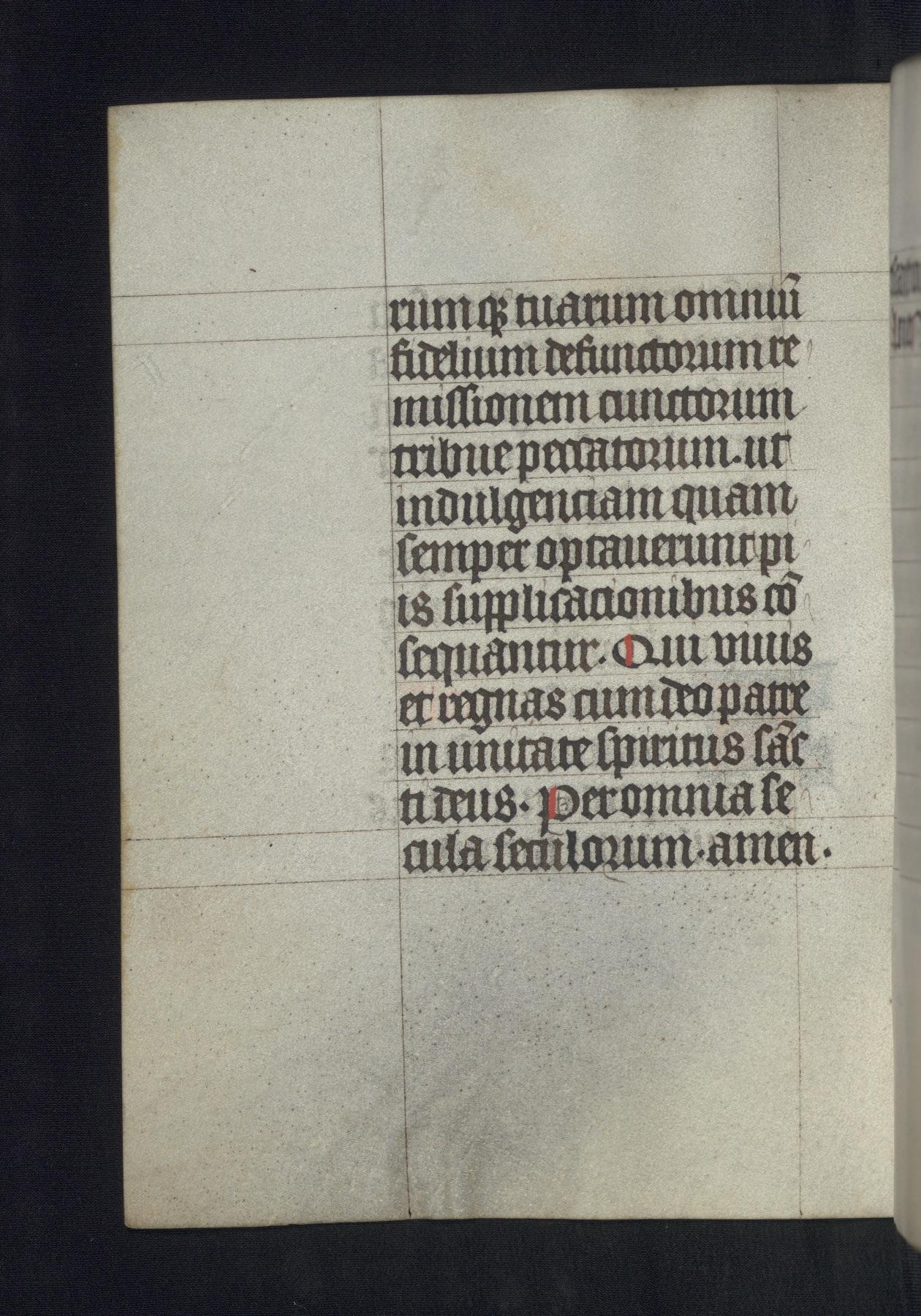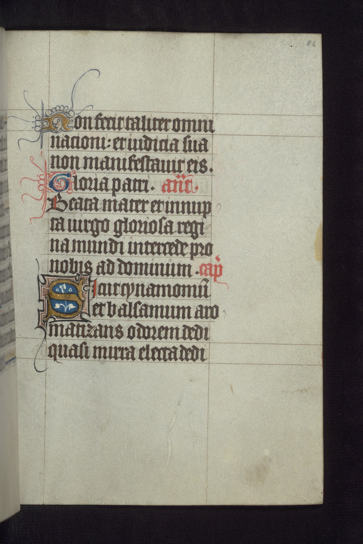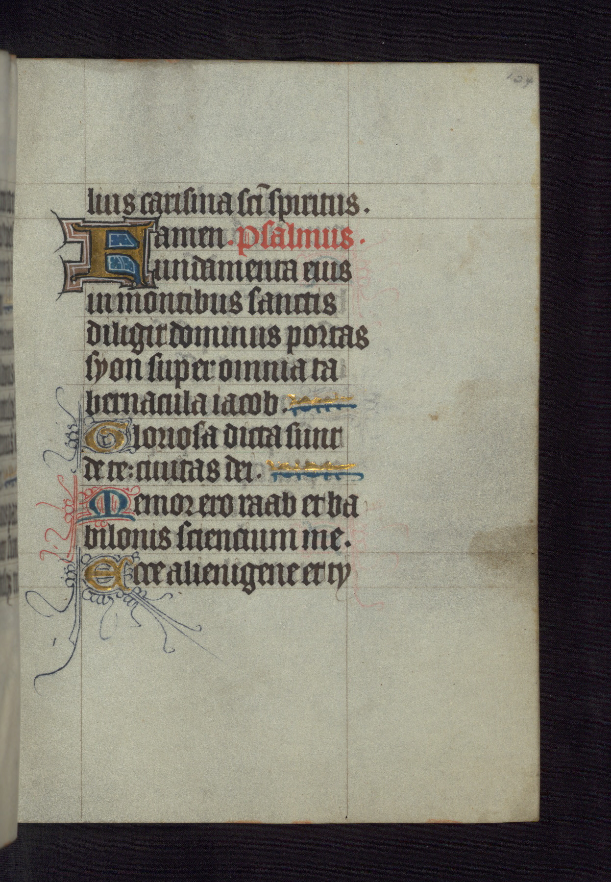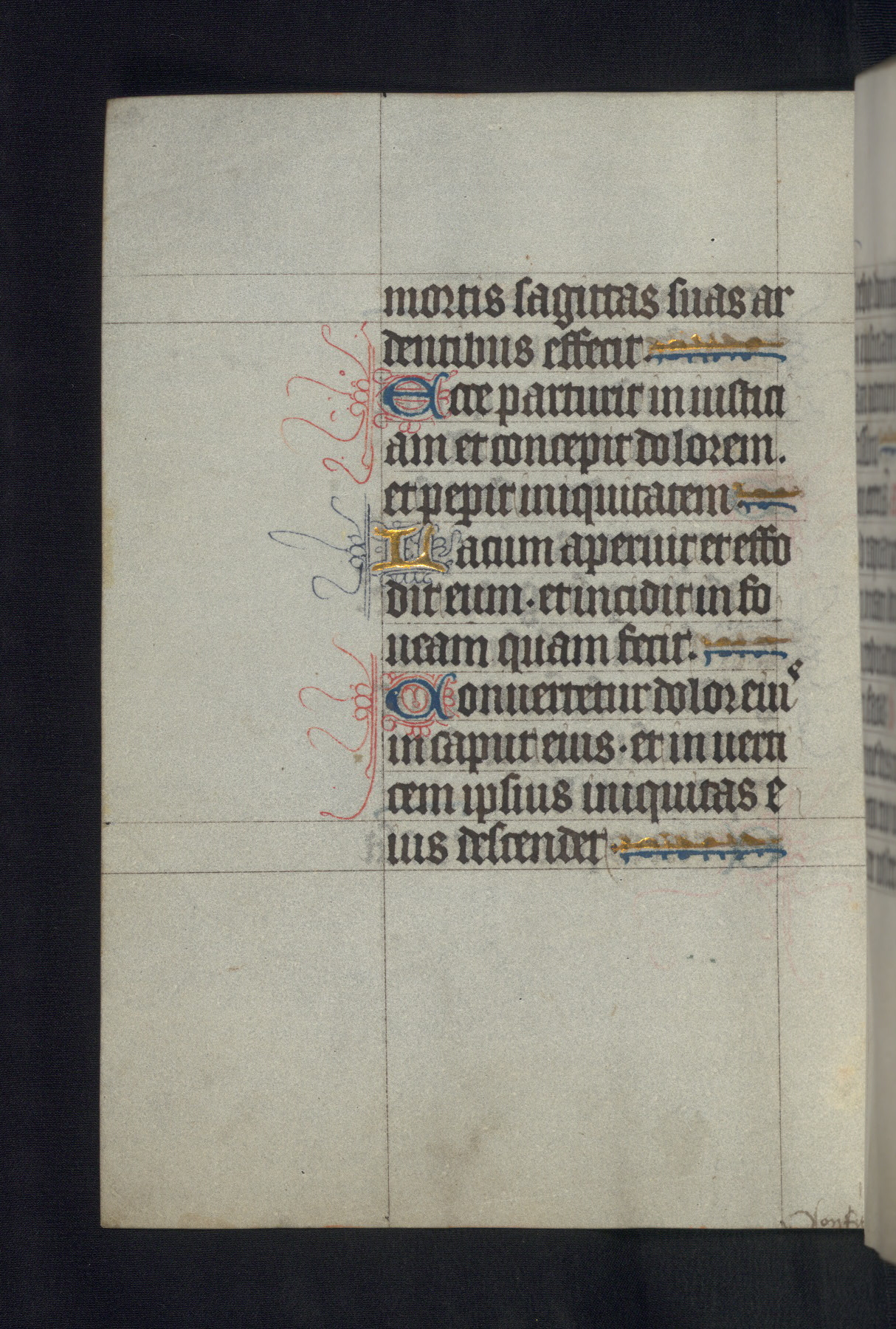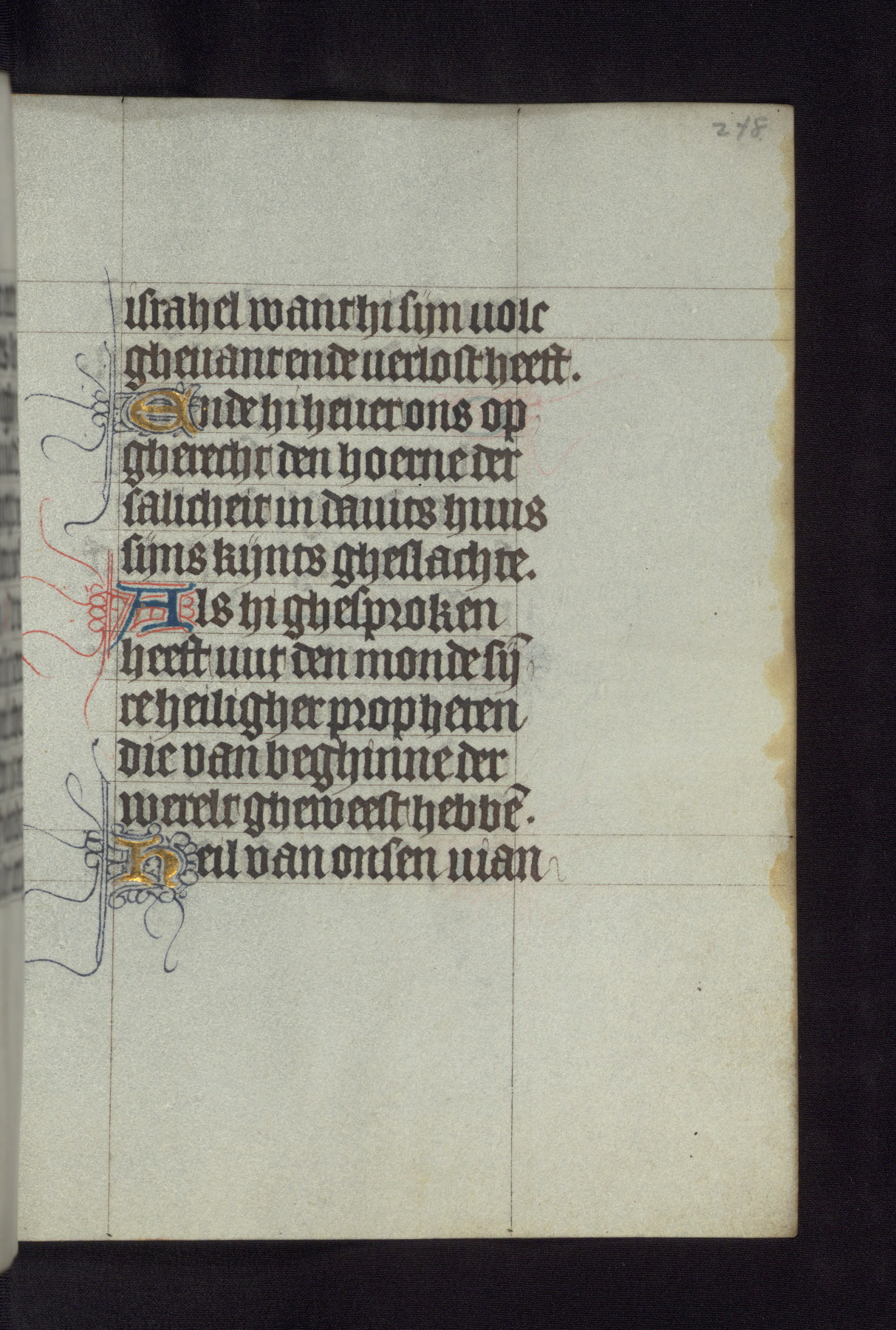 This Book of Hours was named the Doffinnes Hours after Franchoise de Doffinnes, who owned the book in the late sixteenth century and whose family’s subsequent history remains chronicled on the book’s final folios. However, the manuscript was originally made in the first quarter of the fifteenth century, probably for a married couple, who were originally represented kneeling with scrolls and their coats of arms in the margins, flanking a full-page miniature of the Crucifixion (fol. 72v), but whose figures and arms were later erased and overpainted with white. The manuscript contains both Latin and Dutch texts, supplemented by twelve full-page miniatures, the work of the Master of Walters 185. The manuscript also contains twelve pen-and-ink decorated initials in the calendar, some with grotesque faces, and letter "G" descenders throughout the book that can be attributed to the scribe Johannes de Malborch. The book’s original Dutch provenance is indicated by its calendar (for the Use of Utrecht) and its Hours of the Virgin, which follows predominantly the Use of the Windesheim Congregation. Prayers in Dutch were added to the end of the volume in the late fifteenth or early sixteenth century, and the book was subsequently rebound with its current cream-colored parchment binding of the seventeenth or eighteenth century.