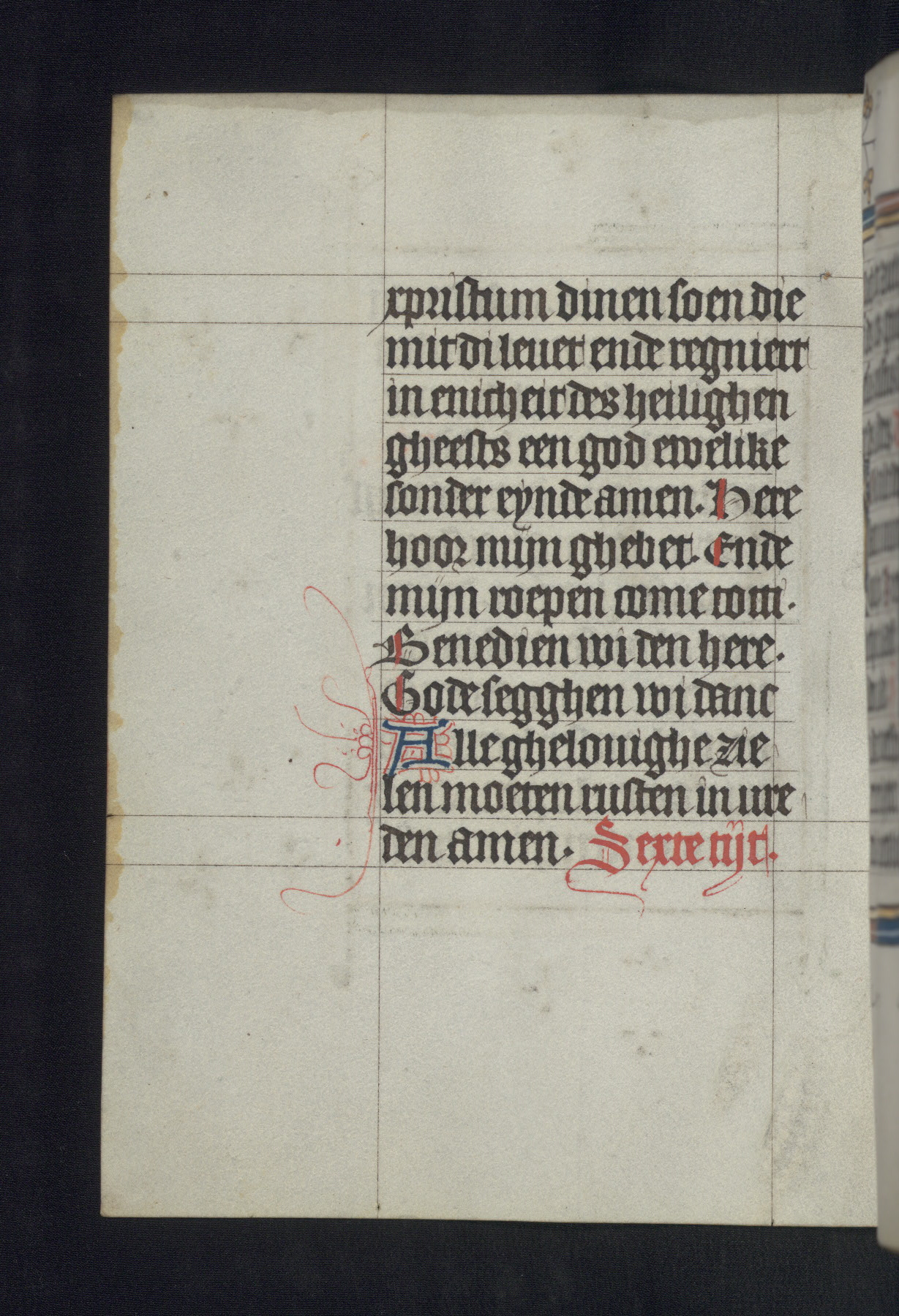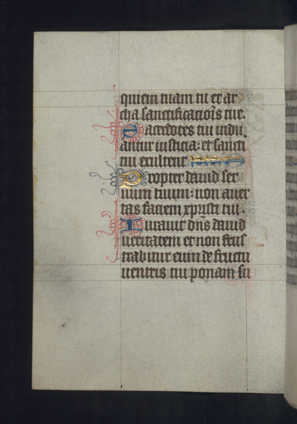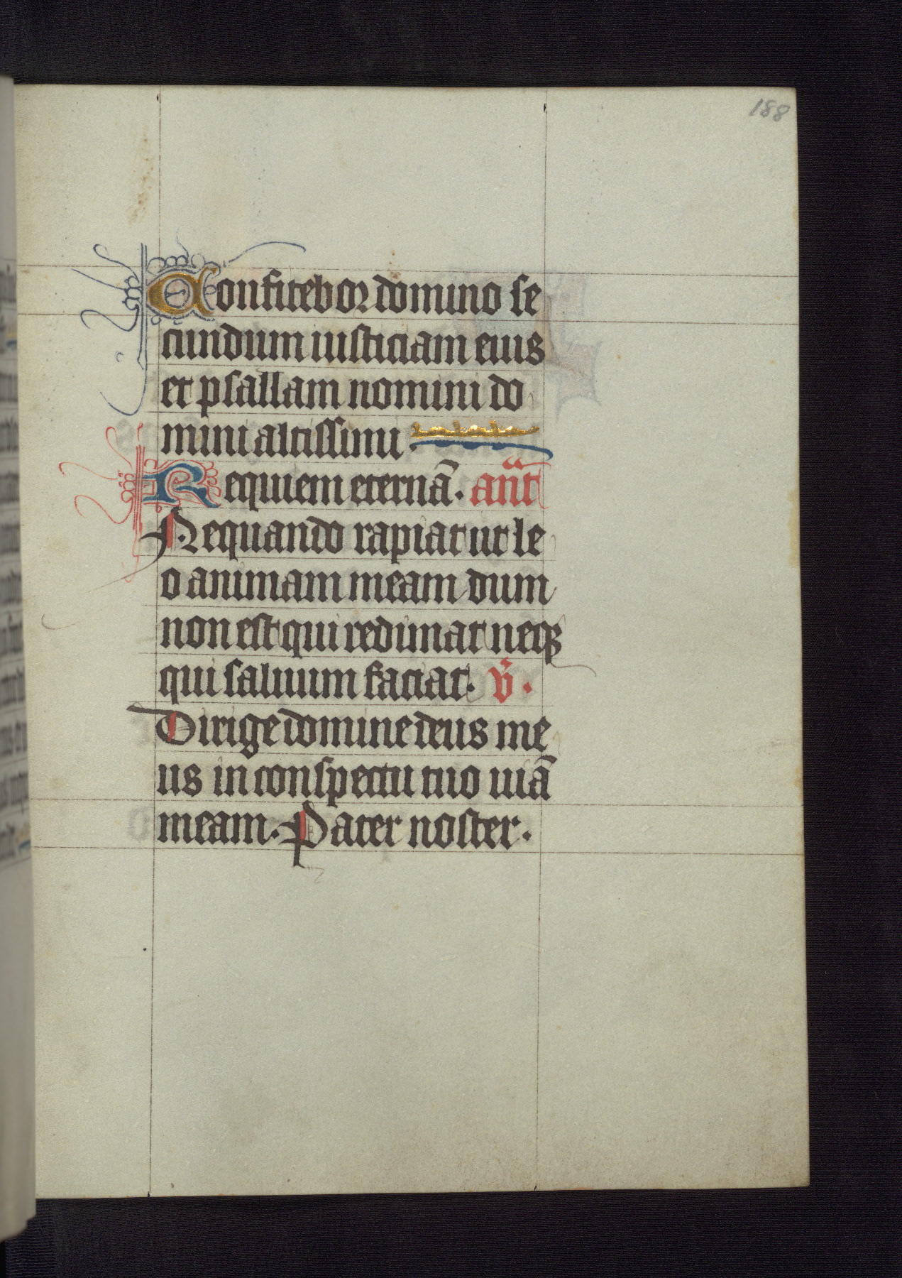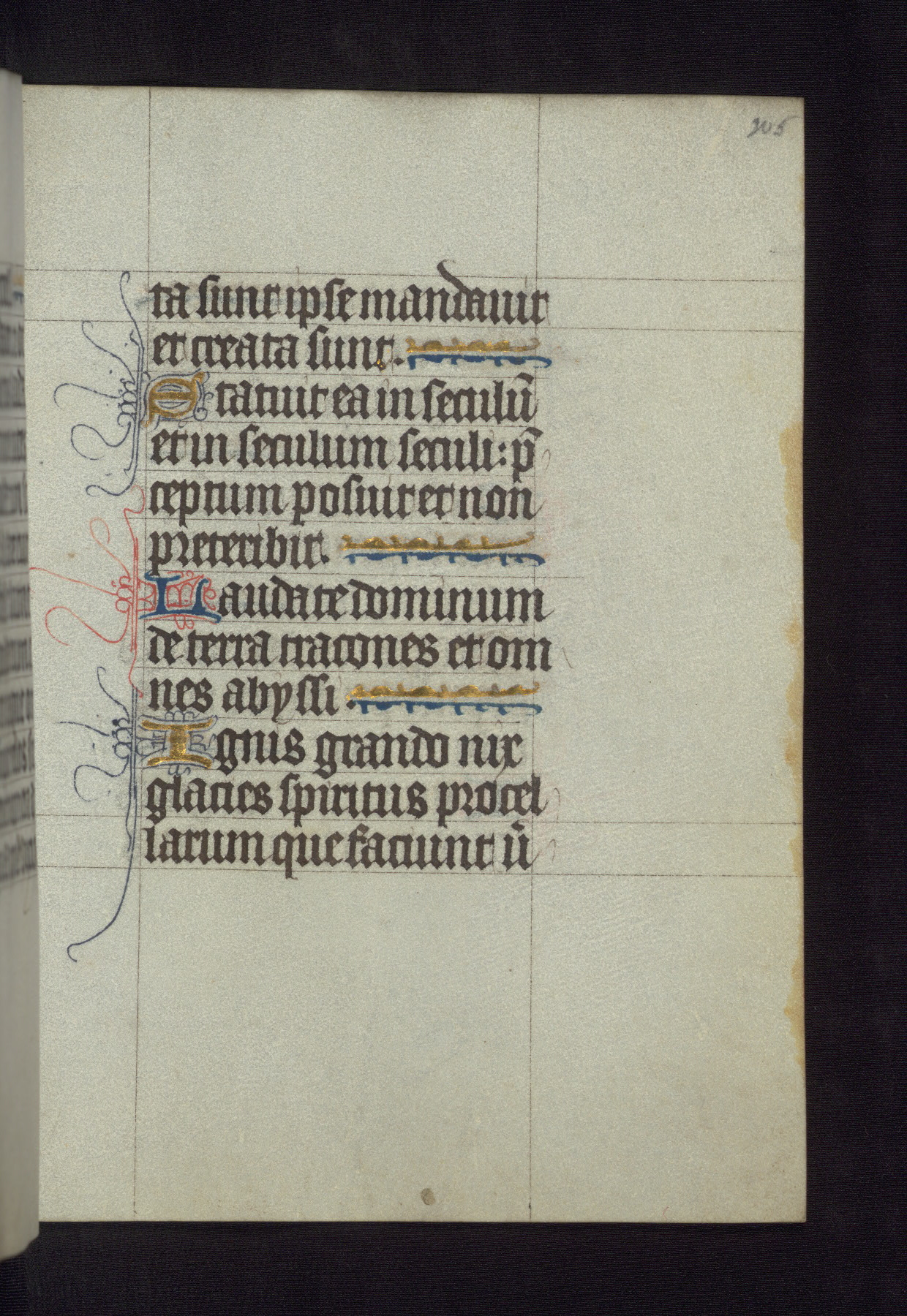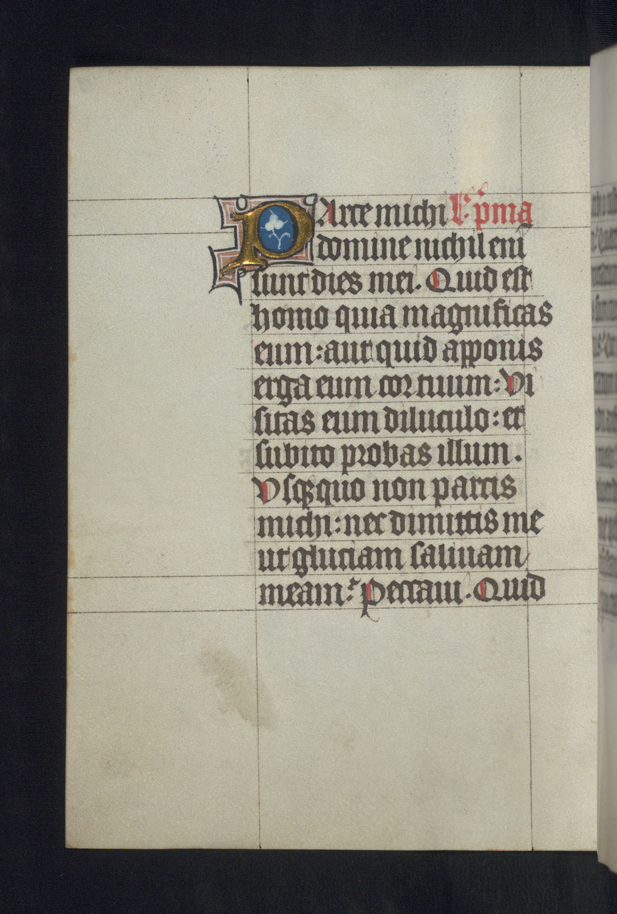 This Book of Hours was named the Doffinnes Hours after Franchoise de Doffinnes, who owned the book in the late sixteenth century and whose family’s subsequent history remains chronicled on the book’s final folios. However, the manuscript was originally made in the first quarter of the fifteenth century, probably for a married couple, who were originally represented kneeling with scrolls and their coats of arms in the margins, flanking a full-page miniature of the Crucifixion (fol. 72v), but whose figures and arms were later erased and overpainted with white. The manuscript contains both Latin and Dutch texts, supplemented by twelve full-page miniatures, the work of the Master of Walters 185. The manuscript also contains twelve pen-and-ink decorated initials in the calendar, some with grotesque faces, and letter "G" descenders throughout the book that can be attributed to the scribe Johannes de Malborch. The book’s original Dutch provenance is indicated by its calendar (for the Use of Utrecht) and its Hours of the Virgin, which follows predominantly the Use of the Windesheim Congregation. Prayers in Dutch were added to the end of the volume in the late fifteenth or early sixteenth century, and the book was subsequently rebound with its current cream-colored parchment binding of the seventeenth or eighteenth century.