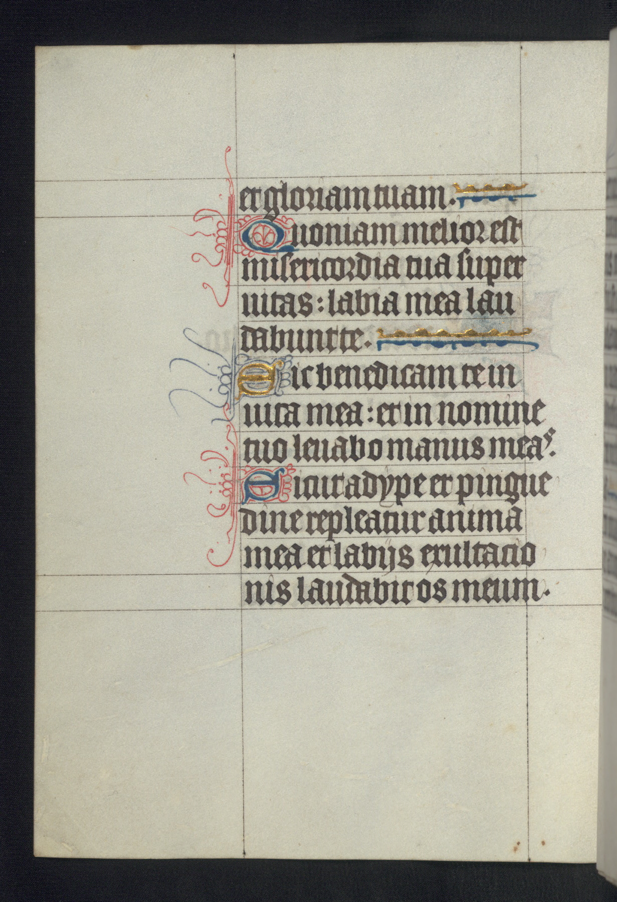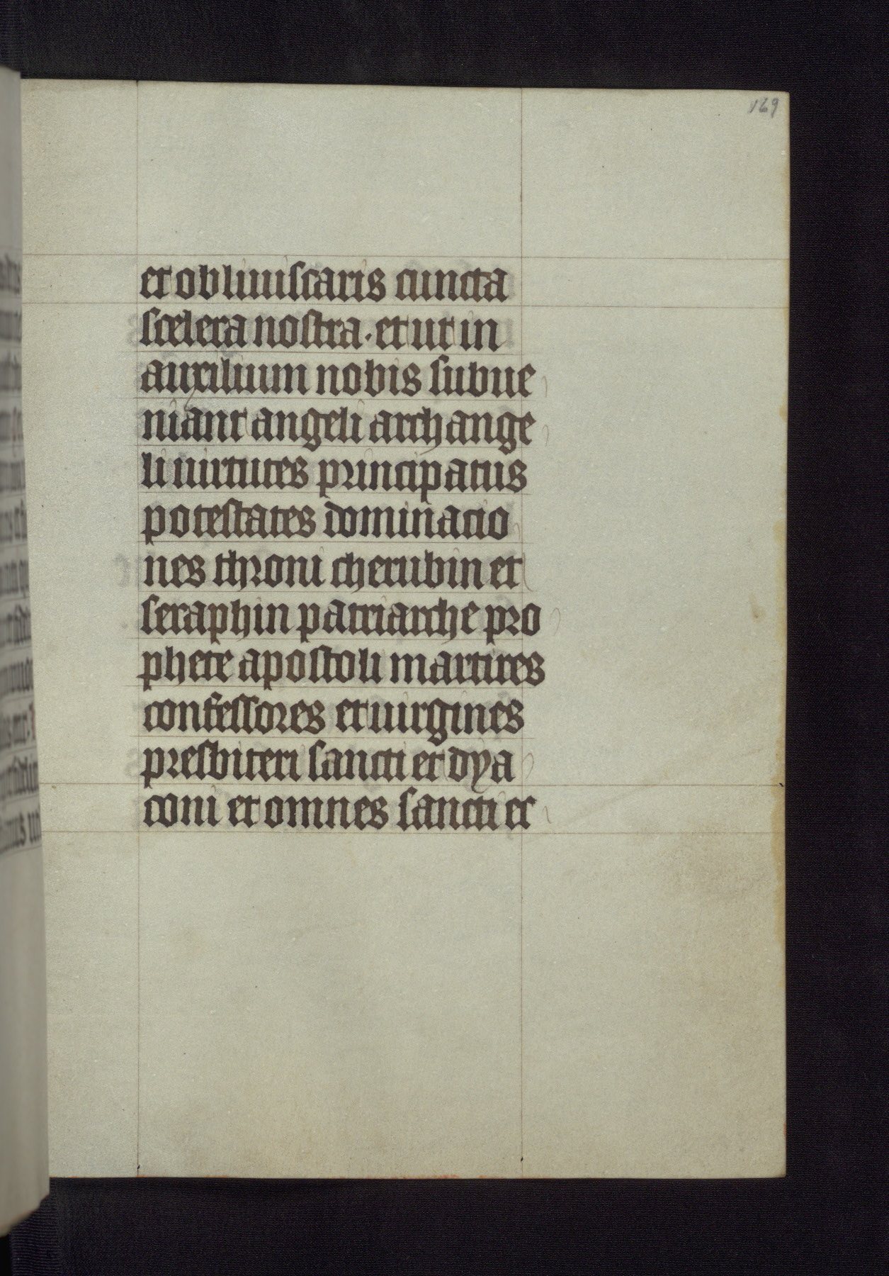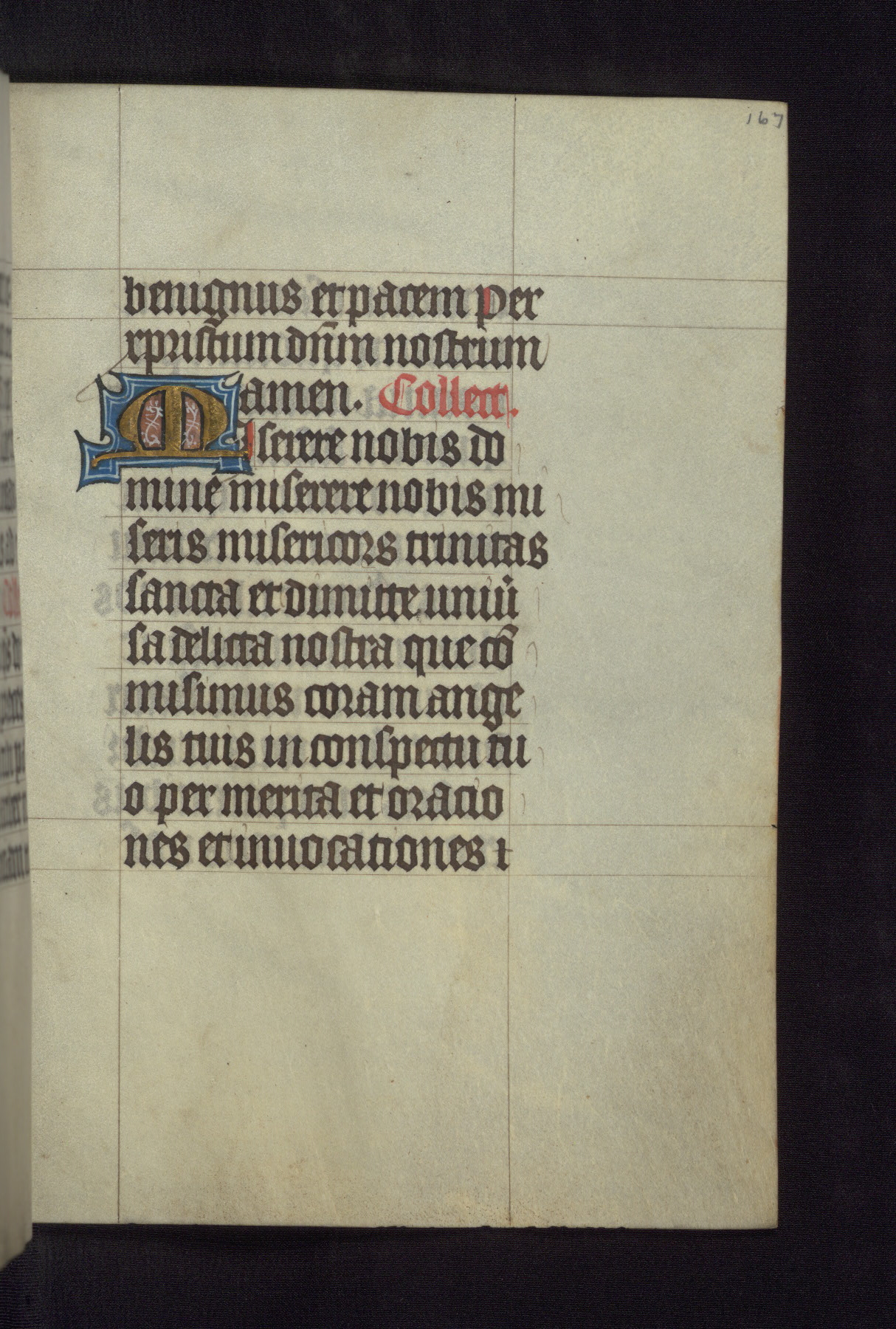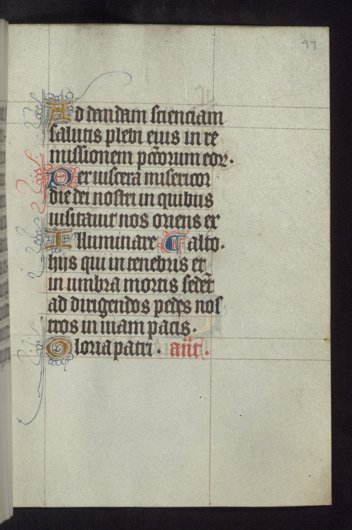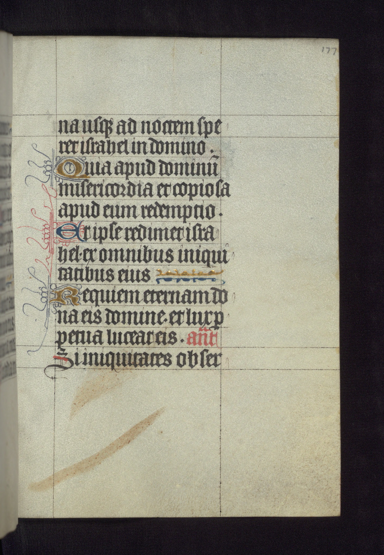 This Book of Hours was named the Doffinnes Hours after Franchoise de Doffinnes, who owned the book in the late sixteenth century and whose family’s subsequent history remains chronicled on the book’s final folios. However, the manuscript was originally made in the first quarter of the fifteenth century, probably for a married couple, who were originally represented kneeling with scrolls and their coats of arms in the margins, flanking a full-page miniature of the Crucifixion (fol. 72v), but whose figures and arms were later erased and overpainted with white. The manuscript contains both Latin and Dutch texts, supplemented by twelve full-page miniatures, the work of the Master of Walters 185. The manuscript also contains twelve pen-and-ink decorated initials in the calendar, some with grotesque faces, and letter "G" descenders throughout the book that can be attributed to the scribe Johannes de Malborch. The book’s original Dutch provenance is indicated by its calendar (for the Use of Utrecht) and its Hours of the Virgin, which follows predominantly the Use of the Windesheim Congregation. Prayers in Dutch were added to the end of the volume in the late fifteenth or early sixteenth century, and the book was subsequently rebound with its current cream-colored parchment binding of the seventeenth or eighteenth century.