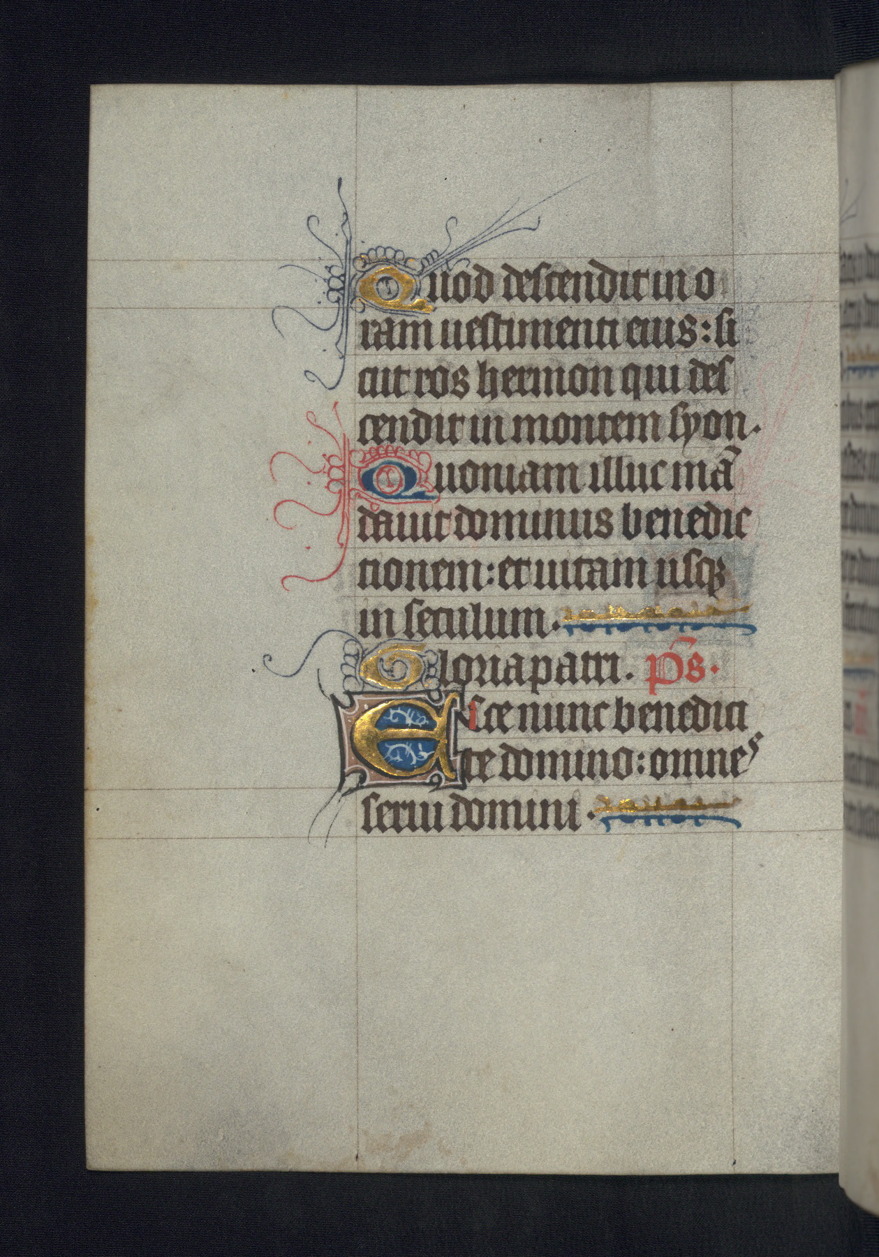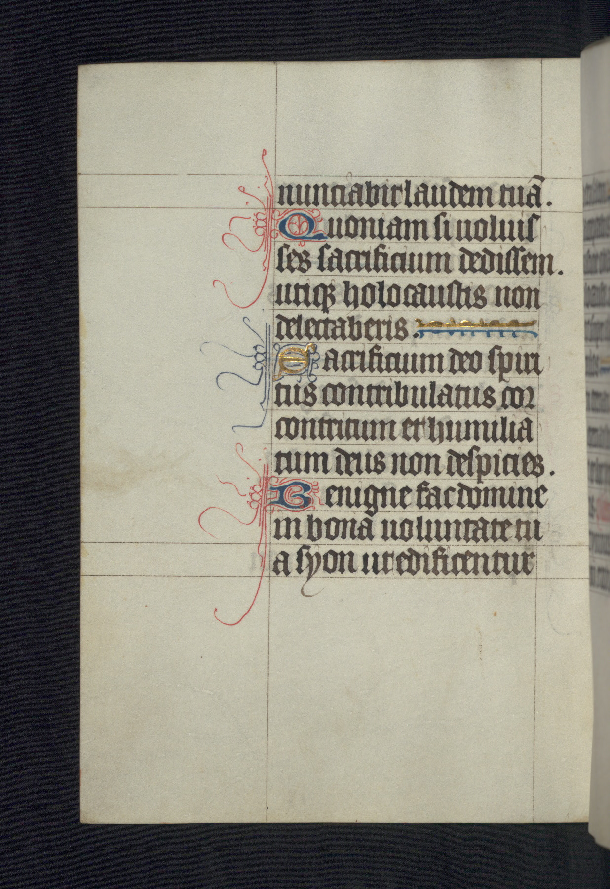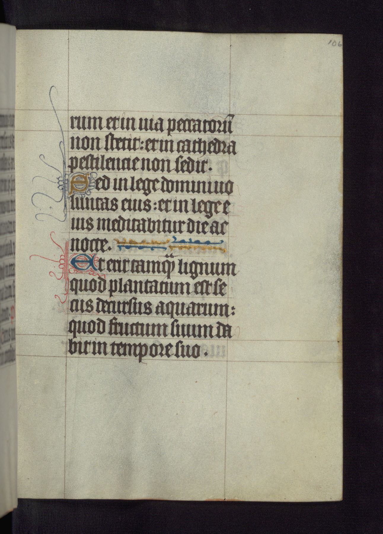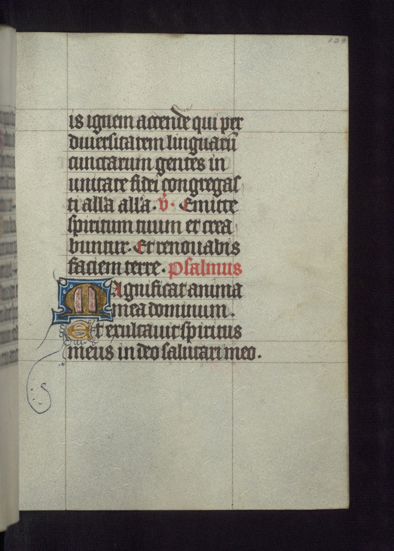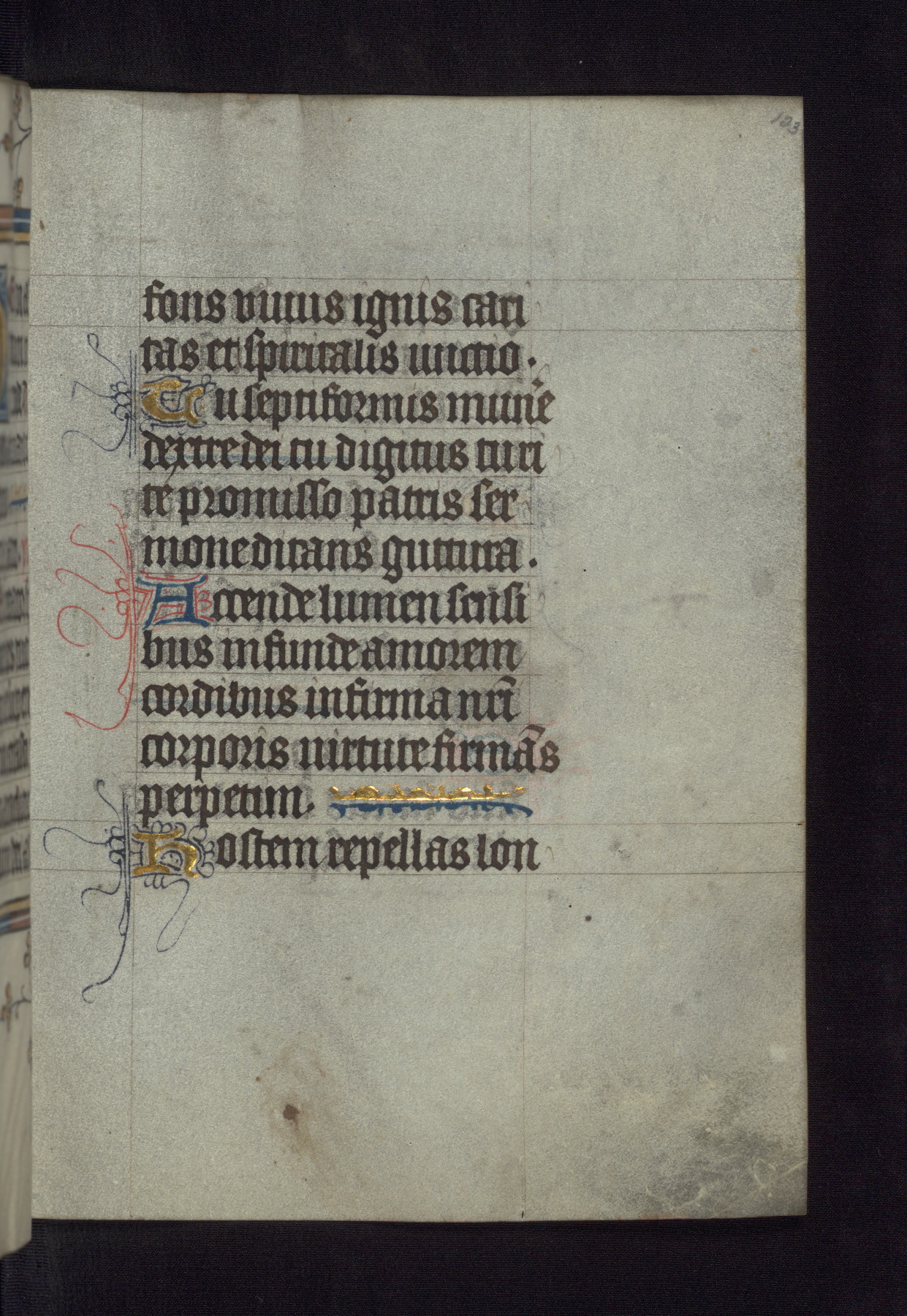 This Book of Hours was named the Doffinnes Hours after Franchoise de Doffinnes, who owned the book in the late sixteenth century and whose family’s subsequent history remains chronicled on the book’s final folios. However, the manuscript was originally made in the first quarter of the fifteenth century, probably for a married couple, who were originally represented kneeling with scrolls and their coats of arms in the margins, flanking a full-page miniature of the Crucifixion (fol. 72v), but whose figures and arms were later erased and overpainted with white. The manuscript contains both Latin and Dutch texts, supplemented by twelve full-page miniatures, the work of the Master of Walters 185. The manuscript also contains twelve pen-and-ink decorated initials in the calendar, some with grotesque faces, and letter "G" descenders throughout the book that can be attributed to the scribe Johannes de Malborch. The book’s original Dutch provenance is indicated by its calendar (for the Use of Utrecht) and its Hours of the Virgin, which follows predominantly the Use of the Windesheim Congregation. Prayers in Dutch were added to the end of the volume in the late fifteenth or early sixteenth century, and the book was subsequently rebound with its current cream-colored parchment binding of the seventeenth or eighteenth century.