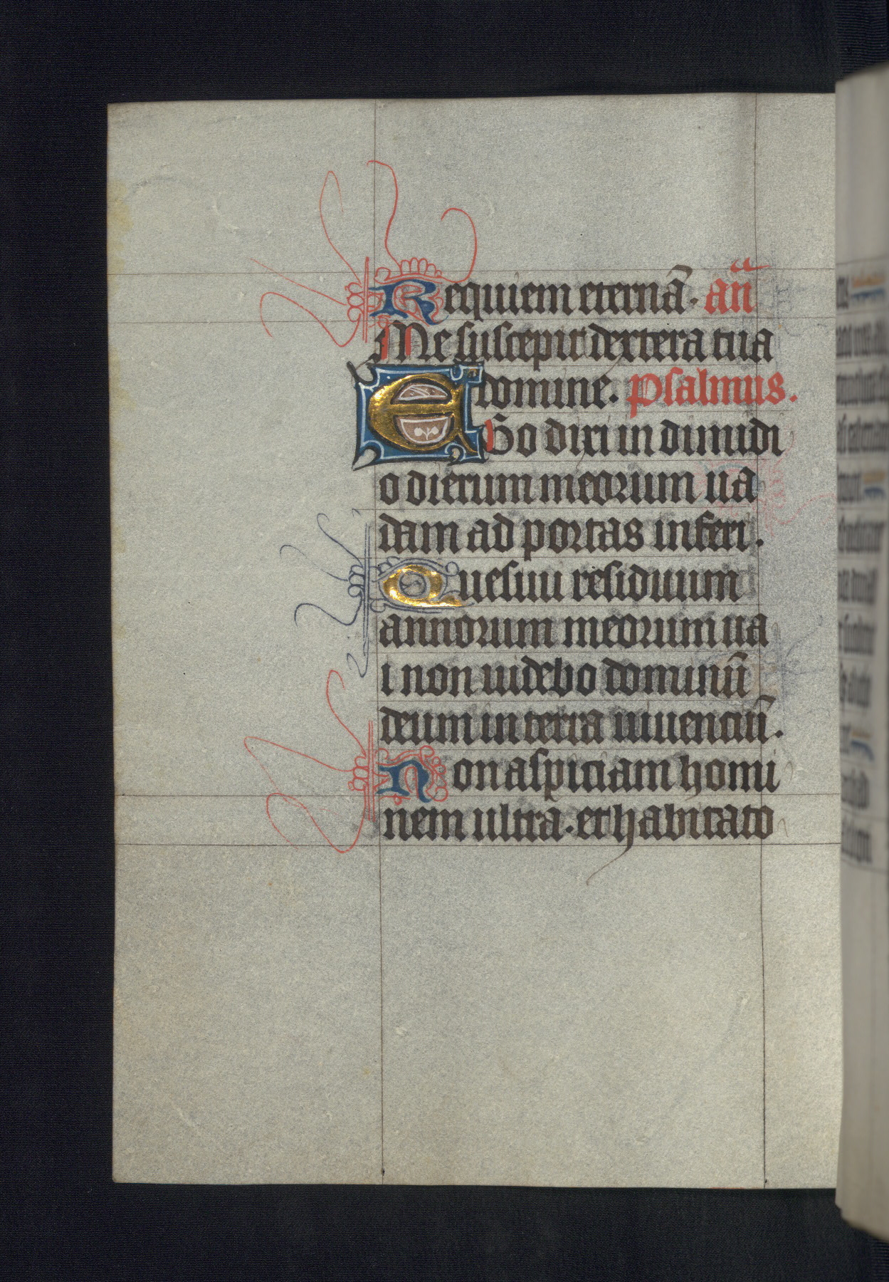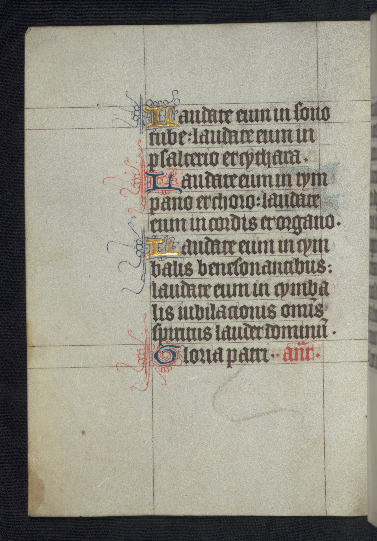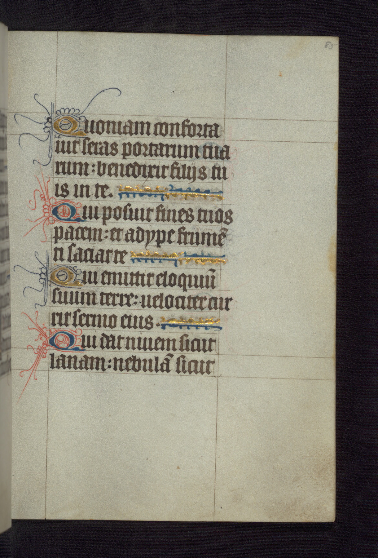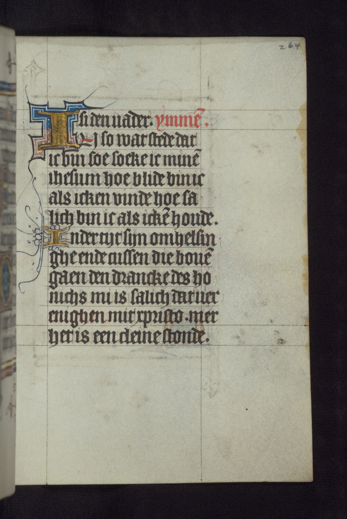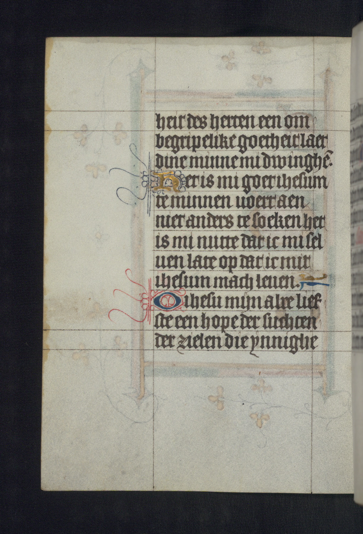 This Book of Hours was named the Doffinnes Hours after Franchoise de Doffinnes, who owned the book in the late sixteenth century and whose family’s subsequent history remains chronicled on the book’s final folios. However, the manuscript was originally made in the first quarter of the fifteenth century, probably for a married couple, who were originally represented kneeling with scrolls and their coats of arms in the margins, flanking a full-page miniature of the Crucifixion (fol. 72v), but whose figures and arms were later erased and overpainted with white. The manuscript contains both Latin and Dutch texts, supplemented by twelve full-page miniatures, the work of the Master of Walters 185. The manuscript also contains twelve pen-and-ink decorated initials in the calendar, some with grotesque faces, and letter "G" descenders throughout the book that can be attributed to the scribe Johannes de Malborch. The book’s original Dutch provenance is indicated by its calendar (for the Use of Utrecht) and its Hours of the Virgin, which follows predominantly the Use of the Windesheim Congregation. Prayers in Dutch were added to the end of the volume in the late fifteenth or early sixteenth century, and the book was subsequently rebound with its current cream-colored parchment binding of the seventeenth or eighteenth century.