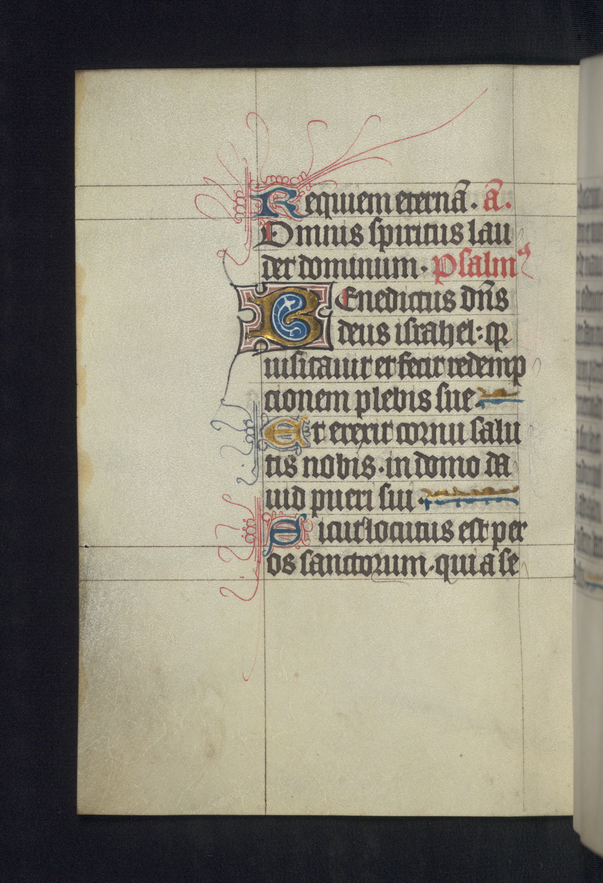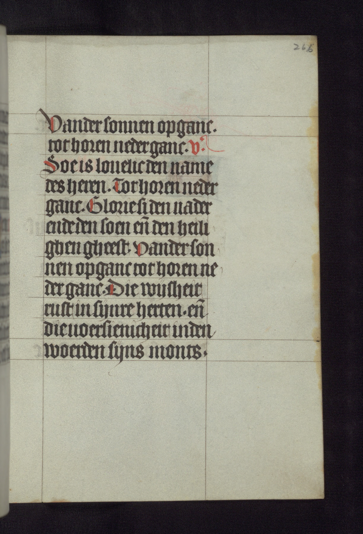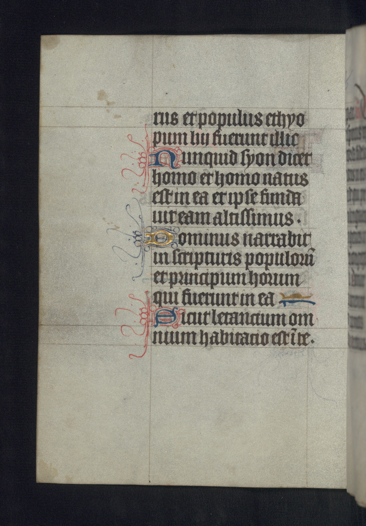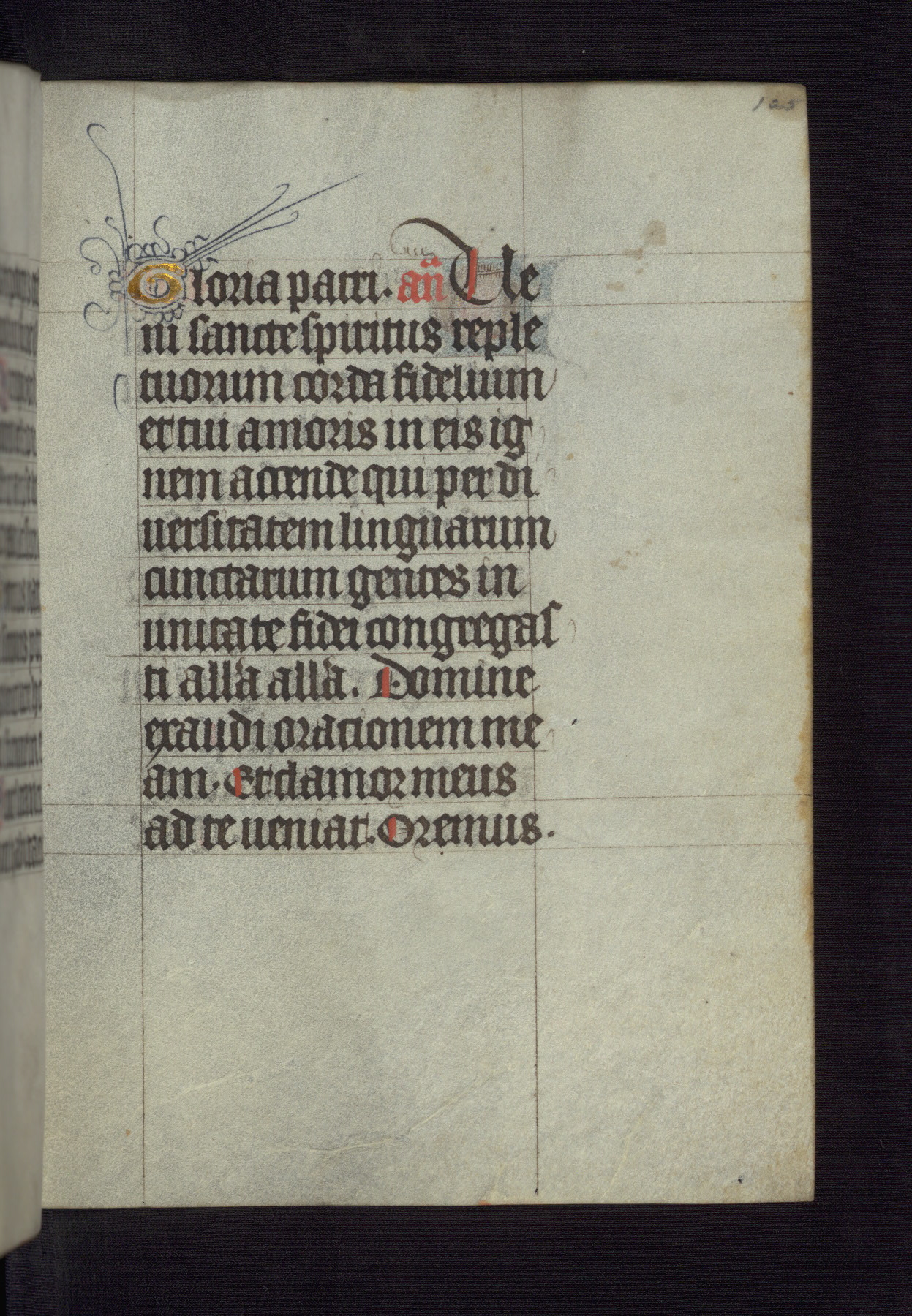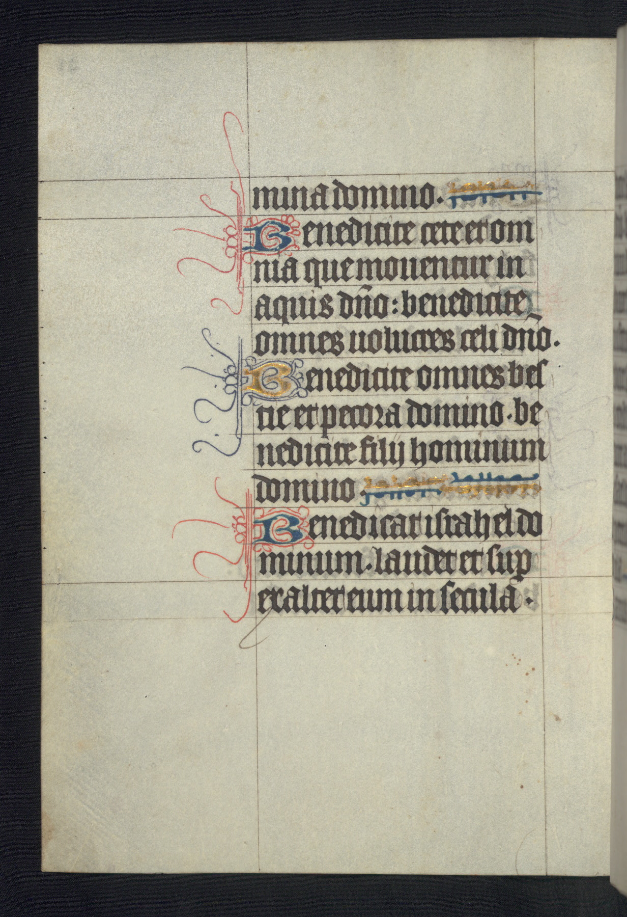 This Book of Hours was named the Doffinnes Hours after Franchoise de Doffinnes, who owned the book in the late sixteenth century and whose family’s subsequent history remains chronicled on the book’s final folios. However, the manuscript was originally made in the first quarter of the fifteenth century, probably for a married couple, who were originally represented kneeling with scrolls and their coats of arms in the margins, flanking a full-page miniature of the Crucifixion (fol. 72v), but whose figures and arms were later erased and overpainted with white. The manuscript contains both Latin and Dutch texts, supplemented by twelve full-page miniatures, the work of the Master of Walters 185. The manuscript also contains twelve pen-and-ink decorated initials in the calendar, some with grotesque faces, and letter "G" descenders throughout the book that can be attributed to the scribe Johannes de Malborch. The book’s original Dutch provenance is indicated by its calendar (for the Use of Utrecht) and its Hours of the Virgin, which follows predominantly the Use of the Windesheim Congregation. Prayers in Dutch were added to the end of the volume in the late fifteenth or early sixteenth century, and the book was subsequently rebound with its current cream-colored parchment binding of the seventeenth or eighteenth century.