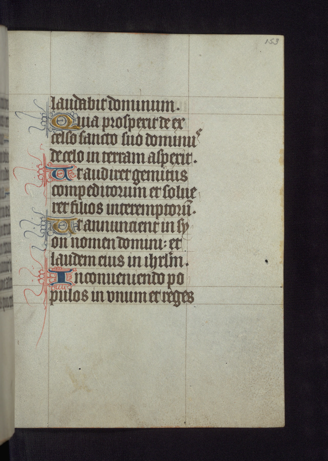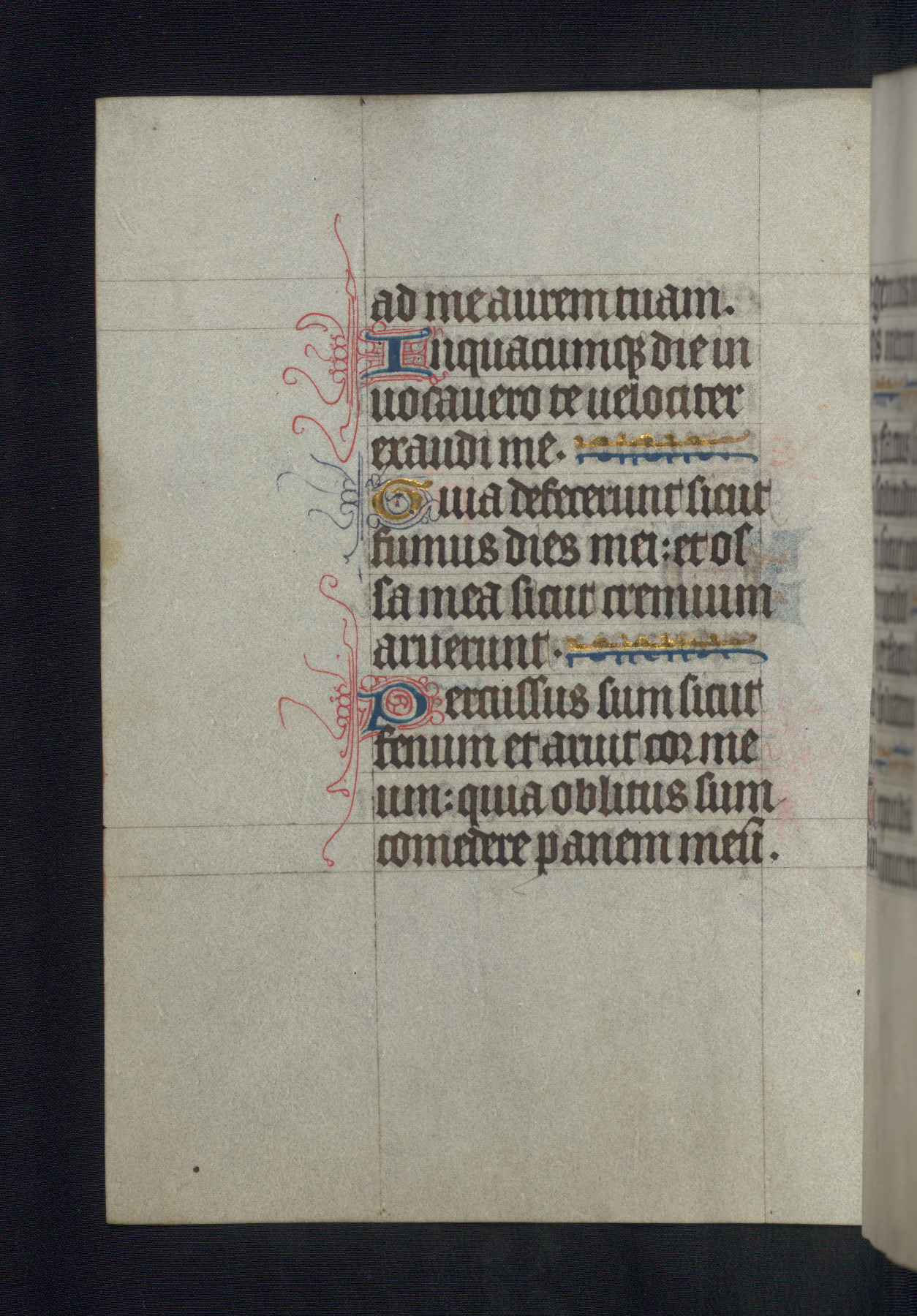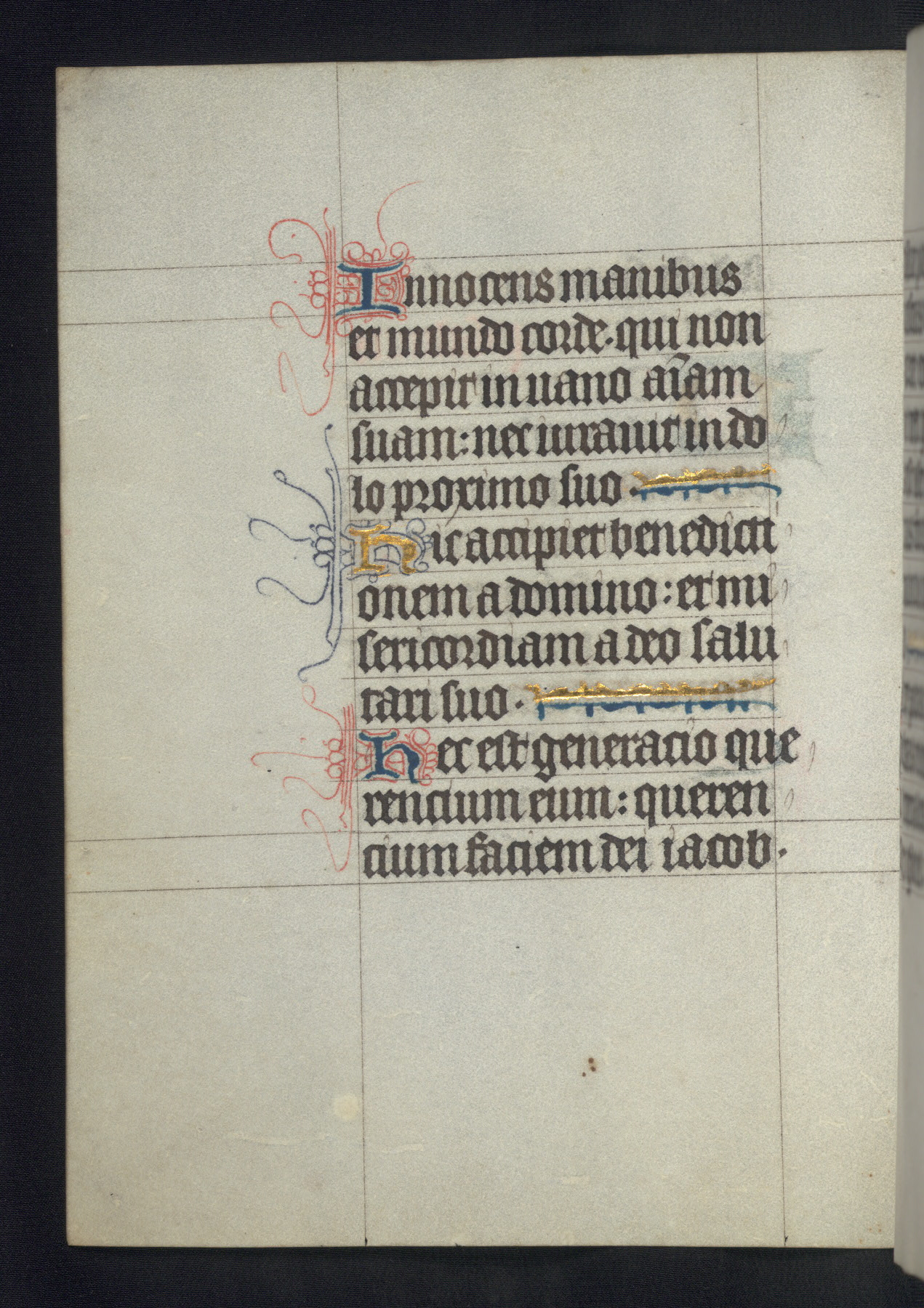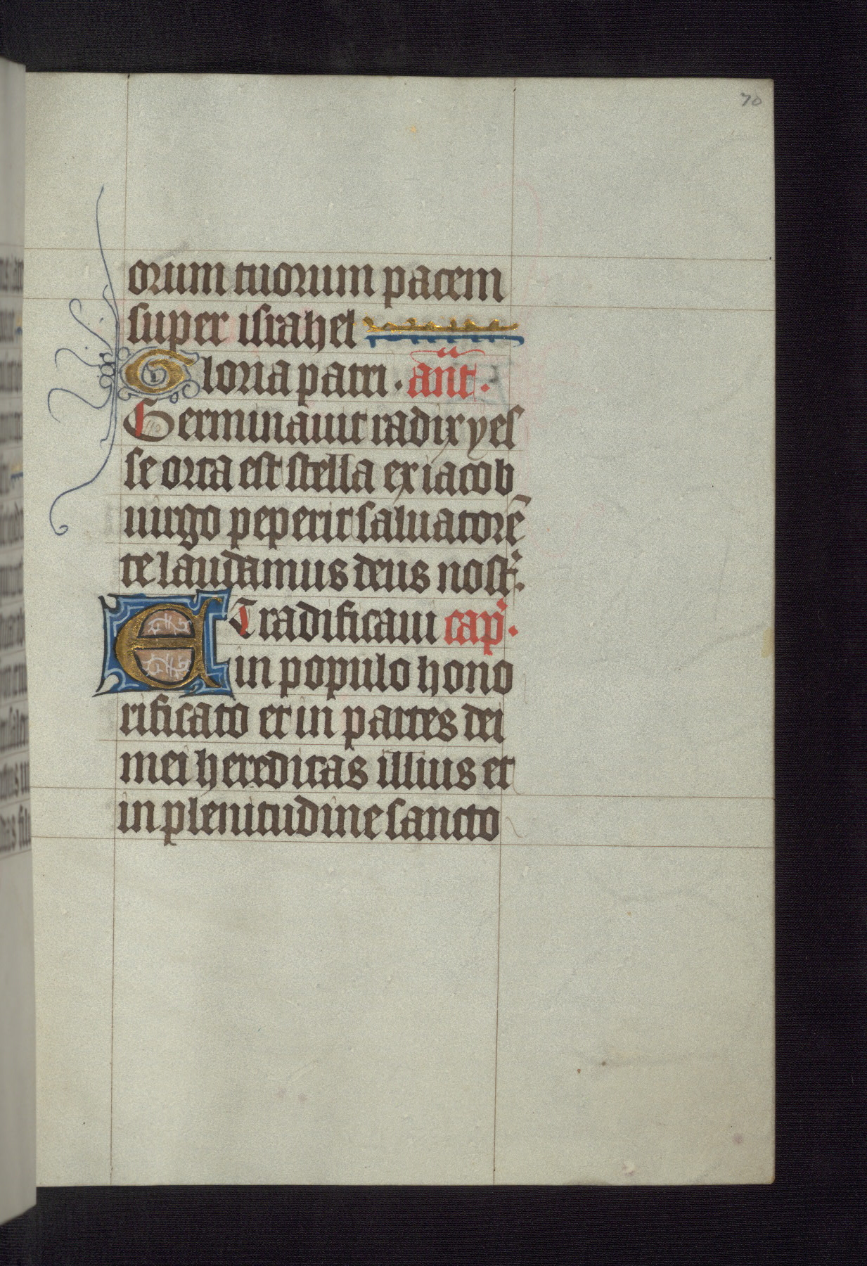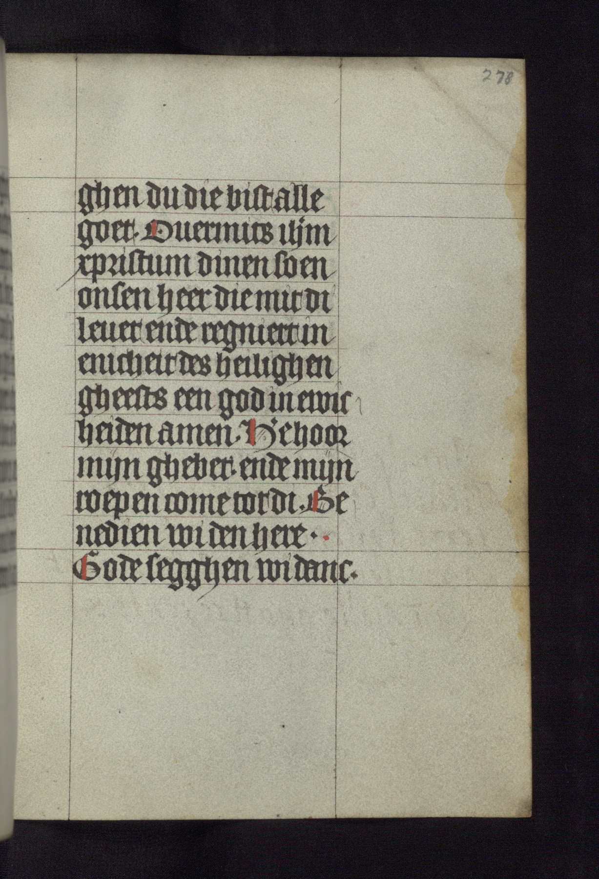This Book of Hours was named the Doffinnes Hours after Franchoise de Doffinnes, who owned the book in the late sixteenth century and whose family’s subsequent history remains chronicled on the book’s final folios. However, the manuscript was originally made in the first quarter of the fifteenth century, probably for a married couple, who were originally represented kneeling with scrolls and their coats of arms in the margins, flanking a full-page miniature of the Crucifixion (fol. 72v), but whose figures and arms were later erased and overpainted with white. The manuscript contains both Latin and Dutch texts, supplemented by twelve full-page miniatures, the work of the Master of Walters 185. The manuscript also contains twelve pen-and-ink decorated initials in the calendar, some with grotesque faces, and letter "G" descenders throughout the book that can be attributed to the scribe Johannes de Malborch. The book’s original Dutch provenance is indicated by its calendar (for the Use of Utrecht) and its Hours of the Virgin, which follows predominantly the Use of the Windesheim Congregation. Prayers in Dutch were added to the end of the volume in the late fifteenth or early sixteenth century, and the book was subsequently rebound with its current cream-colored parchment binding of the seventeenth or eighteenth century.