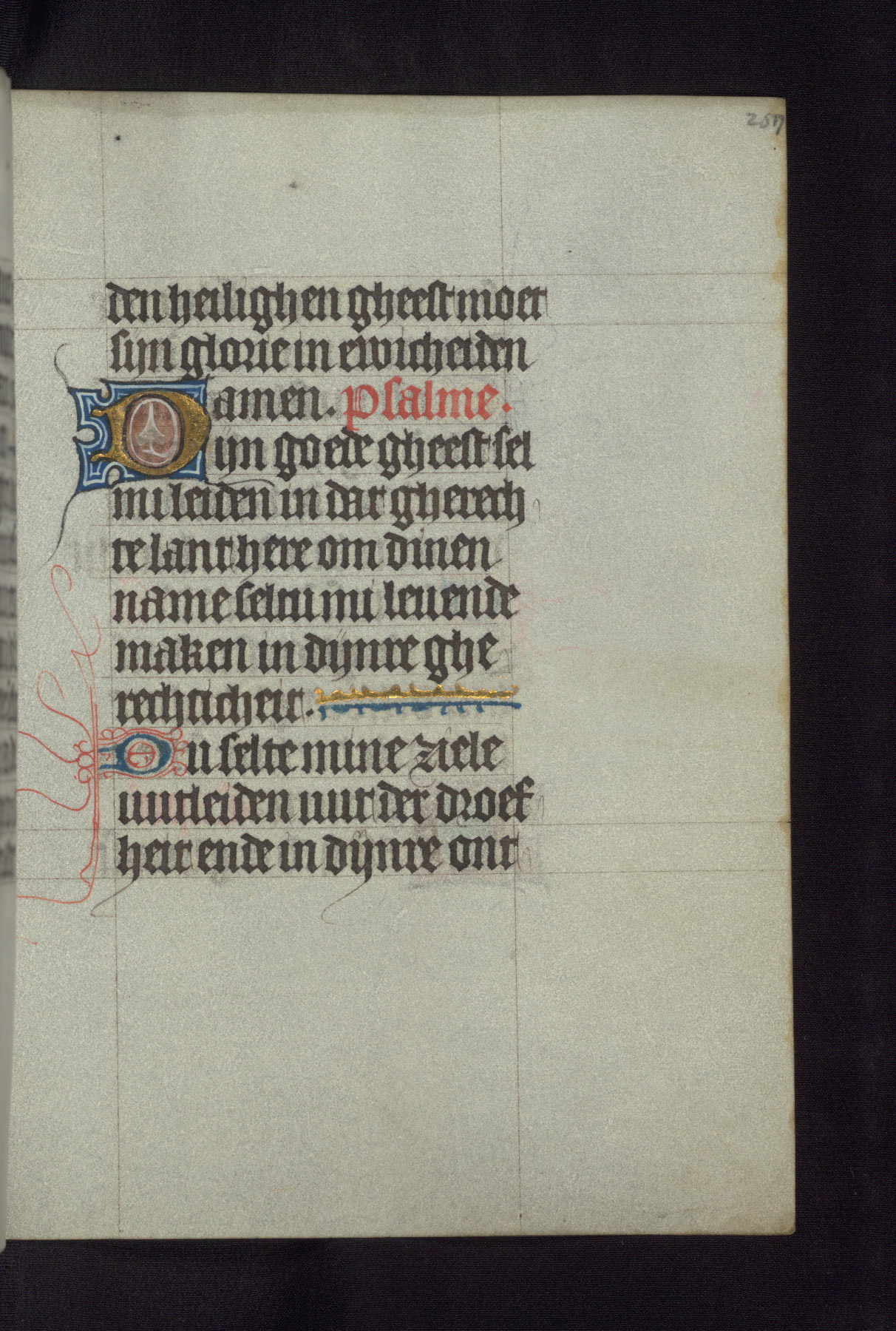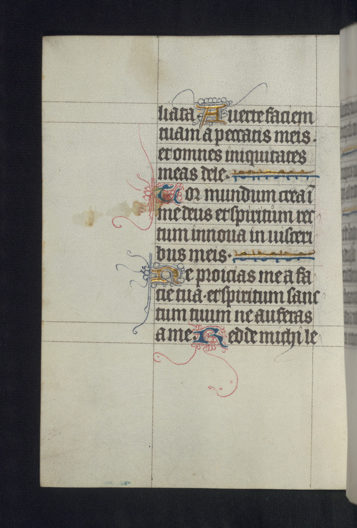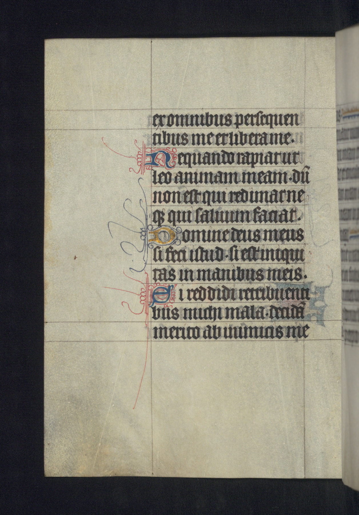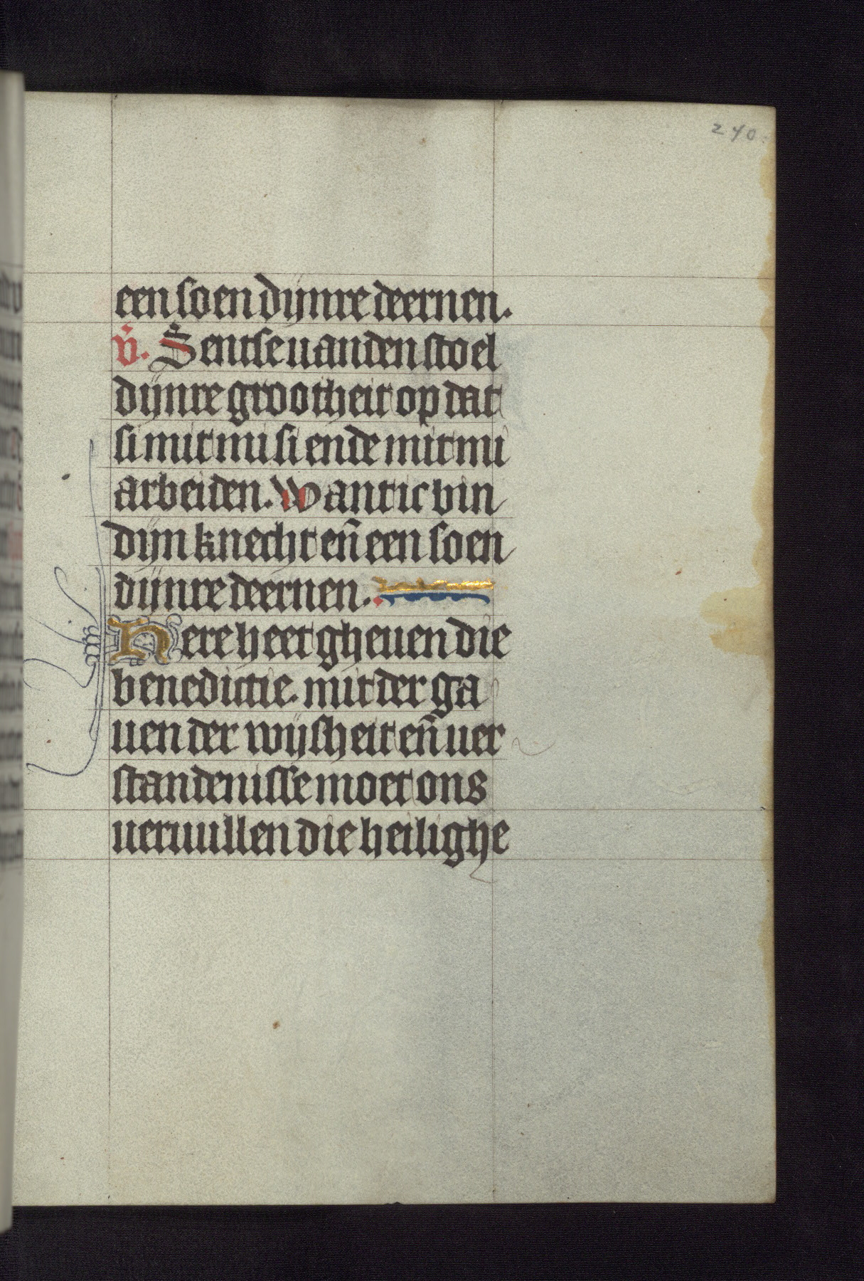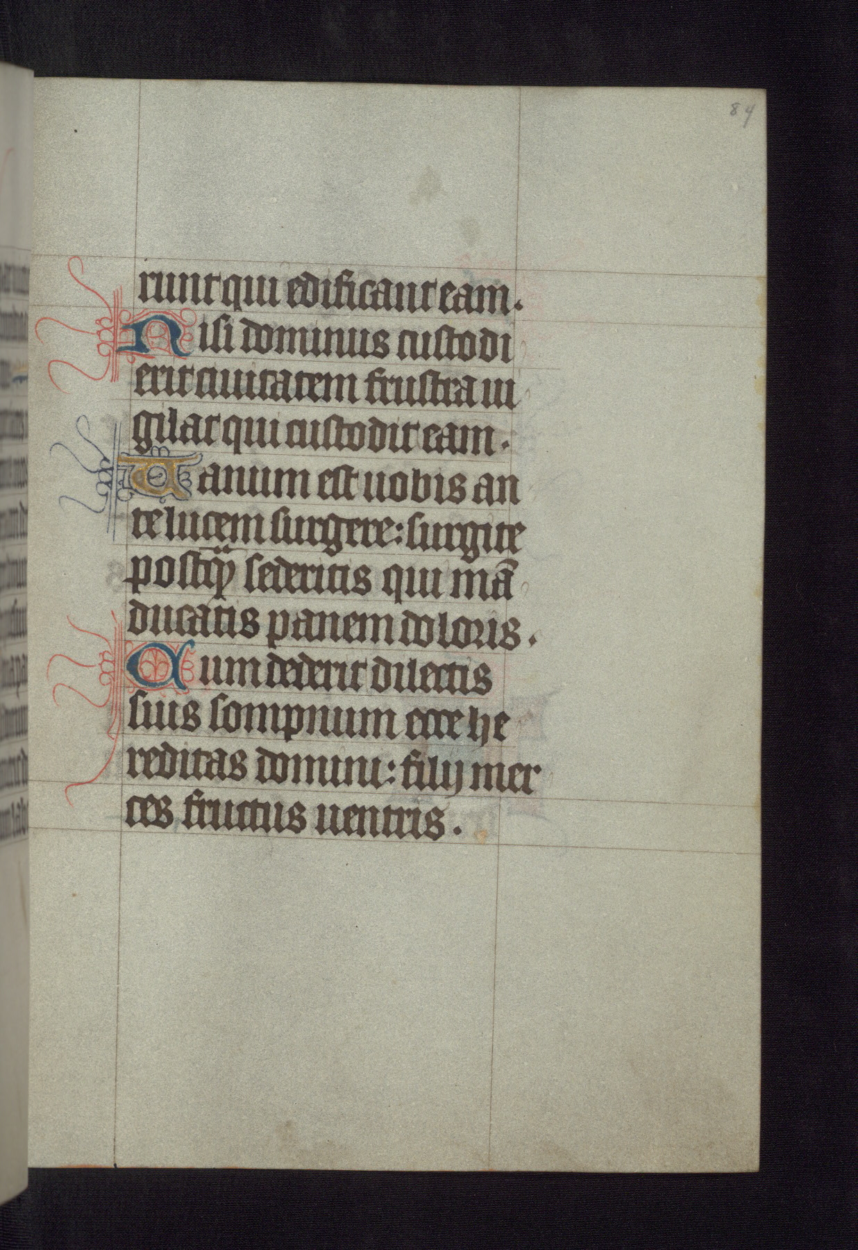 This Book of Hours was named the Doffinnes Hours after Franchoise de Doffinnes, who owned the book in the late sixteenth century and whose family’s subsequent history remains chronicled on the book’s final folios. However, the manuscript was originally made in the first quarter of the fifteenth century, probably for a married couple, who were originally represented kneeling with scrolls and their coats of arms in the margins, flanking a full-page miniature of the Crucifixion (fol. 72v), but whose figures and arms were later erased and overpainted with white. The manuscript contains both Latin and Dutch texts, supplemented by twelve full-page miniatures, the work of the Master of Walters 185. The manuscript also contains twelve pen-and-ink decorated initials in the calendar, some with grotesque faces, and letter "G" descenders throughout the book that can be attributed to the scribe Johannes de Malborch. The book’s original Dutch provenance is indicated by its calendar (for the Use of Utrecht) and its Hours of the Virgin, which follows predominantly the Use of the Windesheim Congregation. Prayers in Dutch were added to the end of the volume in the late fifteenth or early sixteenth century, and the book was subsequently rebound with its current cream-colored parchment binding of the seventeenth or eighteenth century.