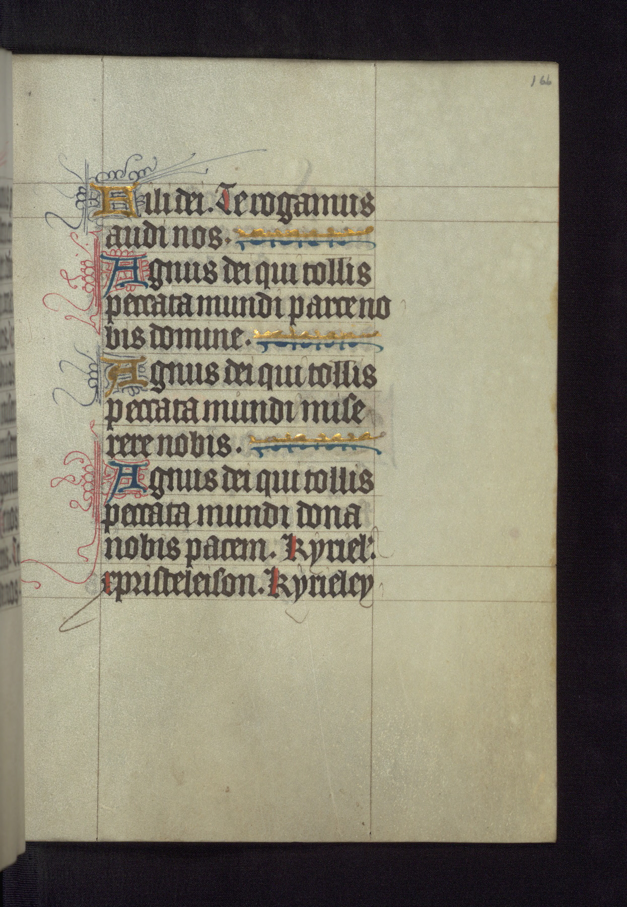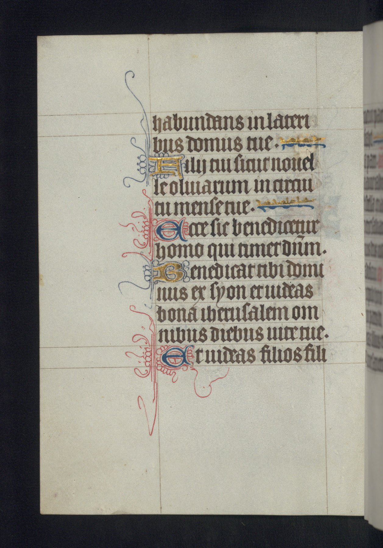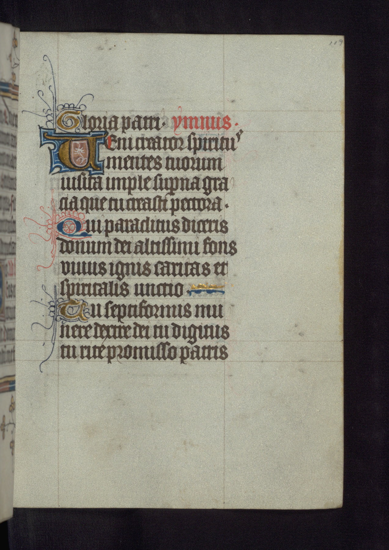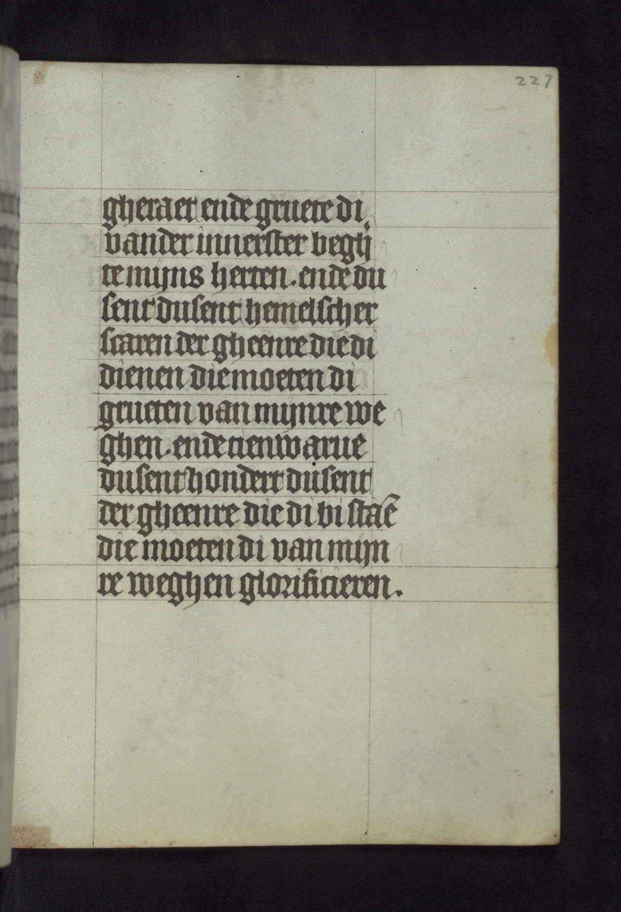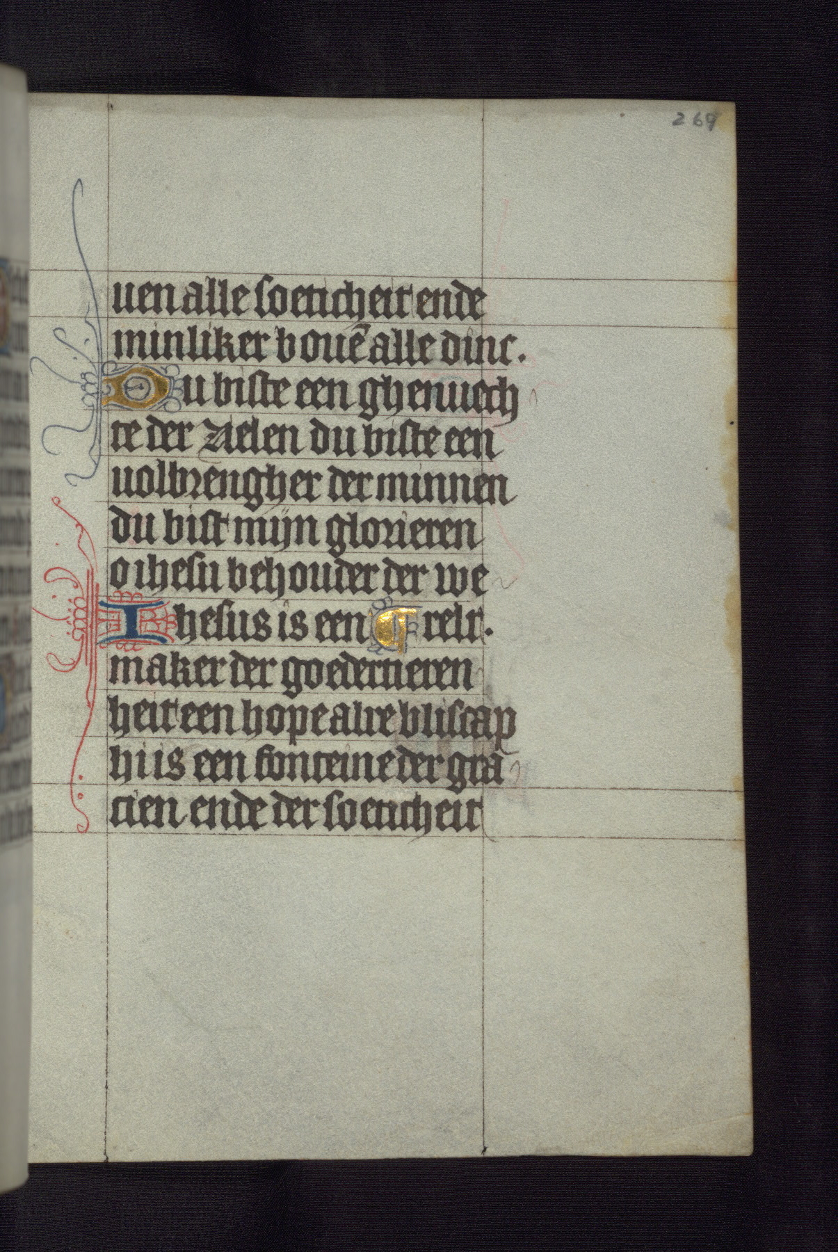 This Book of Hours was named the Doffinnes Hours after Franchoise de Doffinnes, who owned the book in the late sixteenth century and whose family’s subsequent history remains chronicled on the book’s final folios. However, the manuscript was originally made in the first quarter of the fifteenth century, probably for a married couple, who were originally represented kneeling with scrolls and their coats of arms in the margins, flanking a full-page miniature of the Crucifixion (fol. 72v), but whose figures and arms were later erased and overpainted with white. The manuscript contains both Latin and Dutch texts, supplemented by twelve full-page miniatures, the work of the Master of Walters 185. The manuscript also contains twelve pen-and-ink decorated initials in the calendar, some with grotesque faces, and letter "G" descenders throughout the book that can be attributed to the scribe Johannes de Malborch. The book’s original Dutch provenance is indicated by its calendar (for the Use of Utrecht) and its Hours of the Virgin, which follows predominantly the Use of the Windesheim Congregation. Prayers in Dutch were added to the end of the volume in the late fifteenth or early sixteenth century, and the book was subsequently rebound with its current cream-colored parchment binding of the seventeenth or eighteenth century.