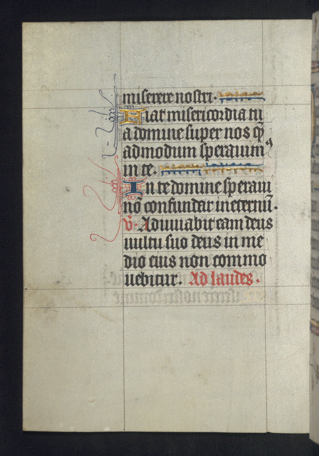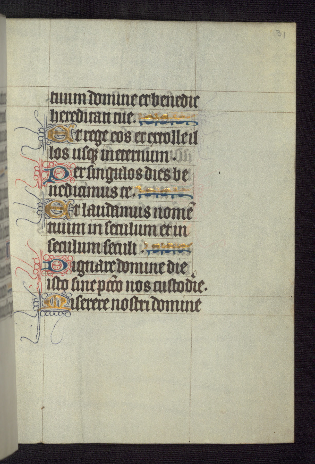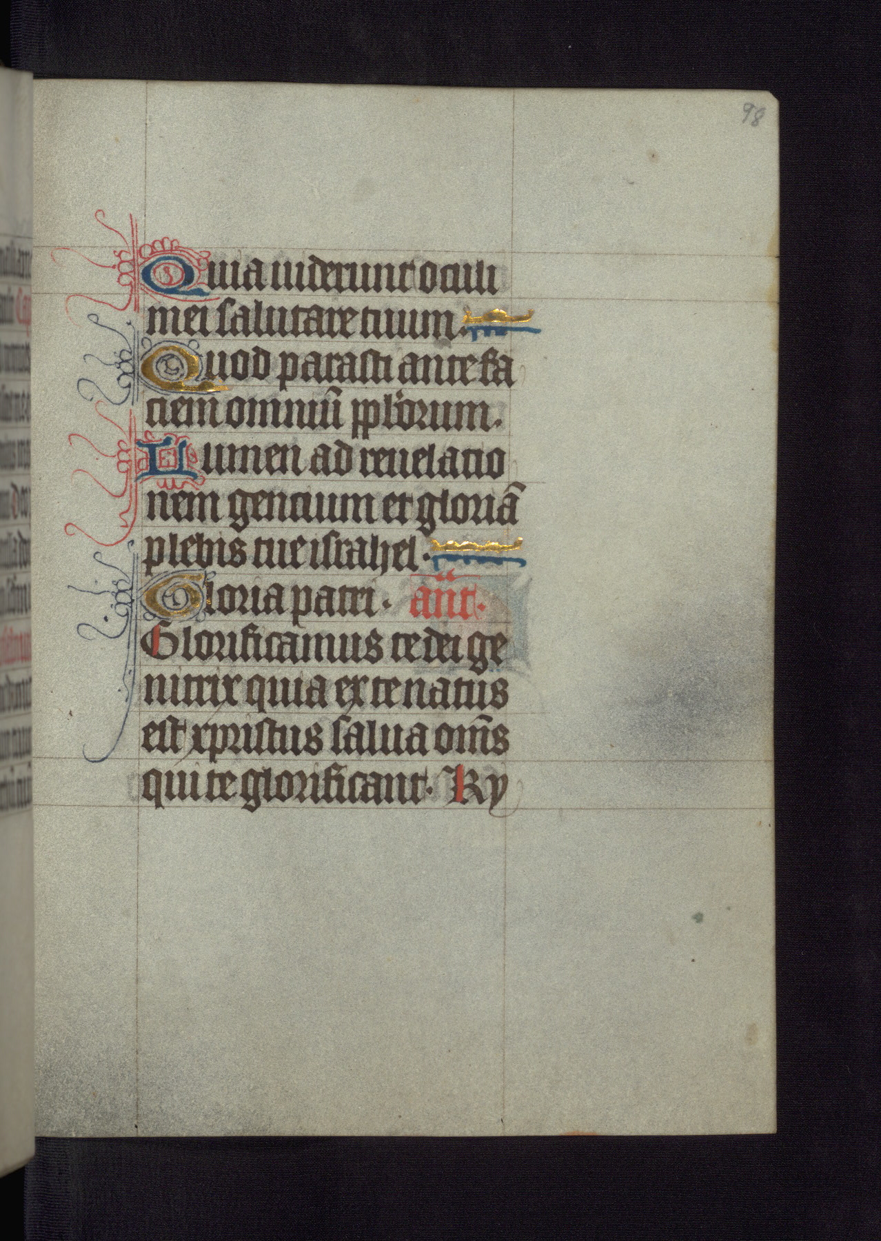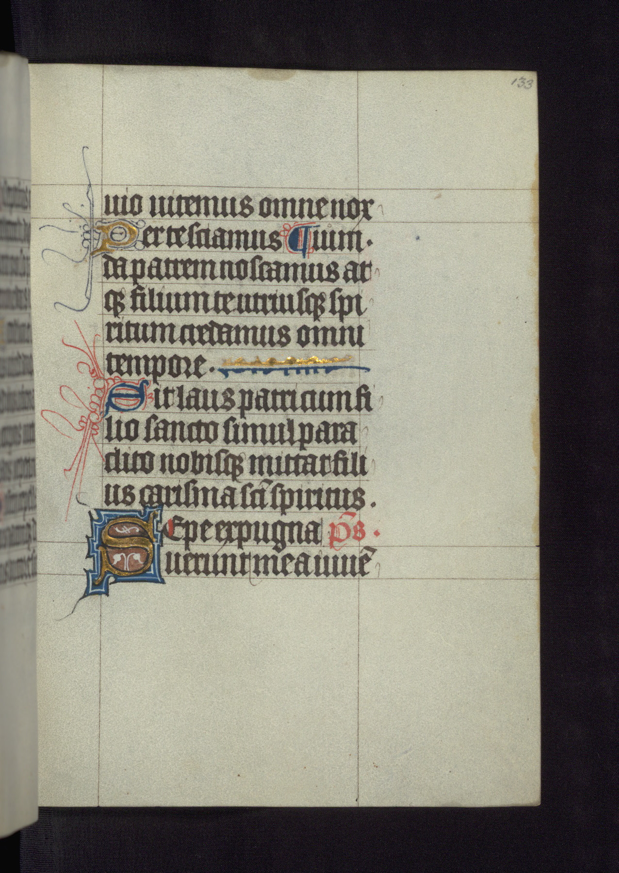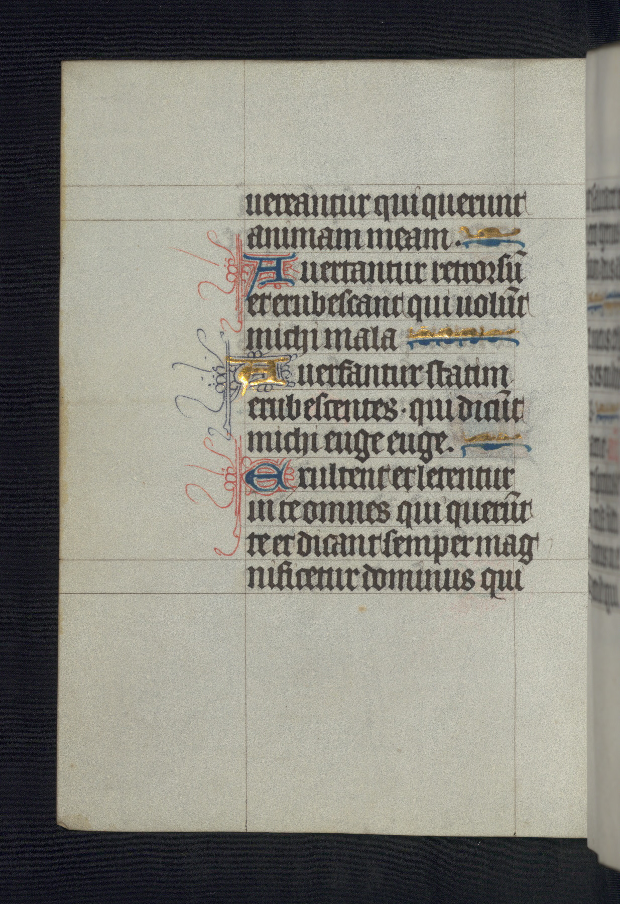 This Book of Hours was named the Doffinnes Hours after Franchoise de Doffinnes, who owned the book in the late sixteenth century and whose family’s subsequent history remains chronicled on the book’s final folios. However, the manuscript was originally made in the first quarter of the fifteenth century, probably for a married couple, who were originally represented kneeling with scrolls and their coats of arms in the margins, flanking a full-page miniature of the Crucifixion (fol. 72v), but whose figures and arms were later erased and overpainted with white. The manuscript contains both Latin and Dutch texts, supplemented by twelve full-page miniatures, the work of the Master of Walters 185. The manuscript also contains twelve pen-and-ink decorated initials in the calendar, some with grotesque faces, and letter "G" descenders throughout the book that can be attributed to the scribe Johannes de Malborch. The book’s original Dutch provenance is indicated by its calendar (for the Use of Utrecht) and its Hours of the Virgin, which follows predominantly the Use of the Windesheim Congregation. Prayers in Dutch were added to the end of the volume in the late fifteenth or early sixteenth century, and the book was subsequently rebound with its current cream-colored parchment binding of the seventeenth or eighteenth century.