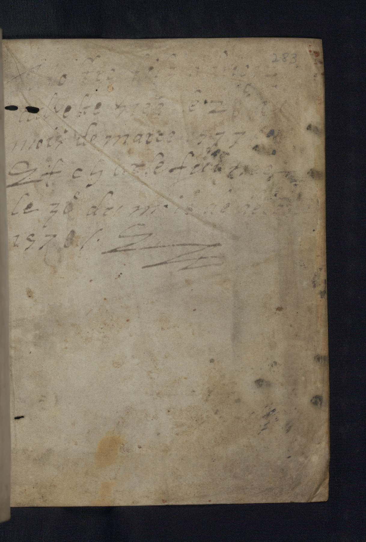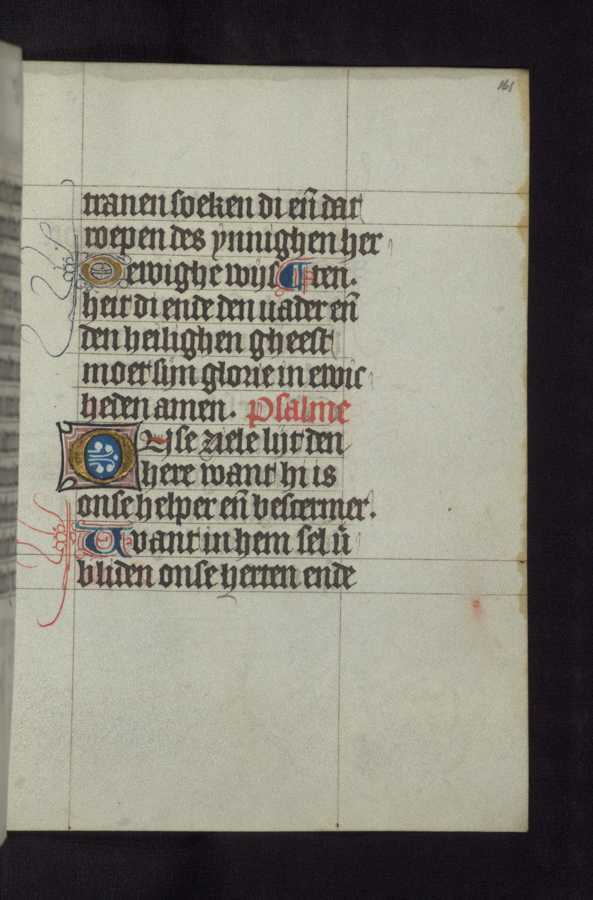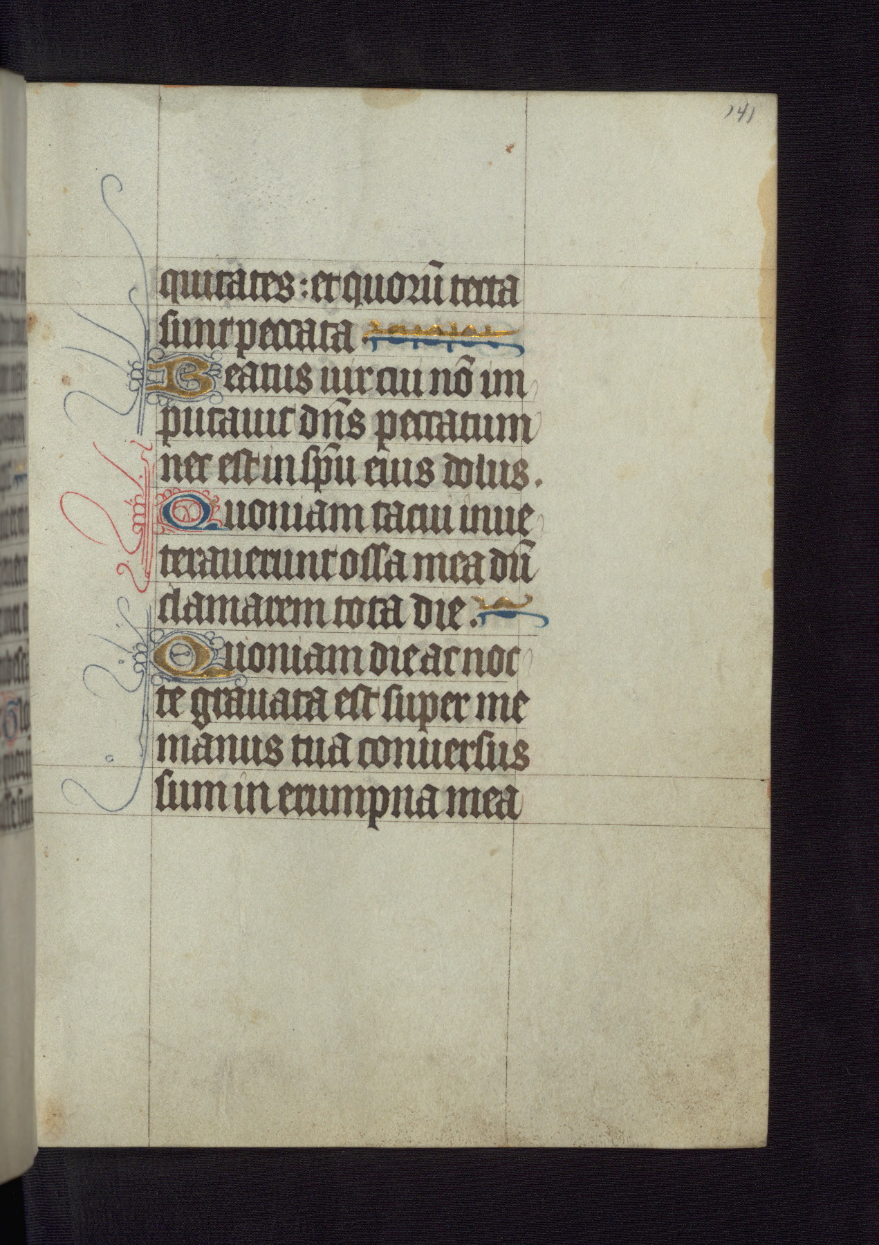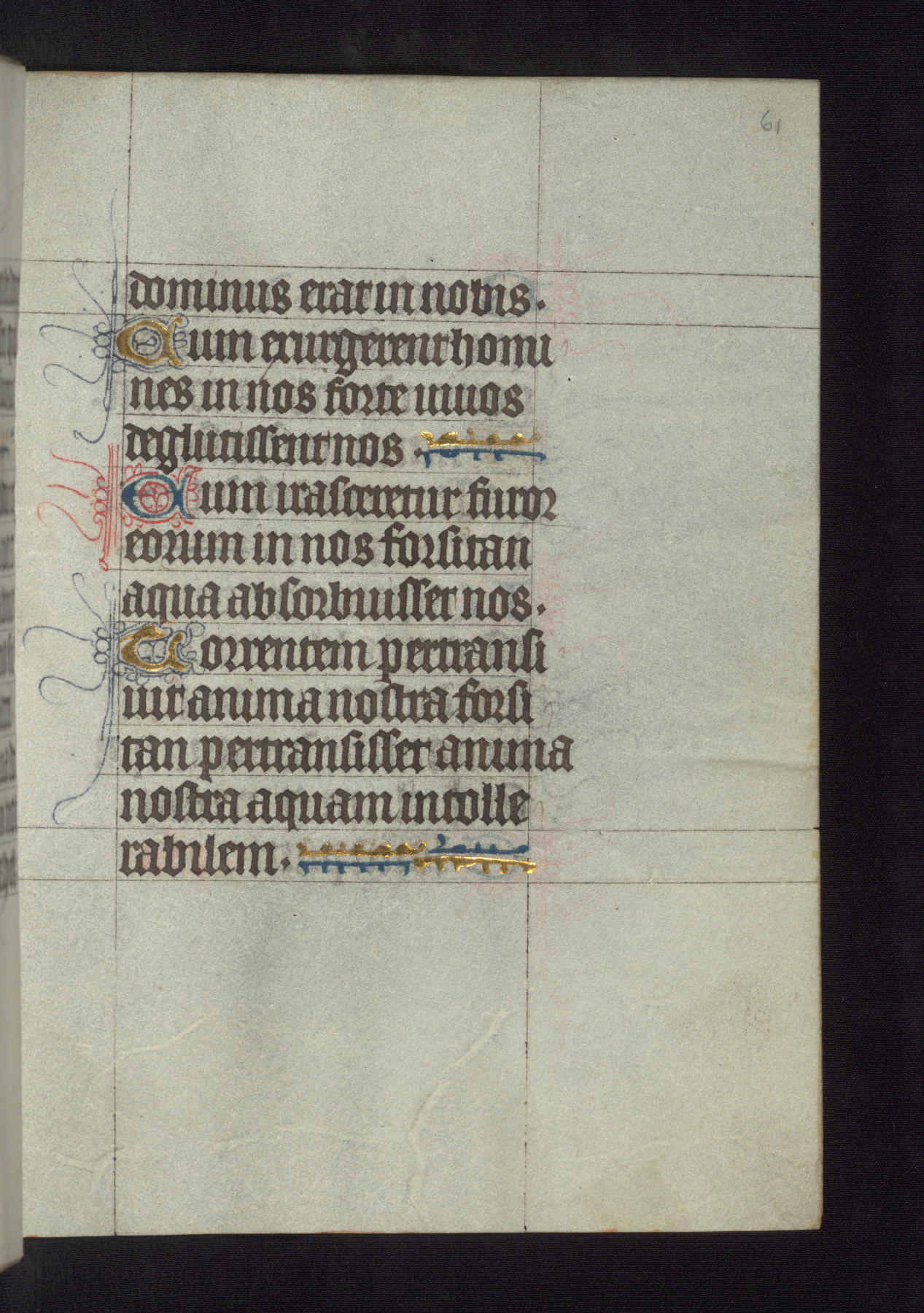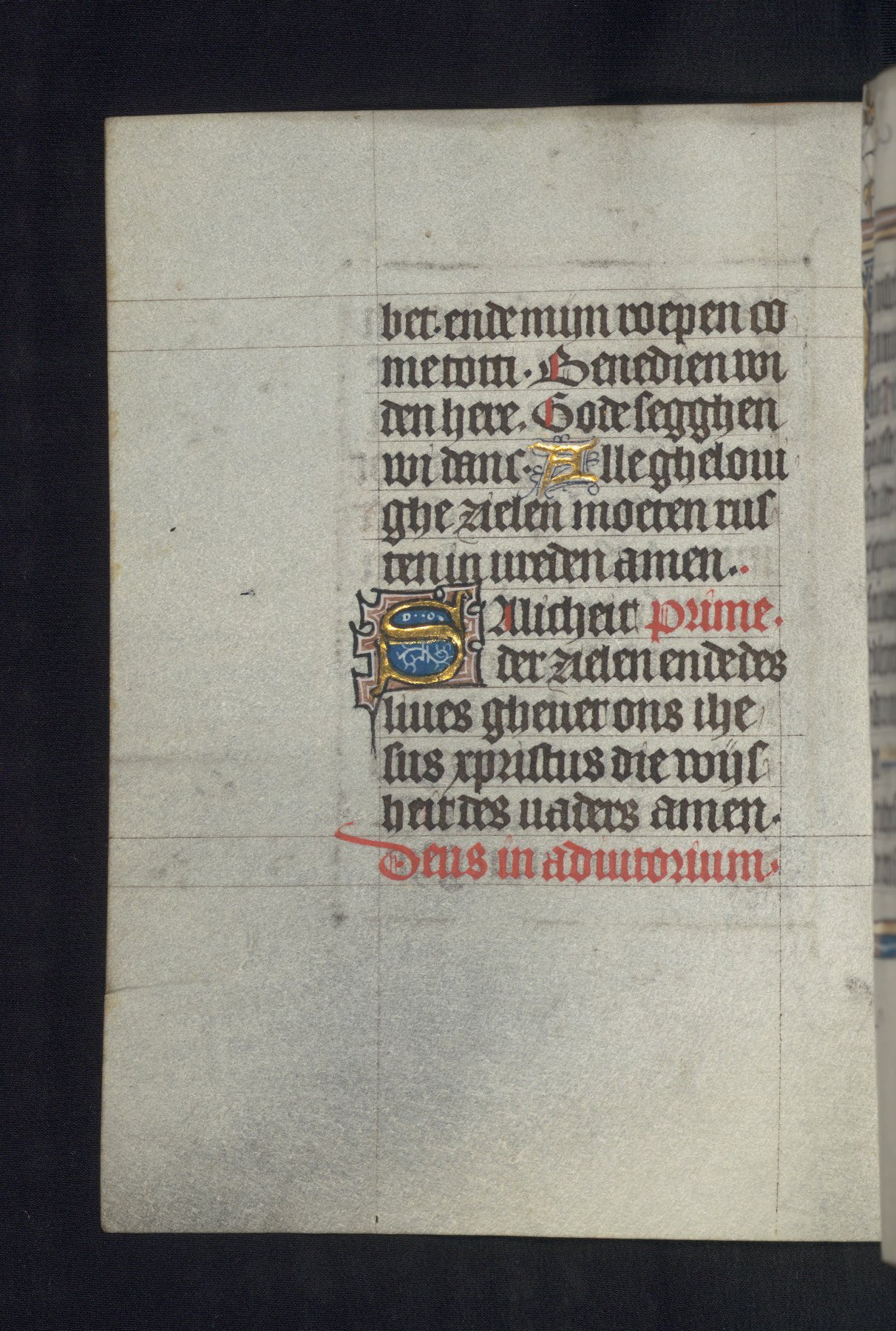 This Book of Hours was named the Doffinnes Hours after Franchoise de Doffinnes, who owned the book in the late sixteenth century and whose family’s subsequent history remains chronicled on the book’s final folios. However, the manuscript was originally made in the first quarter of the fifteenth century, probably for a married couple, who were originally represented kneeling with scrolls and their coats of arms in the margins, flanking a full-page miniature of the Crucifixion (fol. 72v), but whose figures and arms were later erased and overpainted with white. The manuscript contains both Latin and Dutch texts, supplemented by twelve full-page miniatures, the work of the Master of Walters 185. The manuscript also contains twelve pen-and-ink decorated initials in the calendar, some with grotesque faces, and letter "G" descenders throughout the book that can be attributed to the scribe Johannes de Malborch. The book’s original Dutch provenance is indicated by its calendar (for the Use of Utrecht) and its Hours of the Virgin, which follows predominantly the Use of the Windesheim Congregation. Prayers in Dutch were added to the end of the volume in the late fifteenth or early sixteenth century, and the book was subsequently rebound with its current cream-colored parchment binding of the seventeenth or eighteenth century.