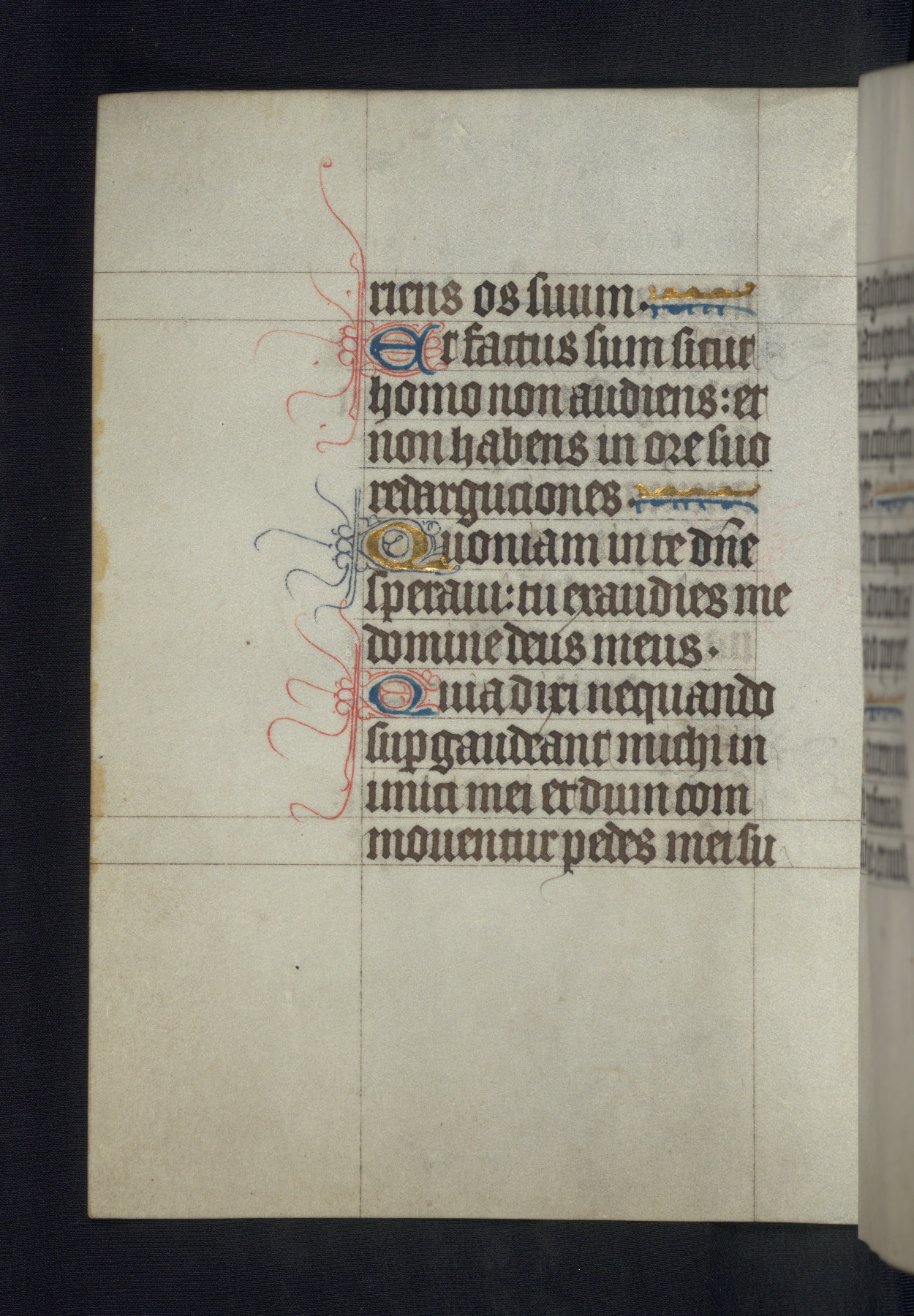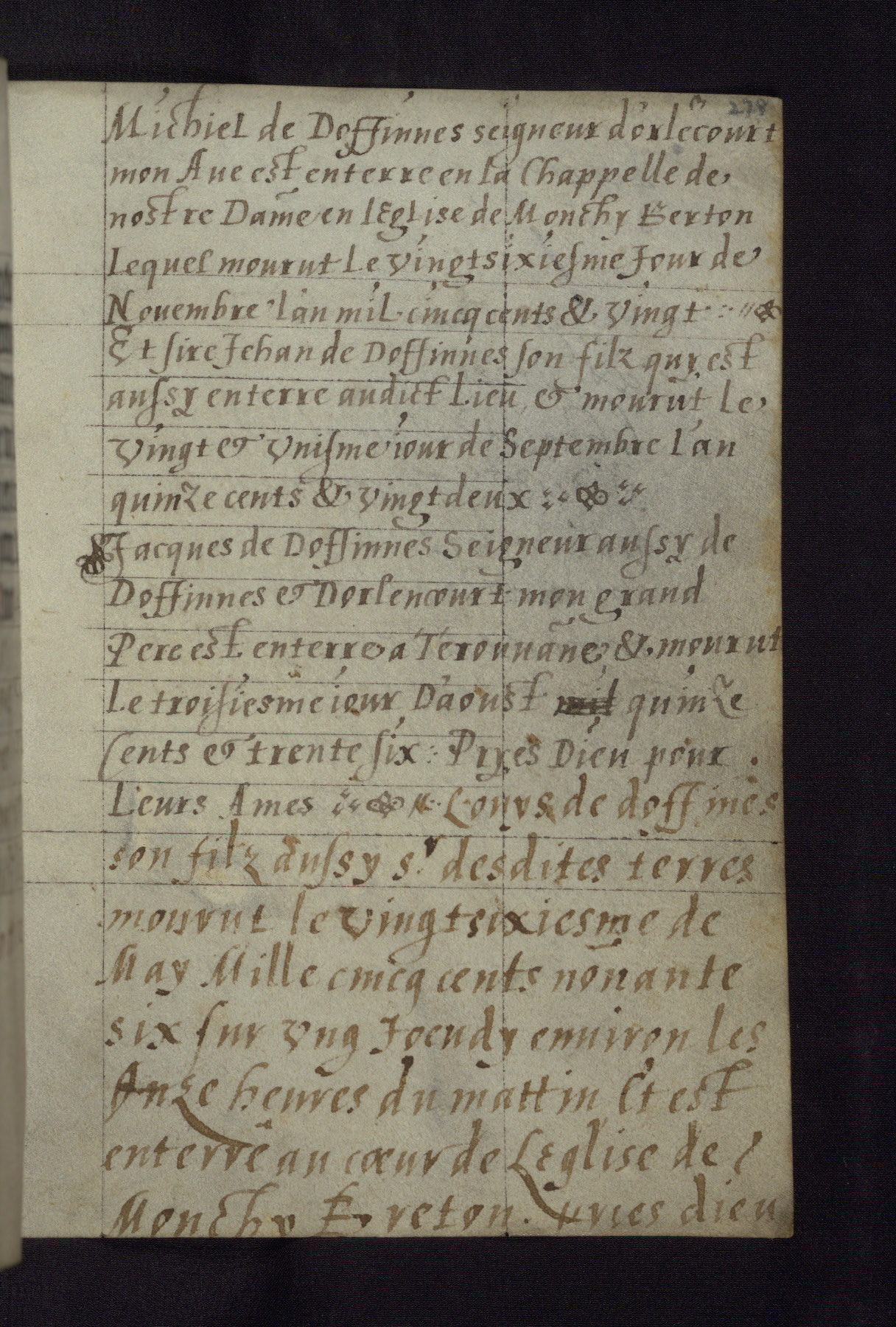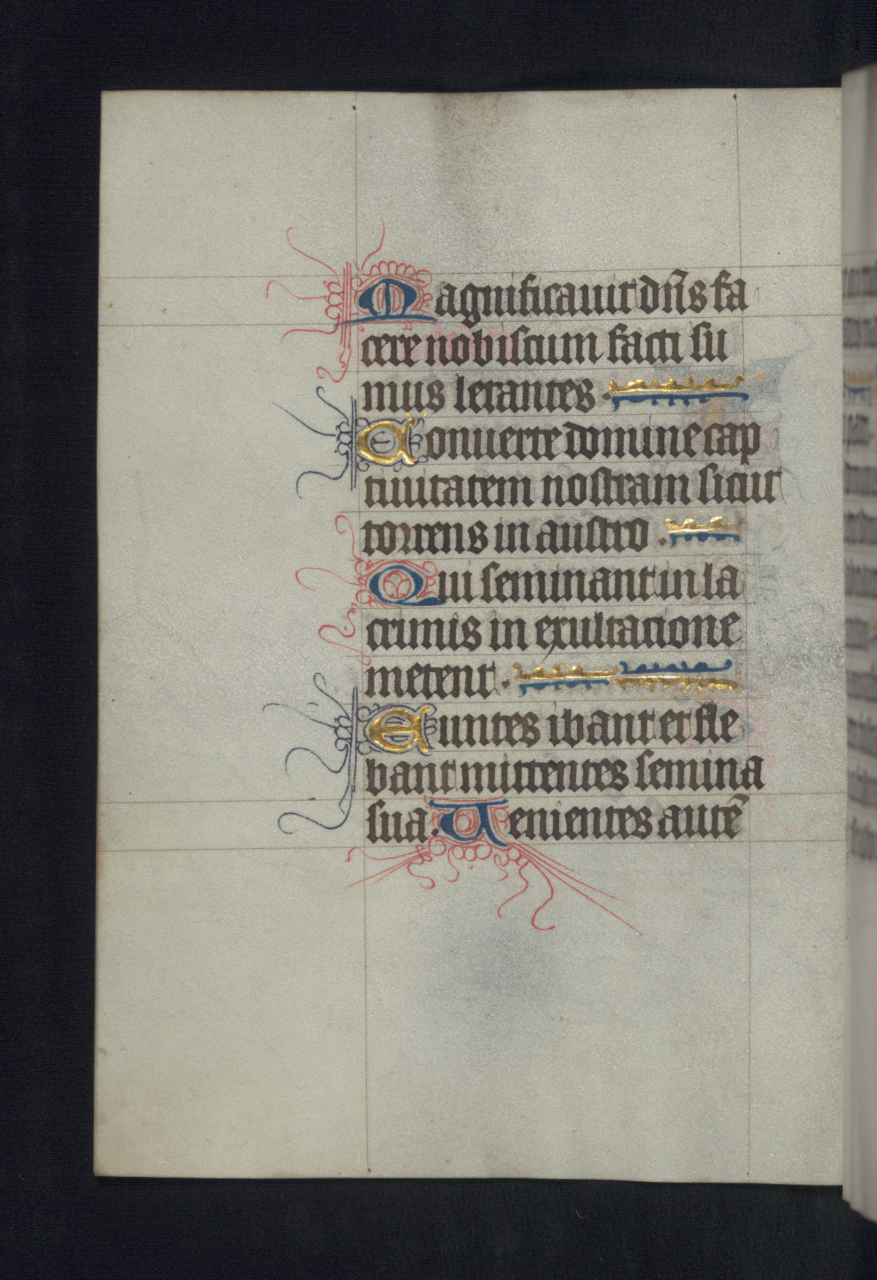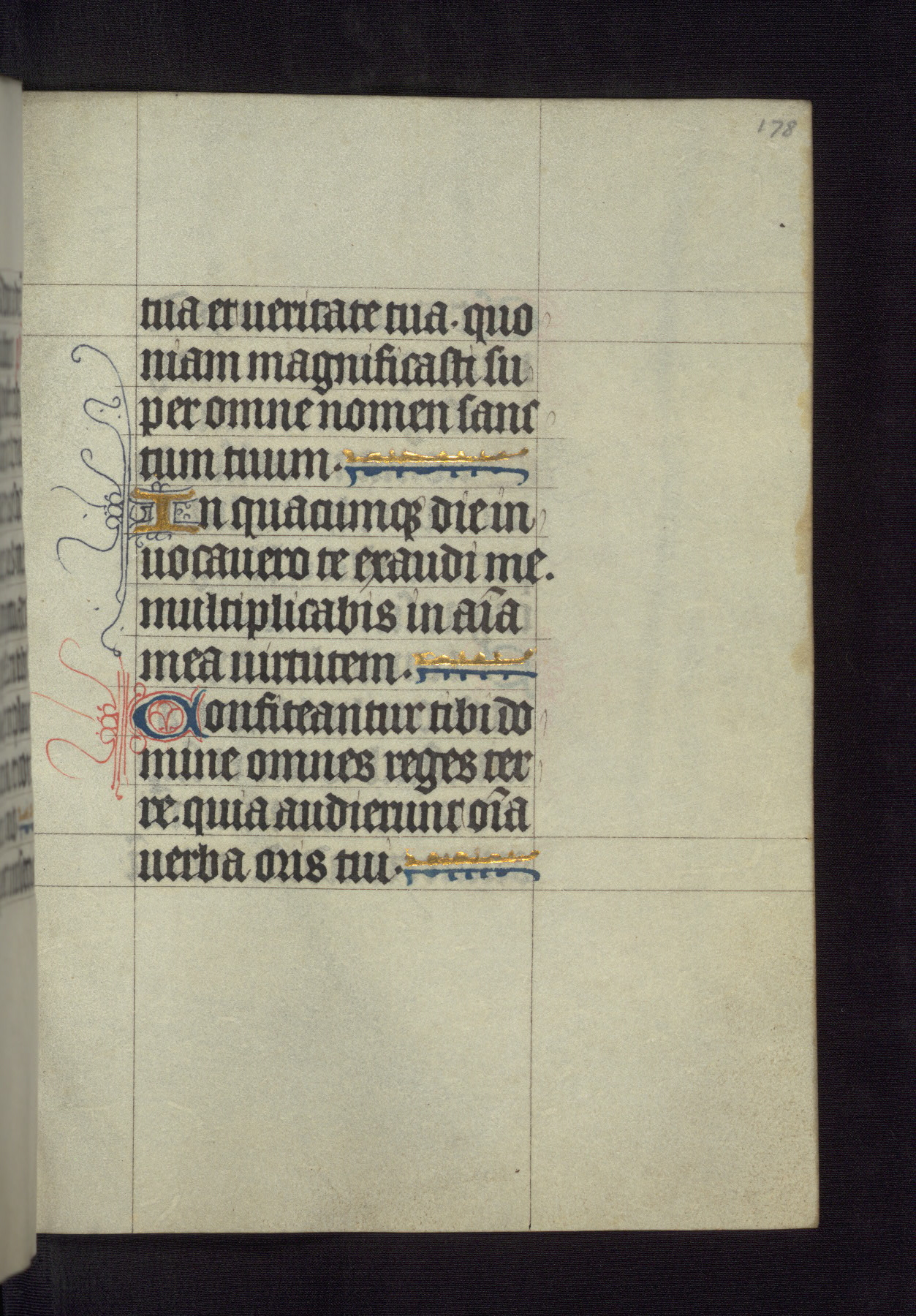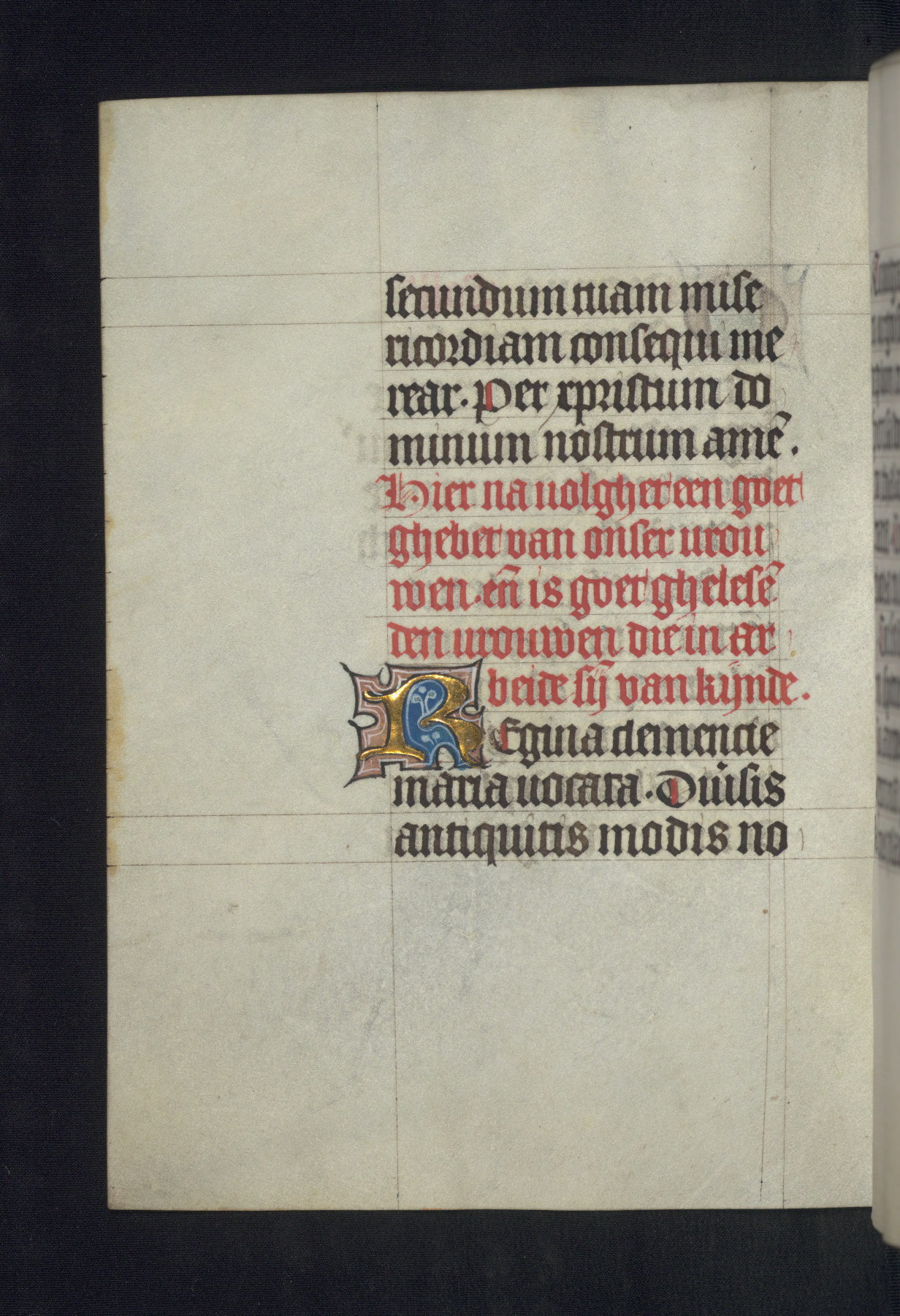 This Book of Hours was named the Doffinnes Hours after Franchoise de Doffinnes, who owned the book in the late sixteenth century and whose family’s subsequent history remains chronicled on the book’s final folios. However, the manuscript was originally made in the first quarter of the fifteenth century, probably for a married couple, who were originally represented kneeling with scrolls and their coats of arms in the margins, flanking a full-page miniature of the Crucifixion (fol. 72v), but whose figures and arms were later erased and overpainted with white. The manuscript contains both Latin and Dutch texts, supplemented by twelve full-page miniatures, the work of the Master of Walters 185. The manuscript also contains twelve pen-and-ink decorated initials in the calendar, some with grotesque faces, and letter "G" descenders throughout the book that can be attributed to the scribe Johannes de Malborch. The book’s original Dutch provenance is indicated by its calendar (for the Use of Utrecht) and its Hours of the Virgin, which follows predominantly the Use of the Windesheim Congregation. Prayers in Dutch were added to the end of the volume in the late fifteenth or early sixteenth century, and the book was subsequently rebound with its current cream-colored parchment binding of the seventeenth or eighteenth century.
