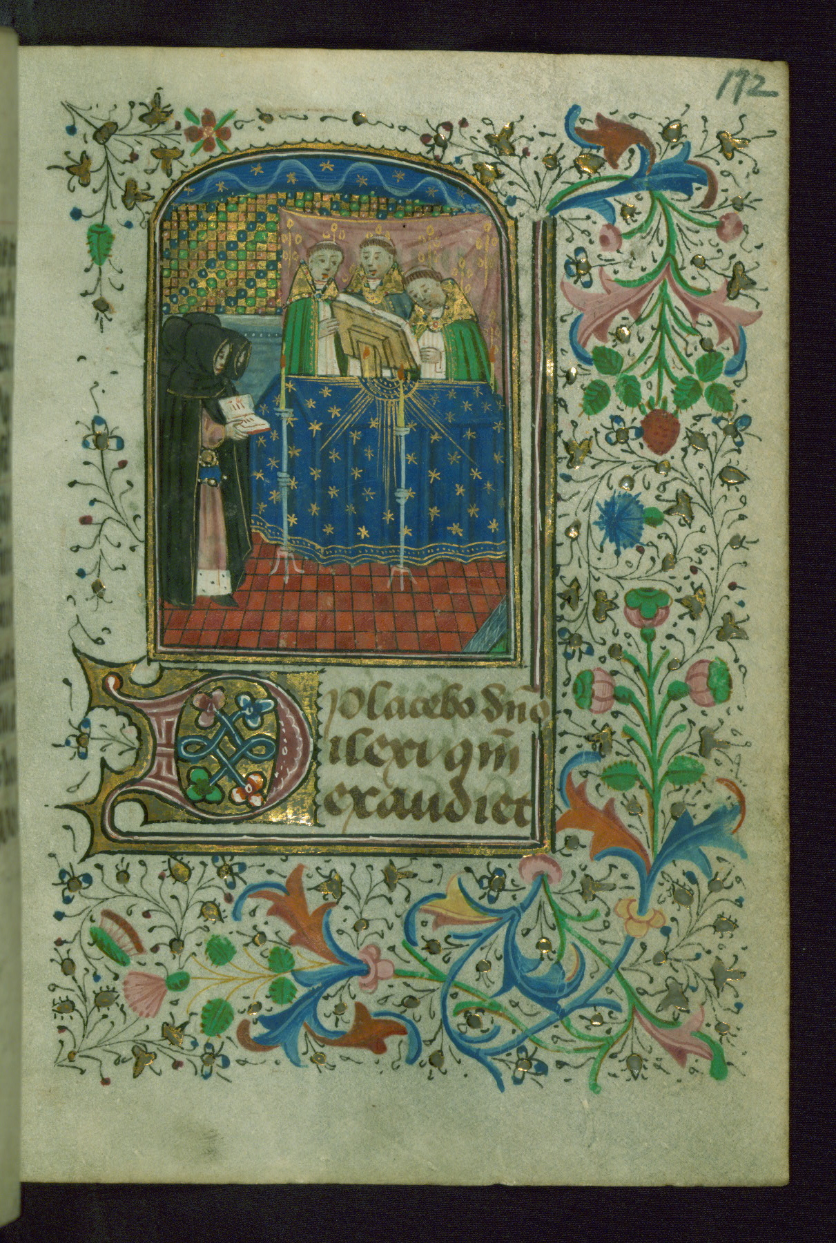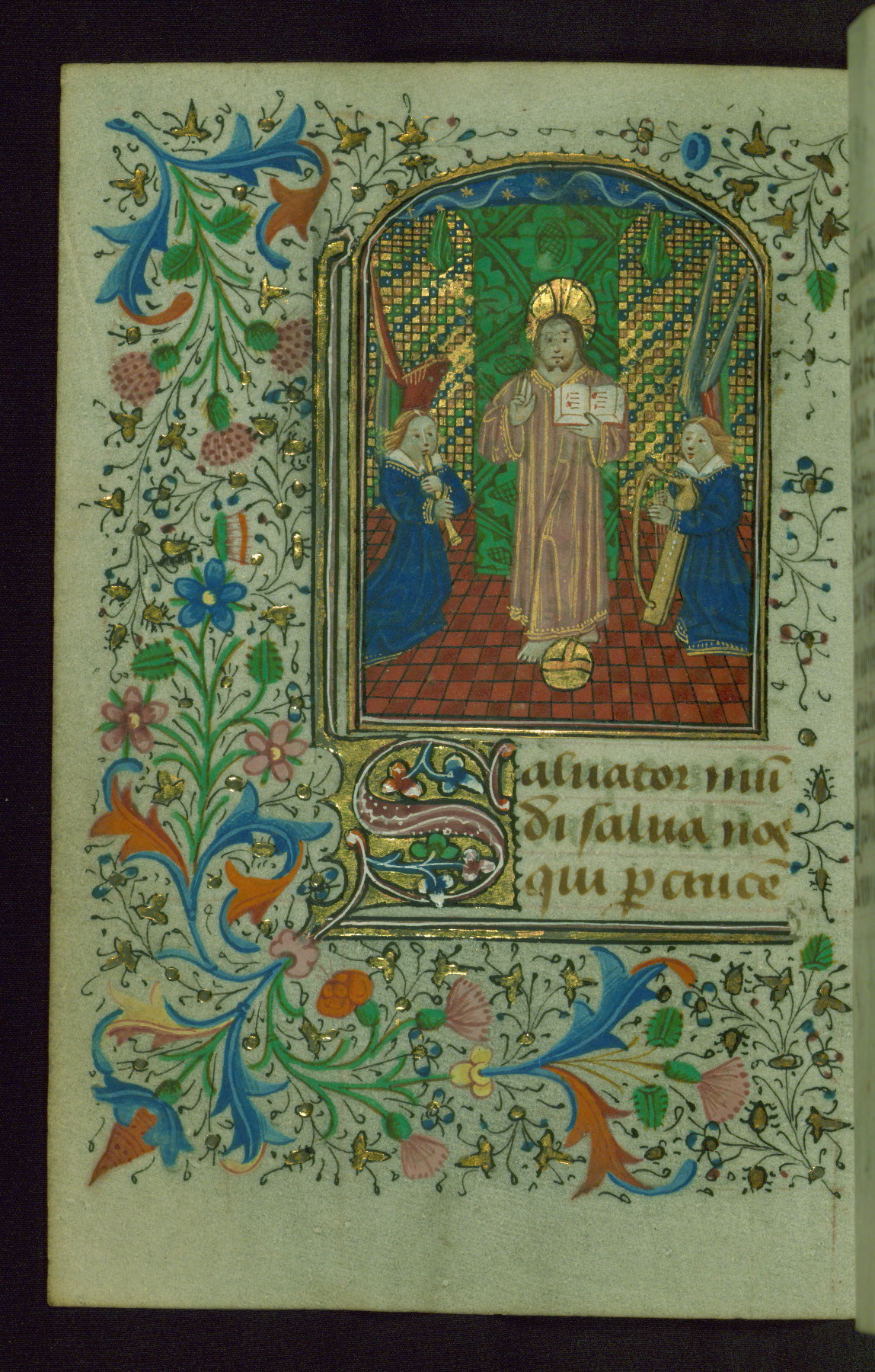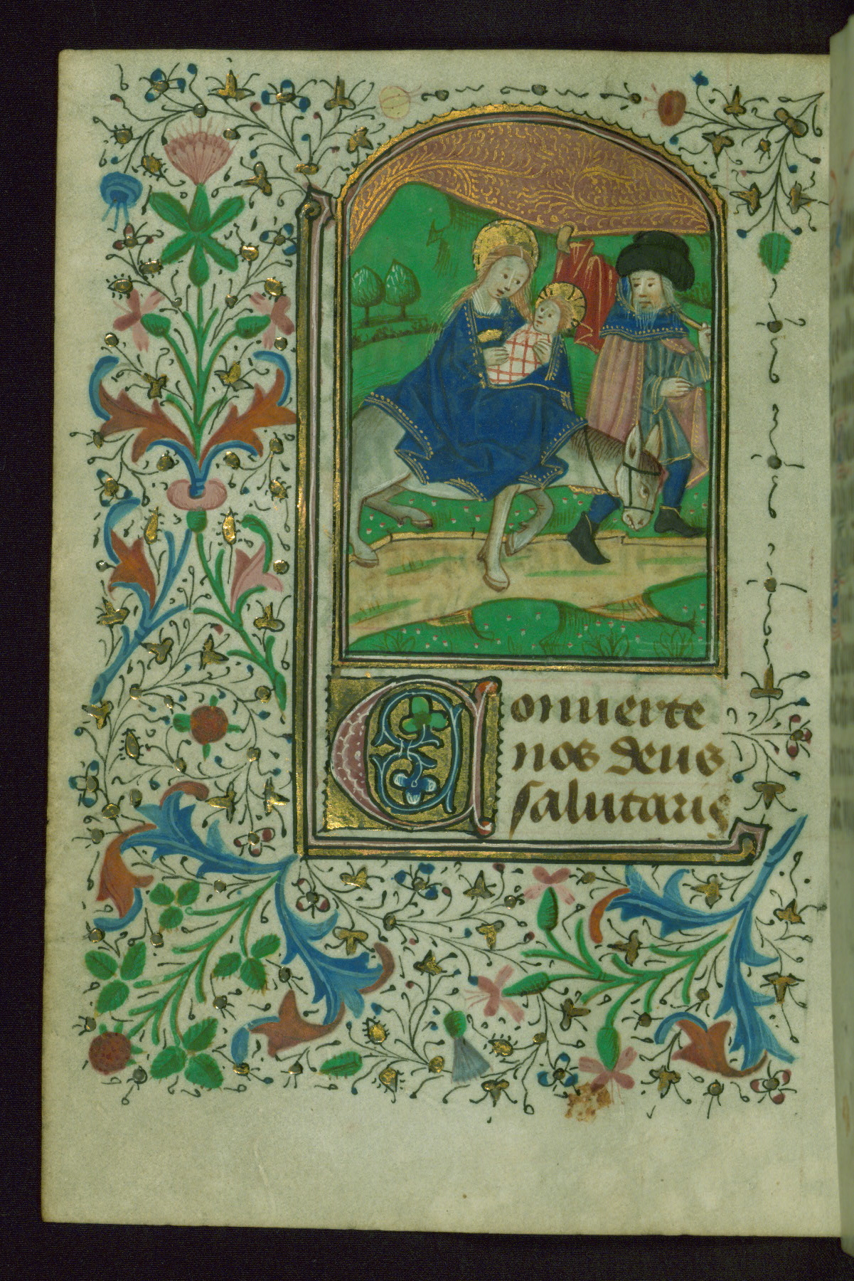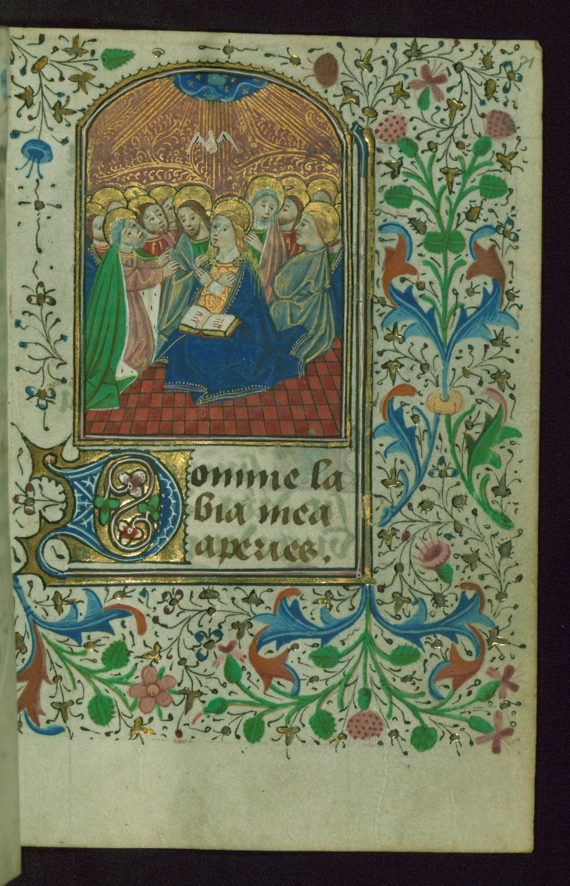 - Decoration note: Twenty-two extant full-page miniatures (two lacking after fols. 132 and 271); illuminated margins around full-page miniatures with flora; large decorated initials at each incipit (3 lines); small initials at secondary text divisions (2 lines); left-aligned flourished initials in litany and in text at versals (1 line); line fillers in gold and blue; rubrics in red; text in brown ink