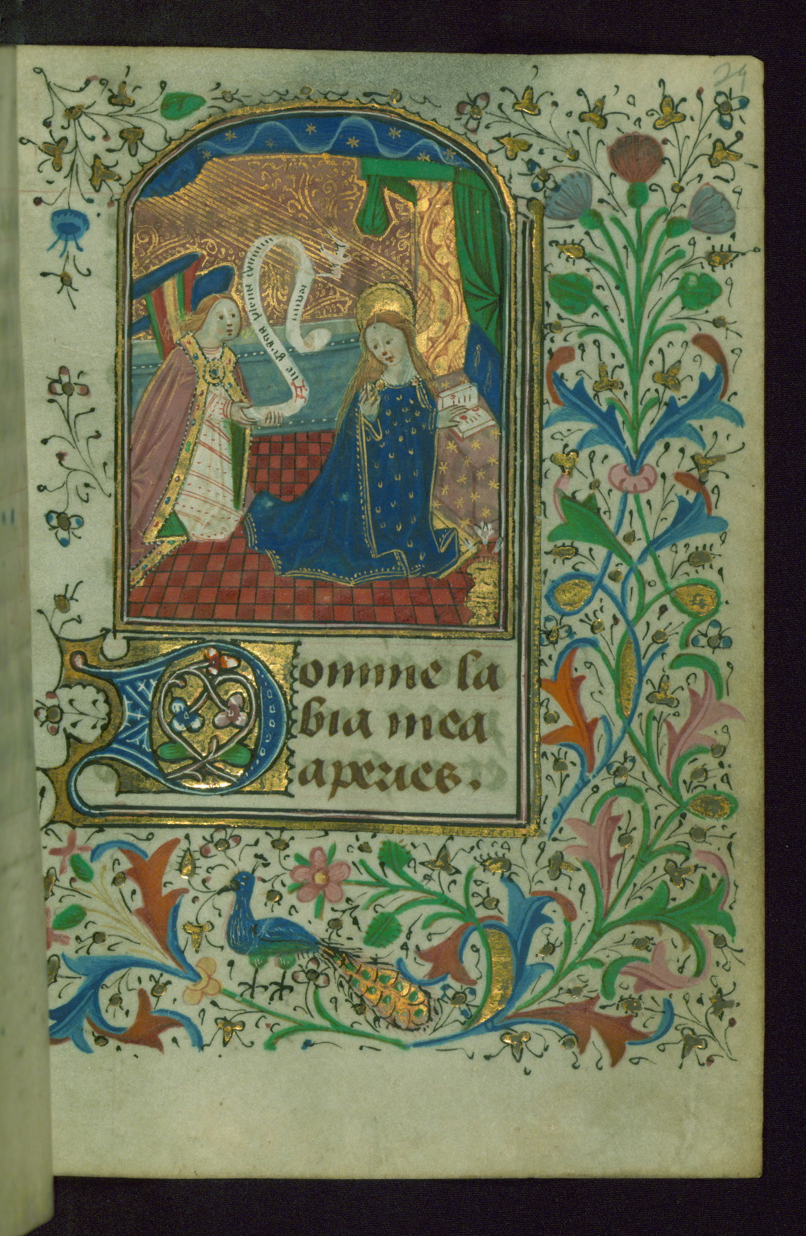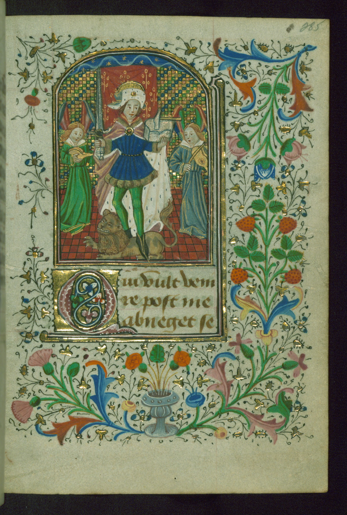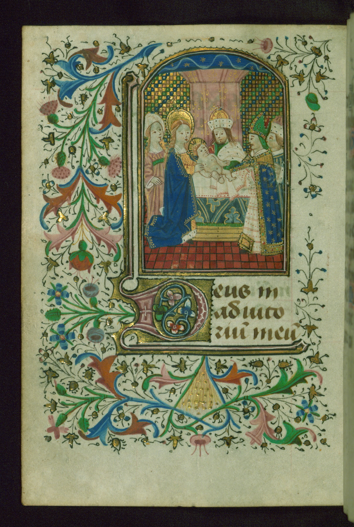 - Decoration note: Twenty-two extant full-page miniatures (two lacking after fols. 132 and 271); illuminated margins around full-page miniatures with flora; large decorated initials at each incipit (3 lines); small initials at secondary text divisions (2 lines); left-aligned flourished initials in litany and in text at versals (1 line); line fillers in gold and blue; rubrics in red; text in brown ink