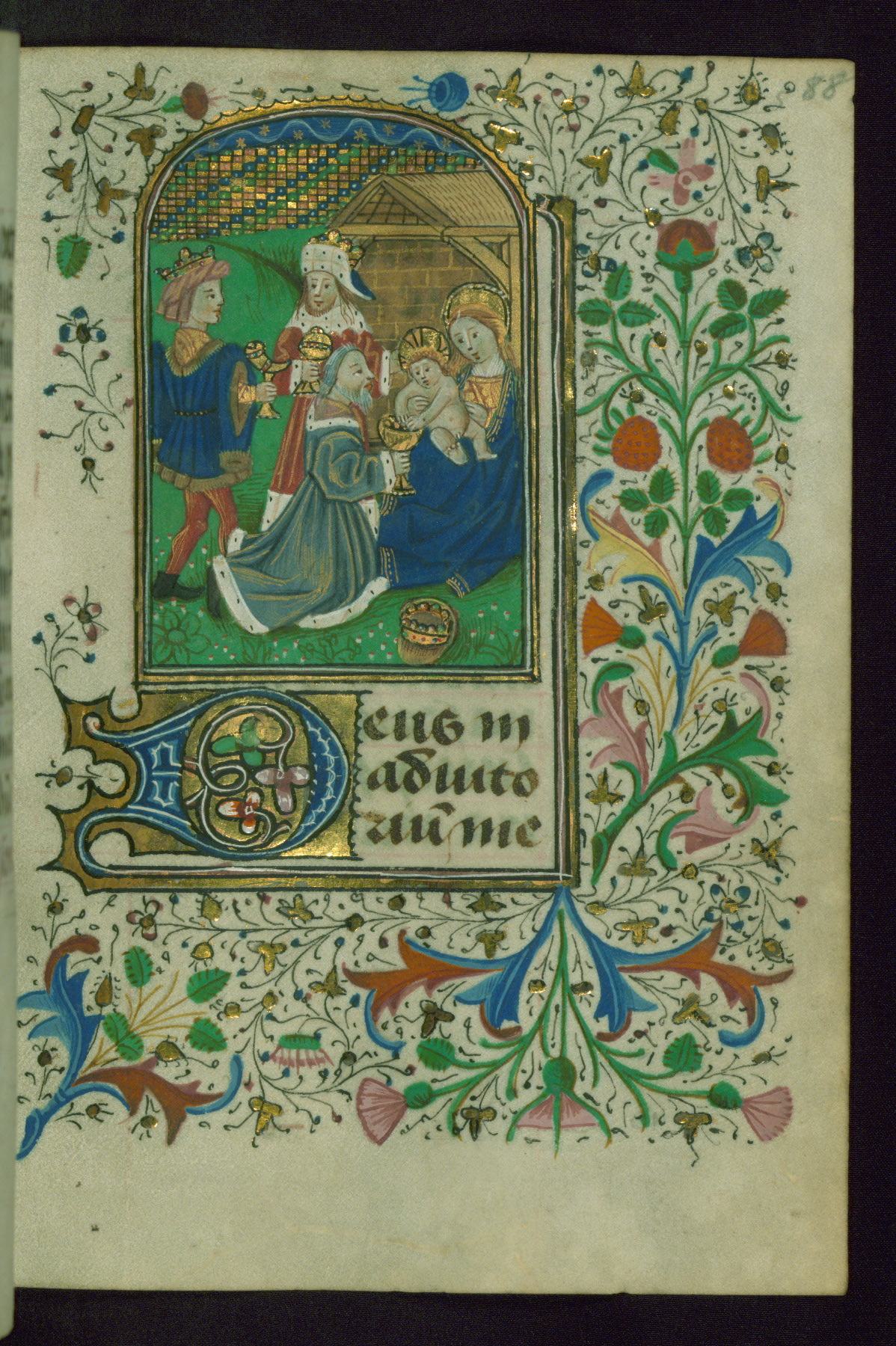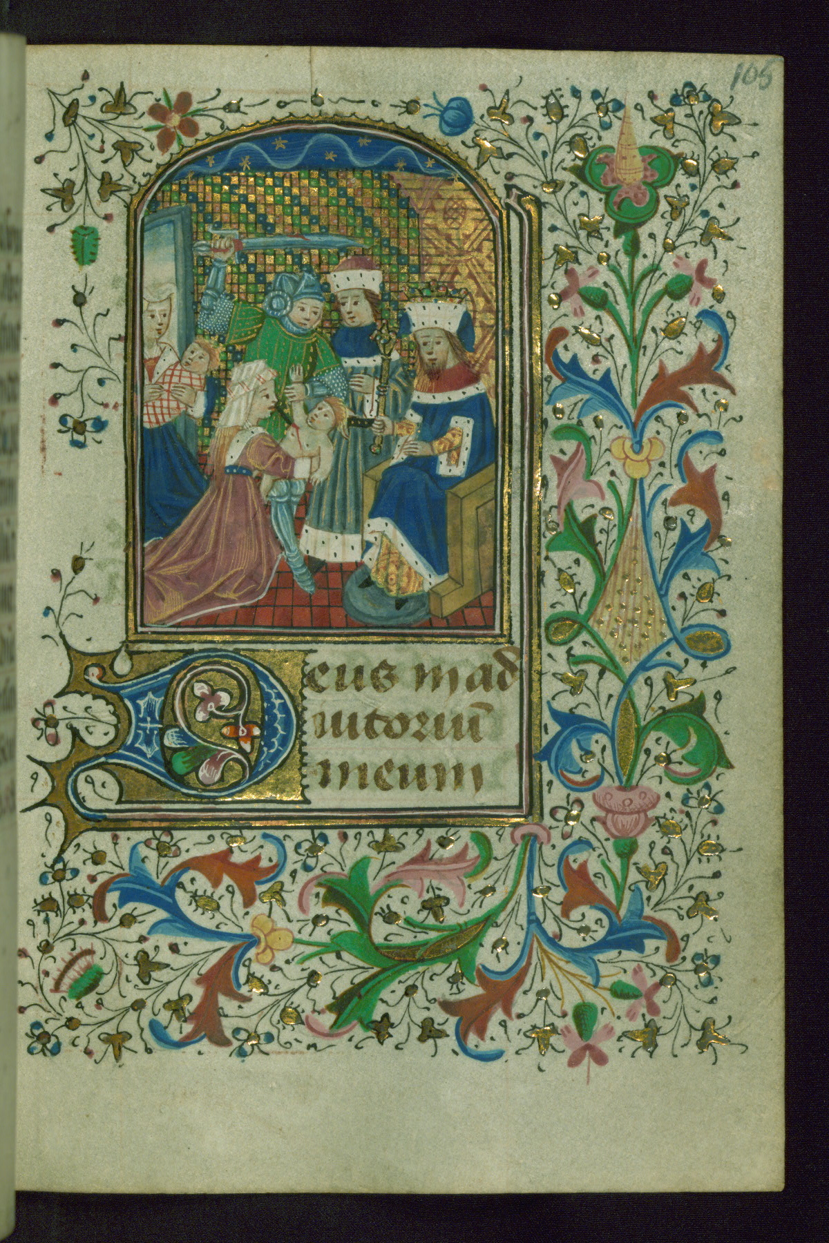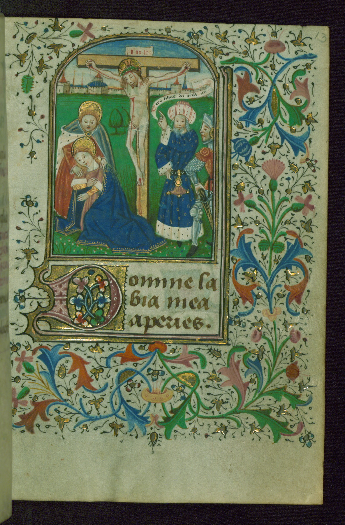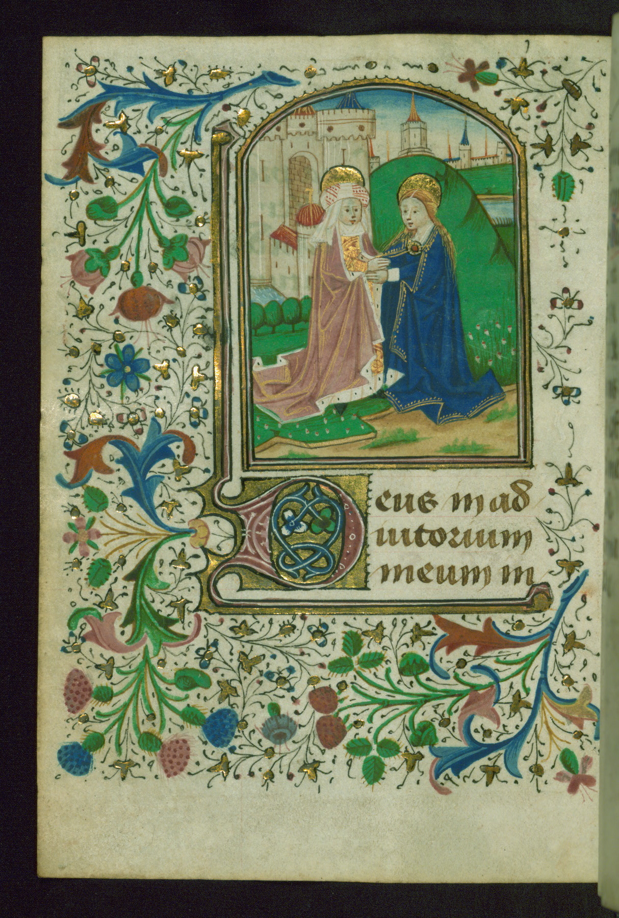 - Decoration note: Twenty-two extant full-page miniatures (two lacking after fols. 132 and 271); illuminated margins around full-page miniatures with flora; large decorated initials at each incipit (3 lines); small initials at secondary text divisions (2 lines); left-aligned flourished initials in litany and in text at versals (1 line); line fillers in gold and blue; rubrics in red; text in brown ink