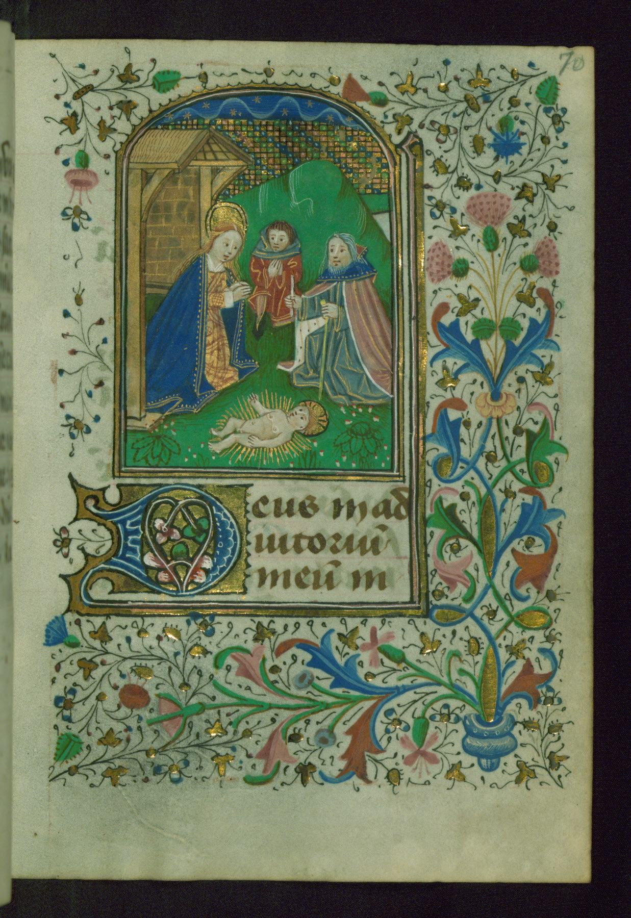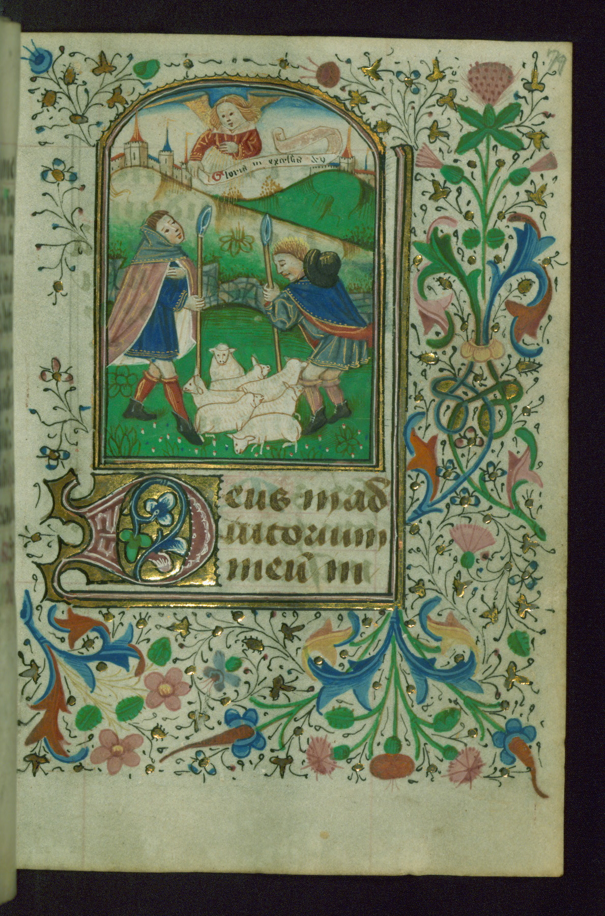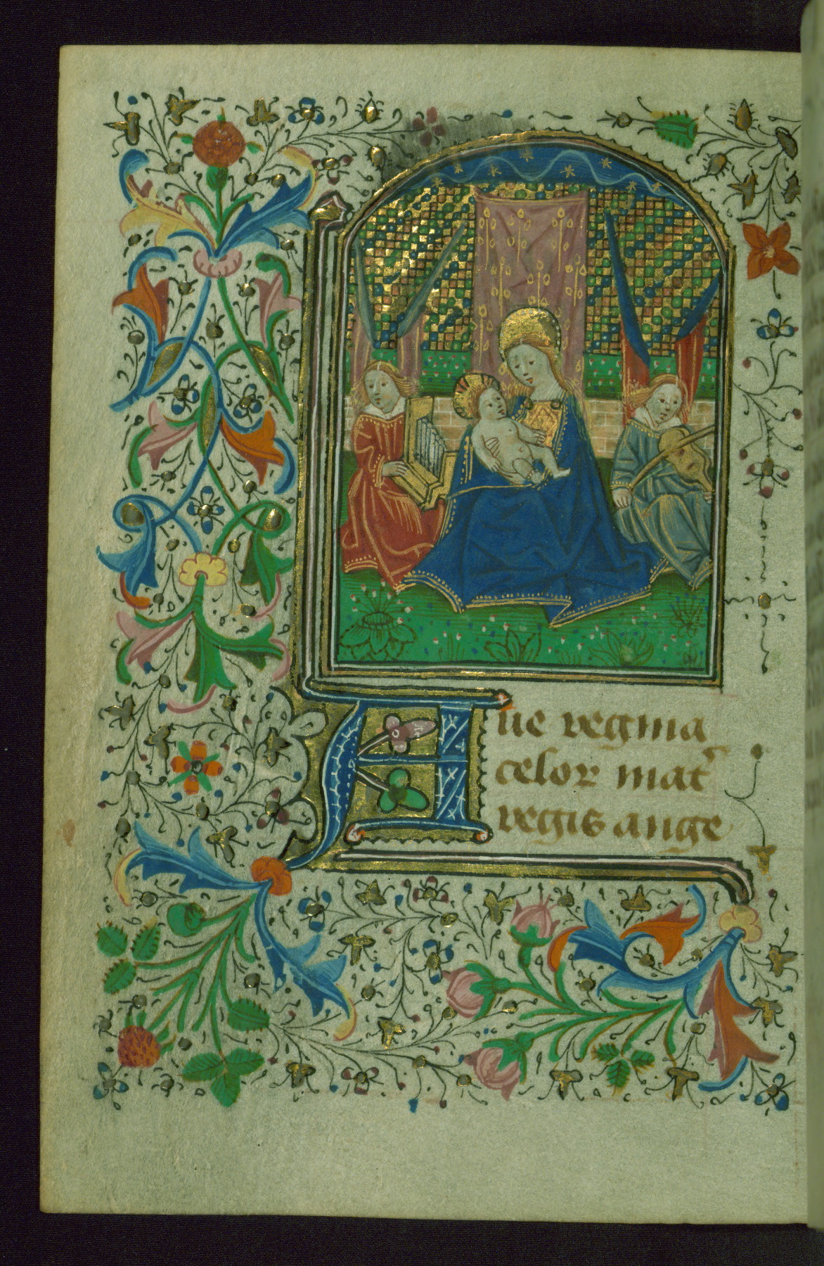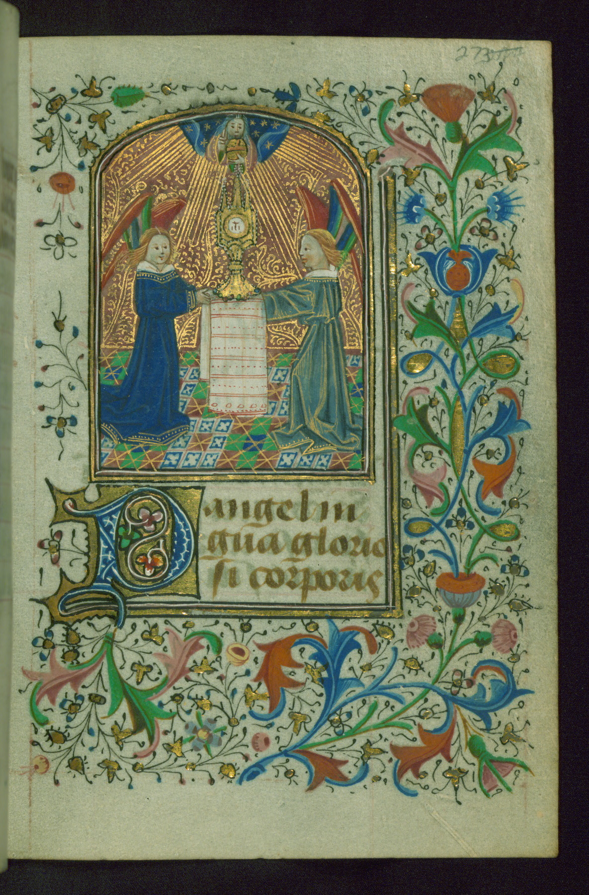 This richly illuminated Book of Hours was produced ca. 1460 in Bruges by an artist in the circle of Willem Vrelant, whose work was influenced by the Masters of the Gold Scrolls and Master of the Beady Eyes. Allusions to the order of Franciscans and Augustinians in the litany and calendar, and the prominent depiction of female saints in the All Saints miniature (fol. 293r) indicate that the book was originally created for a female patron, possibly connected to one of these orders. Much of the existing scholarship on the book's twenty-two full-page miniatures has focused on the depictions of angelic musicians, such as those found on fol. 278v. Also of interest is the presence of multiple pilgrimage badge impressions on the final folio (fol. 295v).