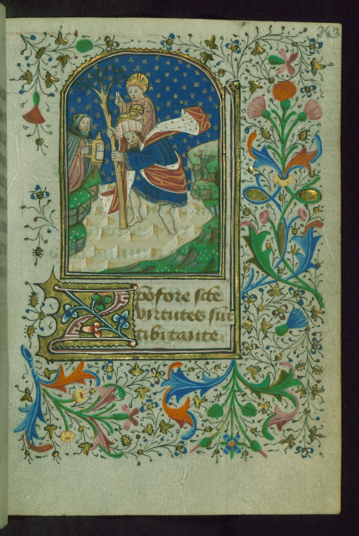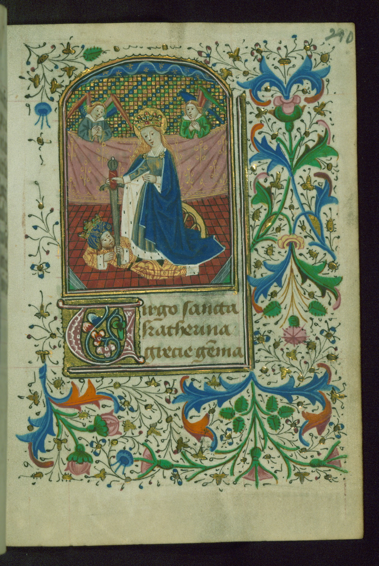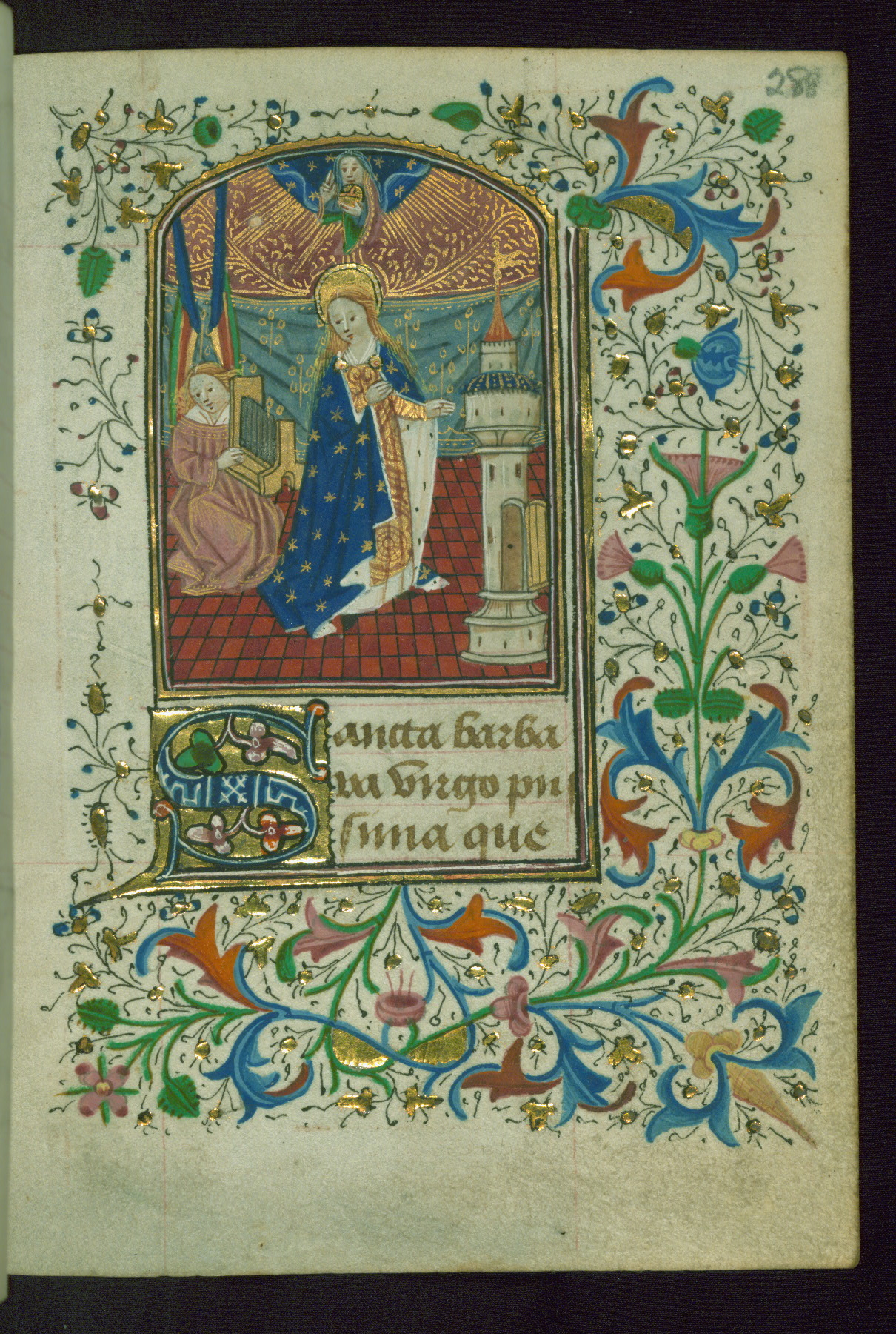 - Contents: Opening illumination missing; suffrages are to: fols. 272r-v: God; fols. 273r-276r: Corpus Christi (rhyming); fols. 276v-278r: Christ, "Salvator mundi"; fols. 278v-279v: the Virgin, "Ave regina celorum"; fols. 280r-281r: St. John the Baptist; fols. 281v-282v: St. Martin; fols. 283r-284v: St. Christopher; fols. 285r-286r: St. Adrian; fols. 288r-289v: St. Barbara; fols. 290r-291r: St. Catherine (rhyming); fols. 291v-292v: St. Margaret; fols. 293r-294v: All saints