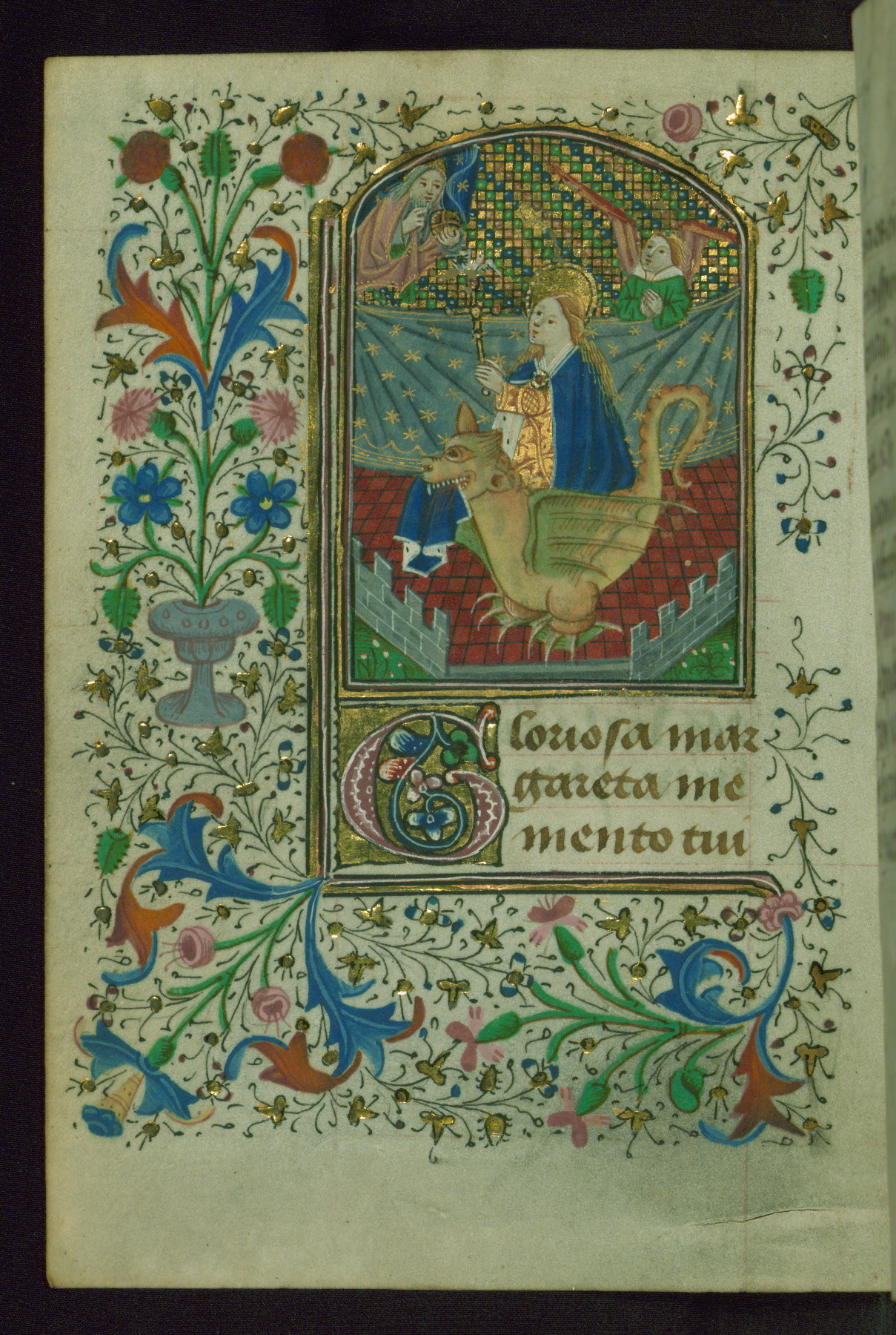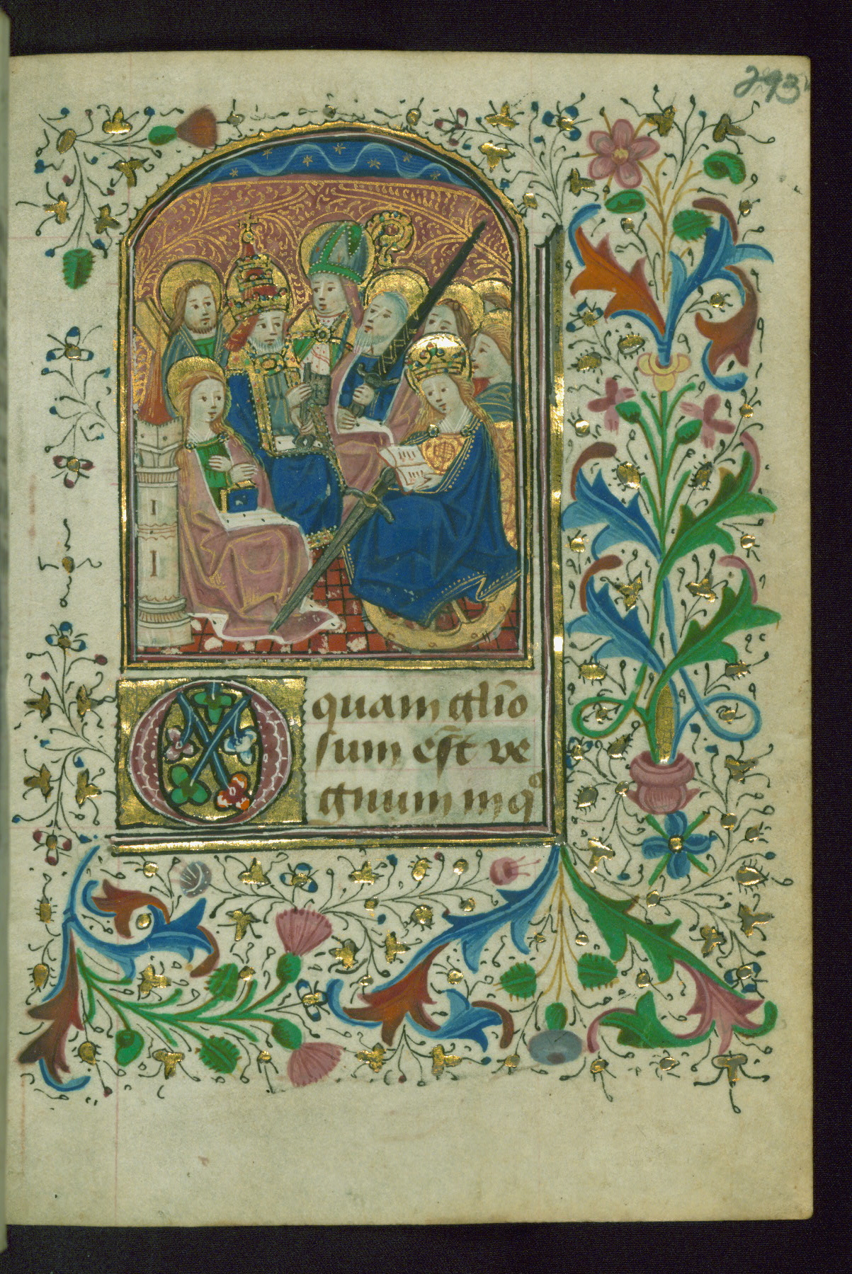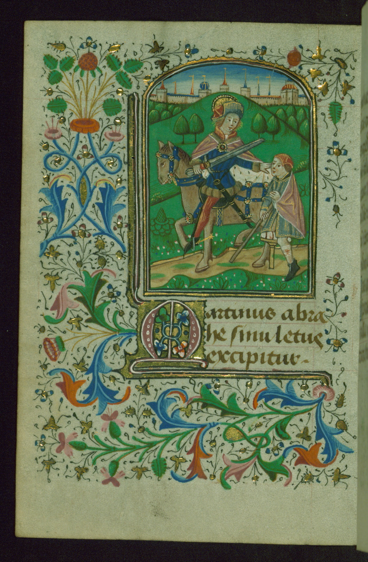 - Contents: Opening illumination missing; suffrages are to: fols. 272r-v: God; fols. 273r-276r: Corpus Christi (rhyming); fols. 276v-278r: Christ, "Salvator mundi"; fols. 278v-279v: the Virgin, "Ave regina celorum"; fols. 280r-281r: St. John the Baptist; fols. 281v-282v: St. Martin; fols. 283r-284v: St. Christopher; fols. 285r-286r: St. Adrian; fols. 288r-289v: St. Barbara; fols. 290r-291r: St. Catherine (rhyming); fols. 291v-292v: St. Margaret; fols. 293r-294v: All saints