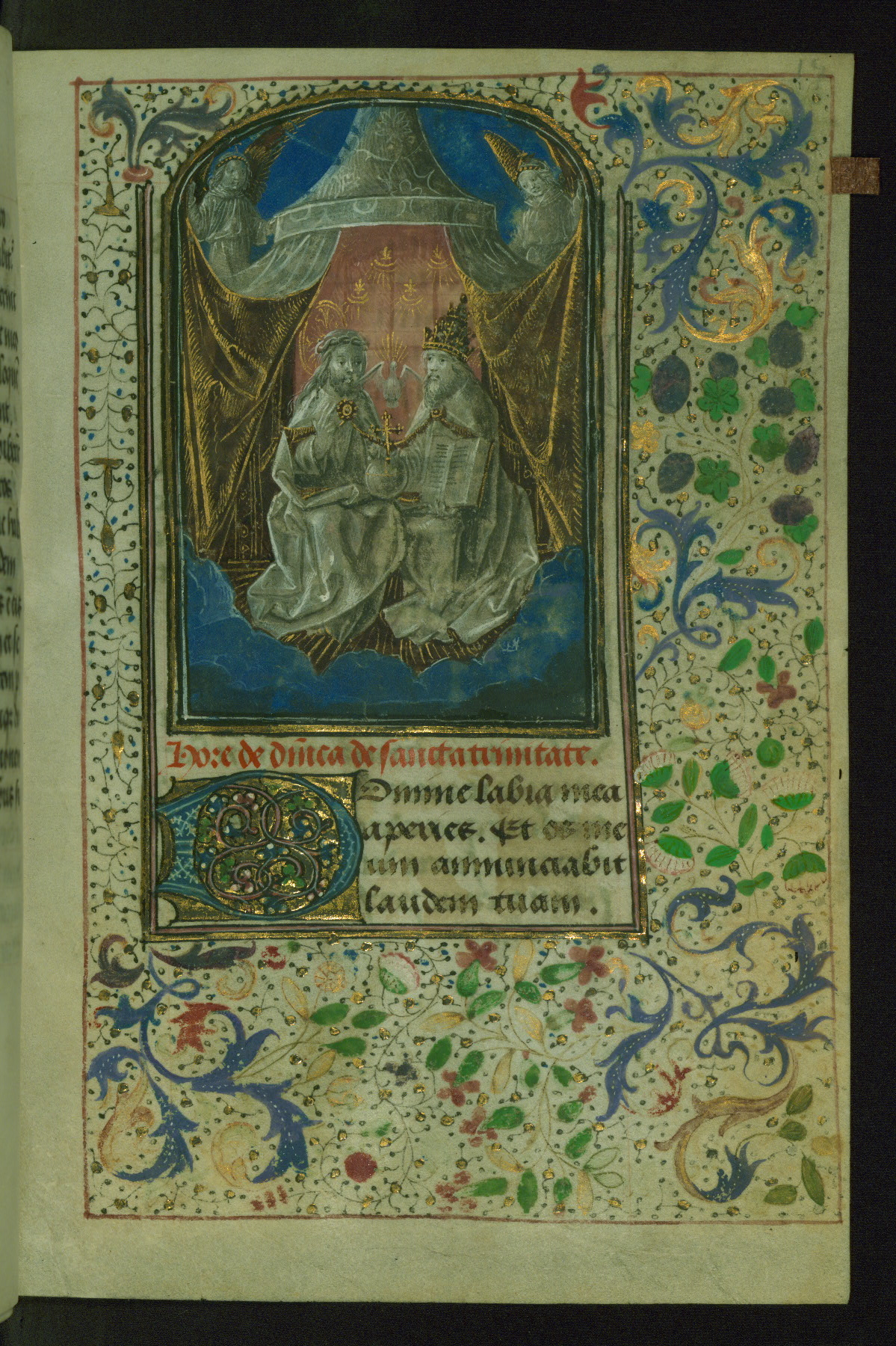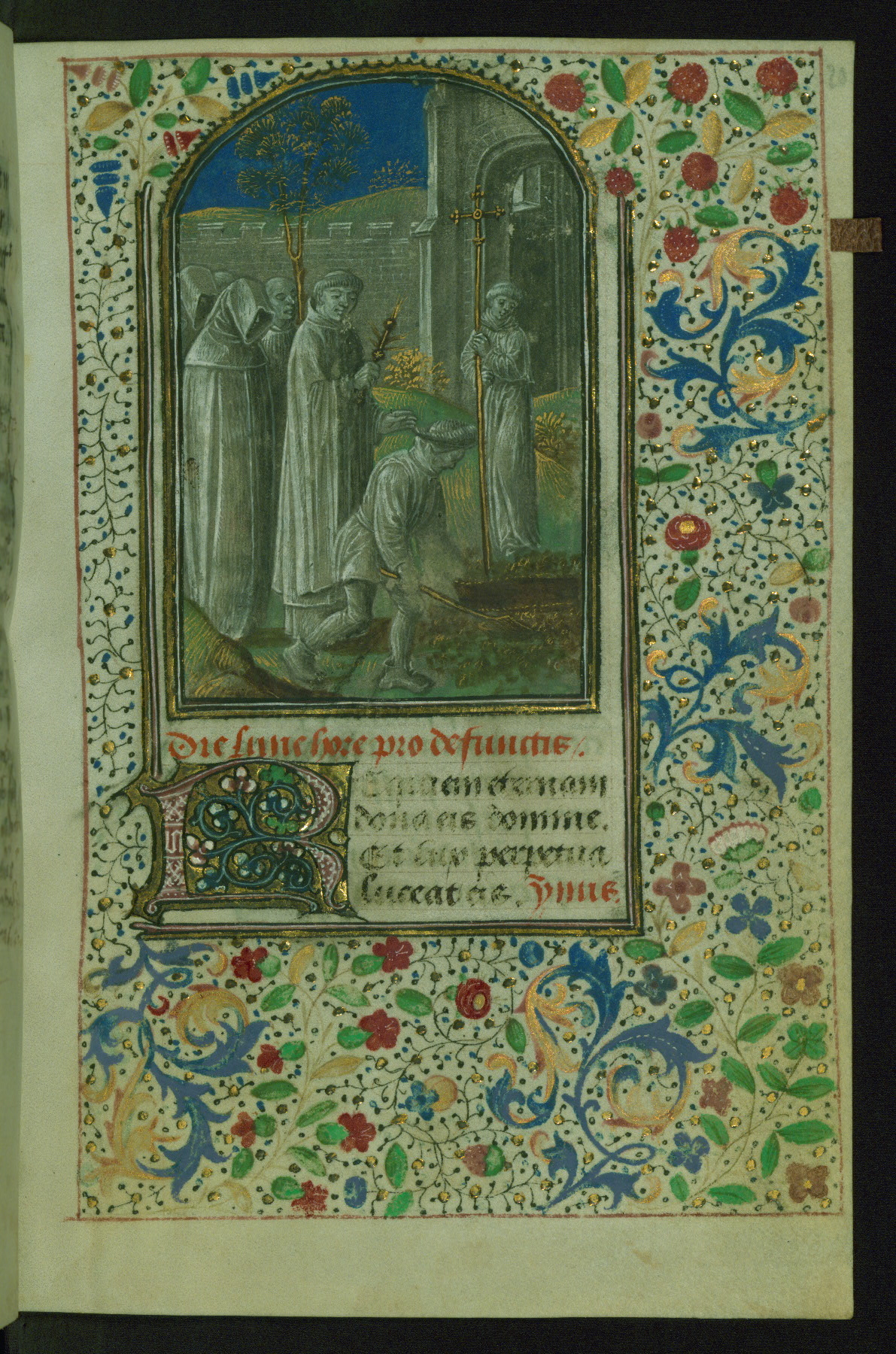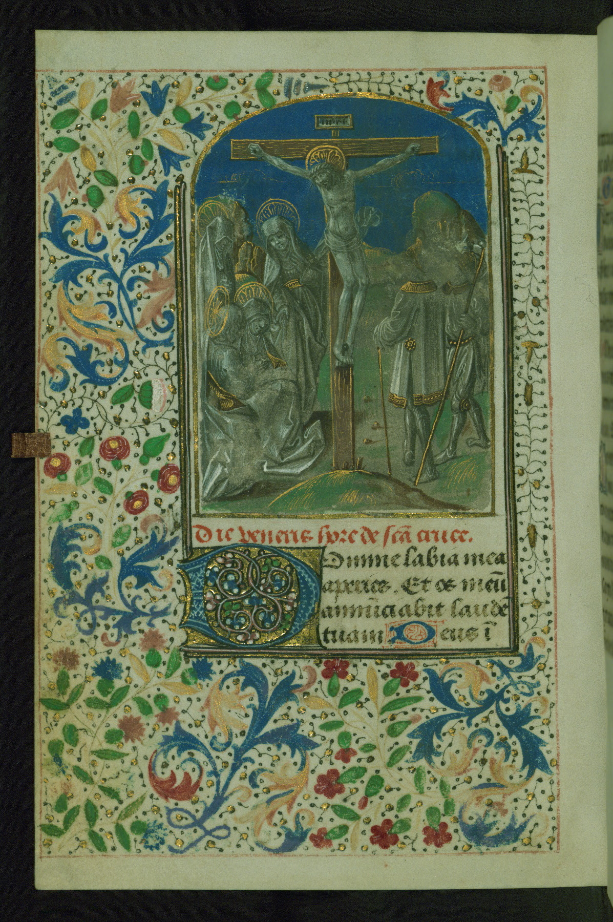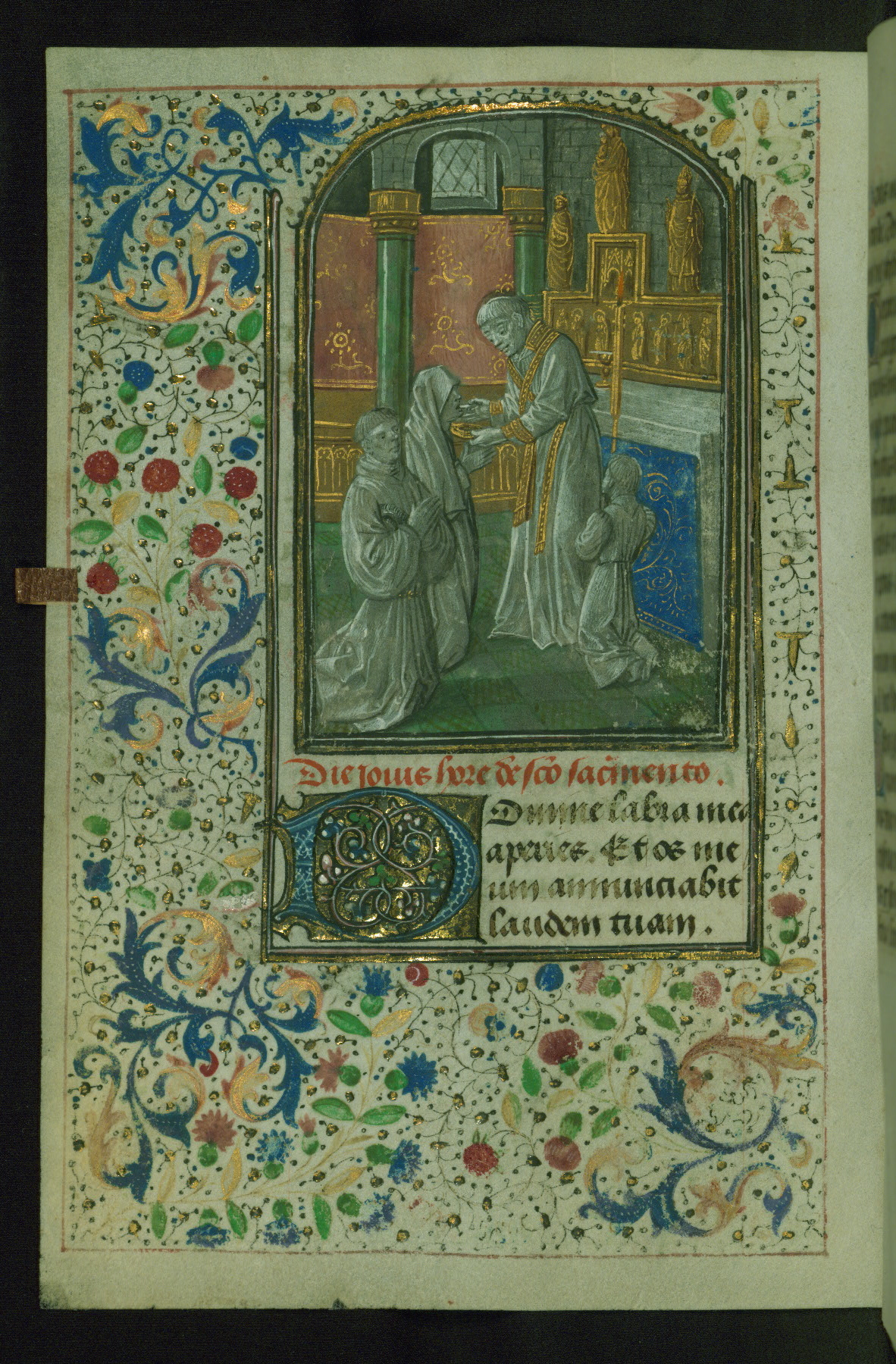Illuminated in the style of the Master of the Black Prayerbook, this manuscript was created ca. 1460-1470. It contains features in the calendar that indicate a destination of Bruges, and aspects of the litany point to the city of Liège. The manuscript is currently misbound, but an attempt has been made to reconstruct the original order of the quires. The full-page miniatures and historiated initials are painted with a mixture of grisaille and colored techniques. There may be a reference to the patron and their family taking communion on fol. 47v.