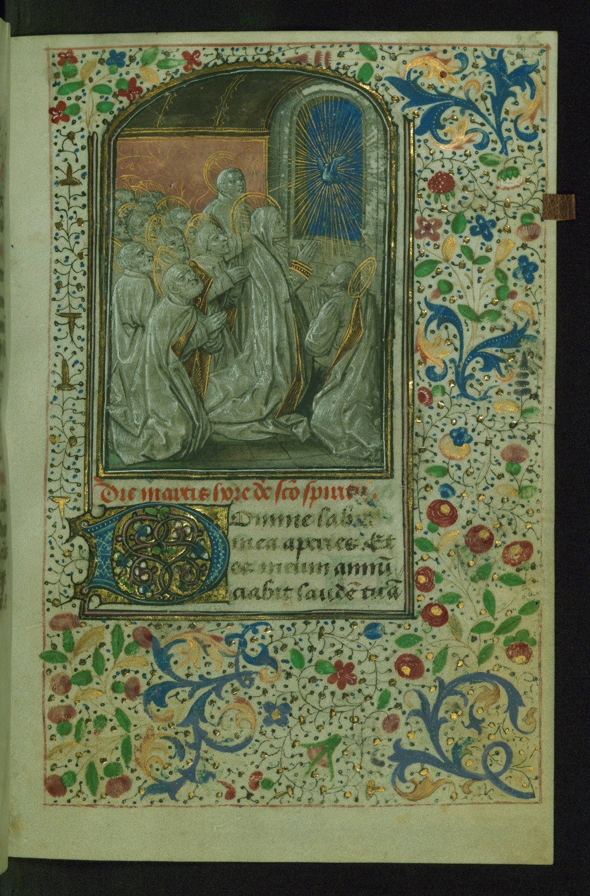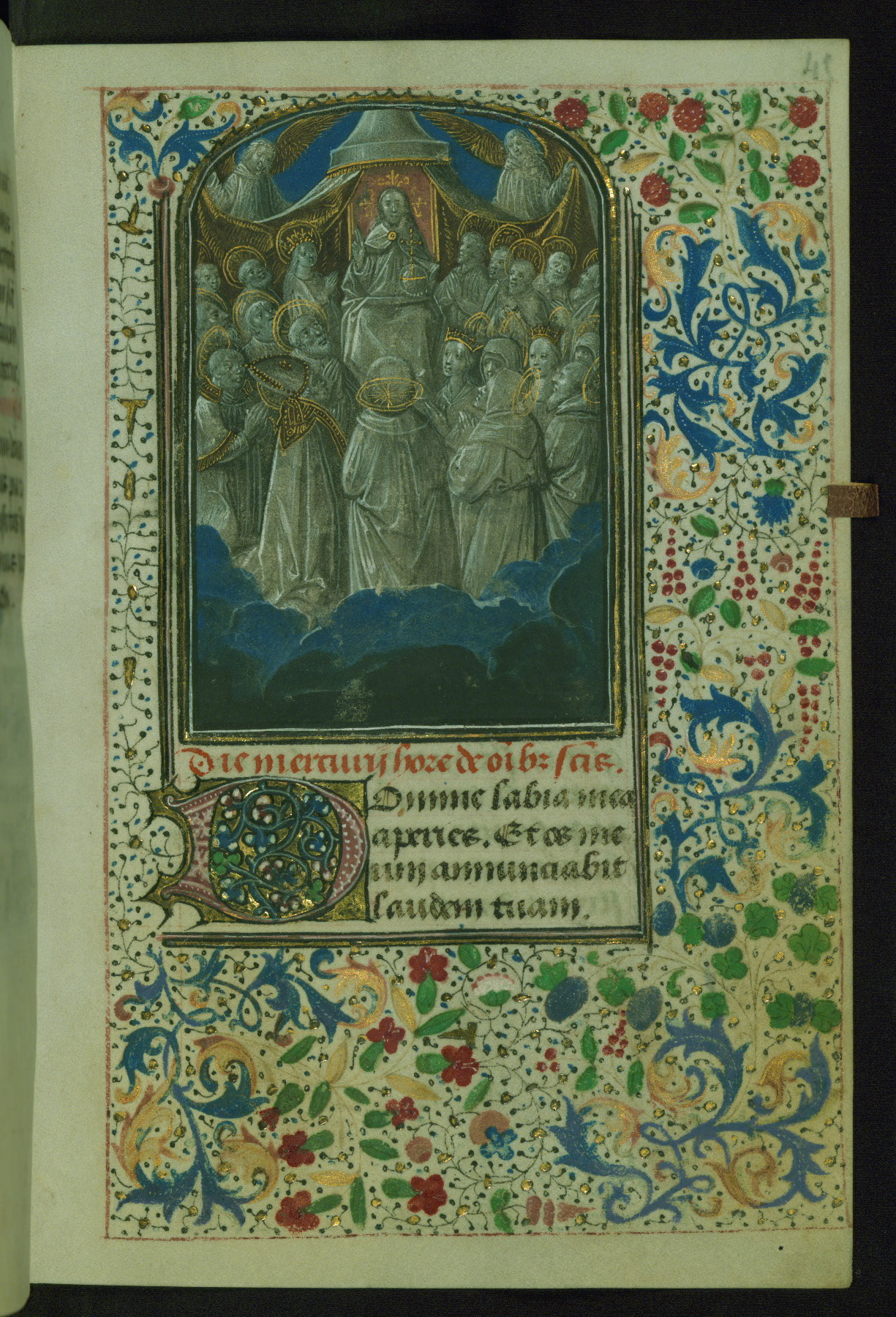- Contents: Fols. 17r-19v: Sunday Hours of the Trinity, with Communion prayer for Holy Sacrament of the Eucharist; fols. 20r-22v: Monday Hours of the Dead; fol. 23r-v and 44r-v: Tuesday Hours of the Holy Spirit; fols. 45r-47r: Wednesday Hours of All Saints (misbound); fols. 47v-50r: Thursday Hours of the Sacrament; fols. 50v-51v and 31r-32r: Friday Hours of the Cross (misbound); fols. 32v-35r: Saturday Hours of the Virgin; prayer to Christ added on fol. 35r at the end of the text