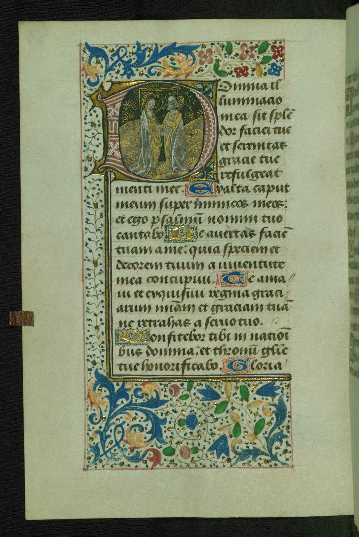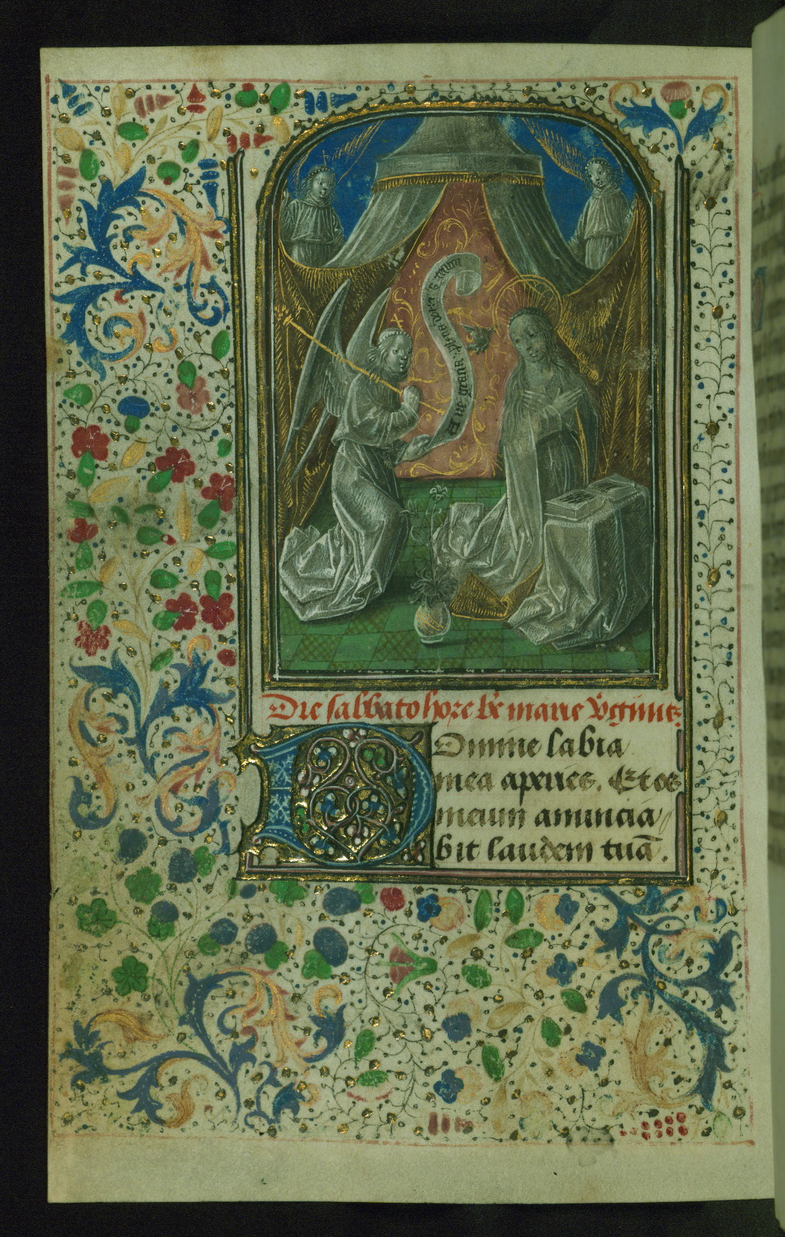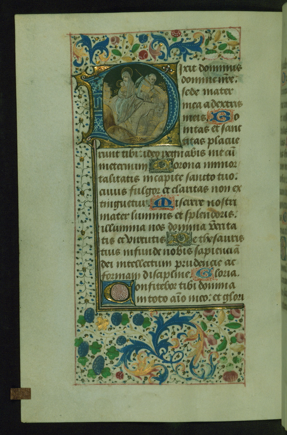 - Decoration note: Nine full-page miniatures with floral borders accompanying them; seven historiated initials; gold, rose, and blue decorated initials for secondary text divisions (2 lines); flourished initials in alternating blue and gold for versals (1 line); rubrics in red; text in black or dark brown ink