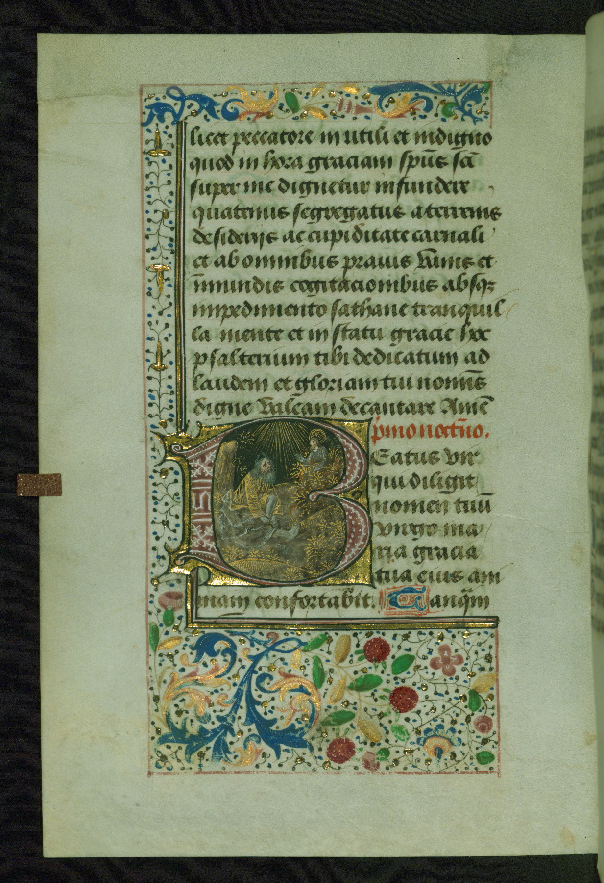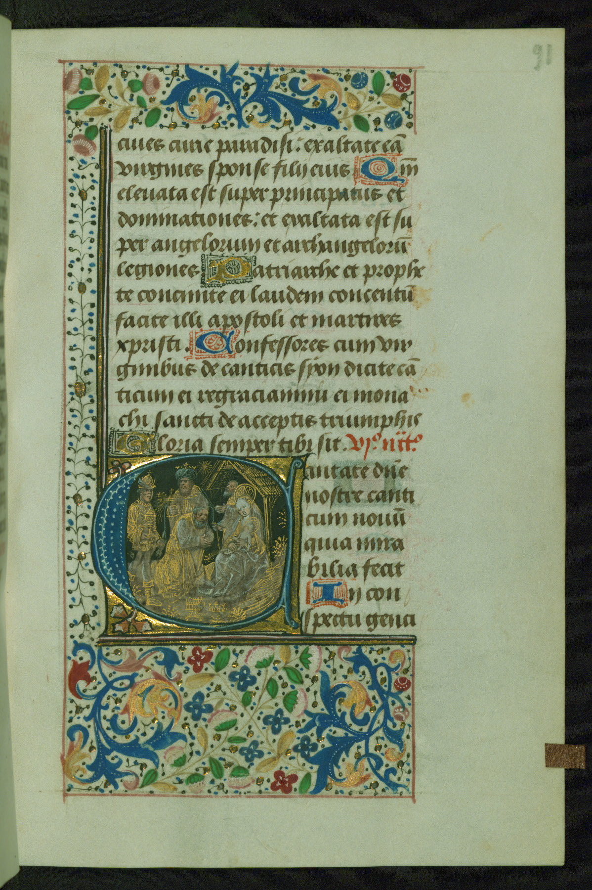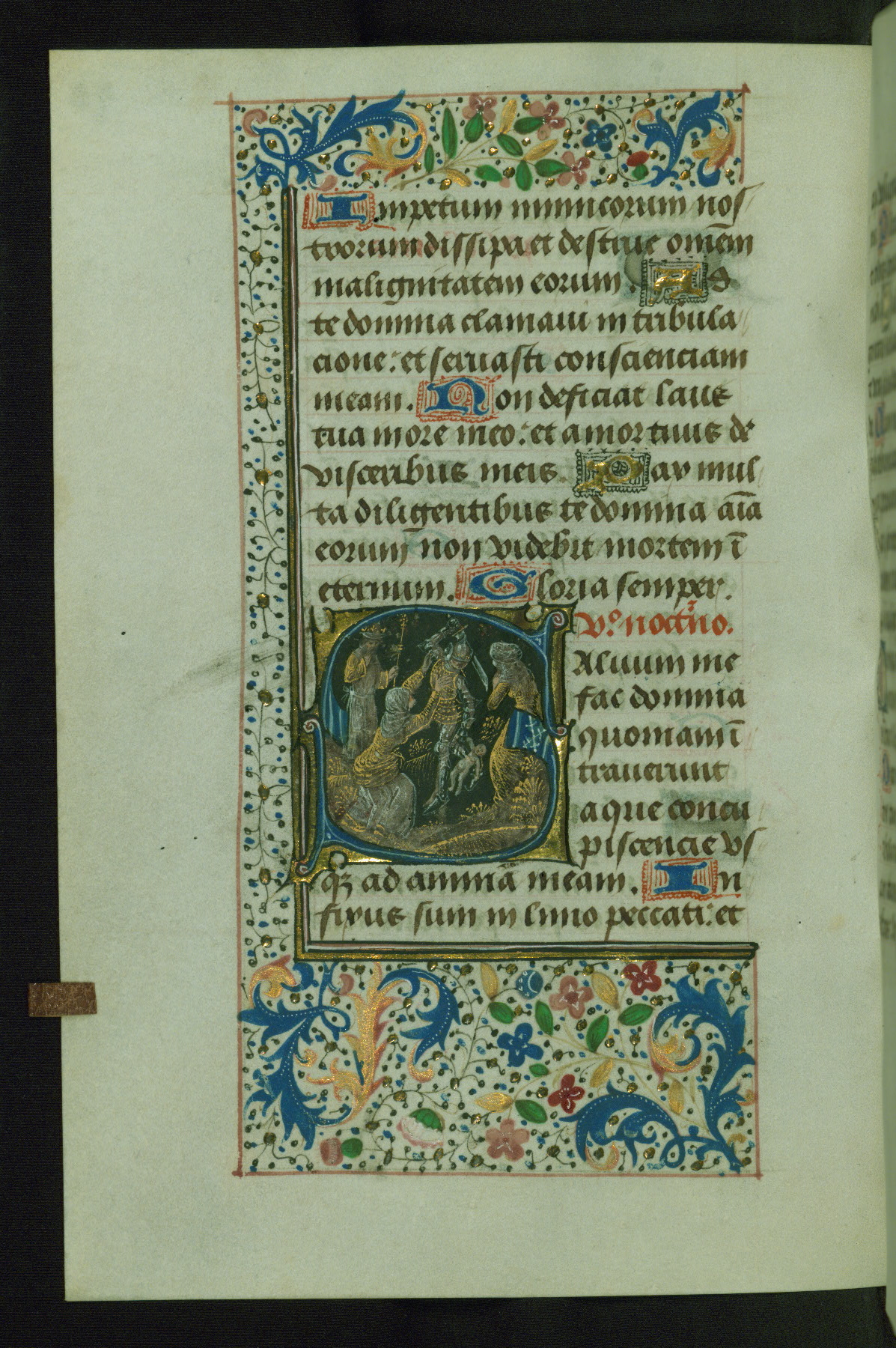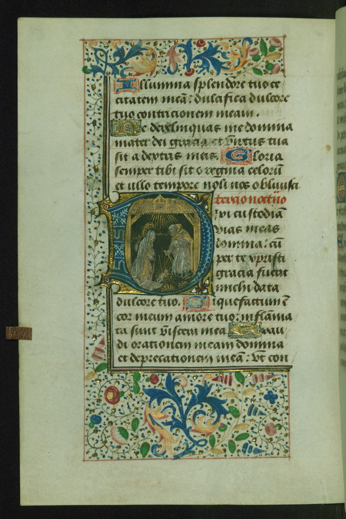 - Decoration note: Nine full-page miniatures with floral borders accompanying them; seven historiated initials; gold, rose, and blue decorated initials for secondary text divisions (2 lines); flourished initials in alternating blue and gold for versals (1 line); rubrics in red; text in black or dark brown ink