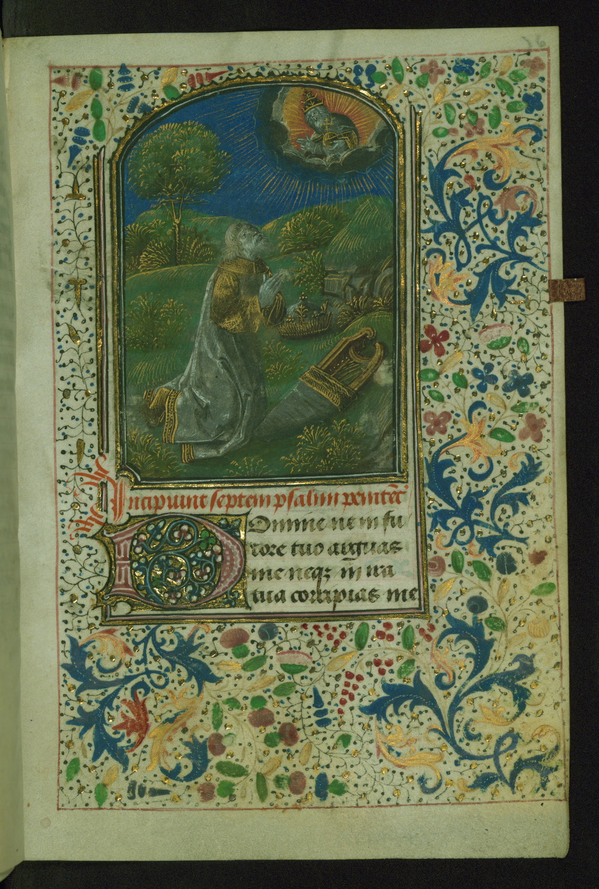- Contents: Fols. 36r-43v and 24r-v: Seven Penitential Psalms; fols. 24v-30v: litany; South Netherlandish destination indicated; sixteen apostles and evangelists, from Peter to Thaddeus; thirteen martyrs (eleven single, one pair) including Adrian, Cornelius, George, Victor, Cosmas and Damian, Christopher, Sebastian, Ghislain, Blasius; twelve confessors including Brictus, Augustine, Jerome, Ambrose, Gregory I, Gilbert, Francis, Jodocus, Julian; eleven virgins/widows/"continentes" including Mary Magdalene, Mary Egyptian, Catherine, Agnes, Anne, Apollonia, Gertrude, Elizabeth; fols. 26v-28r: petitions, invocations, cues; fols. 28r-30r: brief prayers, written consecutively, causes and individuals cited include Church, peace, pastor, king, brethren and sisters, faithful traveling on land and sea, persecutors, slanderers, benefactors, the sick, and the faithful dead