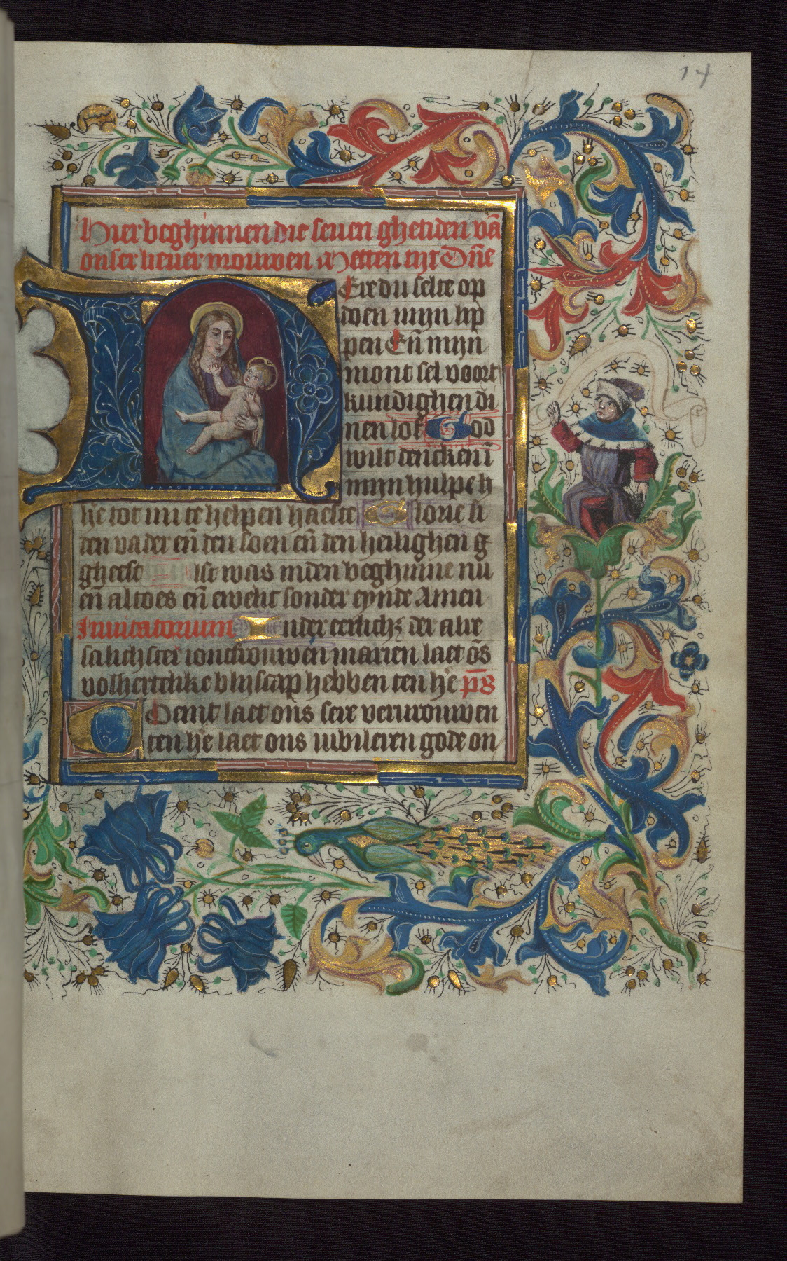 - Title: Initial "H" (Here du selte) with Virgin and Child, and prophet with scroll in margin