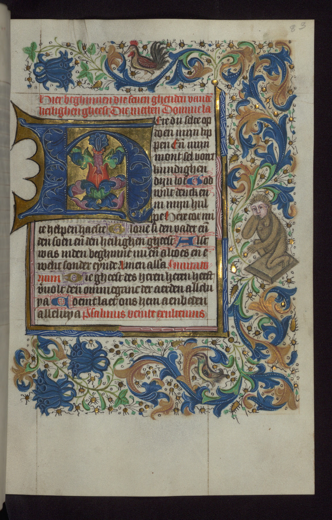 This book of hours was created in the Netherlands in the fifteenth century. Written entirely in Dutch, its calendar is for the use of Utrecht. However, it was probably made in Haarlem, which produced books of hours with this kind of border decoration. Its folios are highly finished, and it is richly illuminated throughout with sprouting foliage, occasionally inhabited by people, animals, and grotesques. Large decorative initials mark the main divisions in the text, the first of which is historiated with an image of the Virgin and Child. Especially notable is the fine quality and abundance of its burnished gold, found in the initials and vegetation on nearly every page of the manuscript.