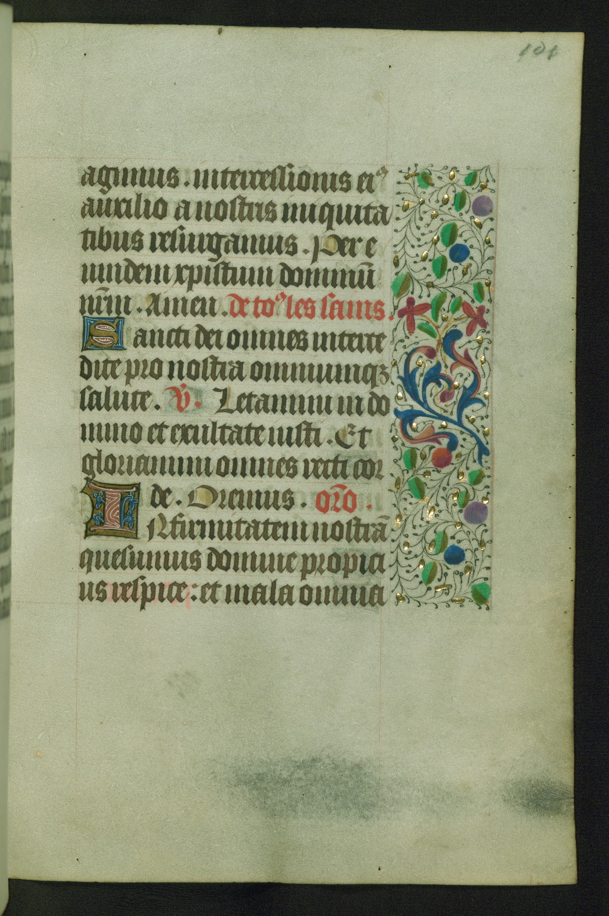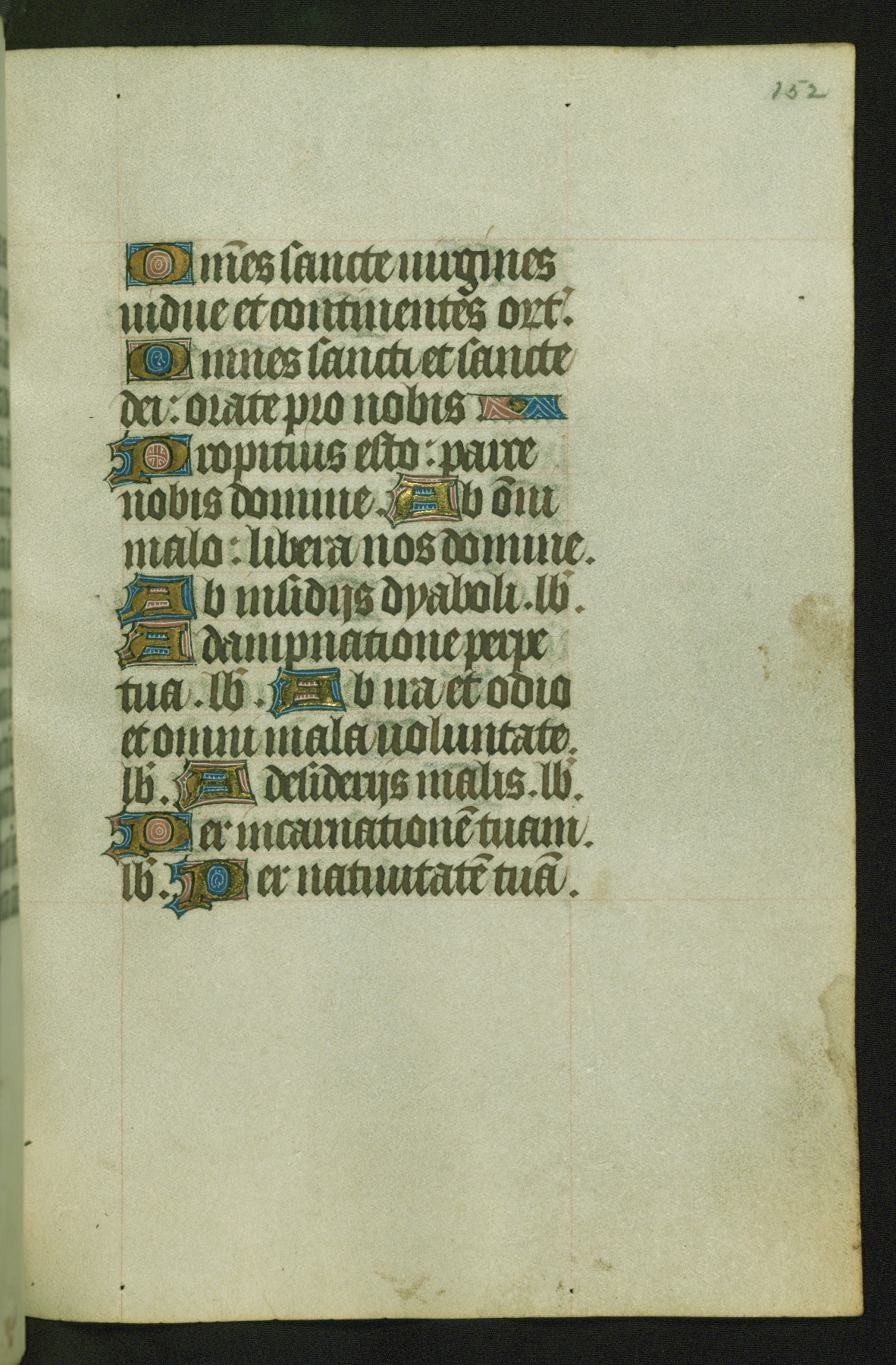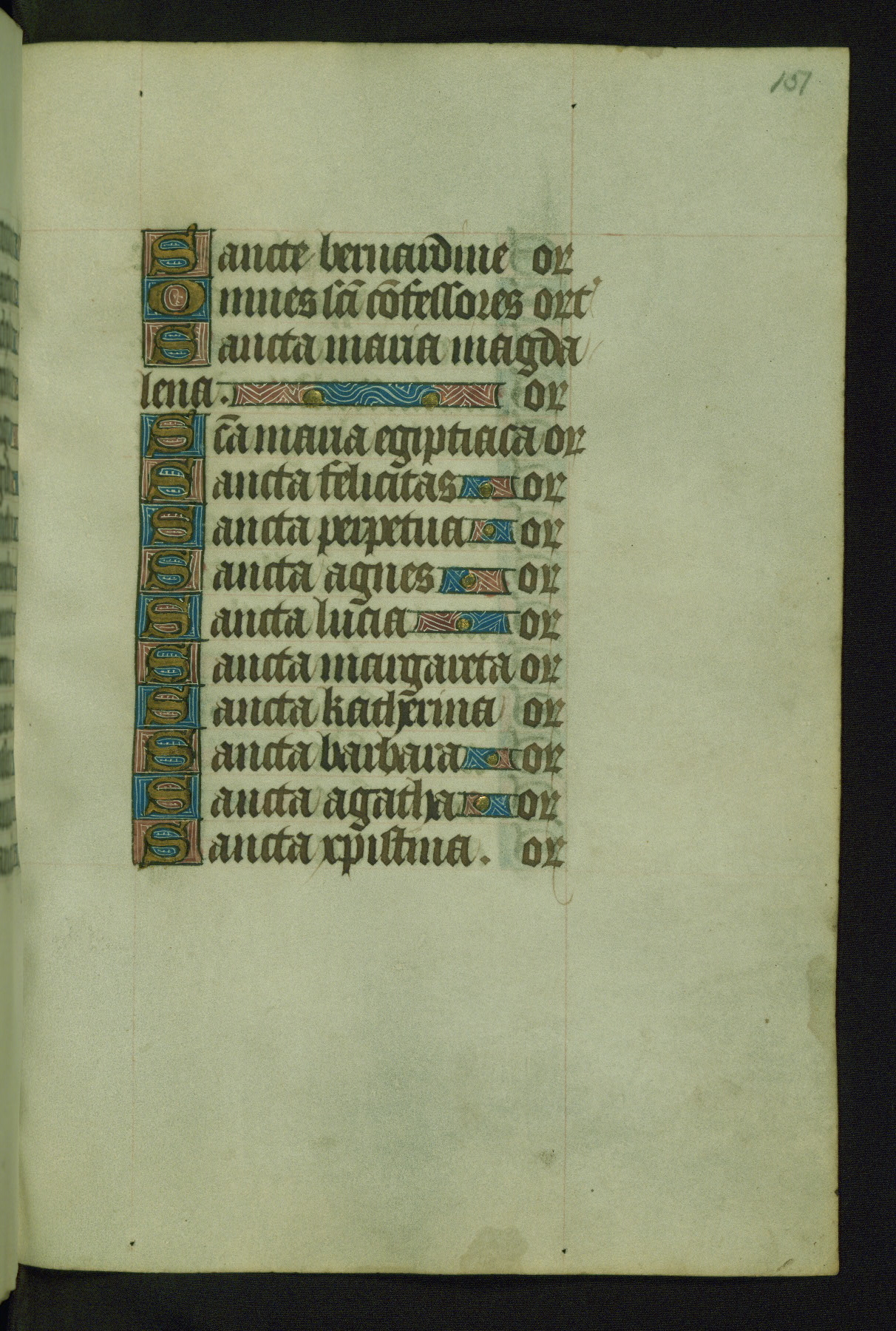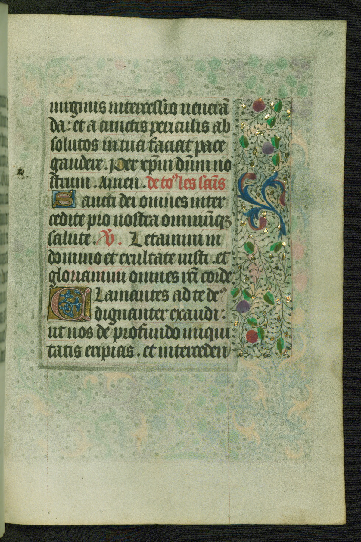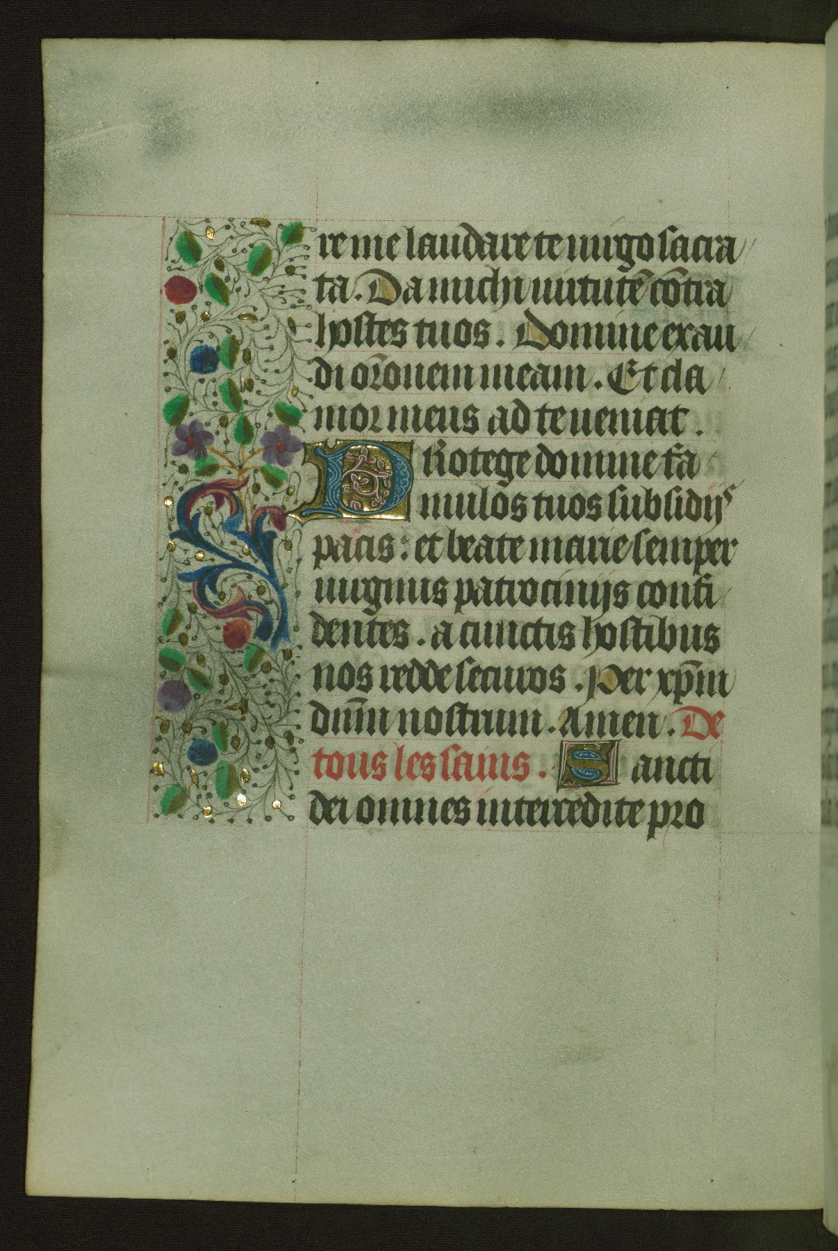 Completed for use of Cambrai, ca. 1450-60, this sizable Book of Hours is comprised of 265 folios, with two full-page miniatures (inserted) and thirteen historiated initials. Perhaps the focus on prayer rather than decoration was due to the presumed first owner, who was established in Mons and was associated with a Benedictine nunnery (dedicated to Sainte Waudry). Some Franciscan sympathies are indicated in the litany (fol. 147v), evinced by a citation of Bernardinus of Siena, Francis, and Clara.