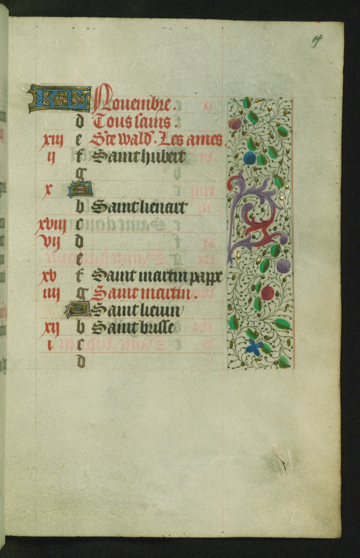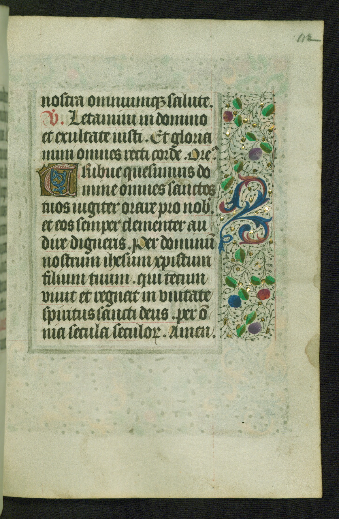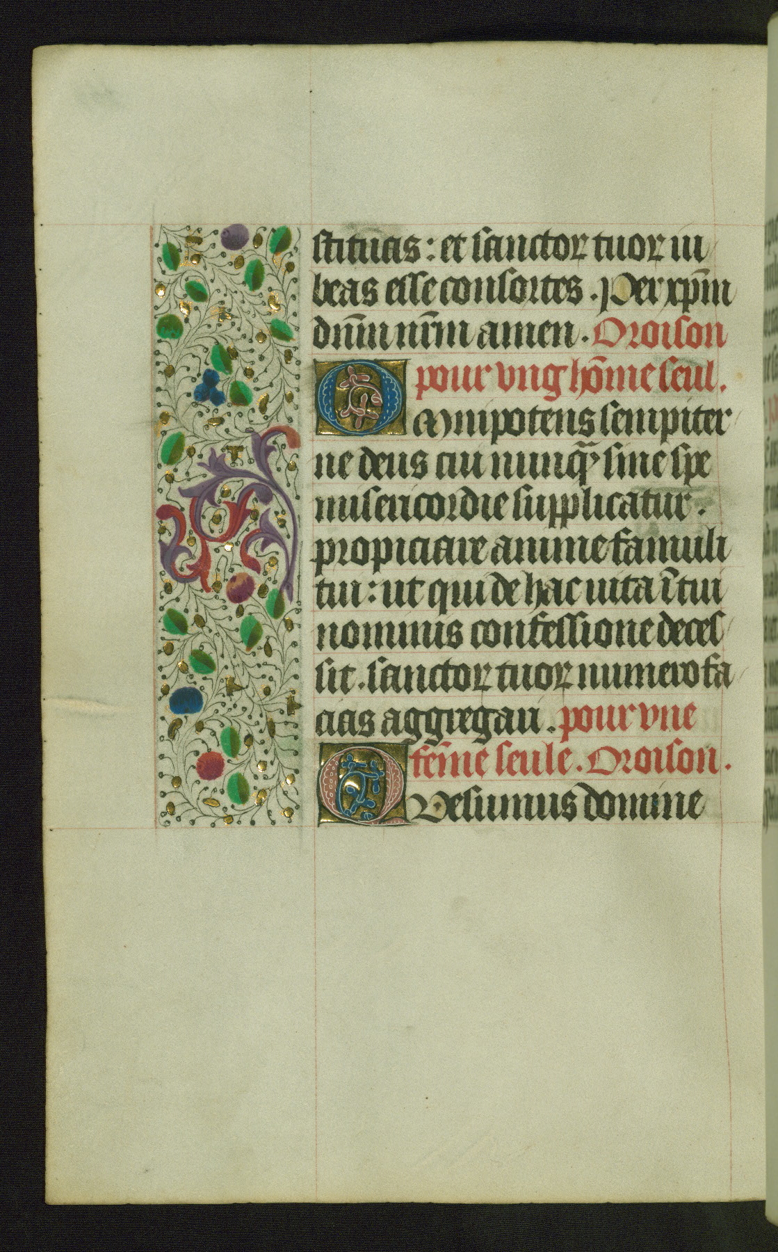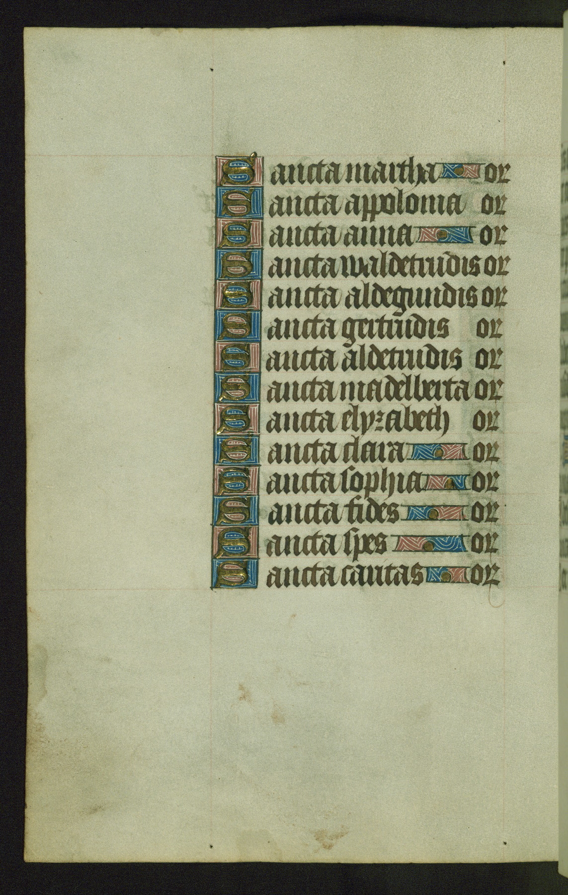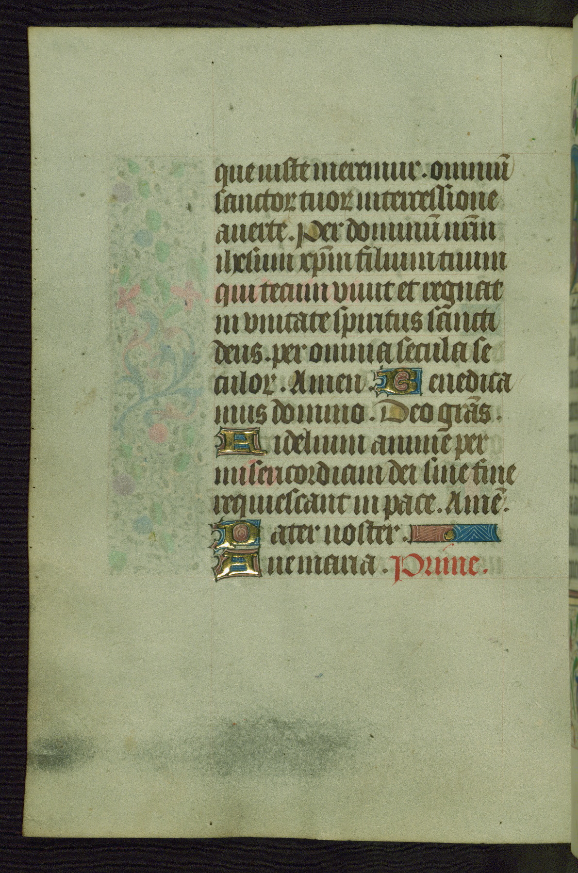 Completed for use of Cambrai, ca. 1450-60, this sizable Book of Hours is comprised of 265 folios, with two full-page miniatures (inserted) and thirteen historiated initials. Perhaps the focus on prayer rather than decoration was due to the presumed first owner, who was established in Mons and was associated with a Benedictine nunnery (dedicated to Sainte Waudry). Some Franciscan sympathies are indicated in the litany (fol. 147v), evinced by a citation of Bernardinus of Siena, Francis, and Clara.