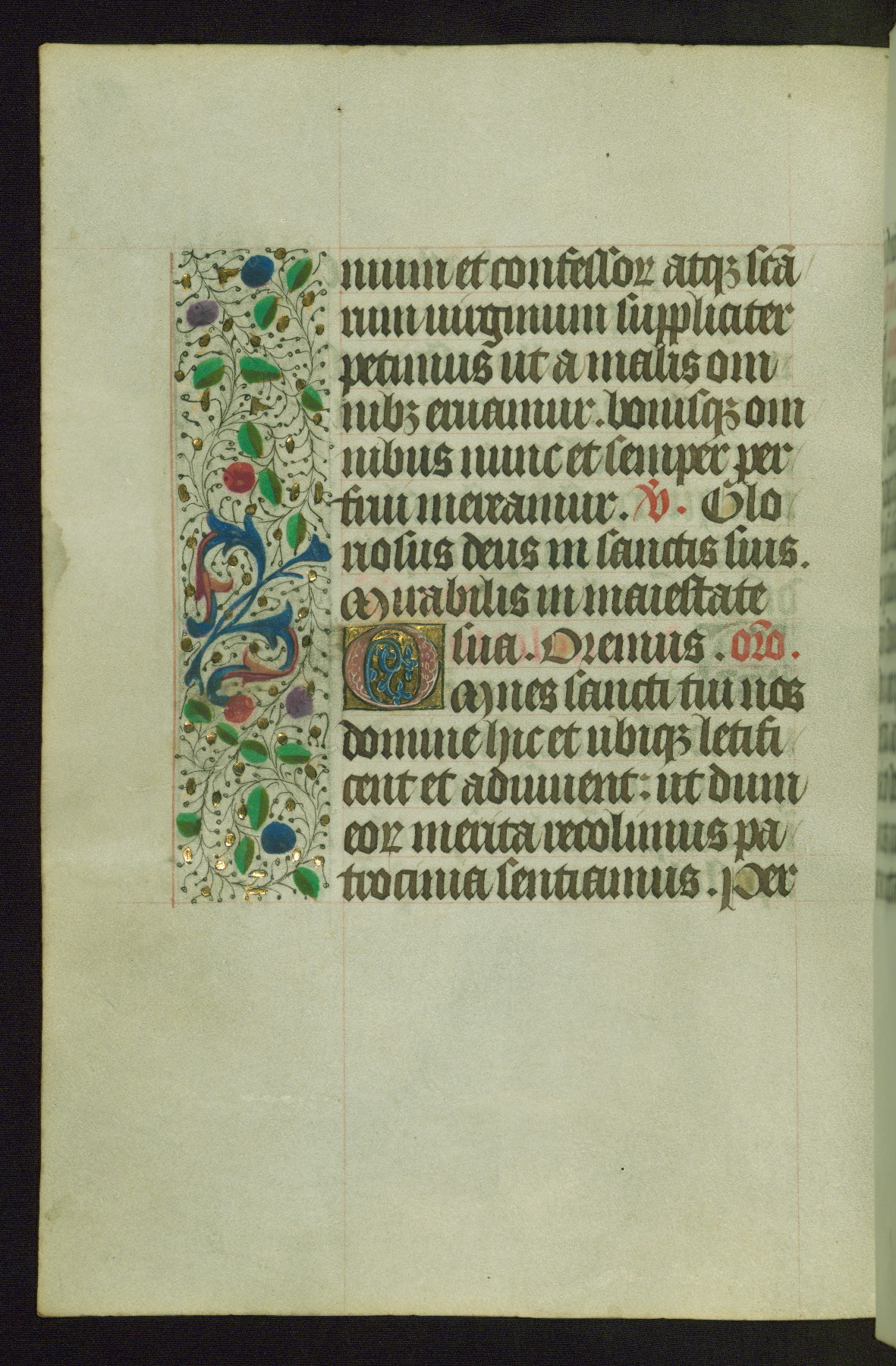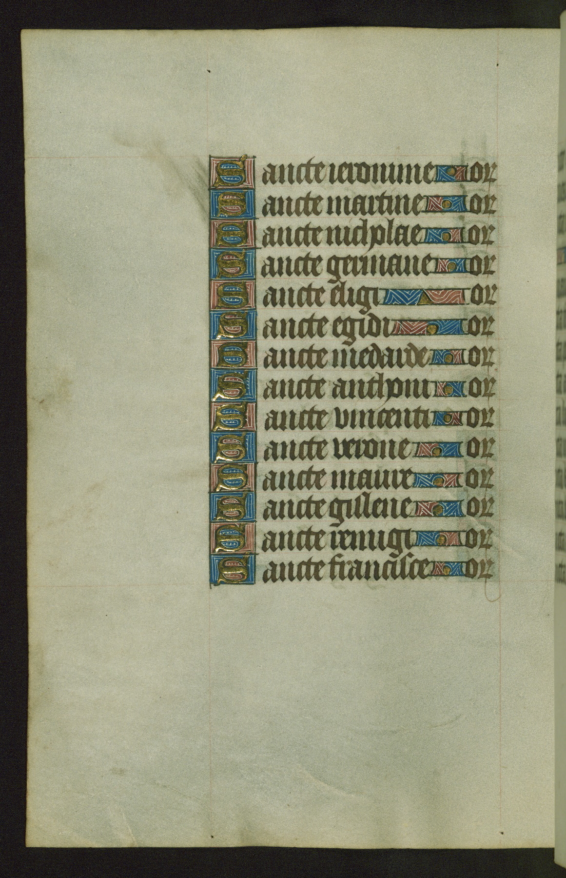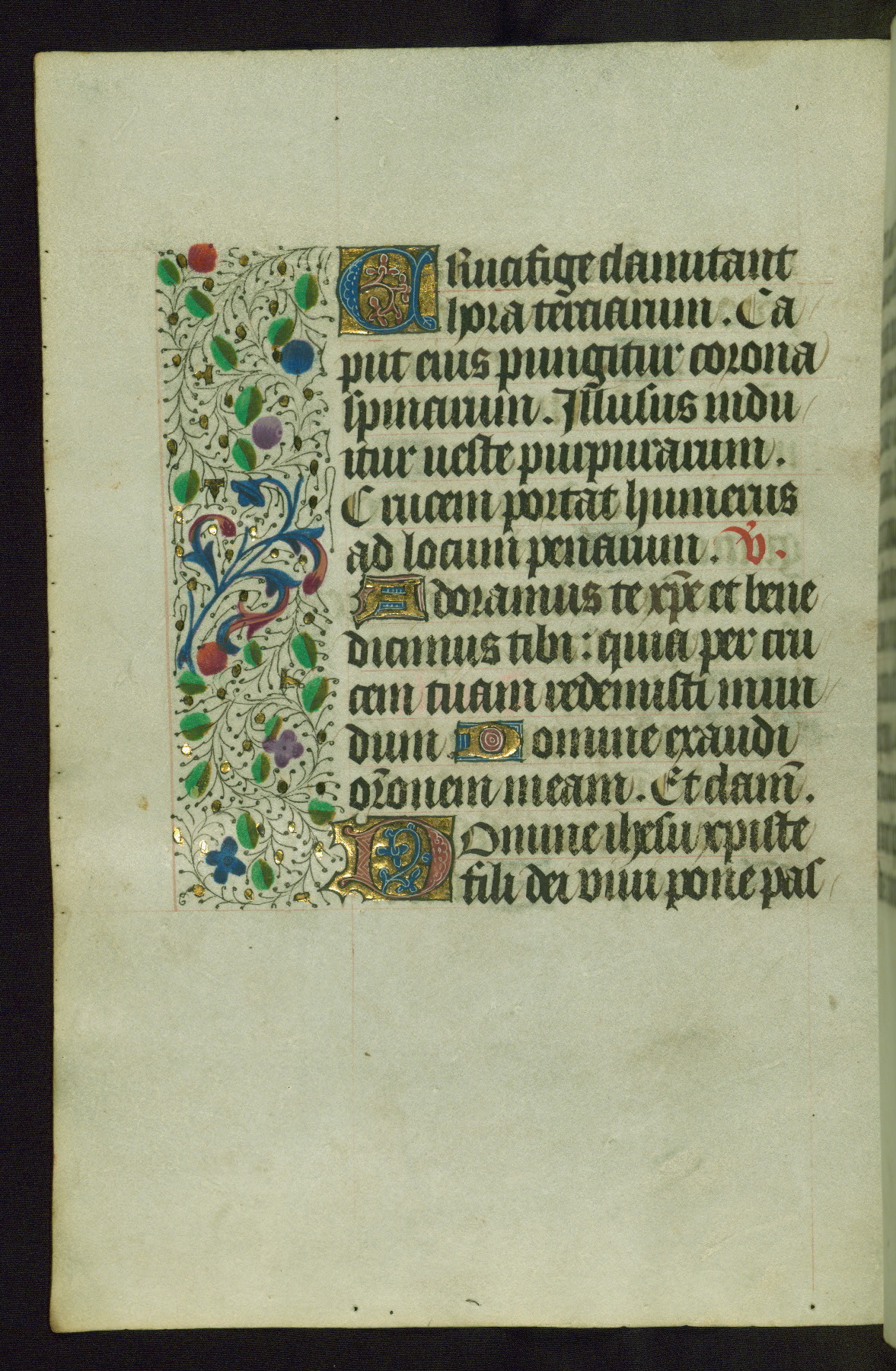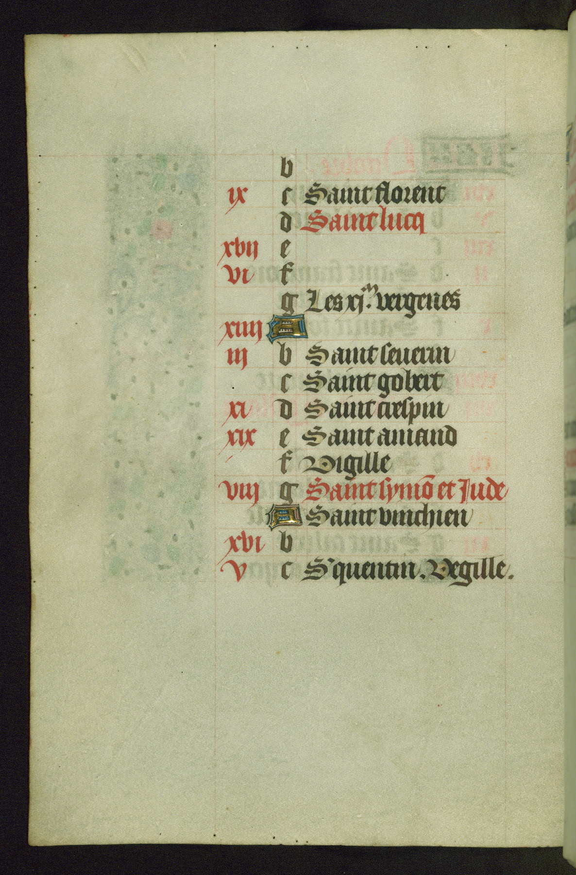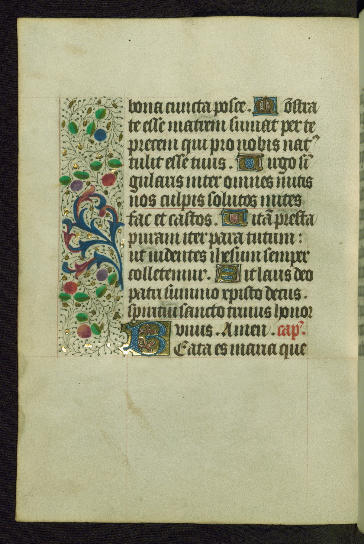 Completed for use of Cambrai, ca. 1450-60, this sizable Book of Hours is comprised of 265 folios, with two full-page miniatures (inserted) and thirteen historiated initials. Perhaps the focus on prayer rather than decoration was due to the presumed first owner, who was established in Mons and was associated with a Benedictine nunnery (dedicated to Sainte Waudry). Some Franciscan sympathies are indicated in the litany (fol. 147v), evinced by a citation of Bernardinus of Siena, Francis, and Clara.