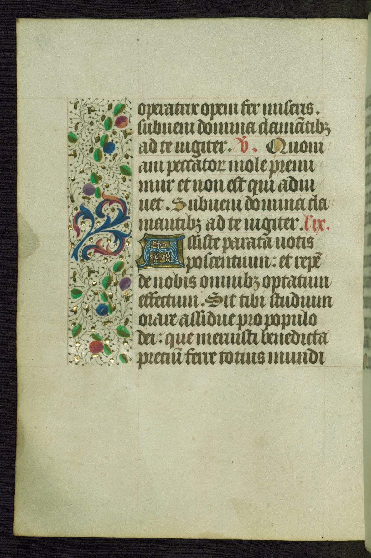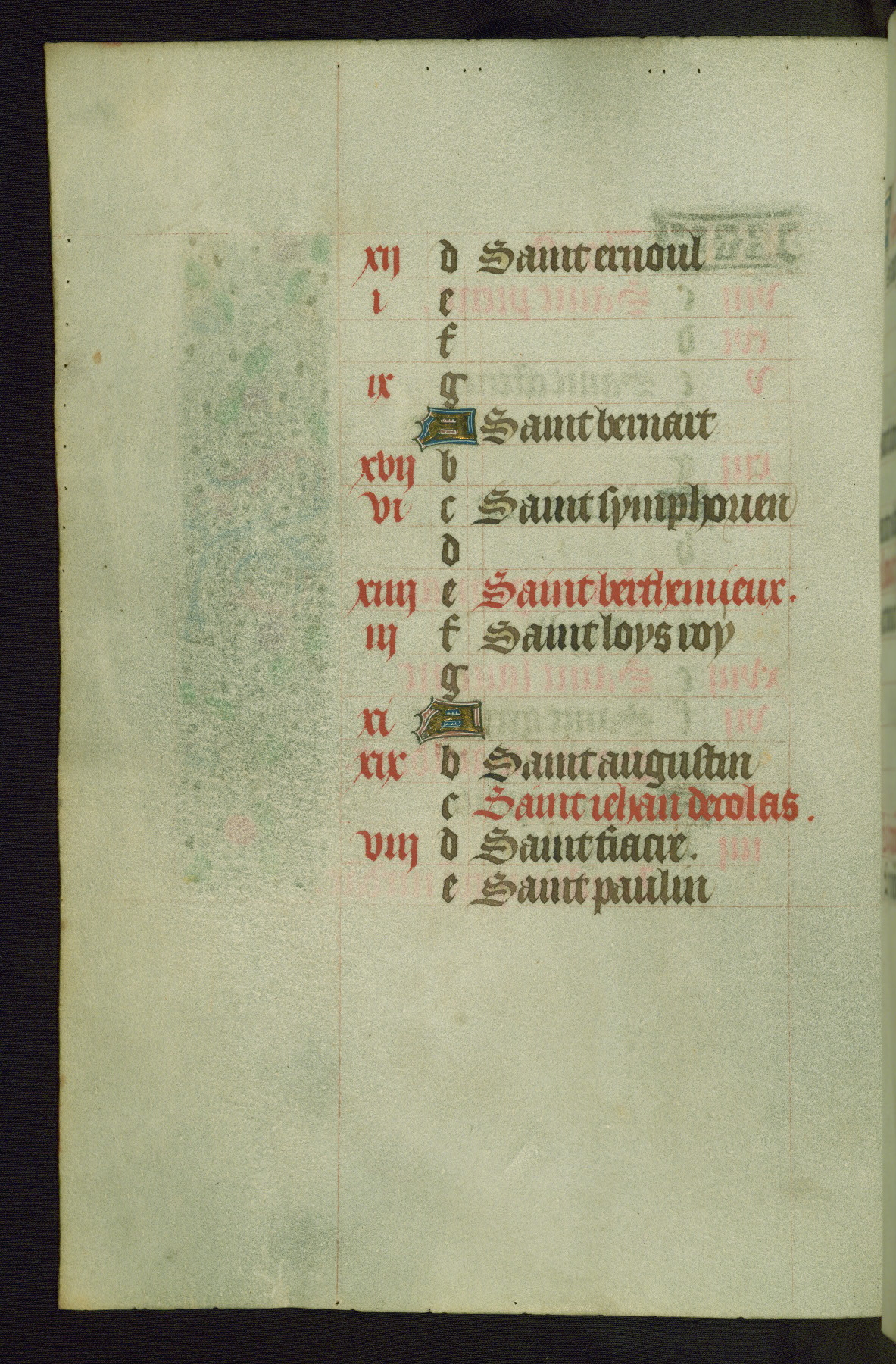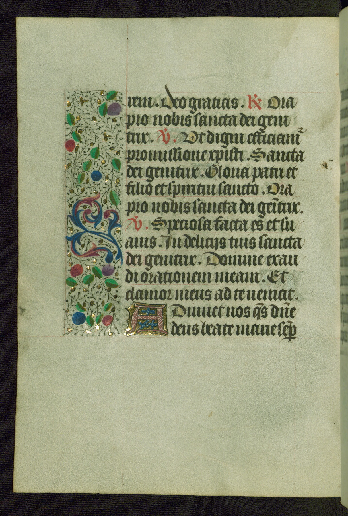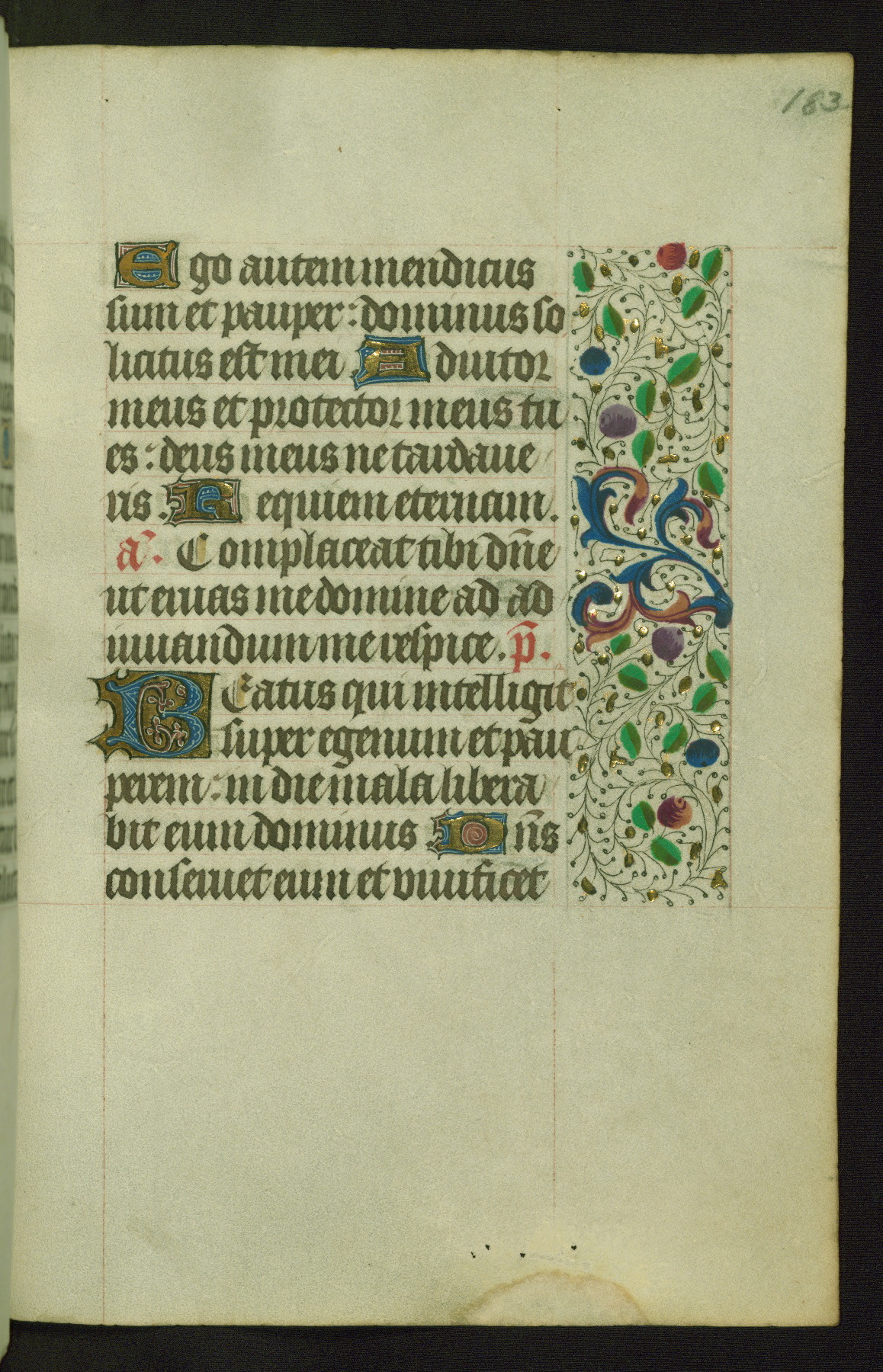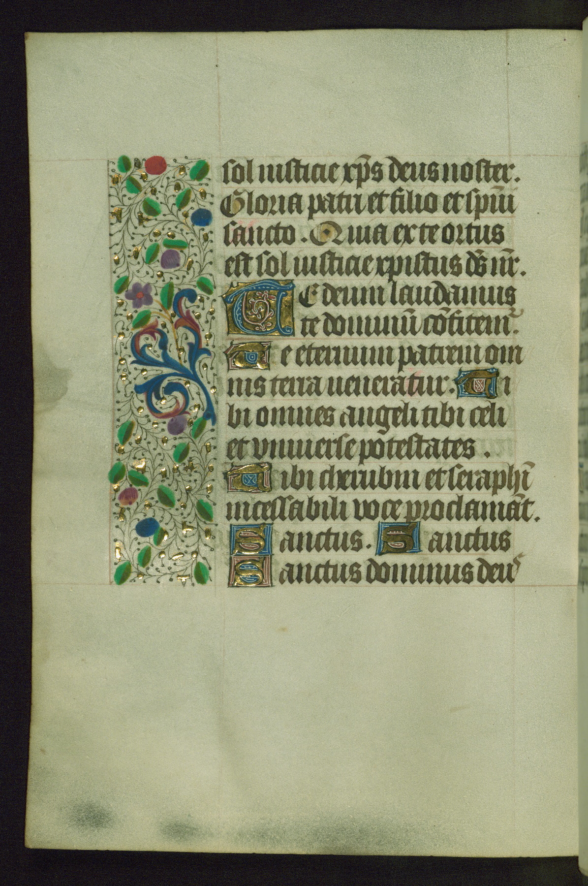 Completed for use of Cambrai, ca. 1450-60, this sizable Book of Hours is comprised of 265 folios, with two full-page miniatures (inserted) and thirteen historiated initials. Perhaps the focus on prayer rather than decoration was due to the presumed first owner, who was established in Mons and was associated with a Benedictine nunnery (dedicated to Sainte Waudry). Some Franciscan sympathies are indicated in the litany (fol. 147v), evinced by a citation of Bernardinus of Siena, Francis, and Clara.