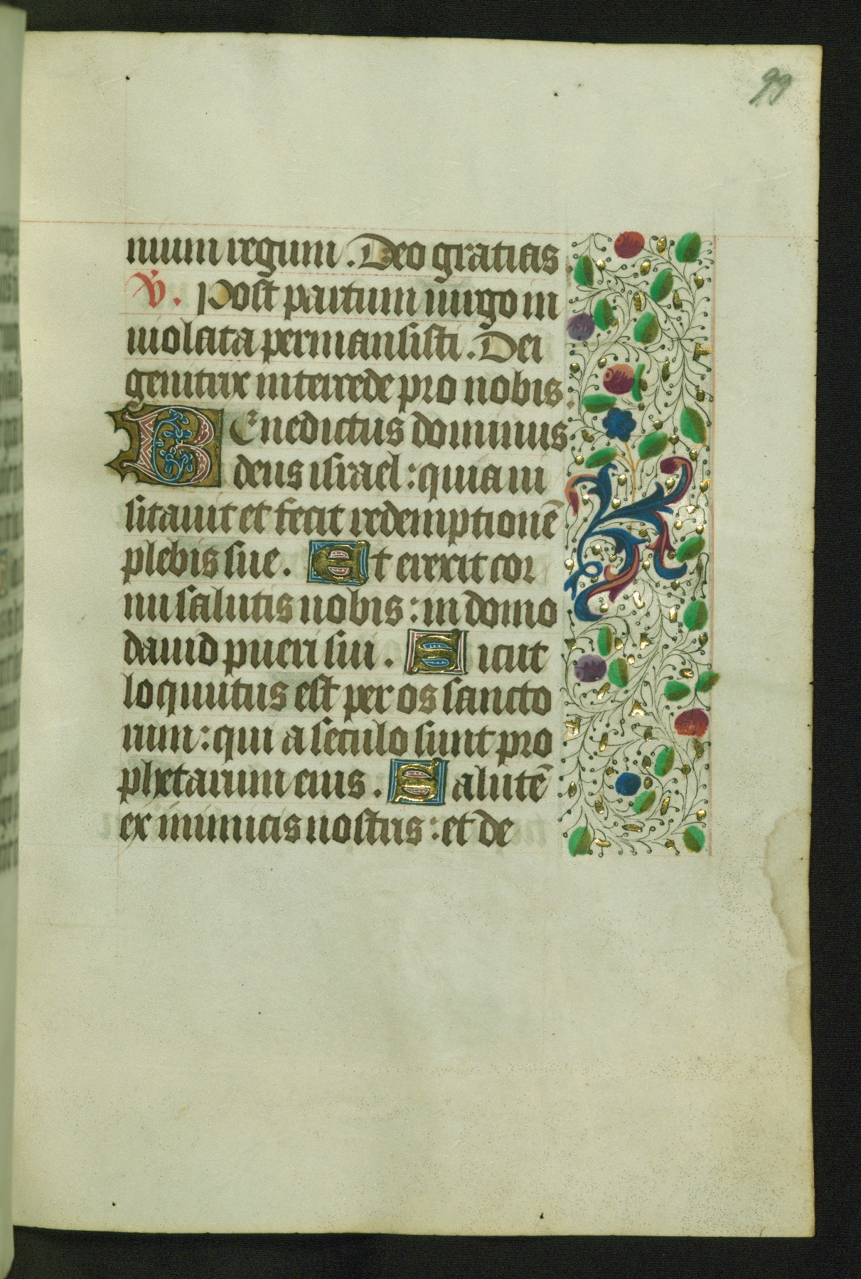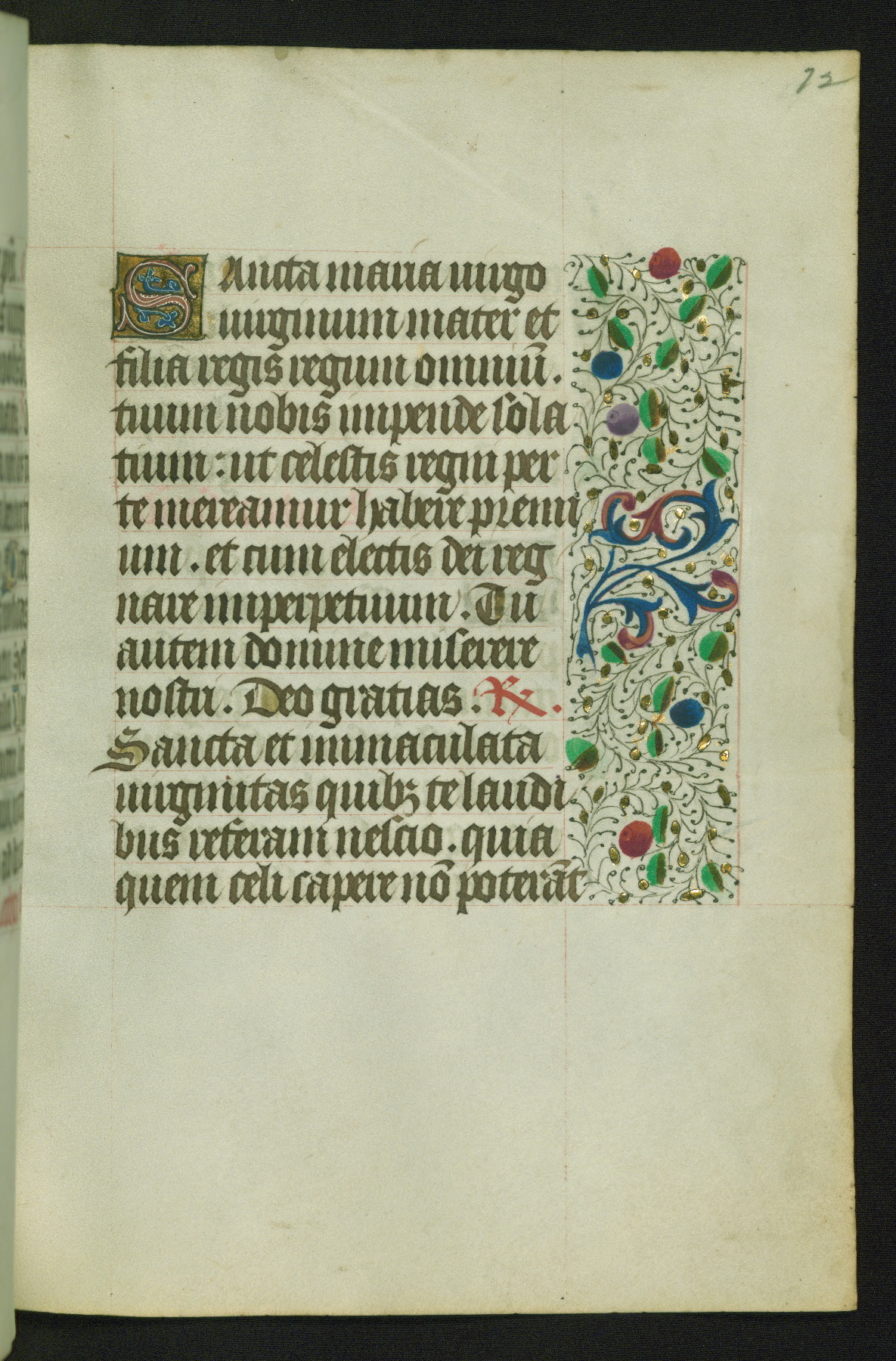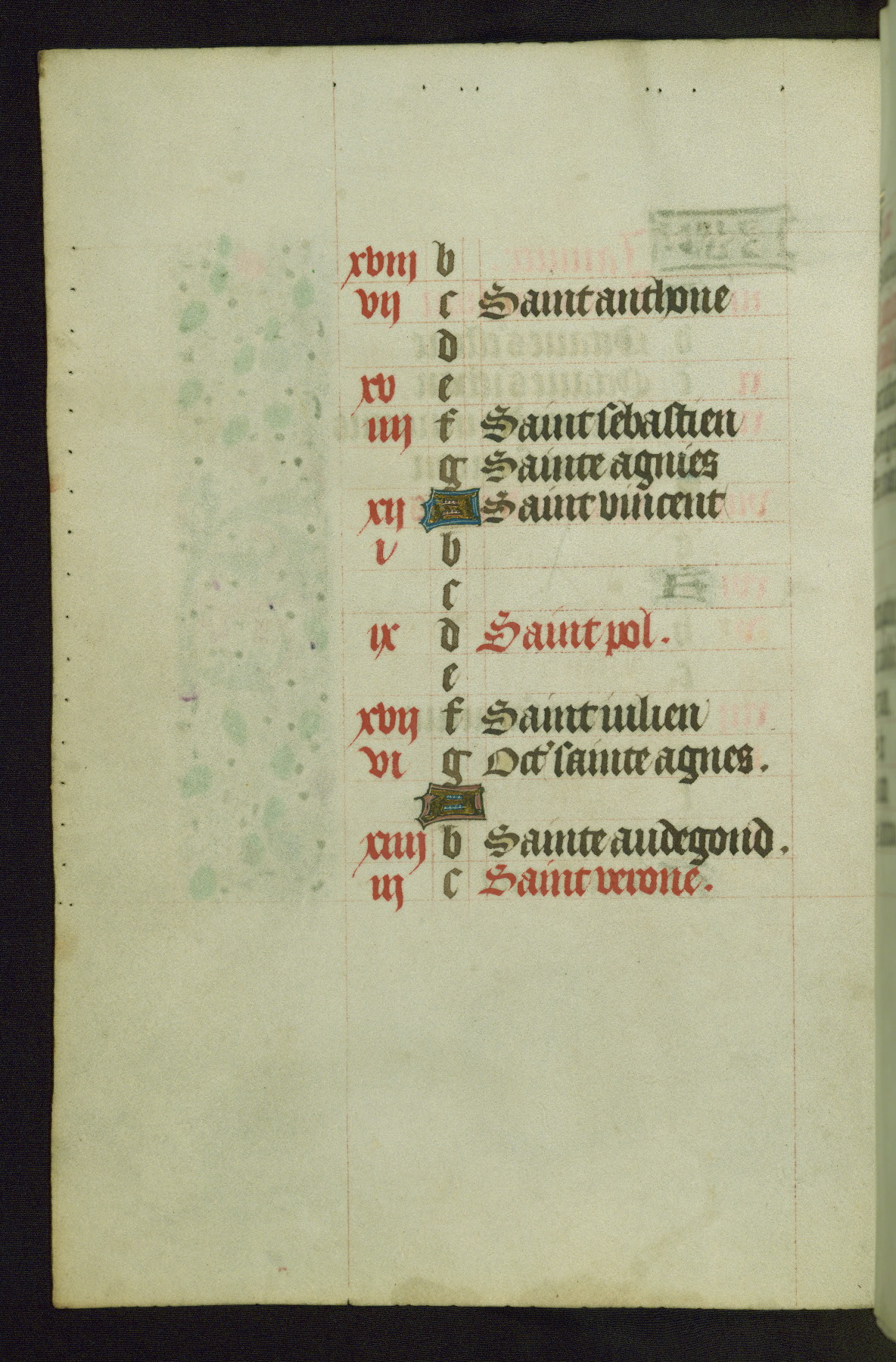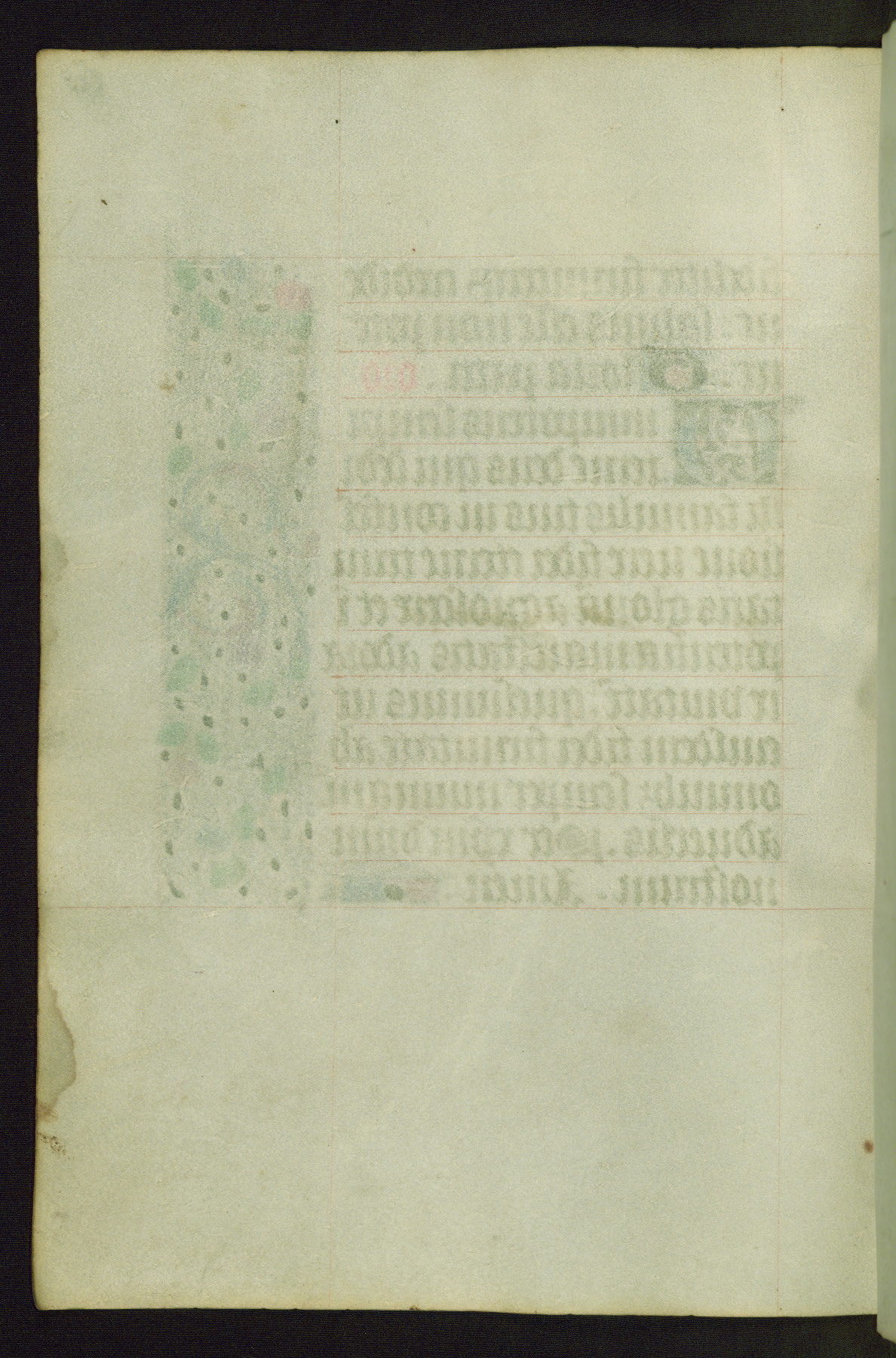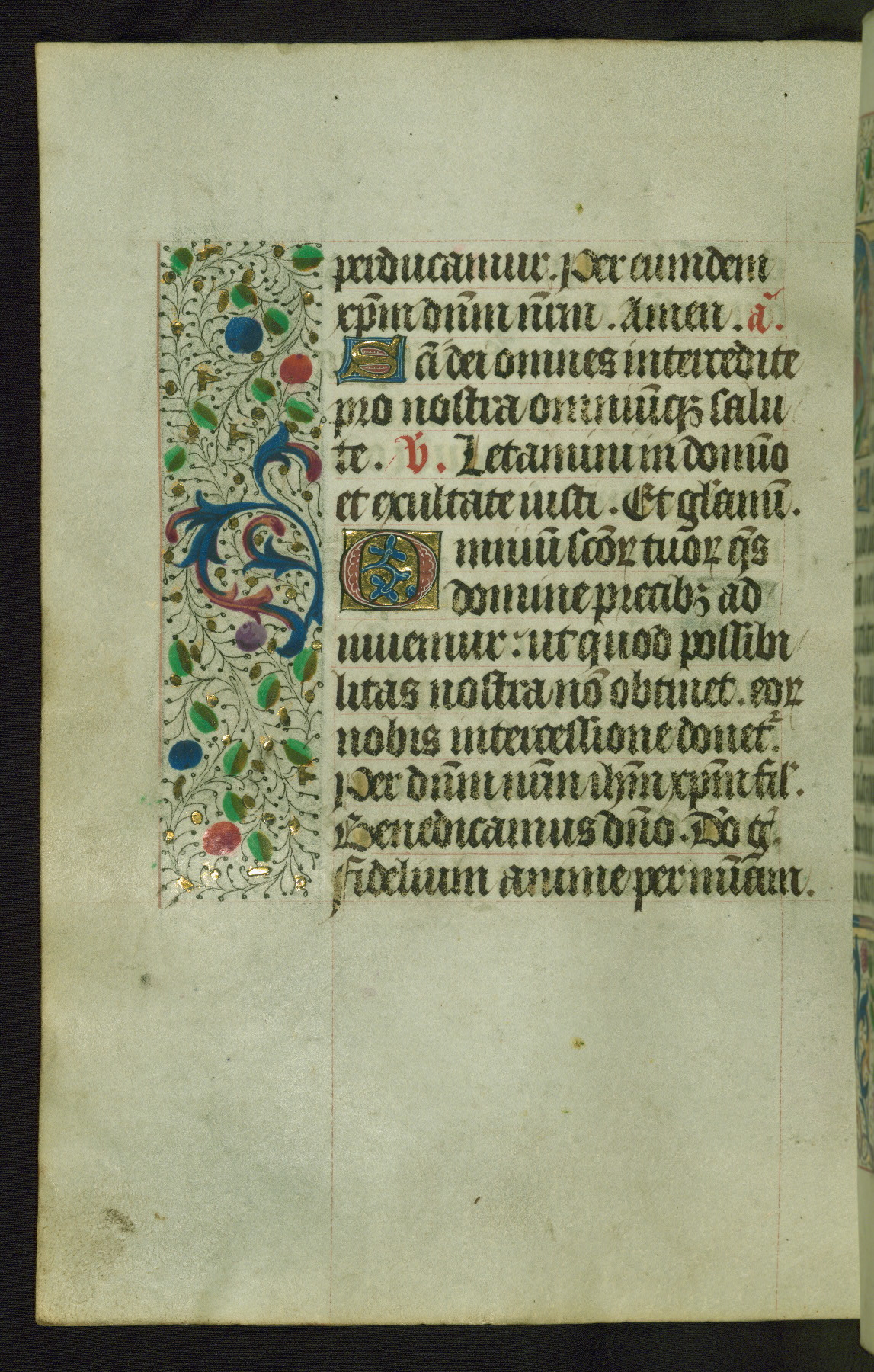 Completed for use of Cambrai, ca. 1450-60, this sizable Book of Hours is comprised of 265 folios, with two full-page miniatures (inserted) and thirteen historiated initials. Perhaps the focus on prayer rather than decoration was due to the presumed first owner, who was established in Mons and was associated with a Benedictine nunnery (dedicated to Sainte Waudry). Some Franciscan sympathies are indicated in the litany (fol. 147v), evinced by a citation of Bernardinus of Siena, Francis, and Clara.