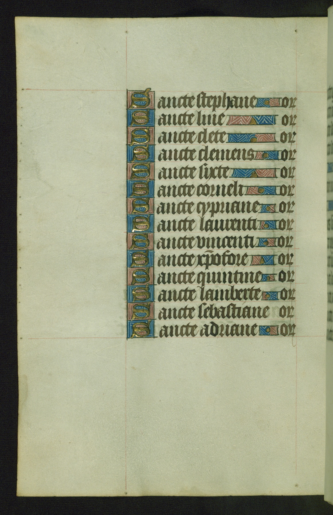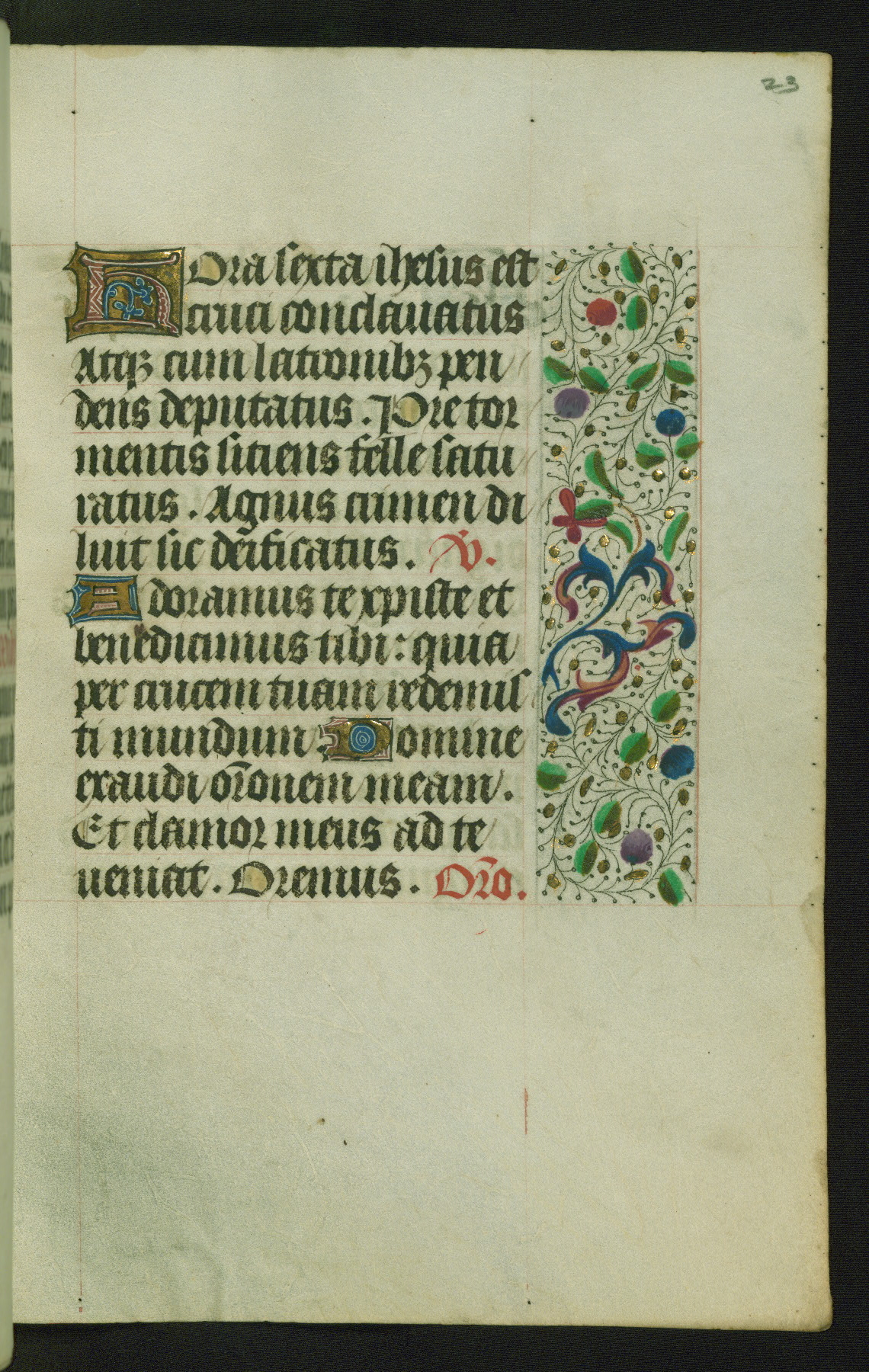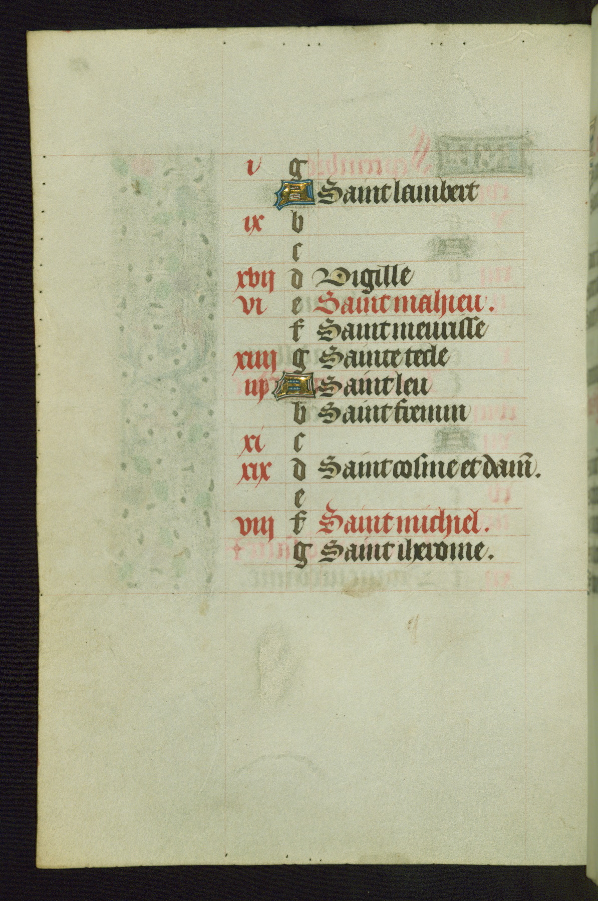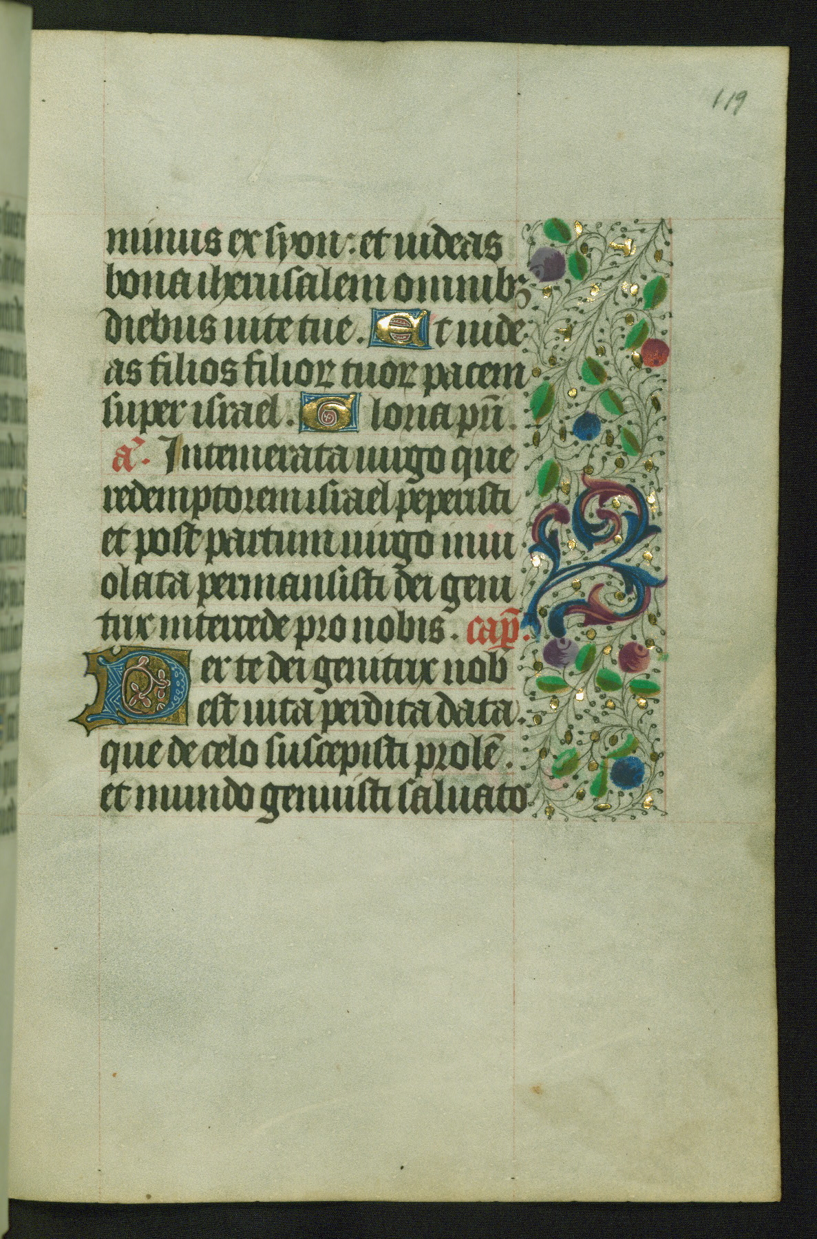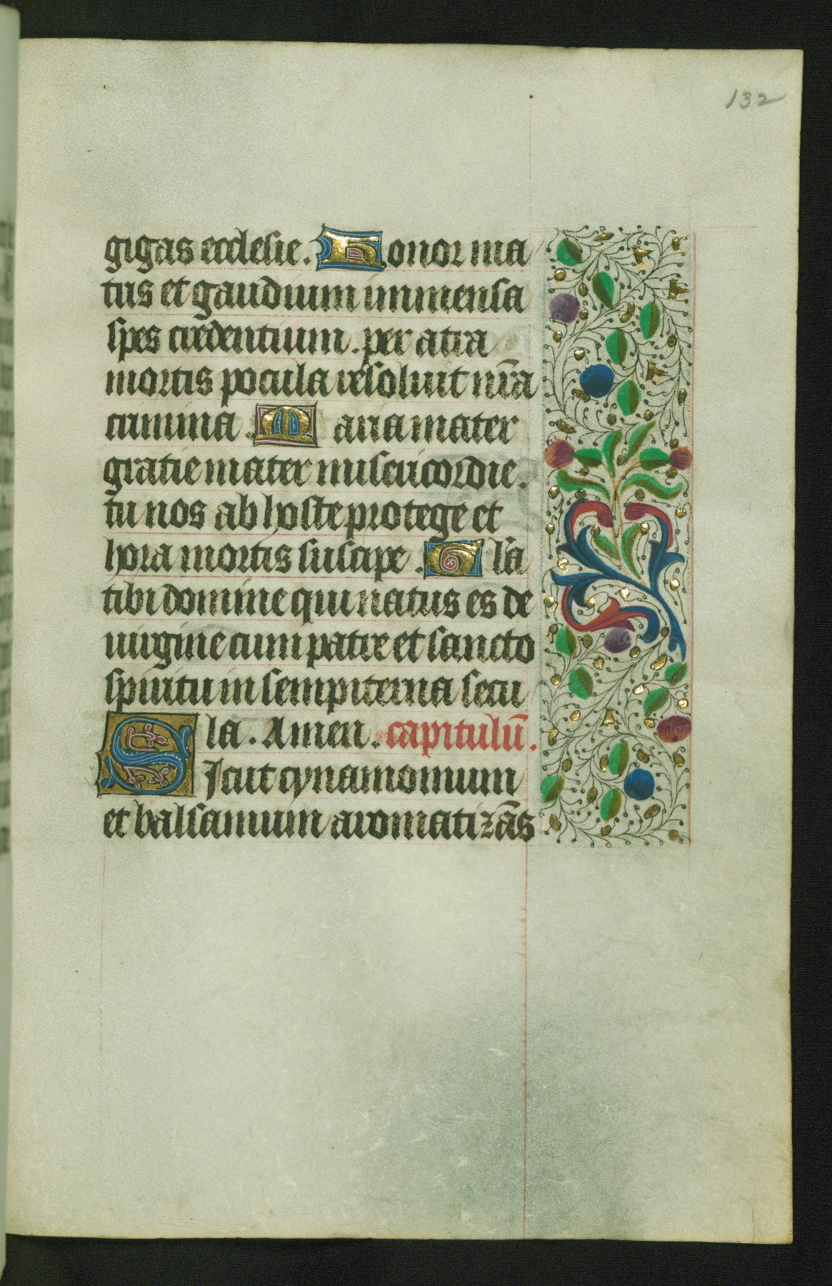 Completed for use of Cambrai, ca. 1450-60, this sizable Book of Hours is comprised of 265 folios, with two full-page miniatures (inserted) and thirteen historiated initials. Perhaps the focus on prayer rather than decoration was due to the presumed first owner, who was established in Mons and was associated with a Benedictine nunnery (dedicated to Sainte Waudry). Some Franciscan sympathies are indicated in the litany (fol. 147v), evinced by a citation of Bernardinus of Siena, Francis, and Clara.