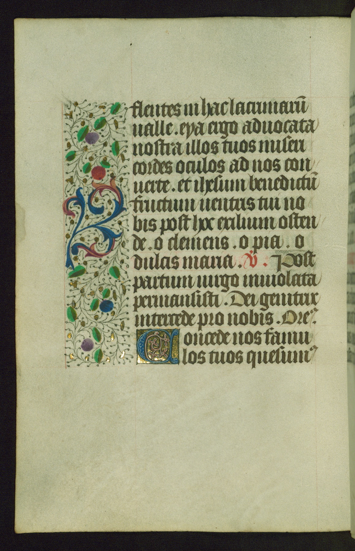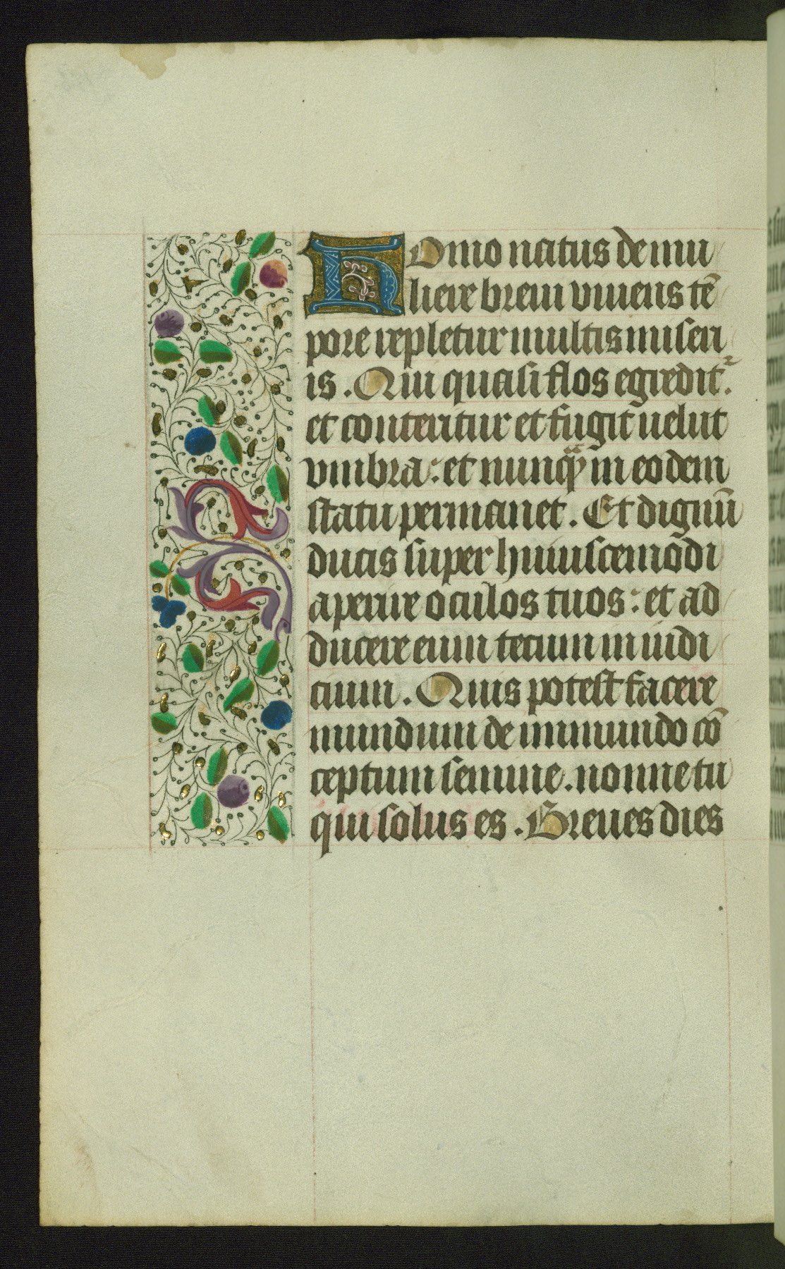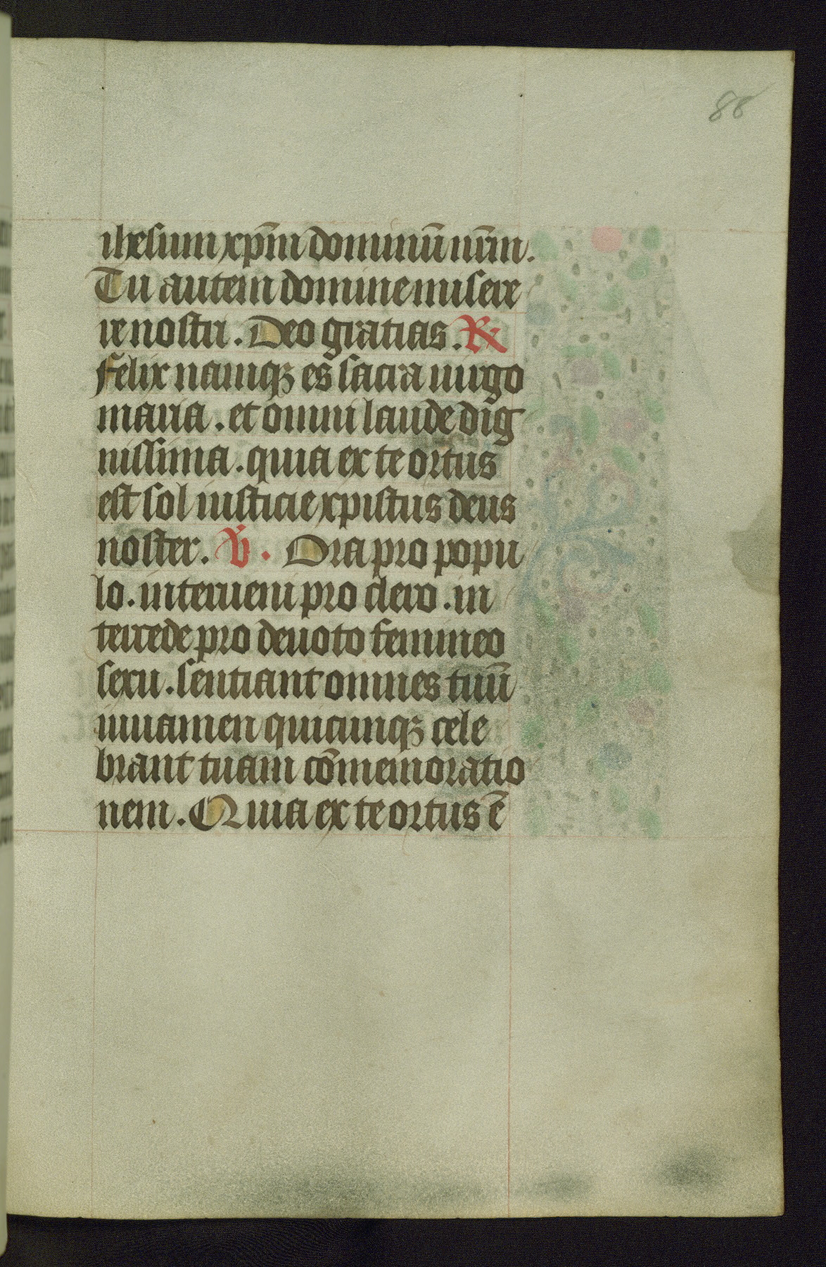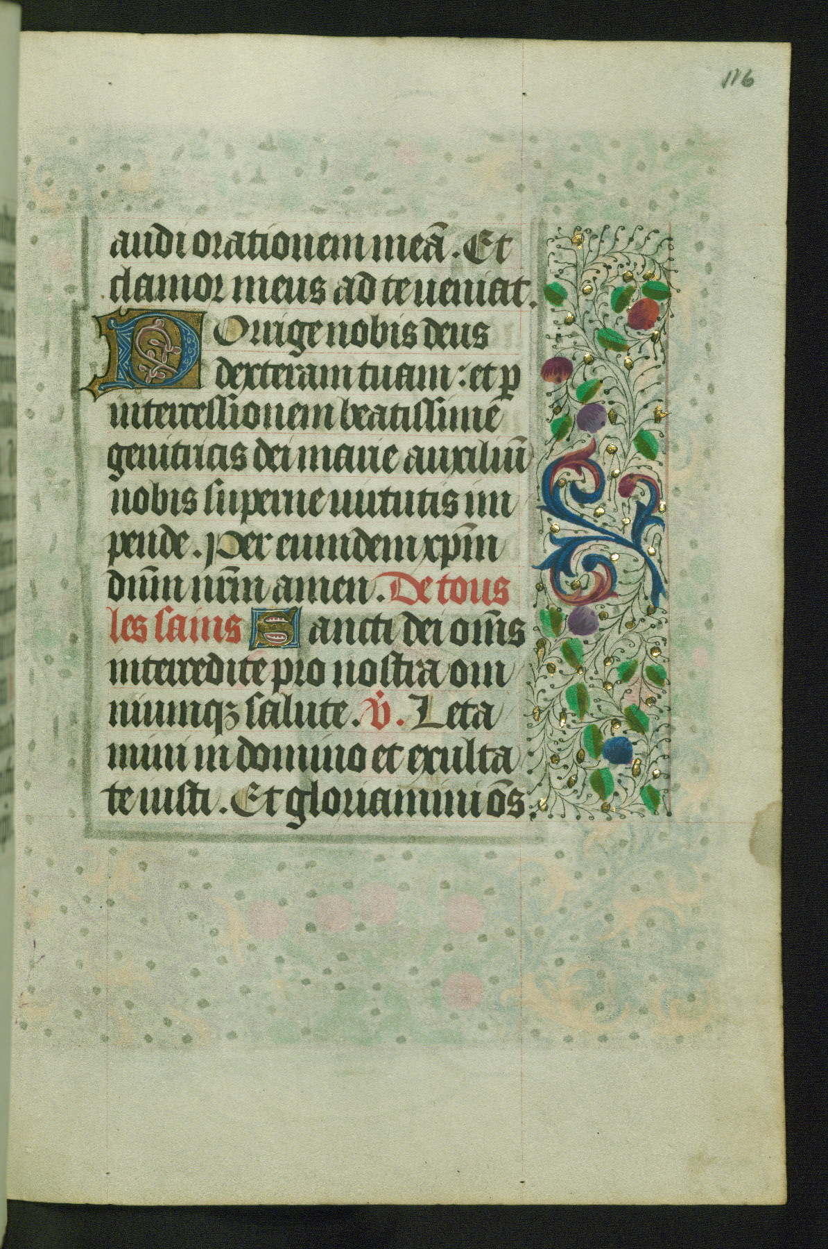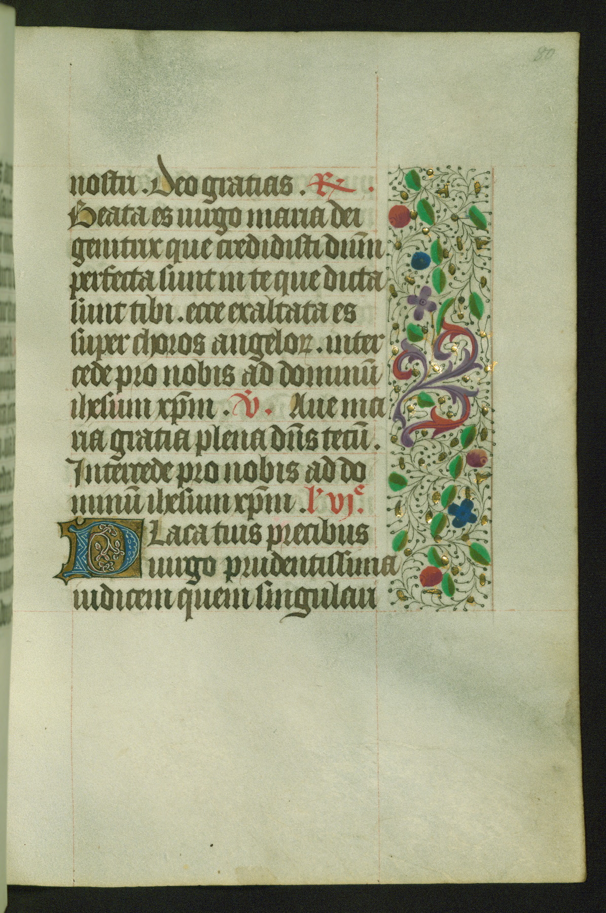 Completed for use of Cambrai, ca. 1450-60, this sizable Book of Hours is comprised of 265 folios, with two full-page miniatures (inserted) and thirteen historiated initials. Perhaps the focus on prayer rather than decoration was due to the presumed first owner, who was established in Mons and was associated with a Benedictine nunnery (dedicated to Sainte Waudry). Some Franciscan sympathies are indicated in the litany (fol. 147v), evinced by a citation of Bernardinus of Siena, Francis, and Clara.