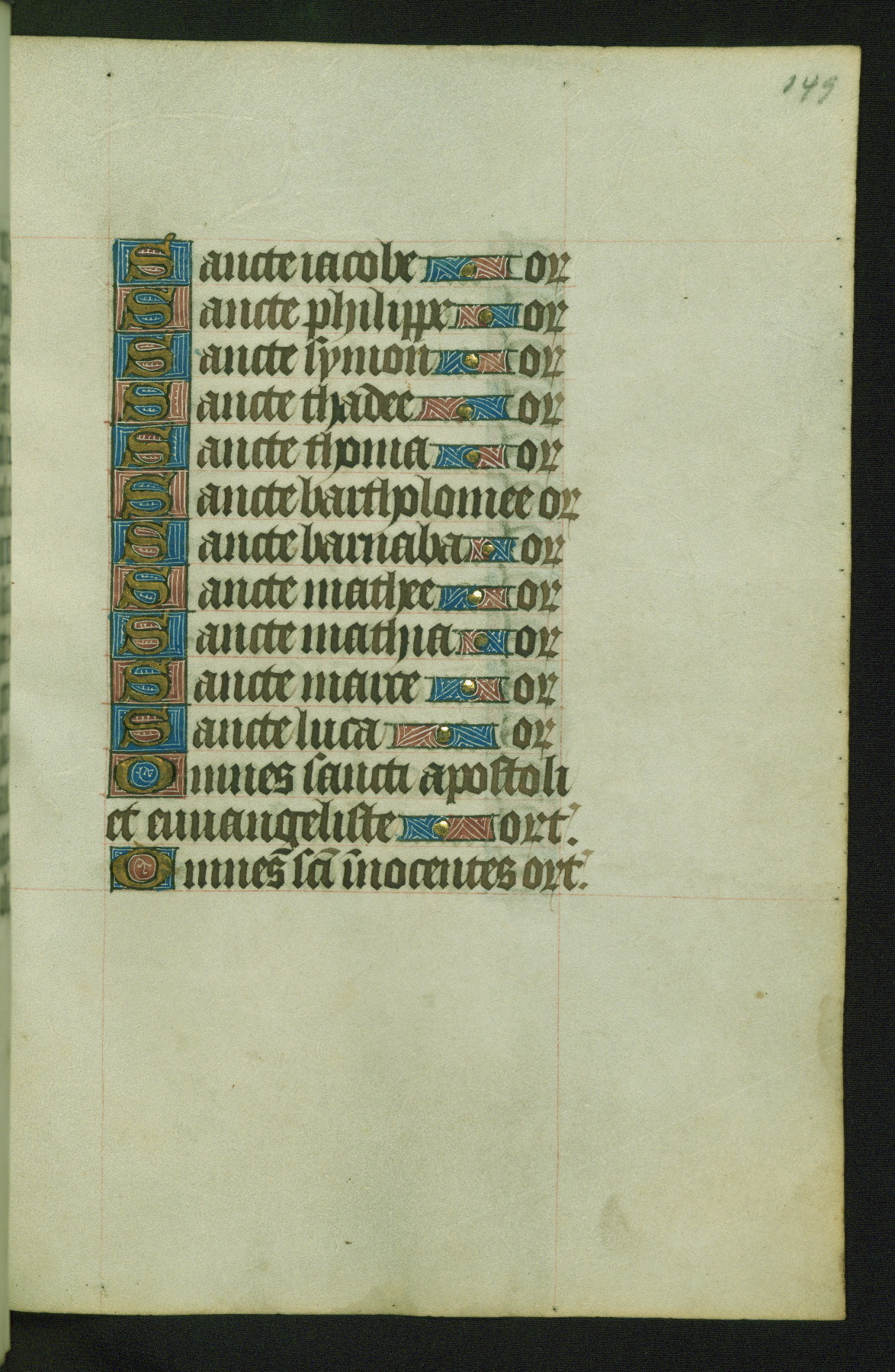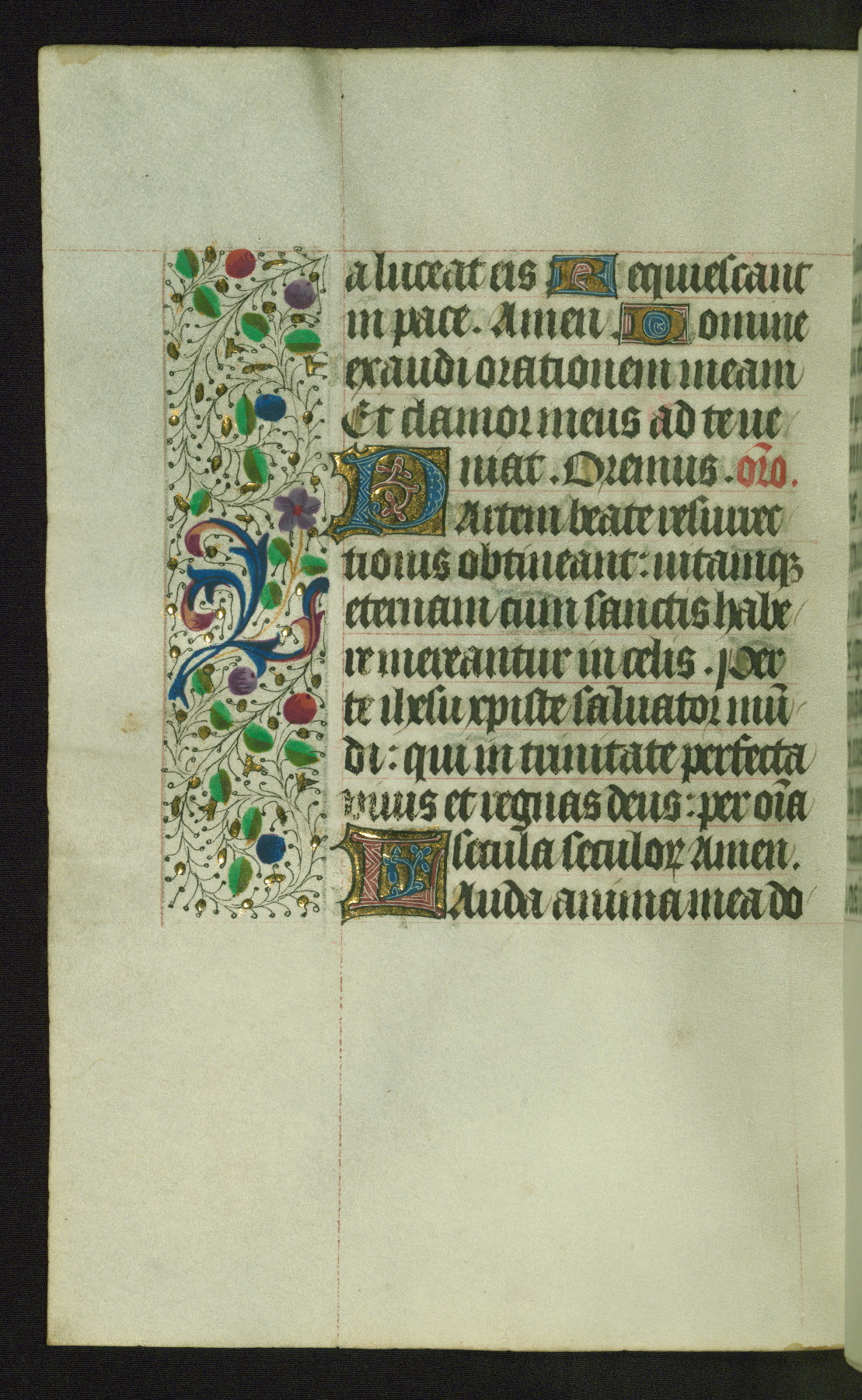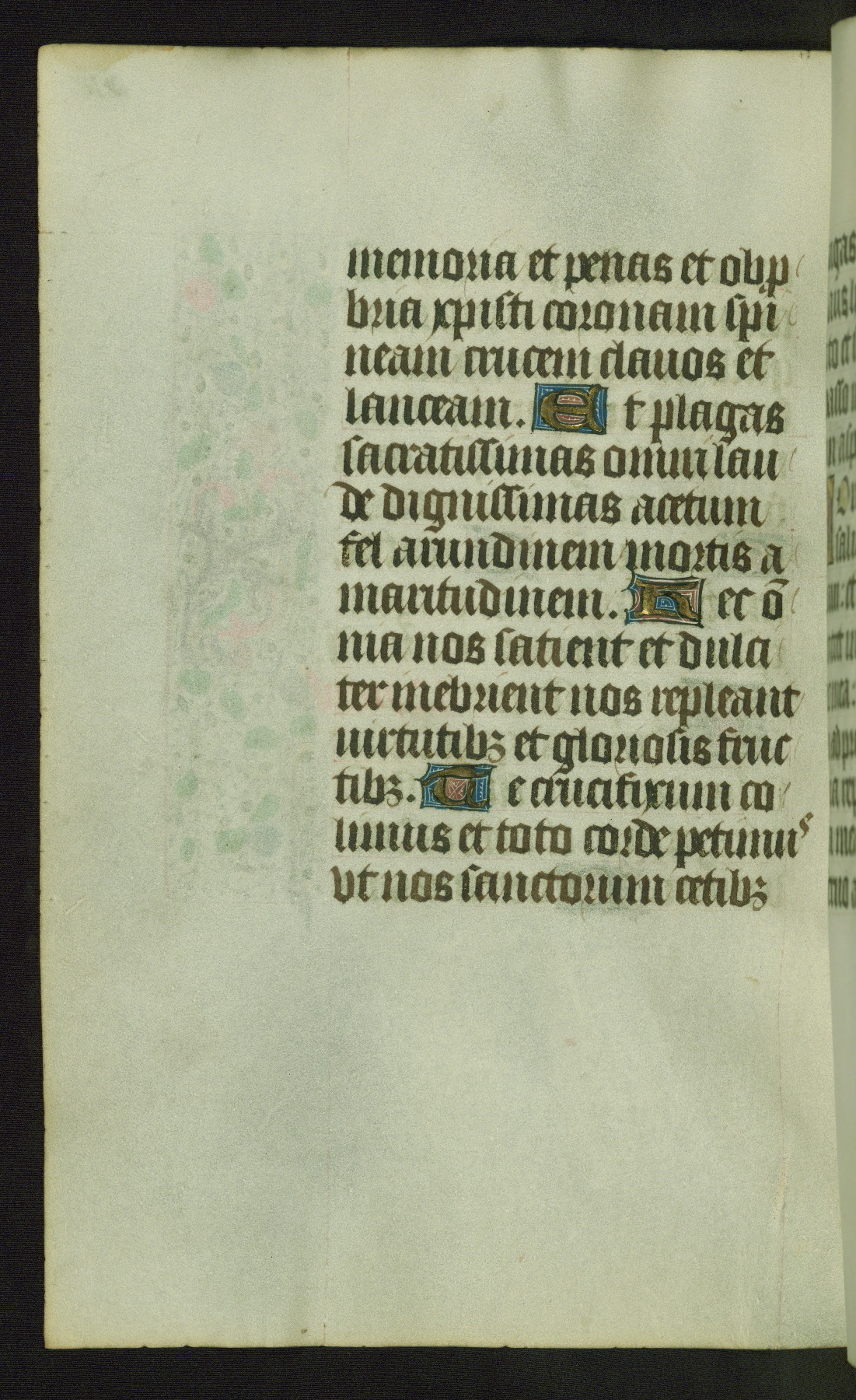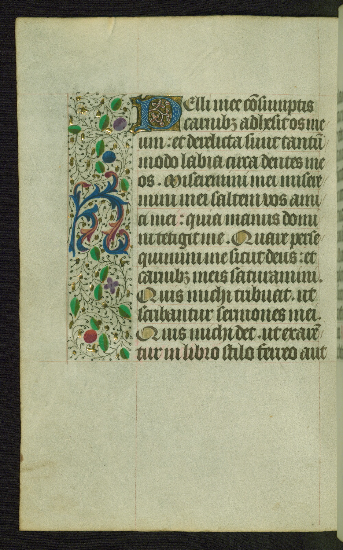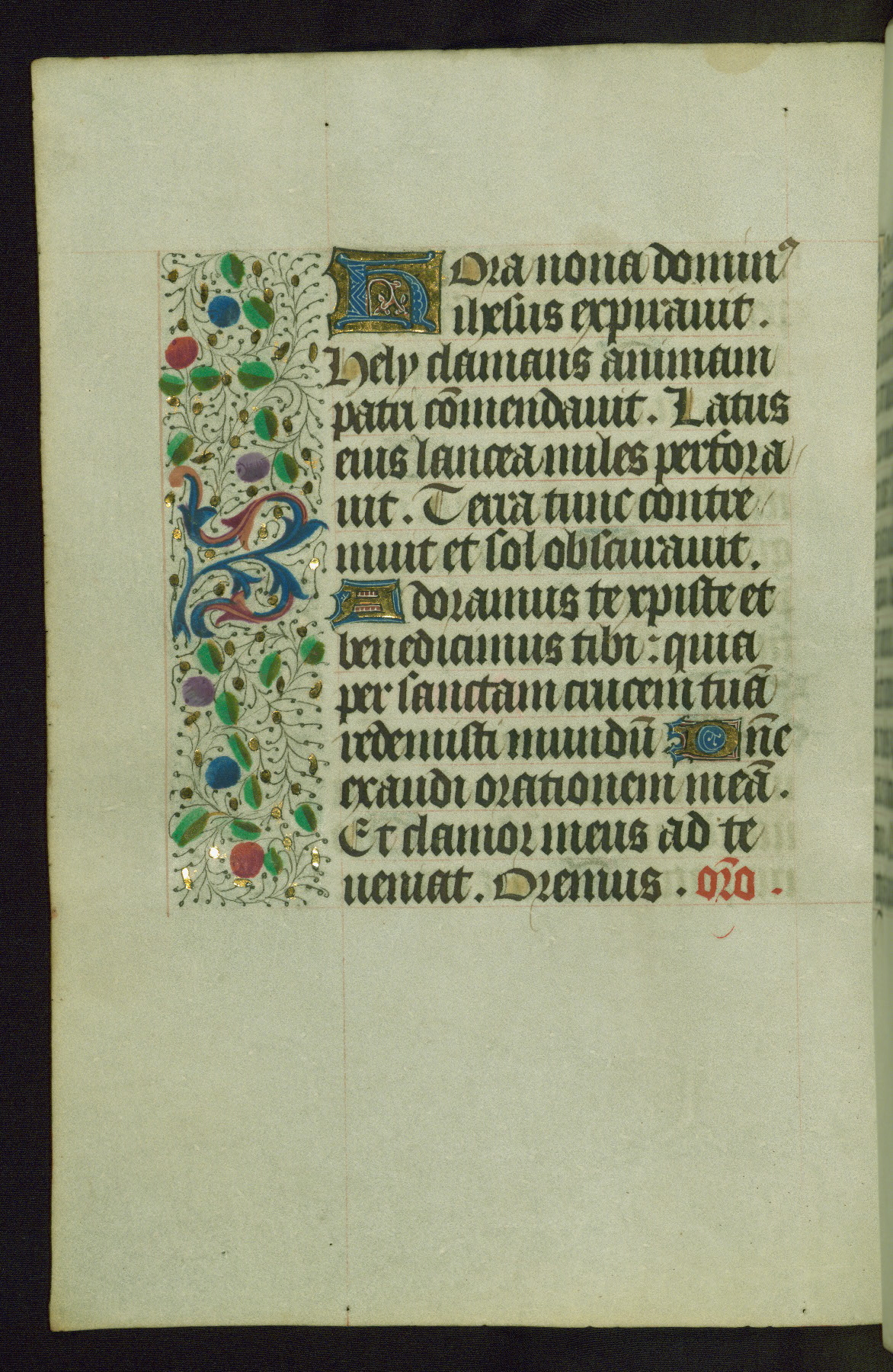 Completed for use of Cambrai, ca. 1450-60, this sizable Book of Hours is comprised of 265 folios, with two full-page miniatures (inserted) and thirteen historiated initials. Perhaps the focus on prayer rather than decoration was due to the presumed first owner, who was established in Mons and was associated with a Benedictine nunnery (dedicated to Sainte Waudry). Some Franciscan sympathies are indicated in the litany (fol. 147v), evinced by a citation of Bernardinus of Siena, Francis, and Clara.