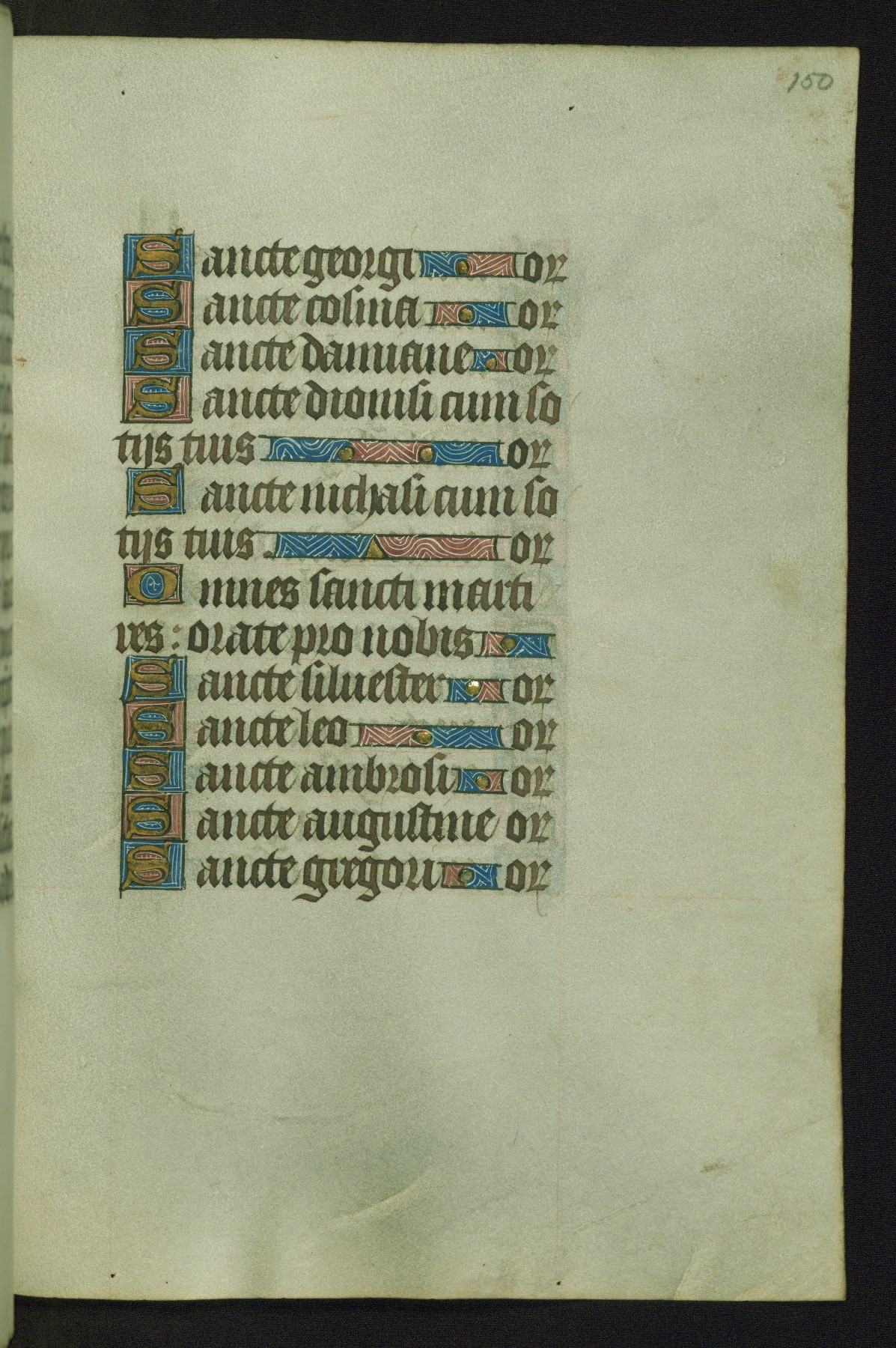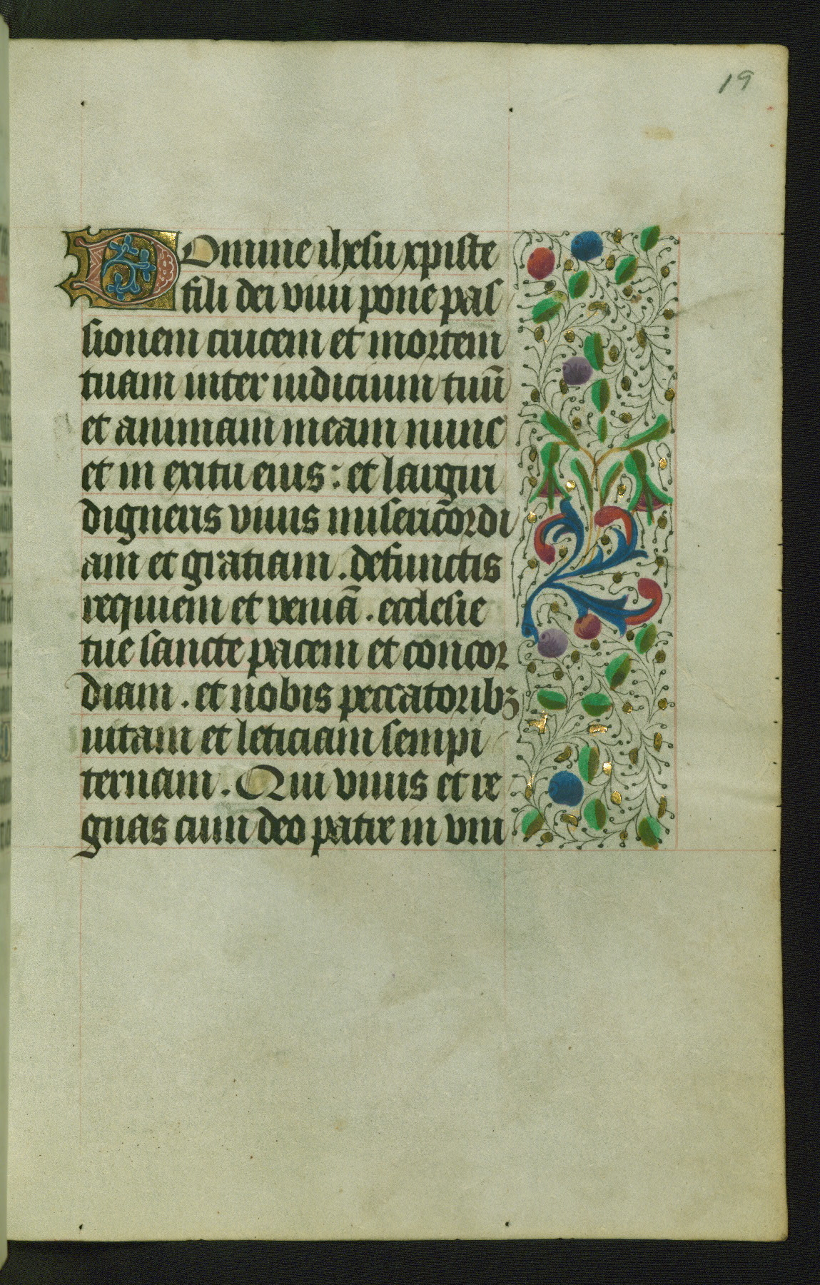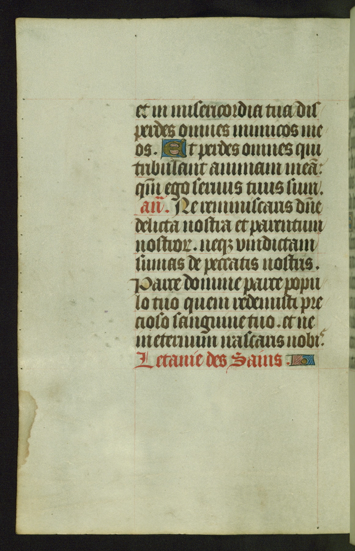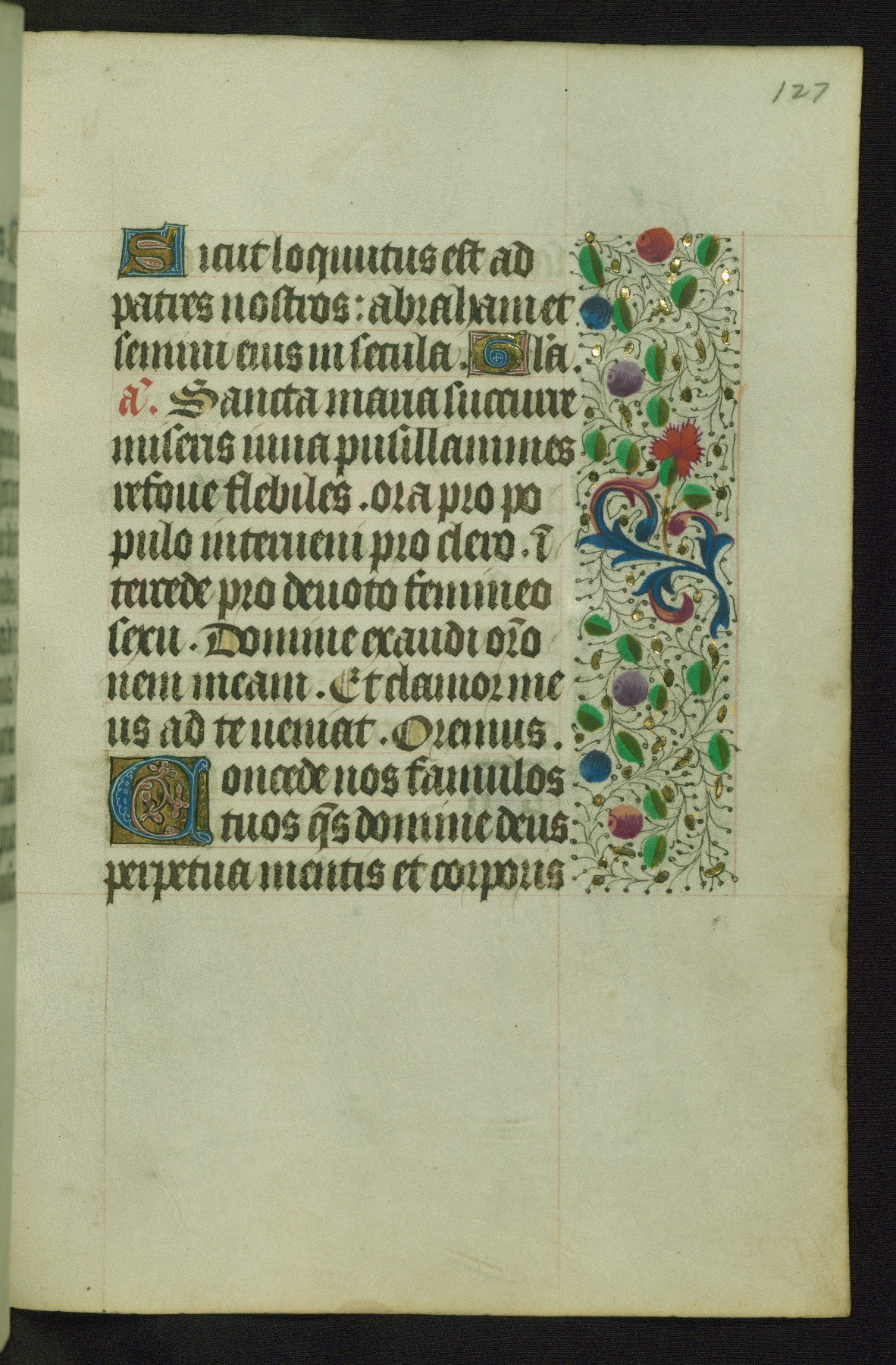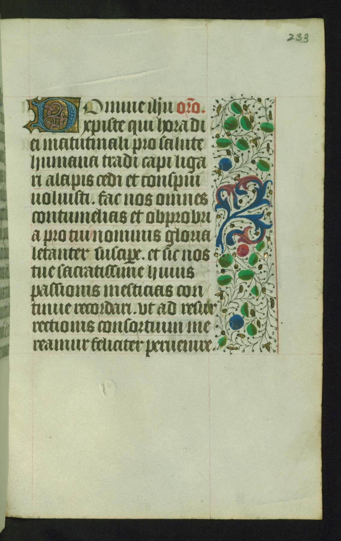 Completed for use of Cambrai, ca. 1450-60, this sizable Book of Hours is comprised of 265 folios, with two full-page miniatures (inserted) and thirteen historiated initials. Perhaps the focus on prayer rather than decoration was due to the presumed first owner, who was established in Mons and was associated with a Benedictine nunnery (dedicated to Sainte Waudry). Some Franciscan sympathies are indicated in the litany (fol. 147v), evinced by a citation of Bernardinus of Siena, Francis, and Clara.