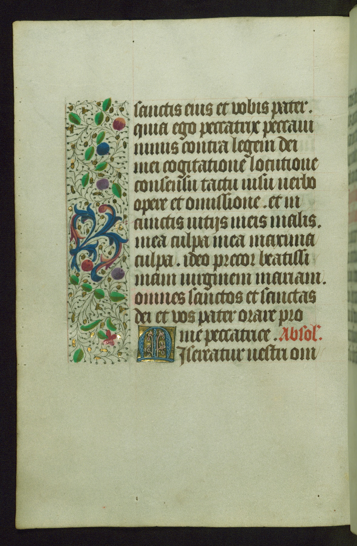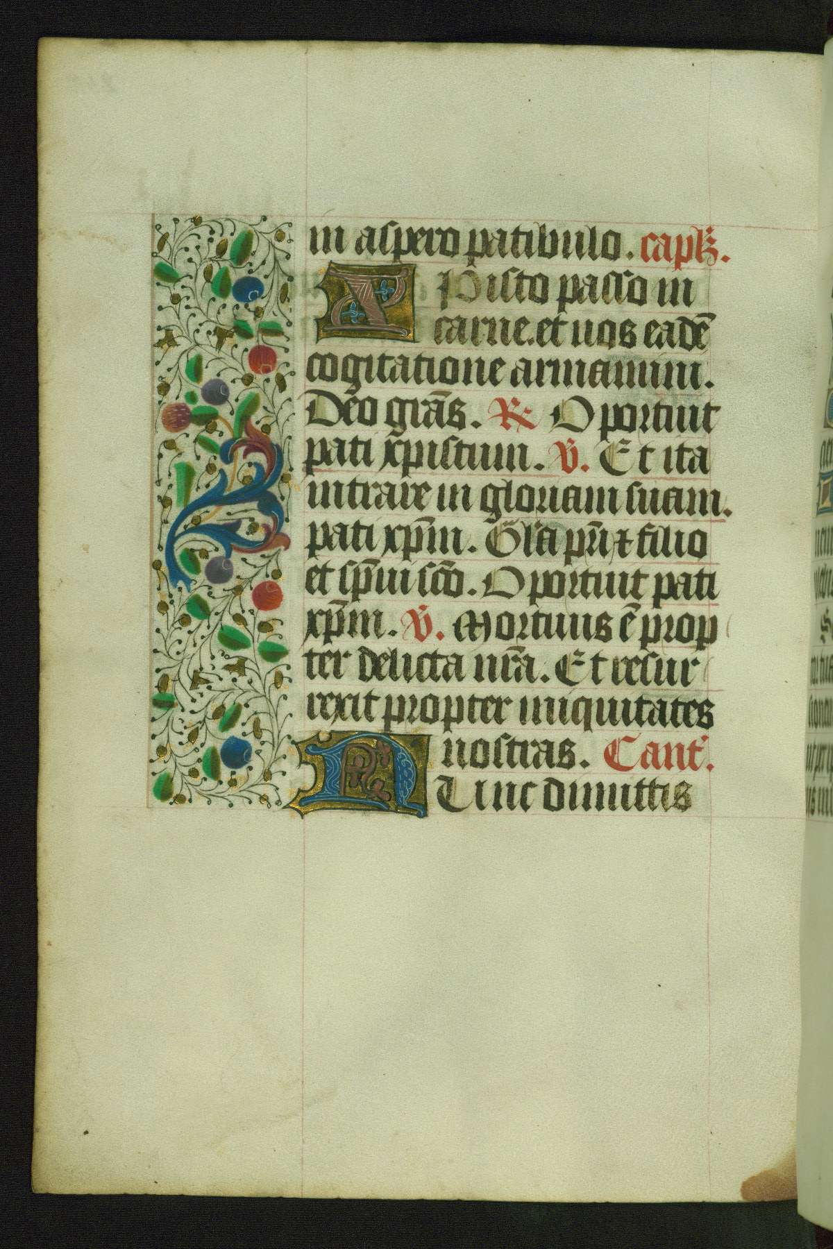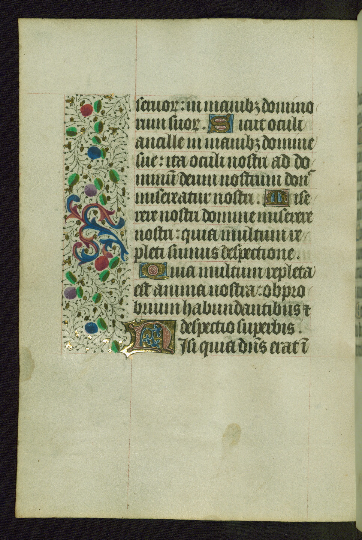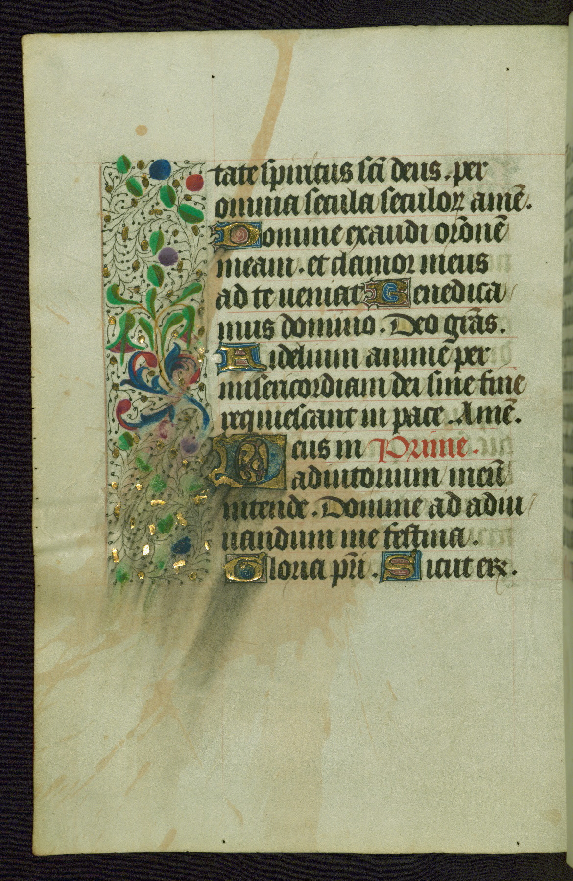 Completed for use of Cambrai, ca. 1450-60, this sizable Book of Hours is comprised of 265 folios, with two full-page miniatures (inserted) and thirteen historiated initials. Perhaps the focus on prayer rather than decoration was due to the presumed first owner, who was established in Mons and was associated with a Benedictine nunnery (dedicated to Sainte Waudry). Some Franciscan sympathies are indicated in the litany (fol. 147v), evinced by a citation of Bernardinus of Siena, Francis, and Clara.