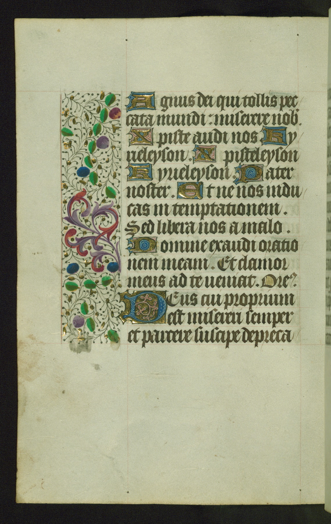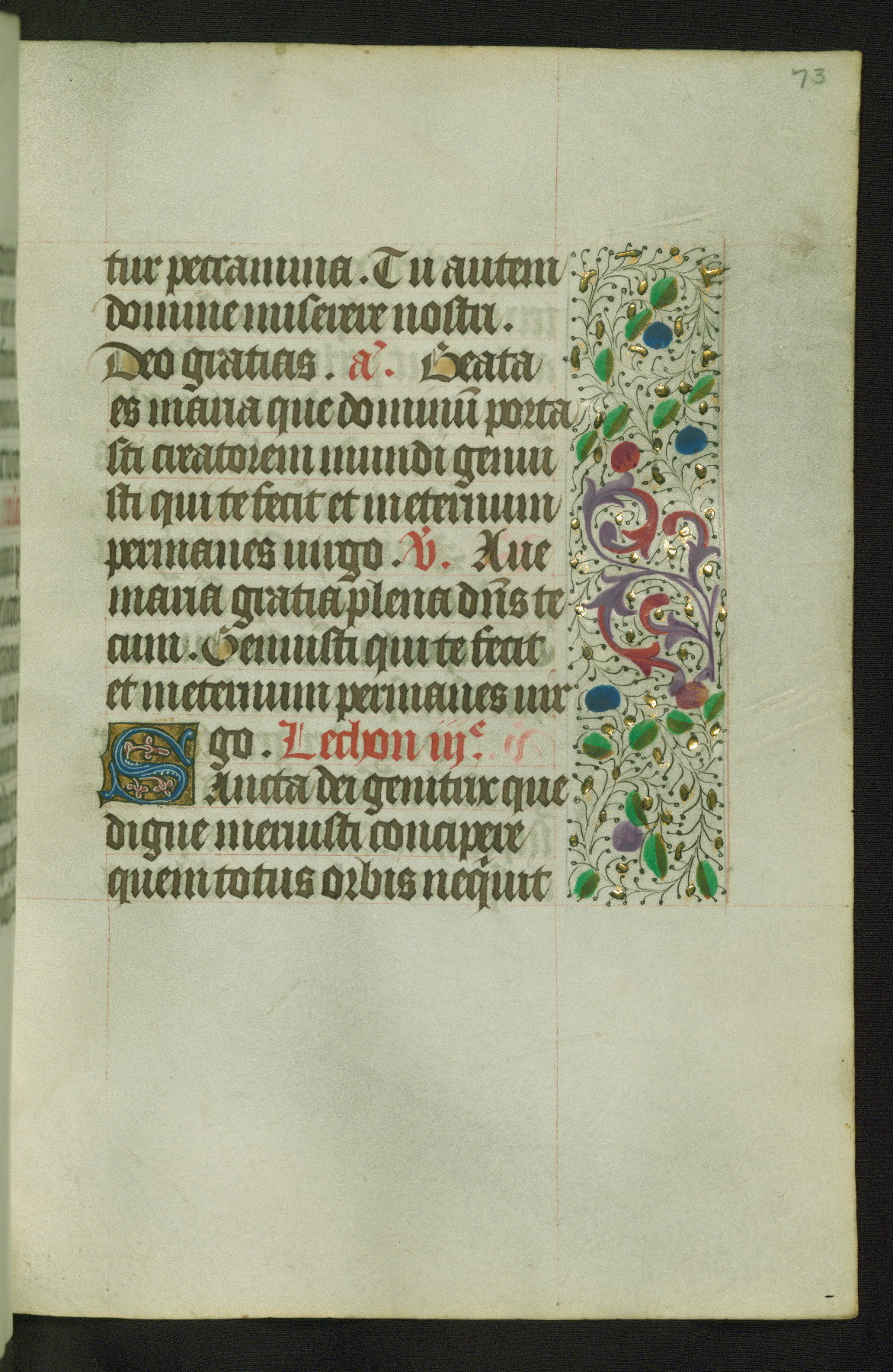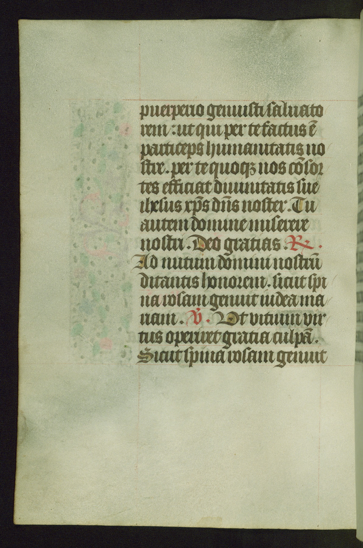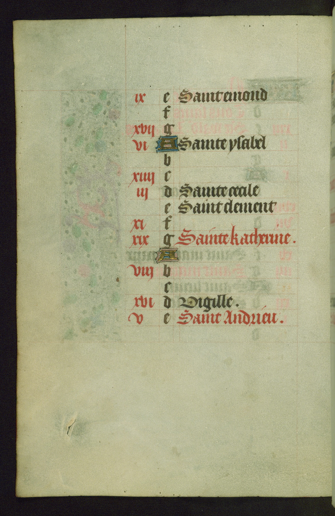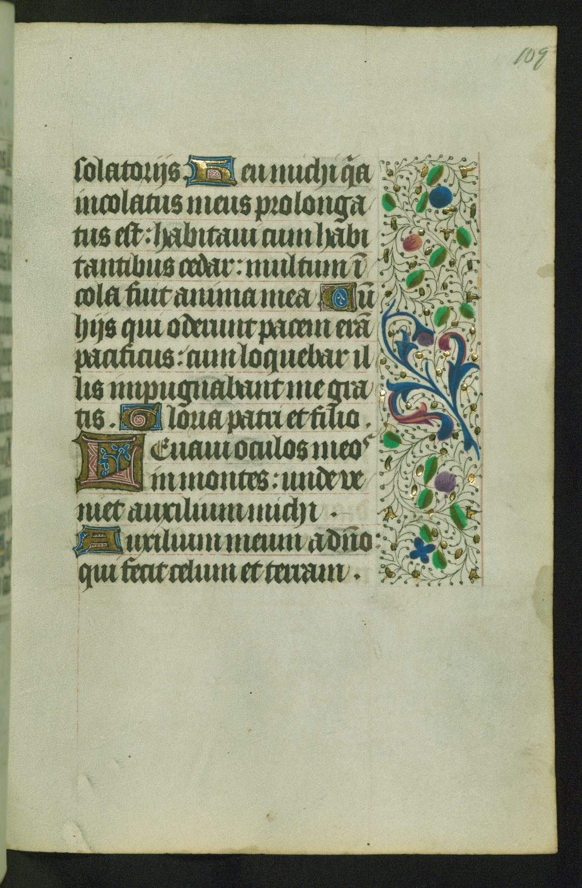 Completed for use of Cambrai, ca. 1450-60, this sizable Book of Hours is comprised of 265 folios, with two full-page miniatures (inserted) and thirteen historiated initials. Perhaps the focus on prayer rather than decoration was due to the presumed first owner, who was established in Mons and was associated with a Benedictine nunnery (dedicated to Sainte Waudry). Some Franciscan sympathies are indicated in the litany (fol. 147v), evinced by a citation of Bernardinus of Siena, Francis, and Clara.