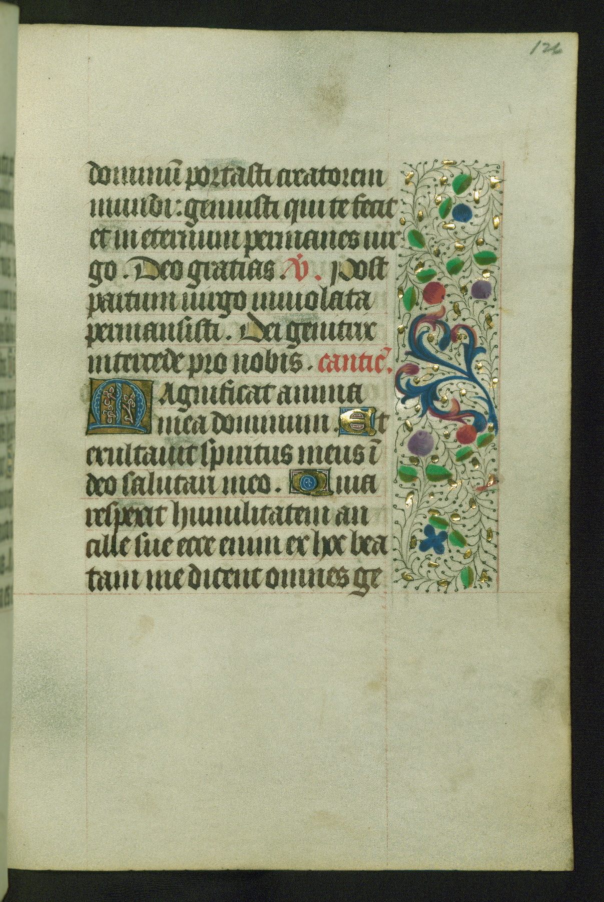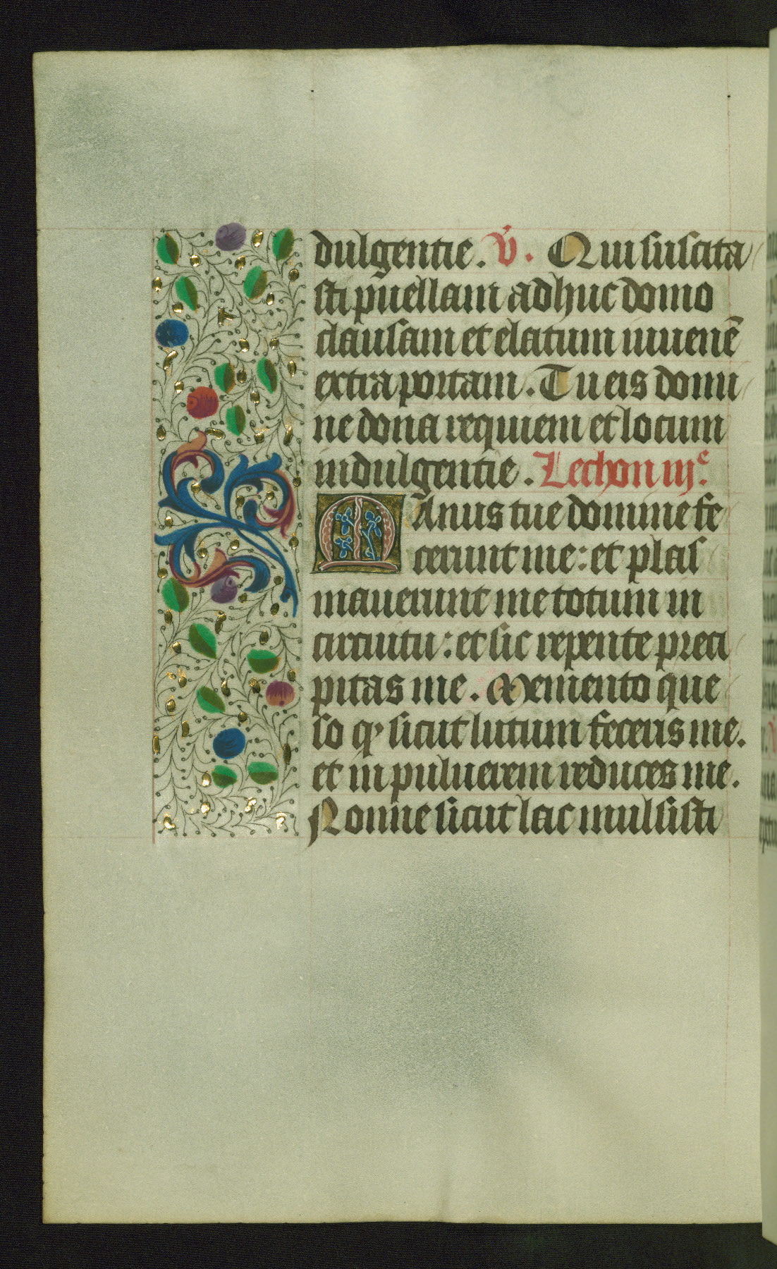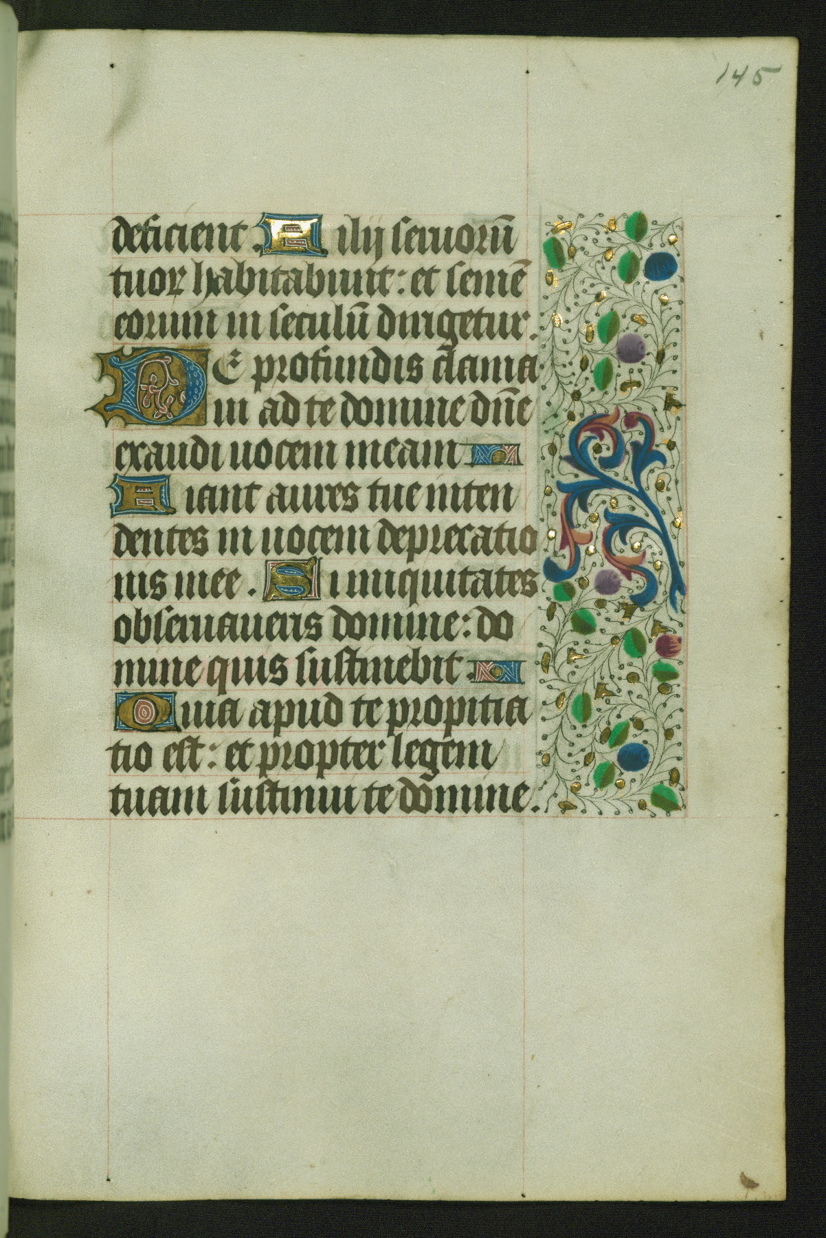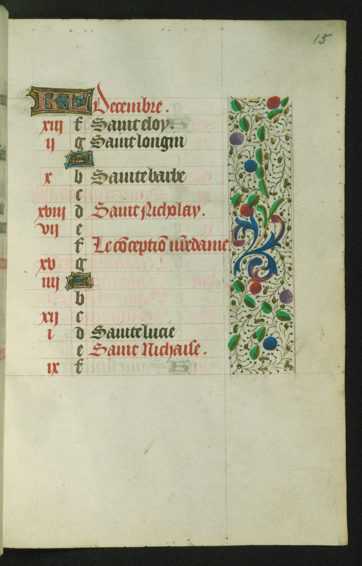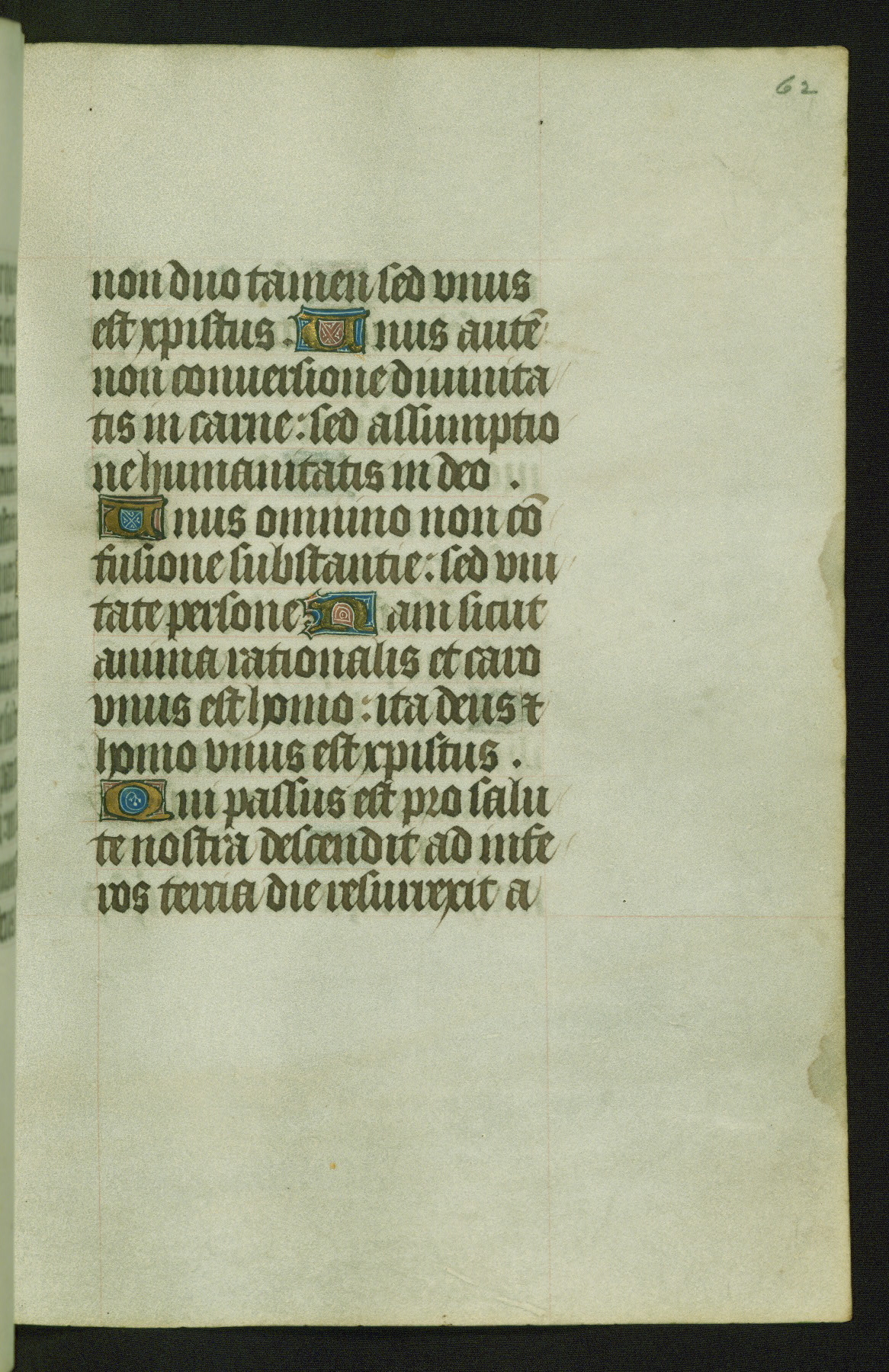 Completed for use of Cambrai, ca. 1450-60, this sizable Book of Hours is comprised of 265 folios, with two full-page miniatures (inserted) and thirteen historiated initials. Perhaps the focus on prayer rather than decoration was due to the presumed first owner, who was established in Mons and was associated with a Benedictine nunnery (dedicated to Sainte Waudry). Some Franciscan sympathies are indicated in the litany (fol. 147v), evinced by a citation of Bernardinus of Siena, Francis, and Clara.