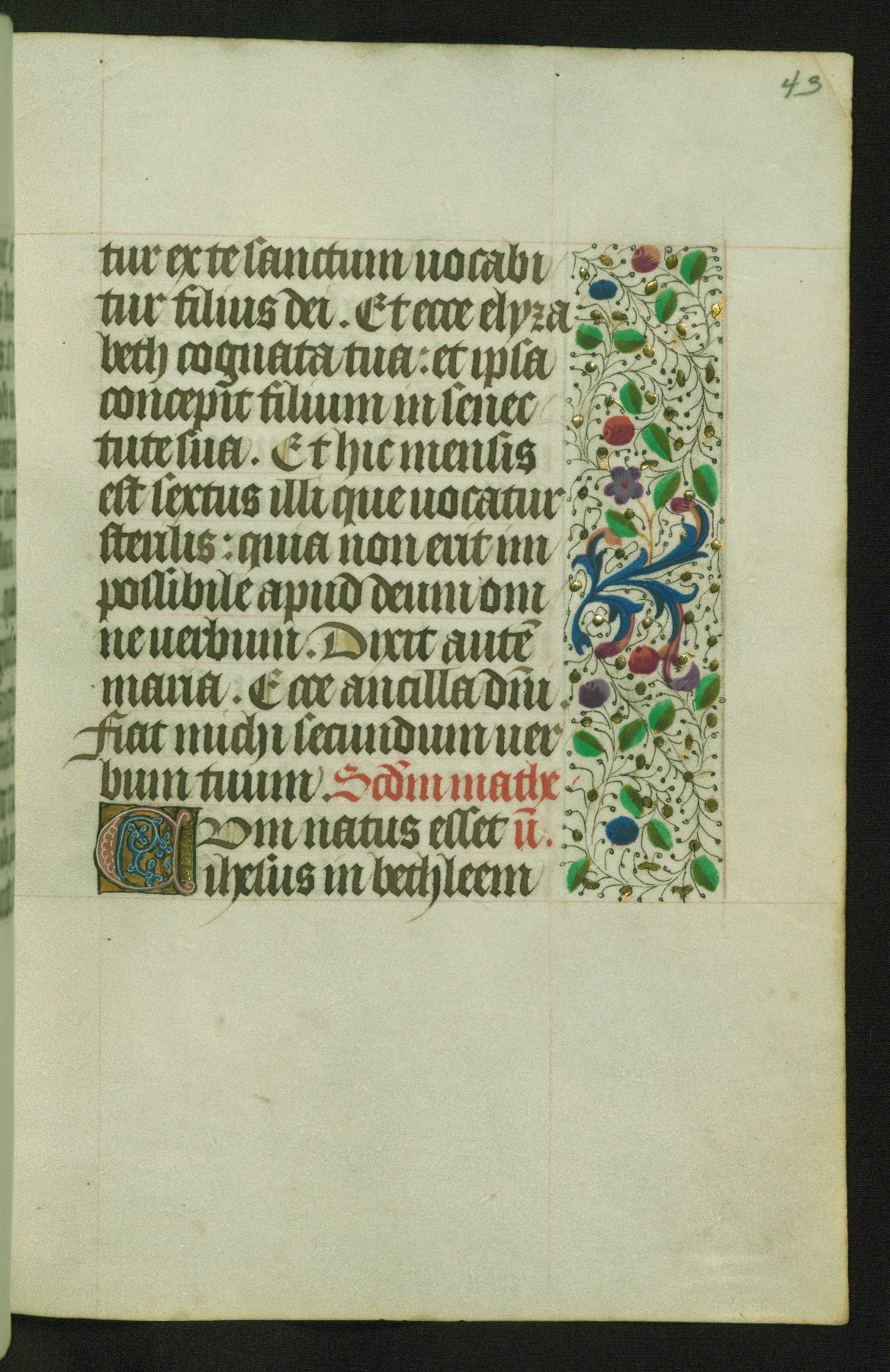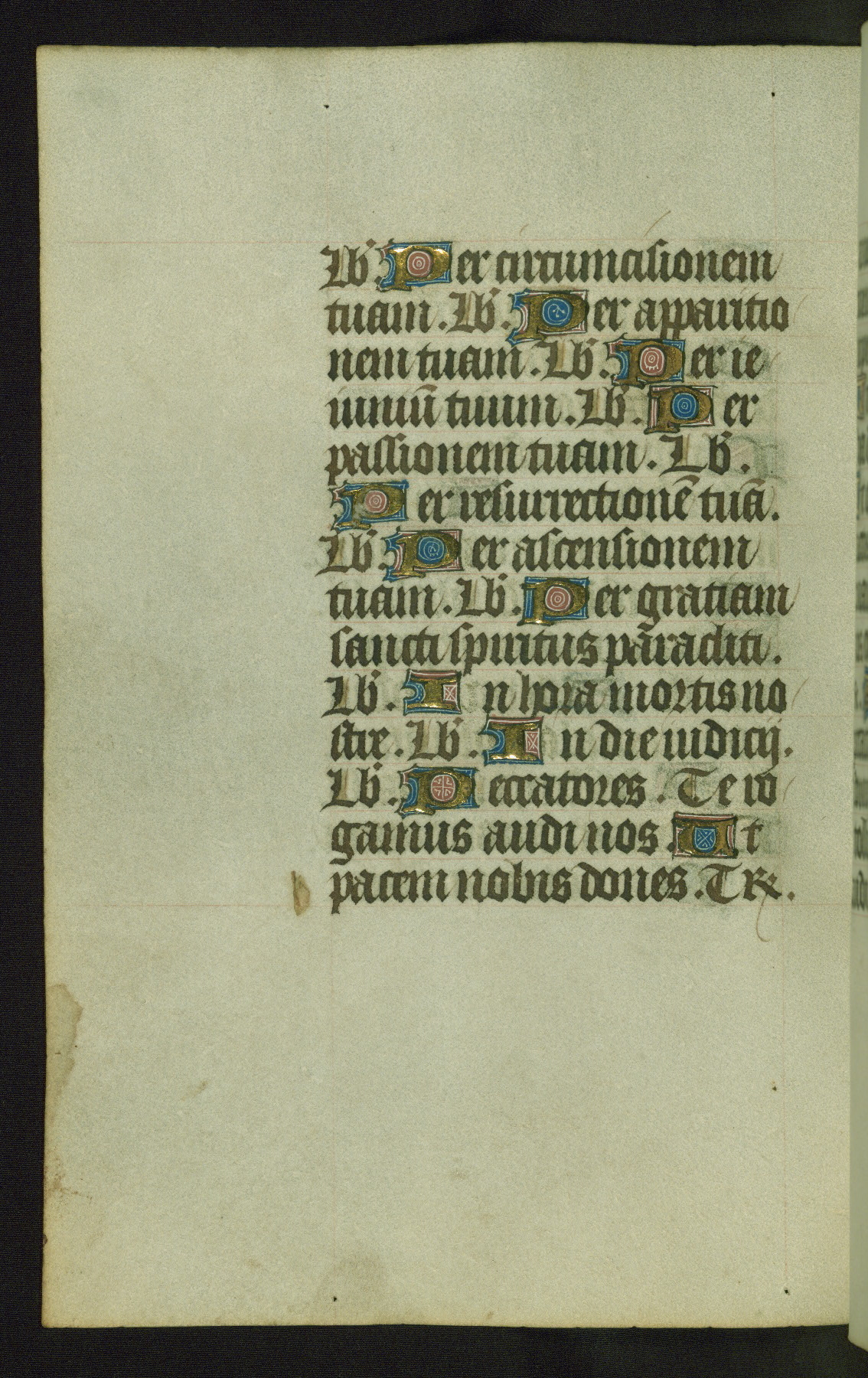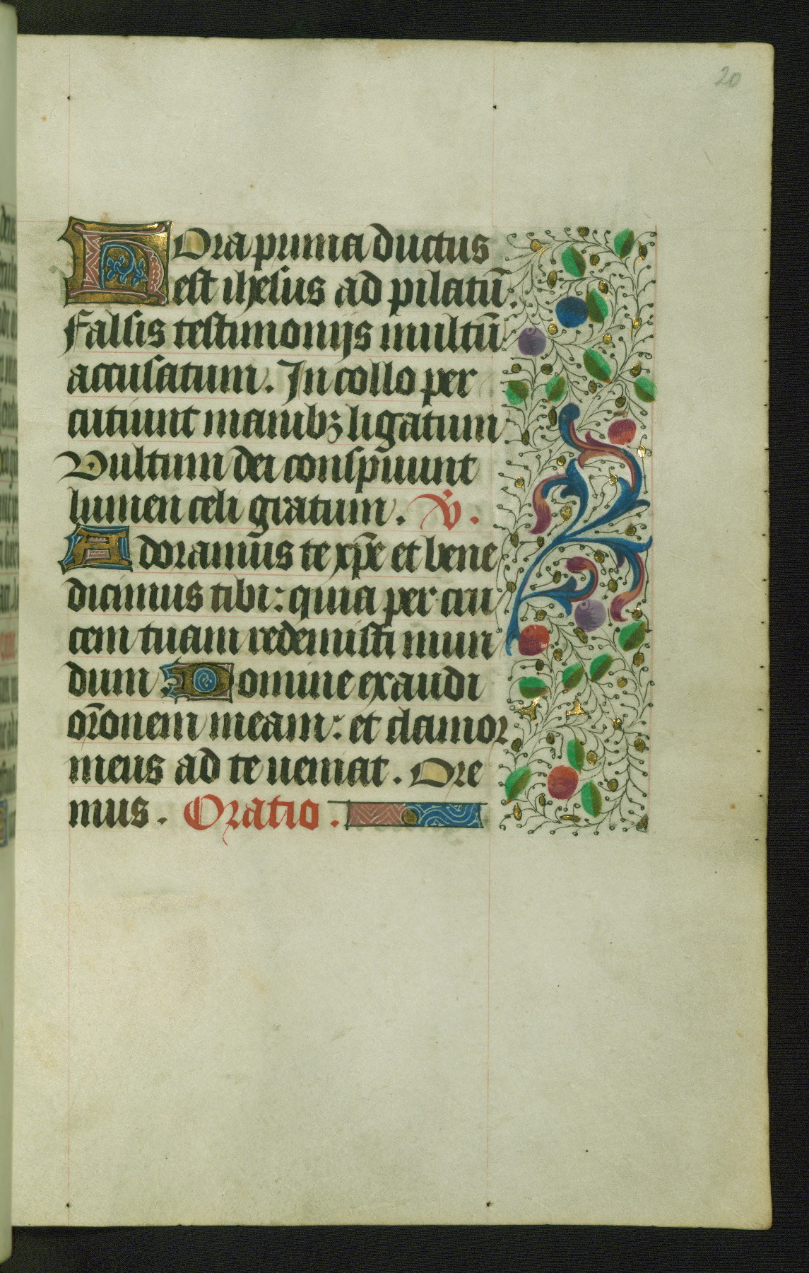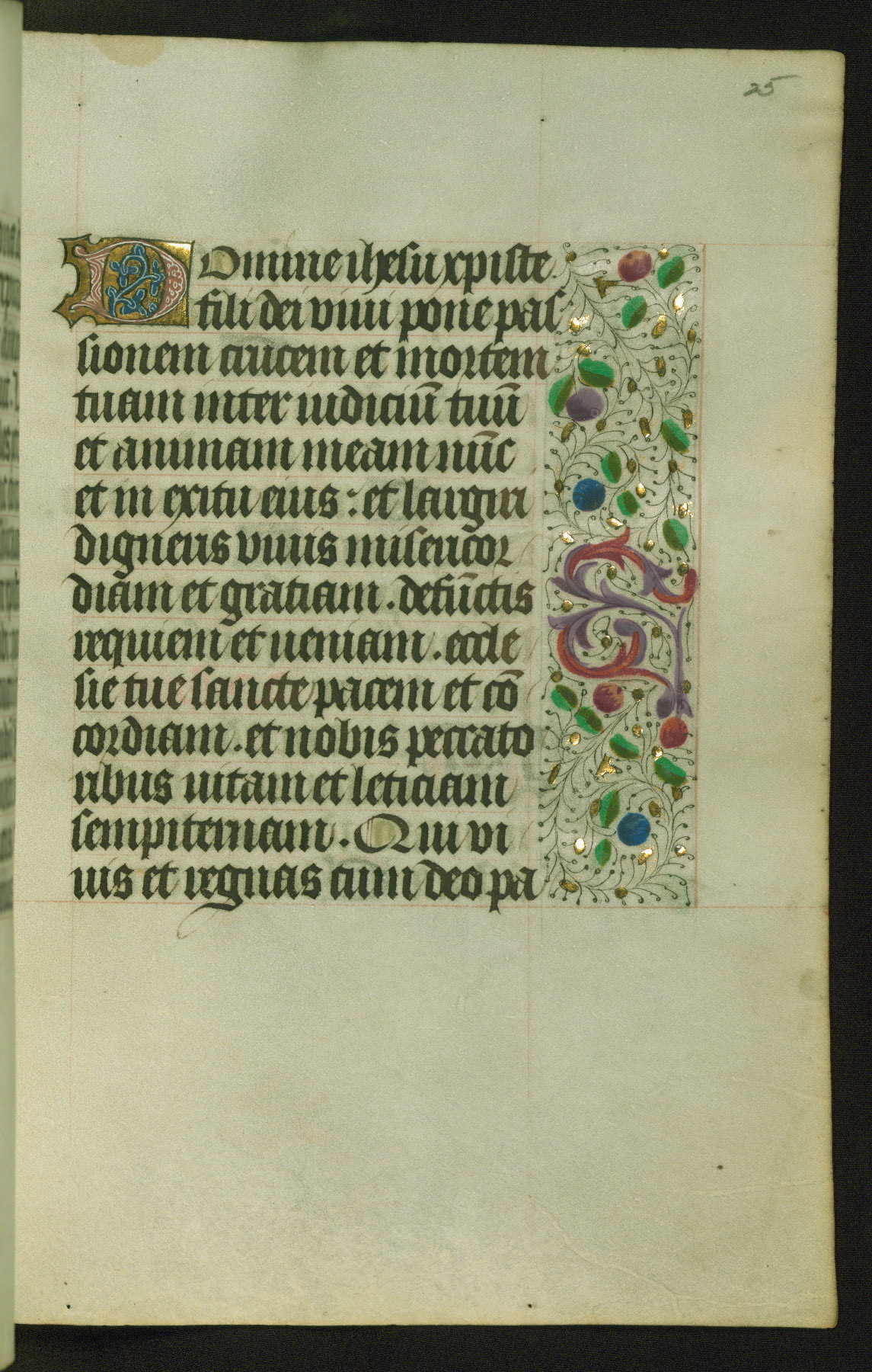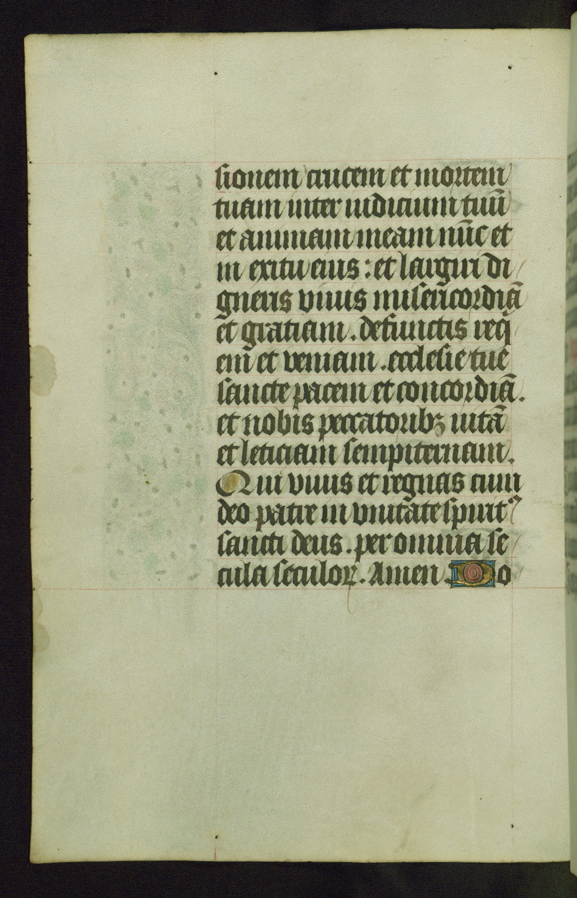 Completed for use of Cambrai, ca. 1450-60, this sizable Book of Hours is comprised of 265 folios, with two full-page miniatures (inserted) and thirteen historiated initials. Perhaps the focus on prayer rather than decoration was due to the presumed first owner, who was established in Mons and was associated with a Benedictine nunnery (dedicated to Sainte Waudry). Some Franciscan sympathies are indicated in the litany (fol. 147v), evinced by a citation of Bernardinus of Siena, Francis, and Clara.