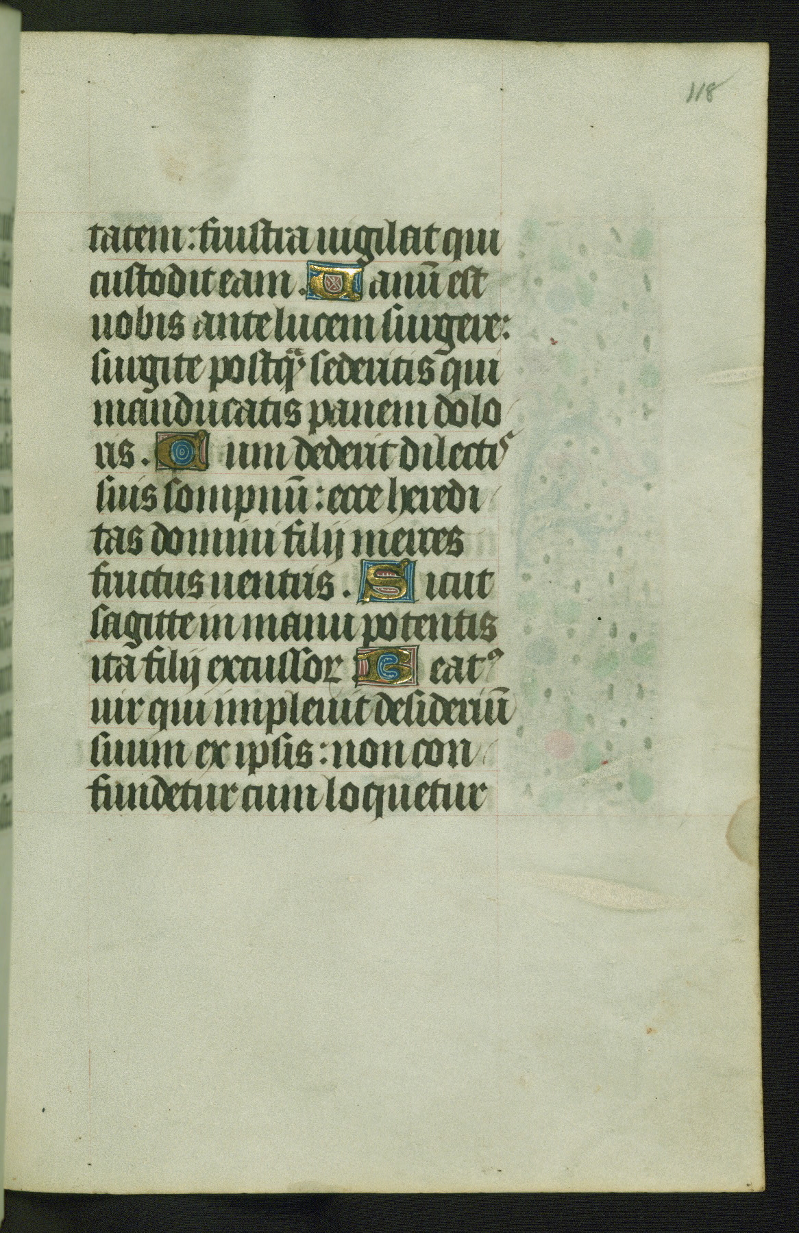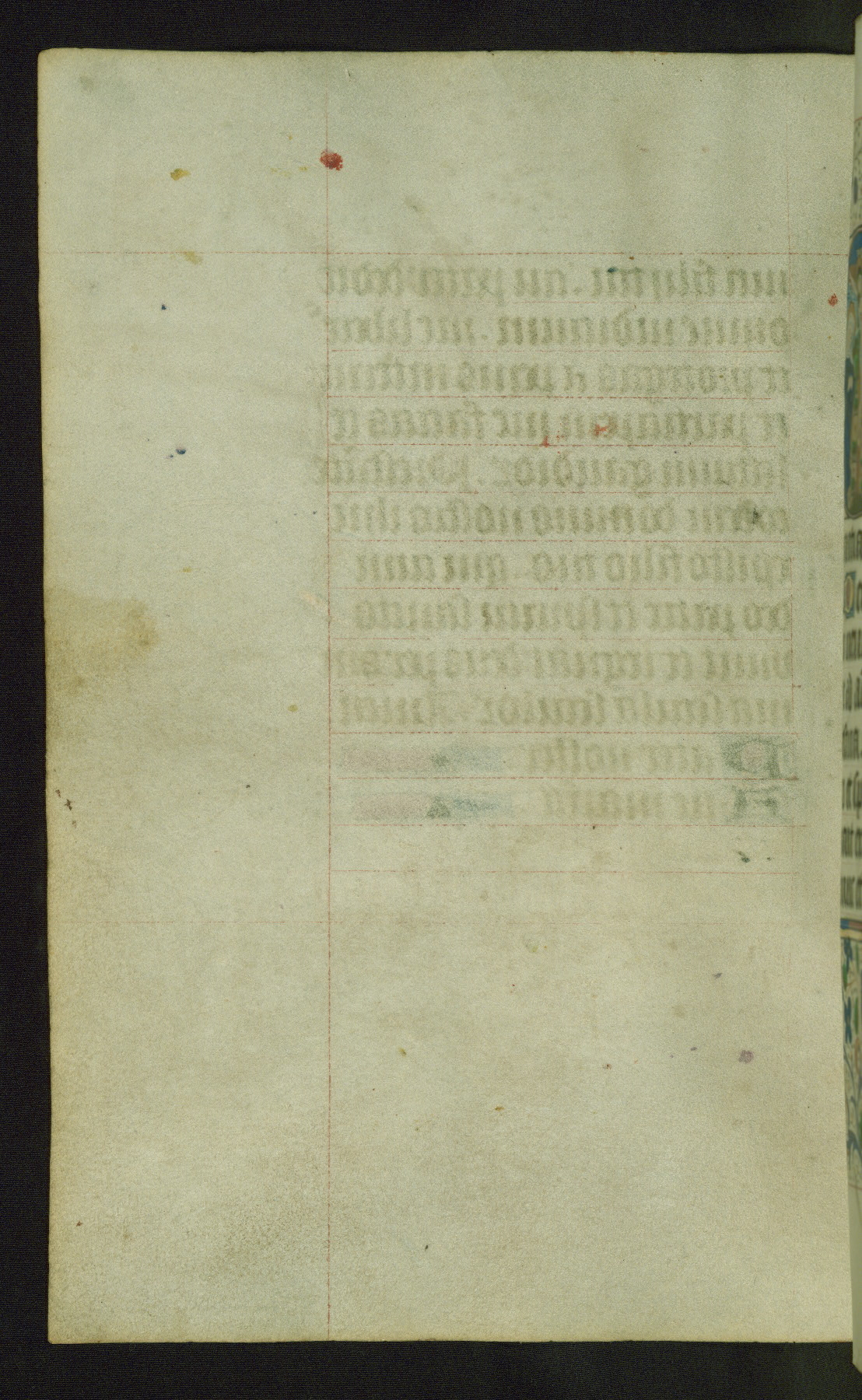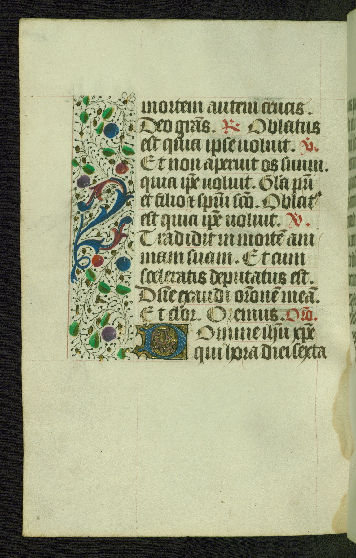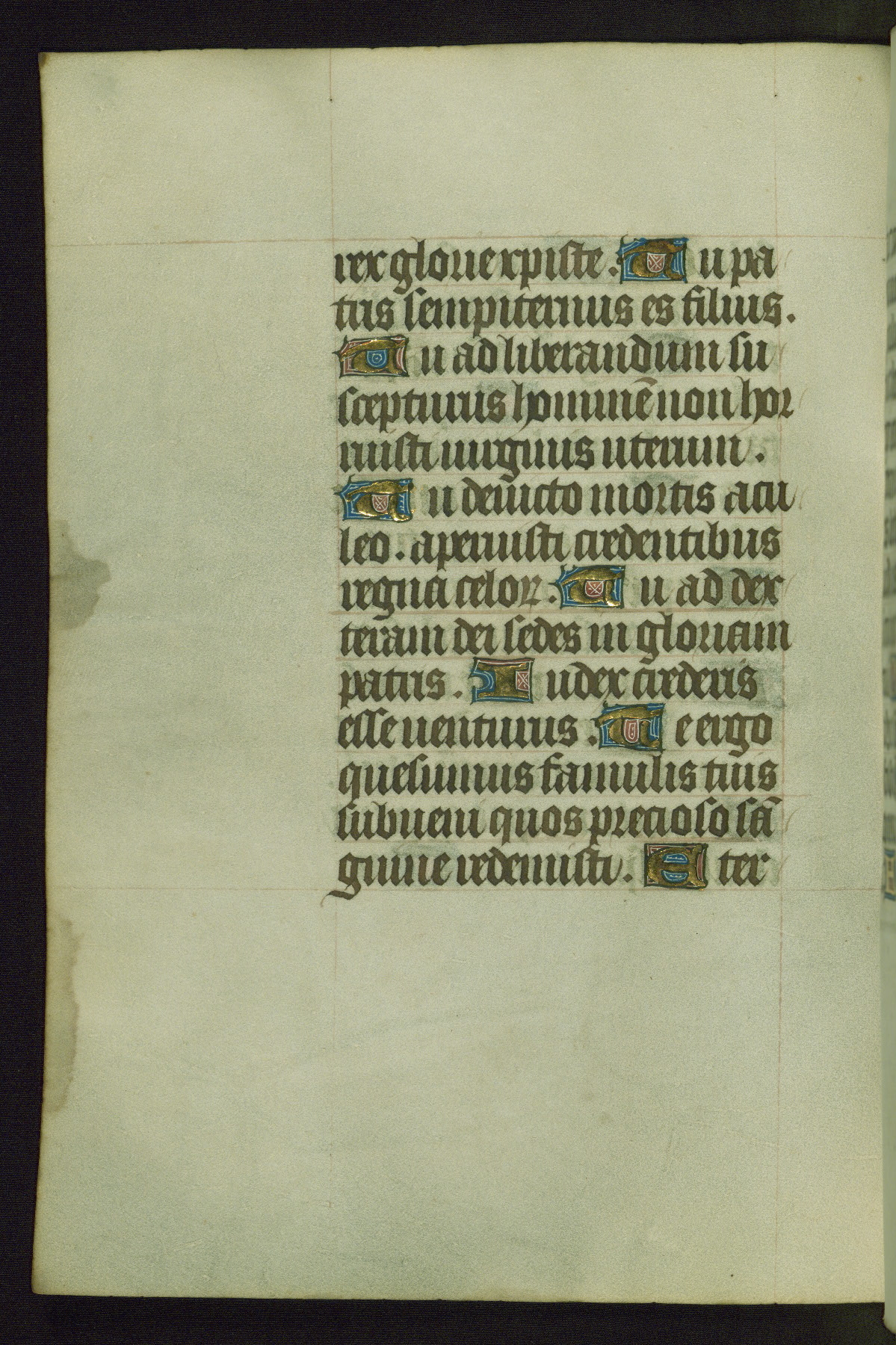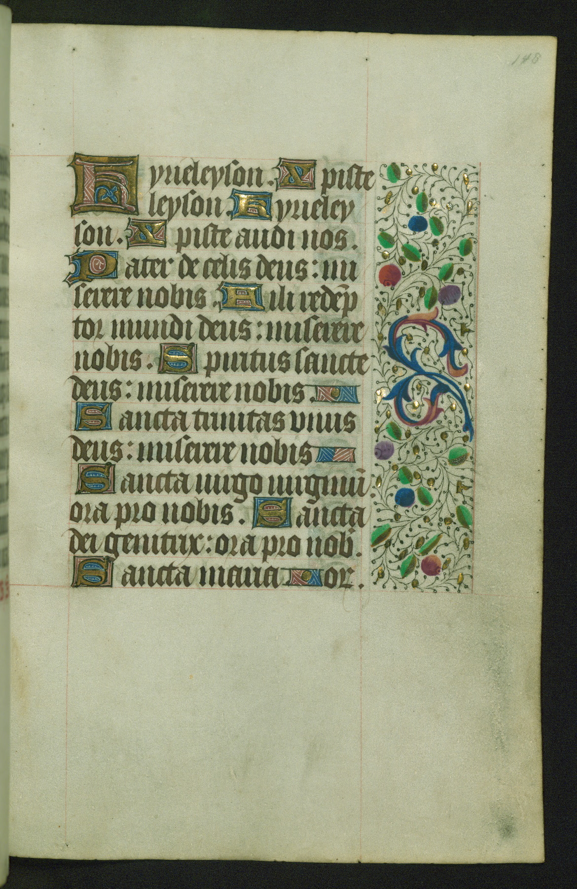 Completed for use of Cambrai, ca. 1450-60, this sizable Book of Hours is comprised of 265 folios, with two full-page miniatures (inserted) and thirteen historiated initials. Perhaps the focus on prayer rather than decoration was due to the presumed first owner, who was established in Mons and was associated with a Benedictine nunnery (dedicated to Sainte Waudry). Some Franciscan sympathies are indicated in the litany (fol. 147v), evinced by a citation of Bernardinus of Siena, Francis, and Clara.