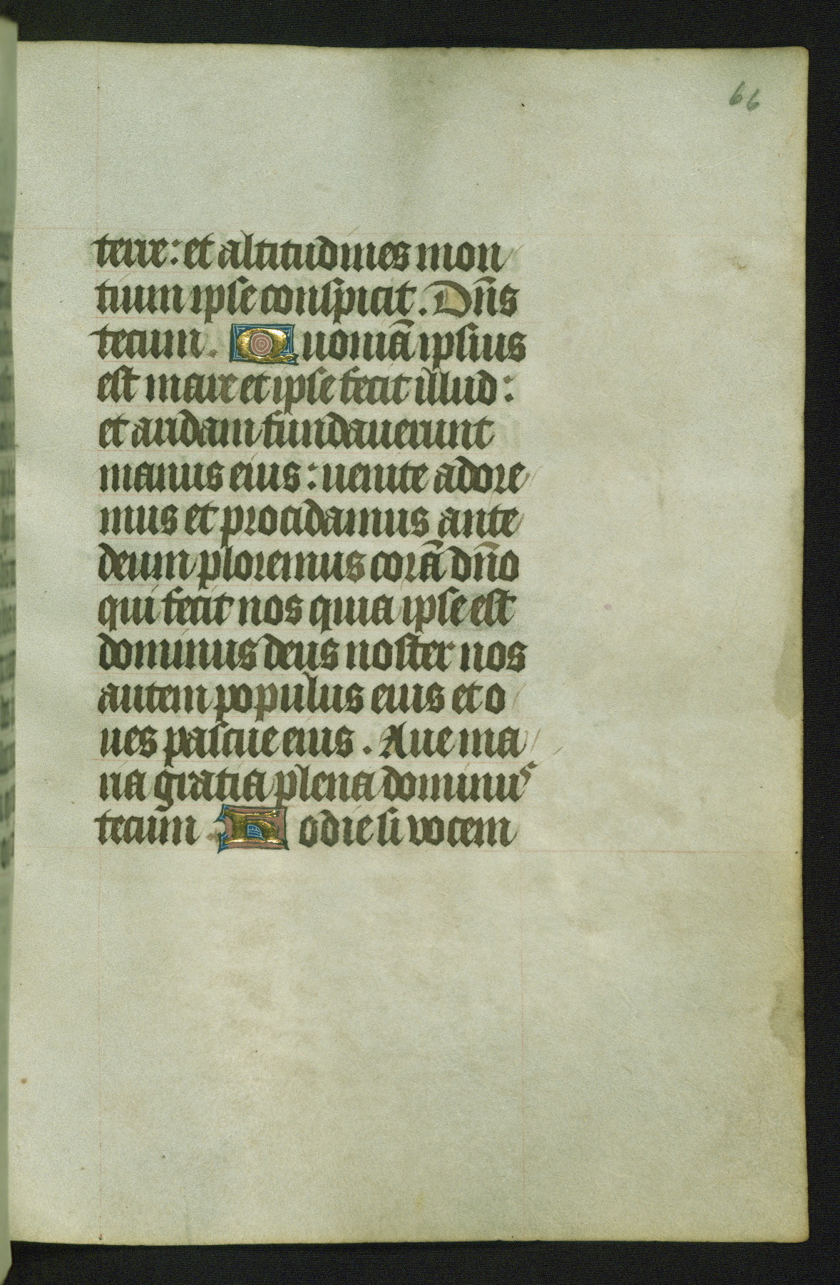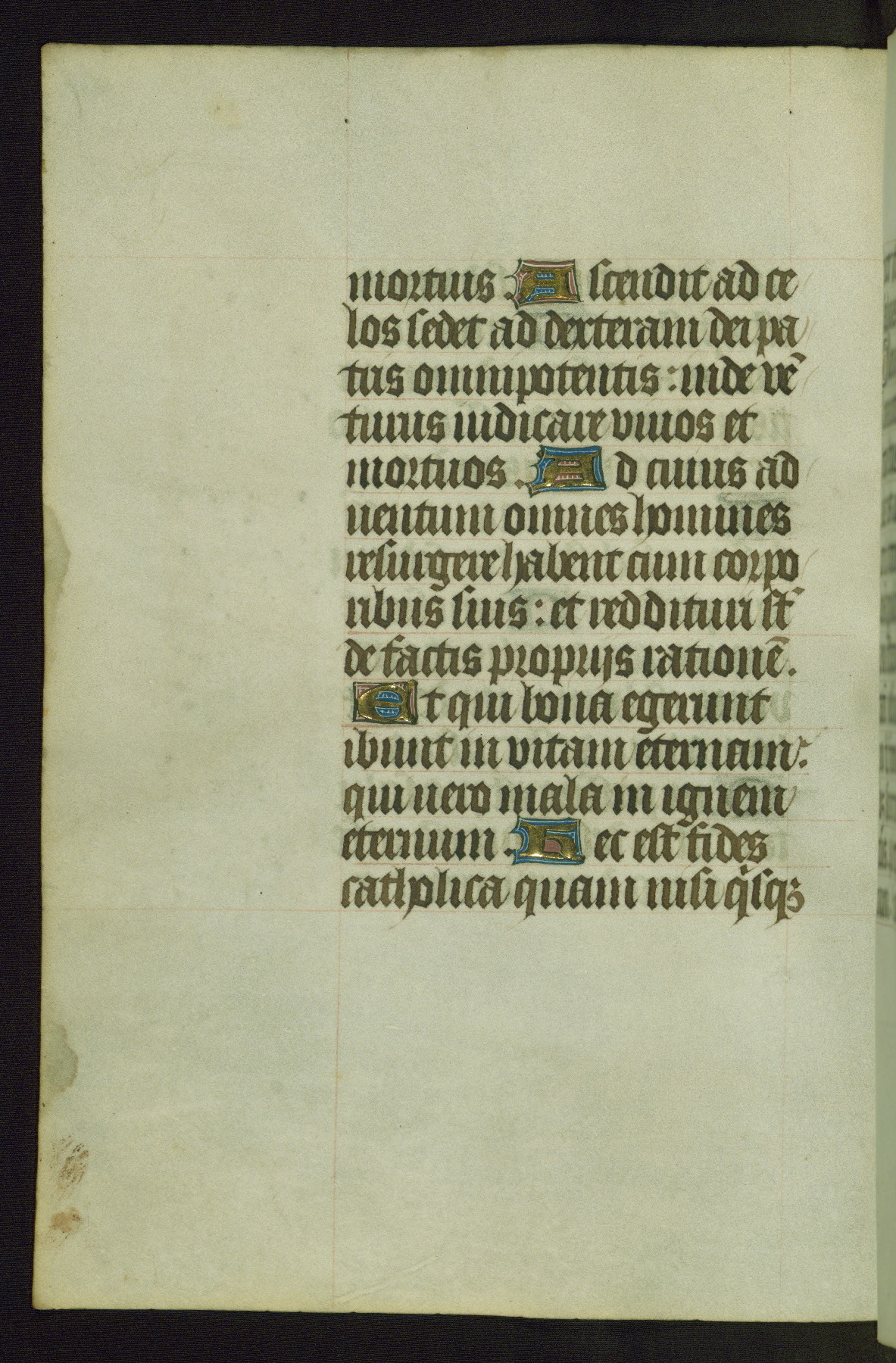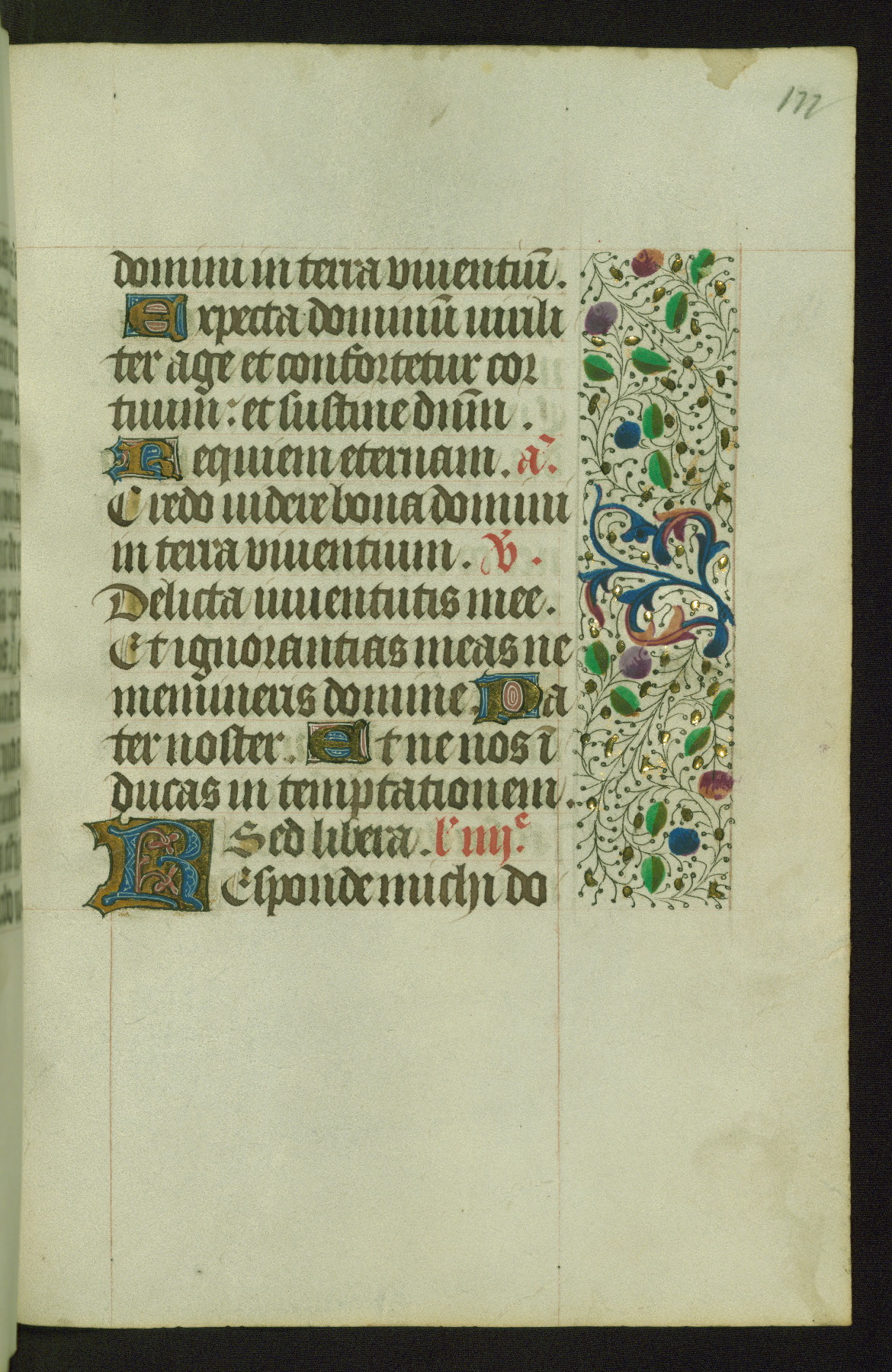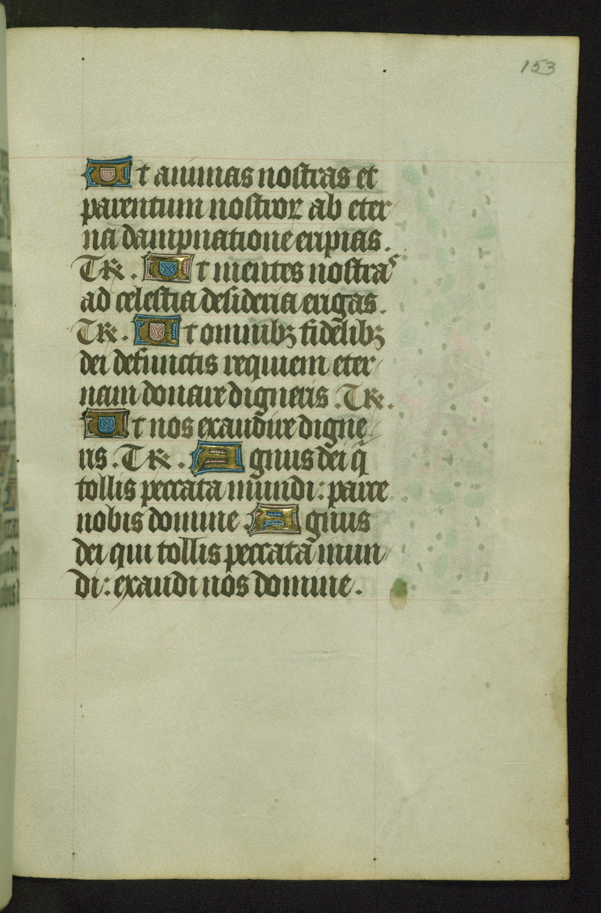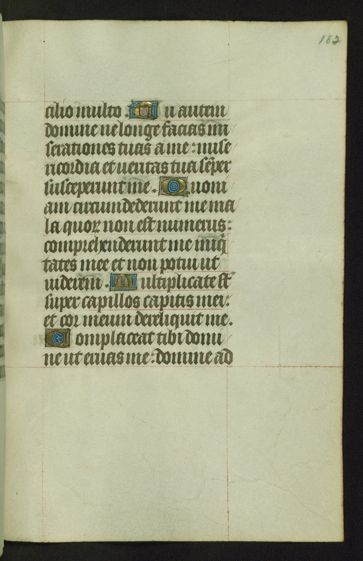 Completed for use of Cambrai, ca. 1450-60, this sizable Book of Hours is comprised of 265 folios, with two full-page miniatures (inserted) and thirteen historiated initials. Perhaps the focus on prayer rather than decoration was due to the presumed first owner, who was established in Mons and was associated with a Benedictine nunnery (dedicated to Sainte Waudry). Some Franciscan sympathies are indicated in the litany (fol. 147v), evinced by a citation of Bernardinus of Siena, Francis, and Clara.