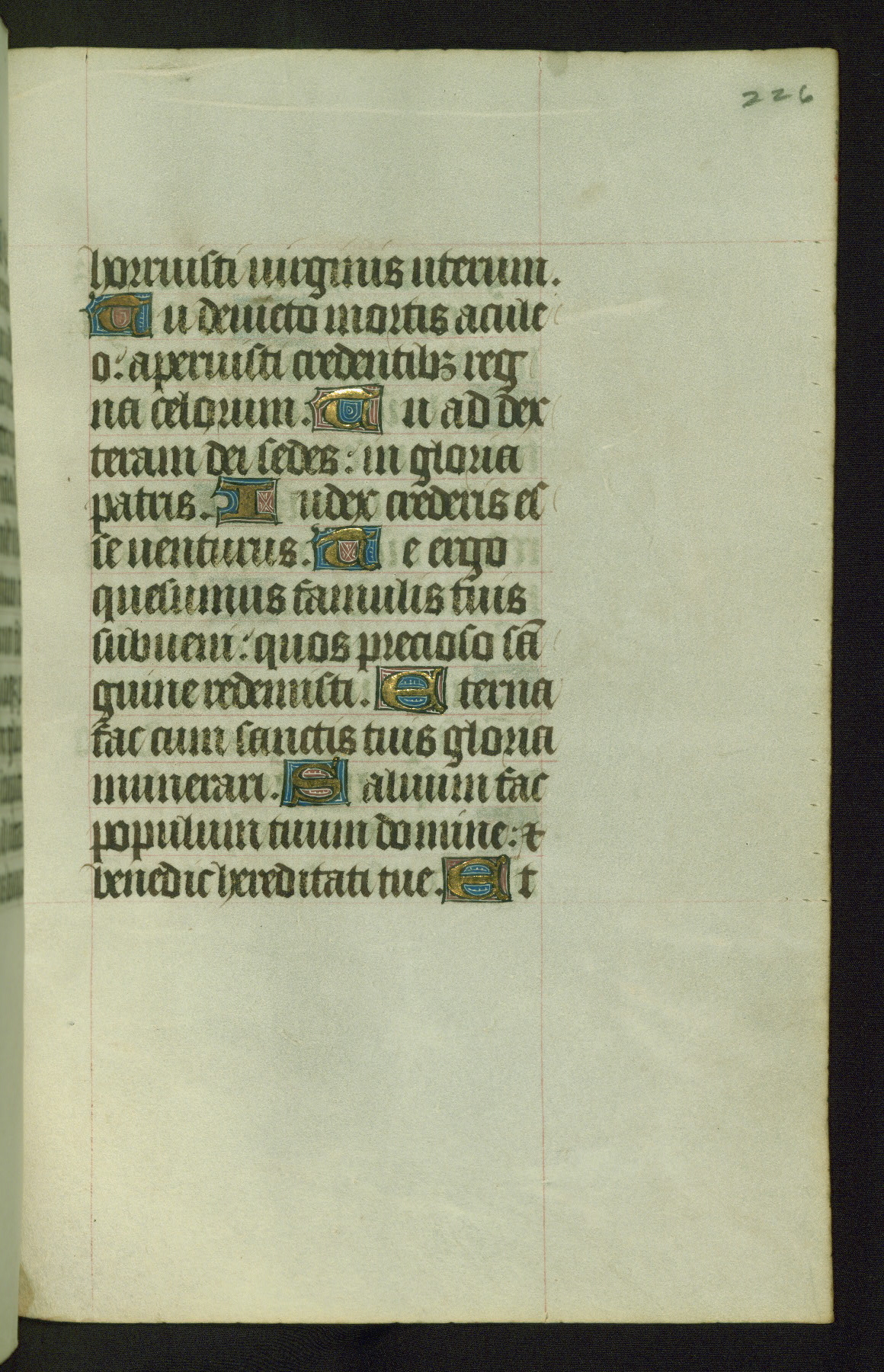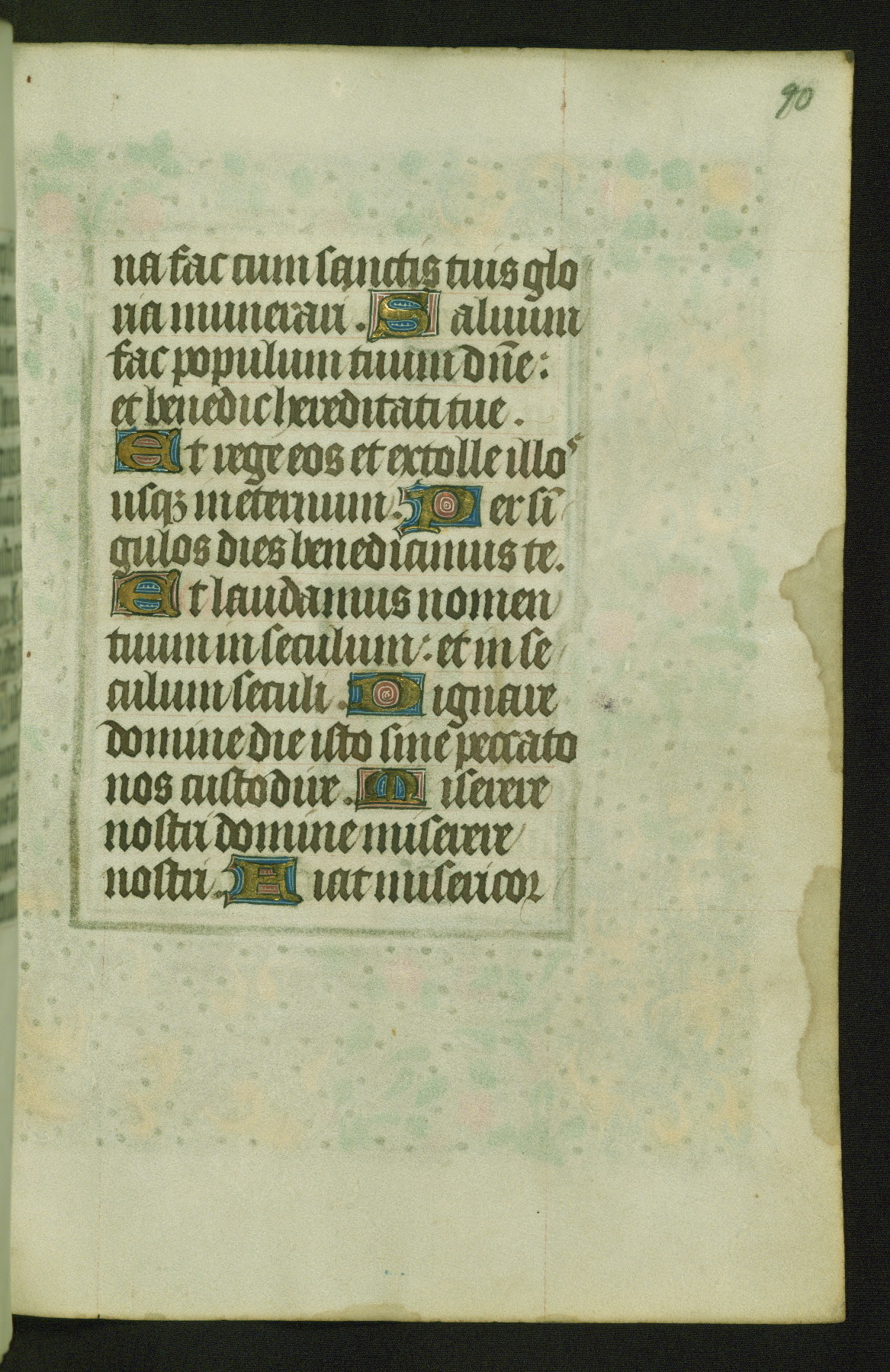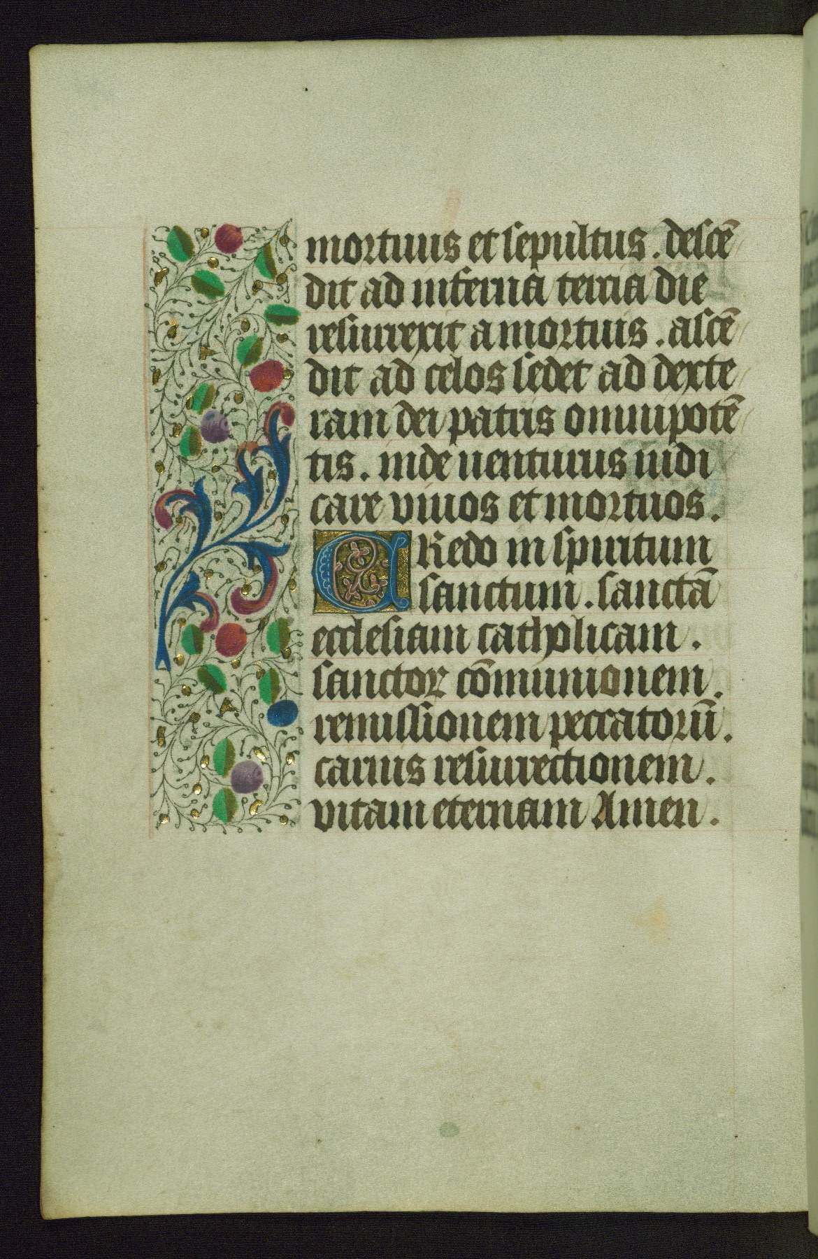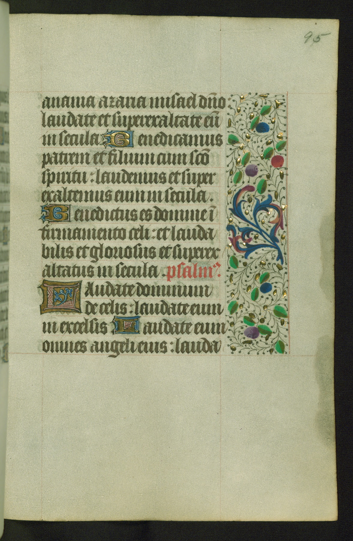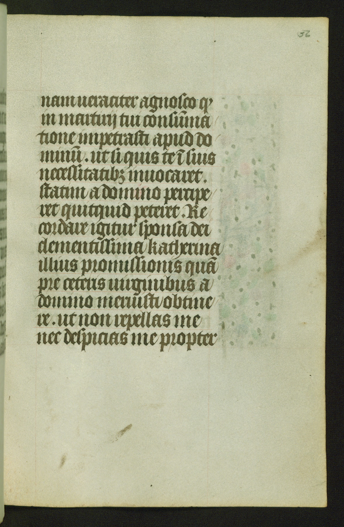 Completed for use of Cambrai, ca. 1450-60, this sizable Book of Hours is comprised of 265 folios, with two full-page miniatures (inserted) and thirteen historiated initials. Perhaps the focus on prayer rather than decoration was due to the presumed first owner, who was established in Mons and was associated with a Benedictine nunnery (dedicated to Sainte Waudry). Some Franciscan sympathies are indicated in the litany (fol. 147v), evinced by a citation of Bernardinus of Siena, Francis, and Clara.